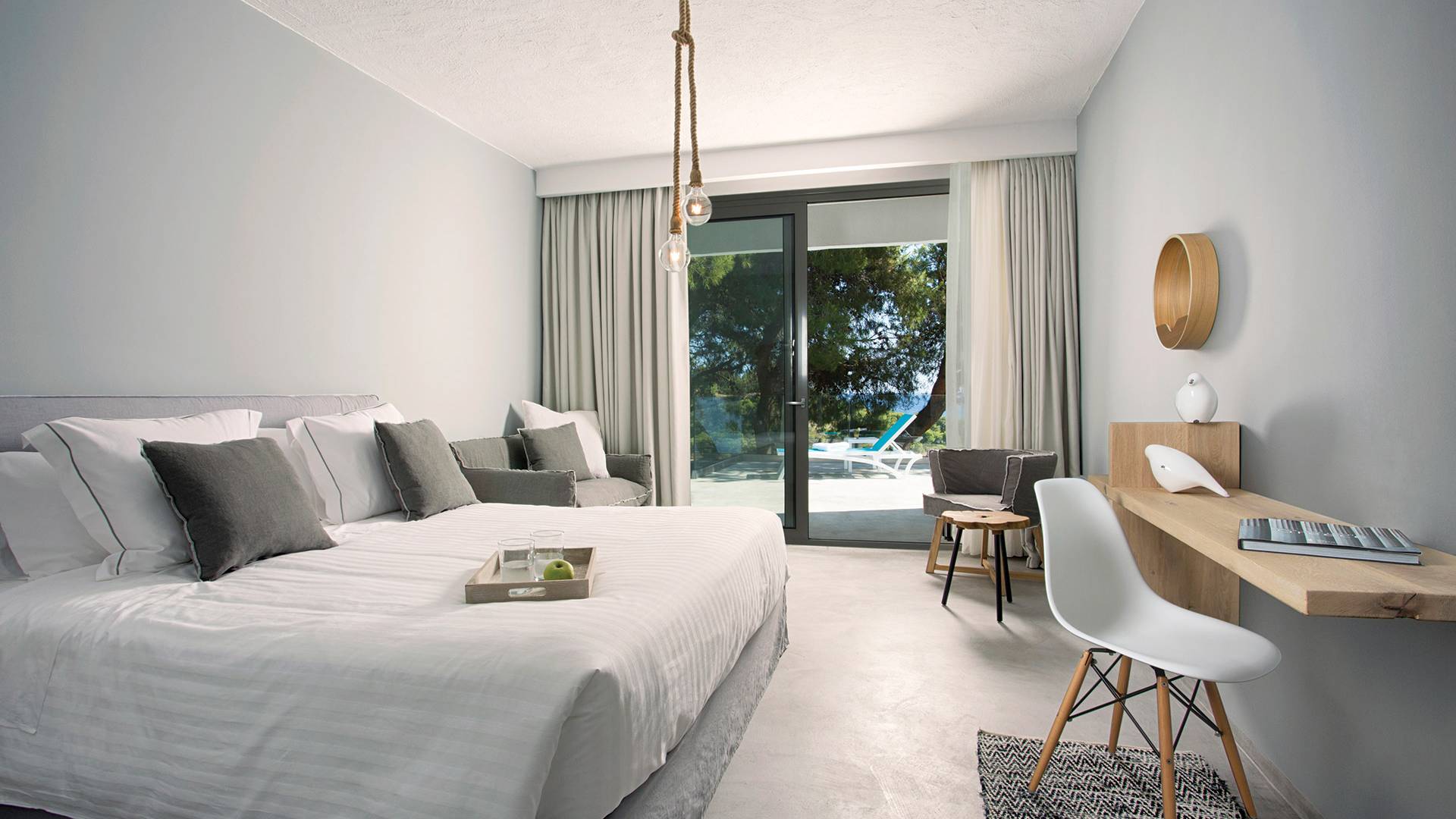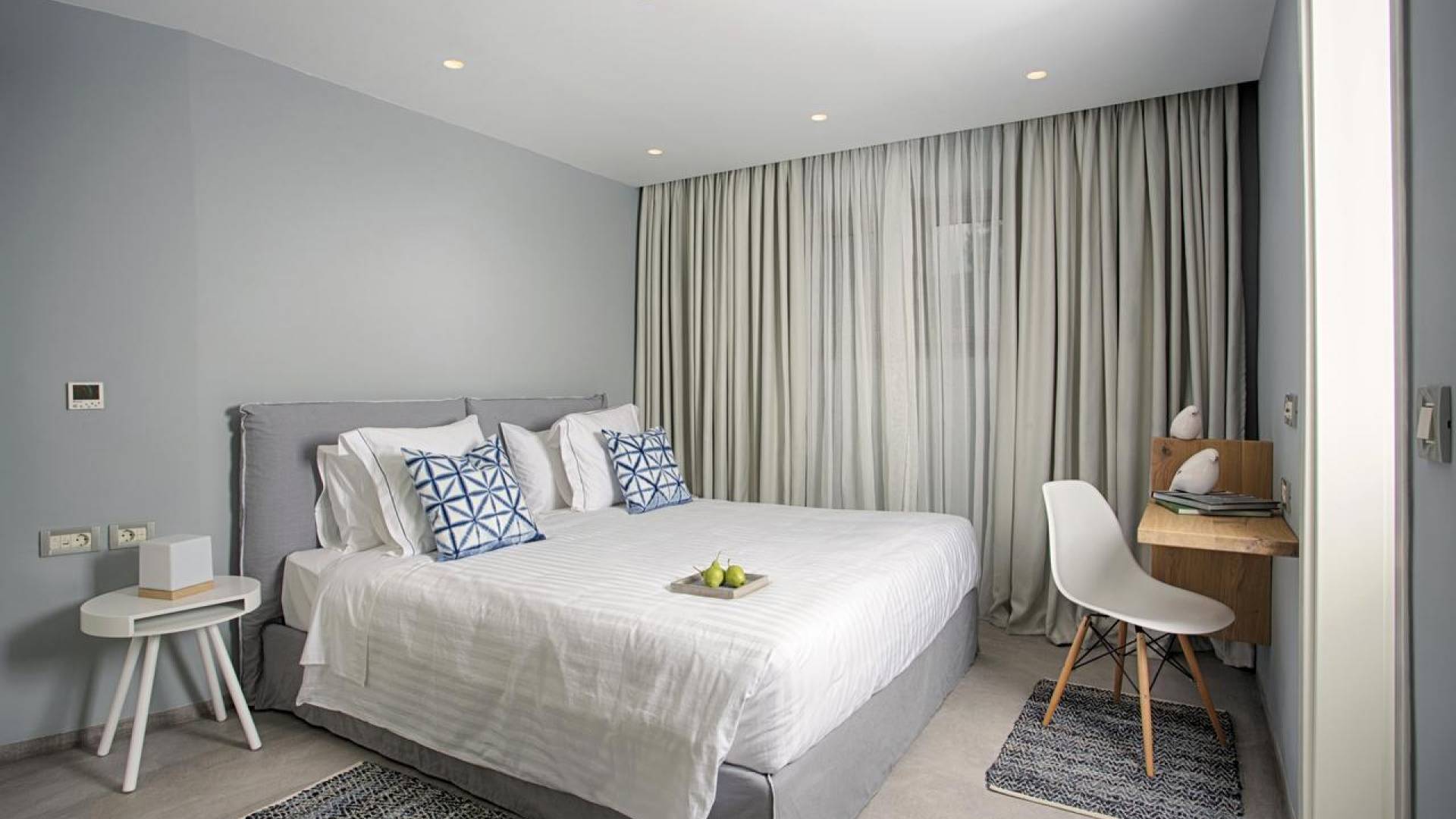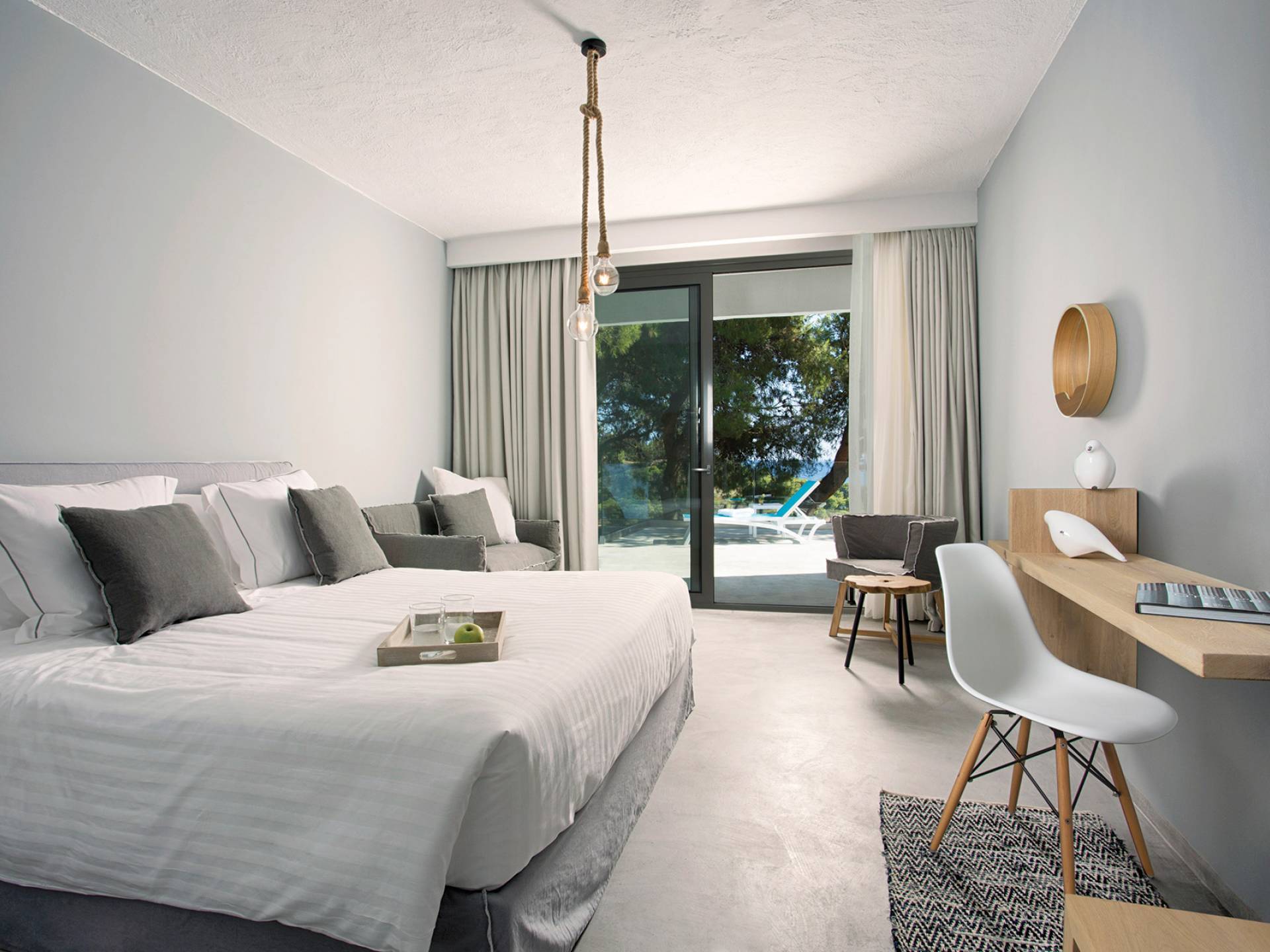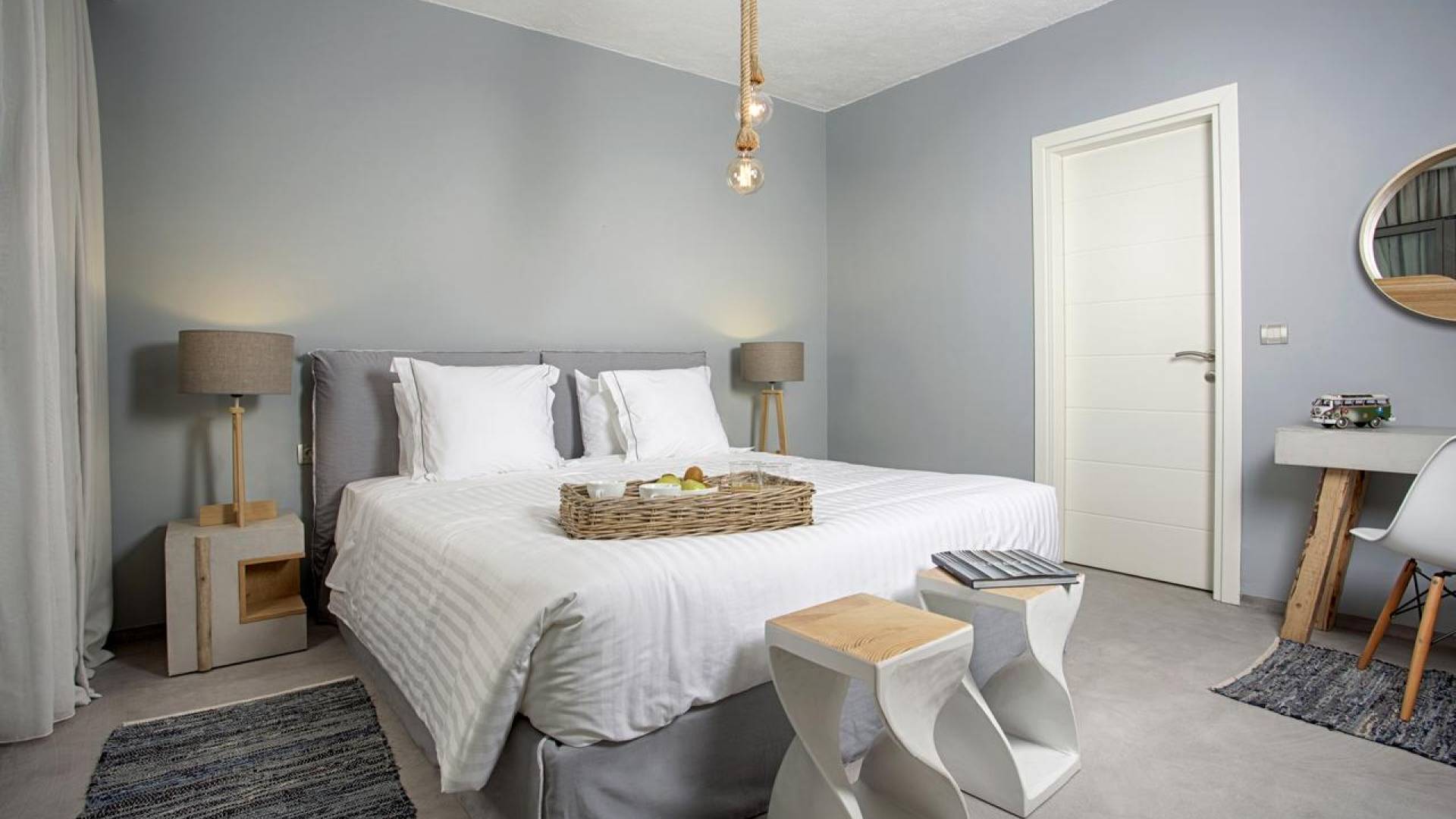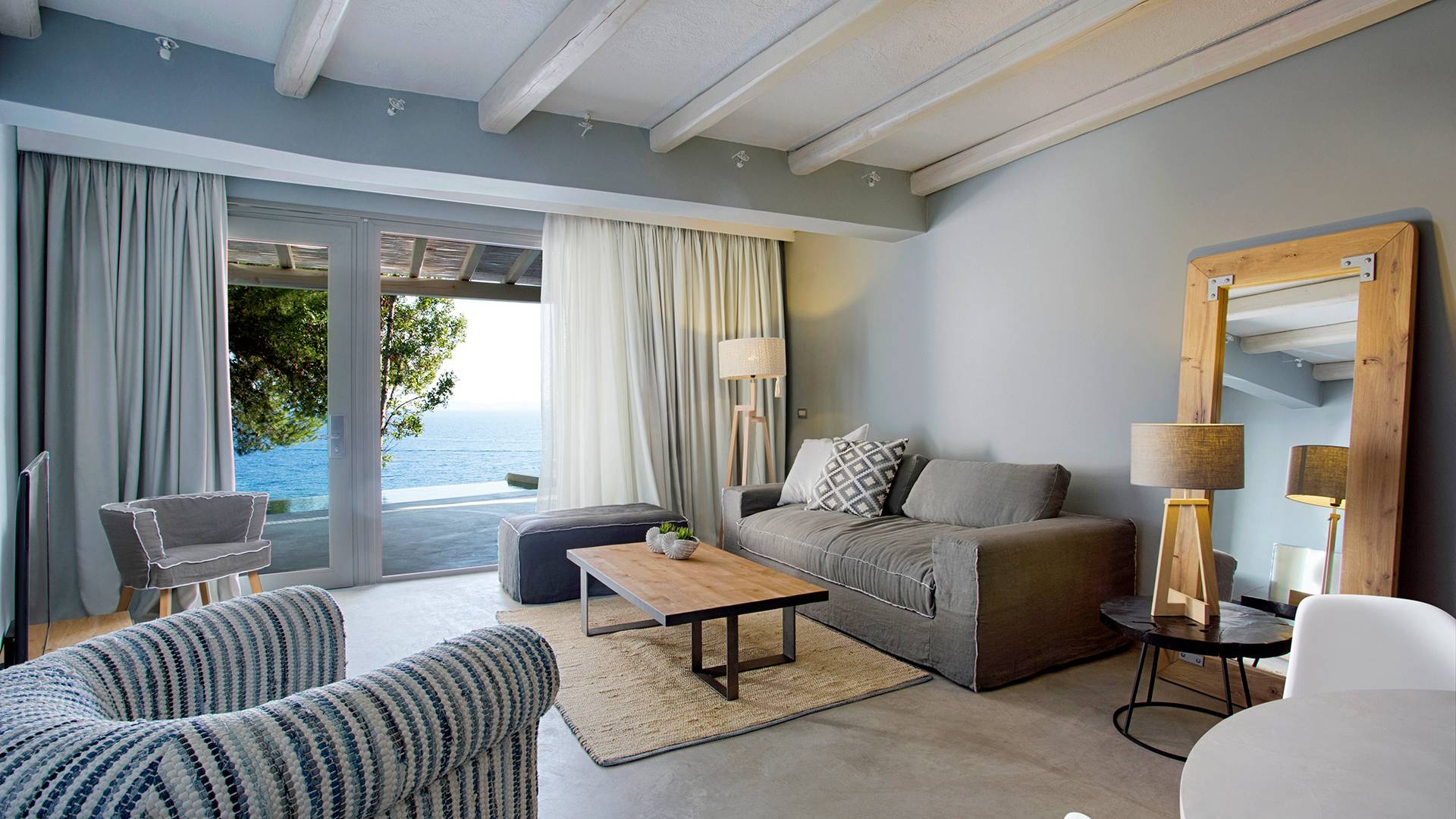 Questa versatile proprietà con cinque camere da letto di 245 mq. possono essere affittate come tre ville indipendenti e totalmente private con una o due camere da letto o semplicemente essere separate da porte comunicanti per creare combinazioni di due e quattro camere da letto in grado di ospitare un massimo di 14 ospiti. Ogni villa ha la propria piscina (con recinzione disponibile), un'accogliente zona soggiorno e pranzo e una cucina completamente attrezzata, mentre tutte le camere sono dotate di bagni moderni con doccia, letti king-size e TV/lettori DVD. Le tre ville sono poste in privato, complete di piante fiorite e lettini prendisole intorno alle piscine. Gli ospiti sono circondati da alberi di pino e godono di una vista superba sulle acque cristalline del Mar Egeo.