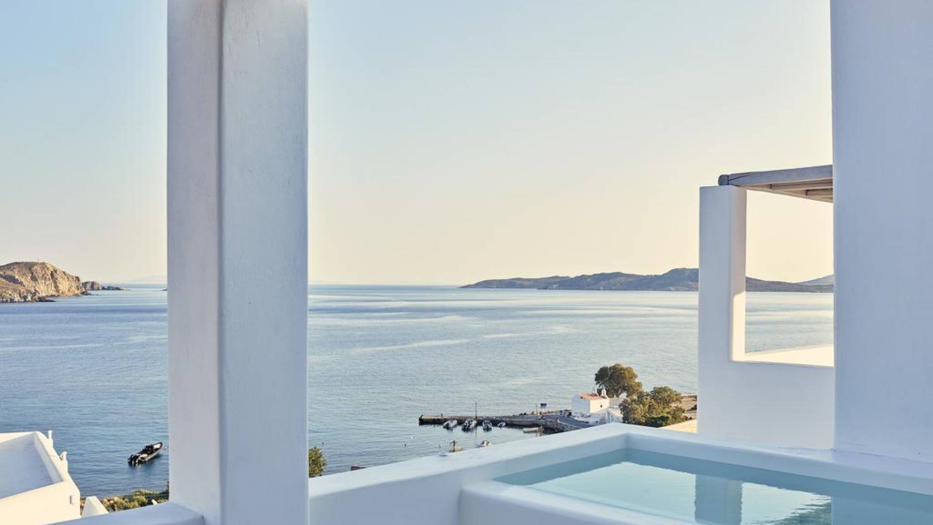 Junior Suite at Katikies Mykonos con vasca idromassaggio all'aperto a Mykonos è adatta per un massimo di 3 persone, dispone di connessione internet Wi-Fi gratuita, aria condizionata, TV satellitare, cassetta di sicurezza, asciugacapelli e macchina per il caffè.