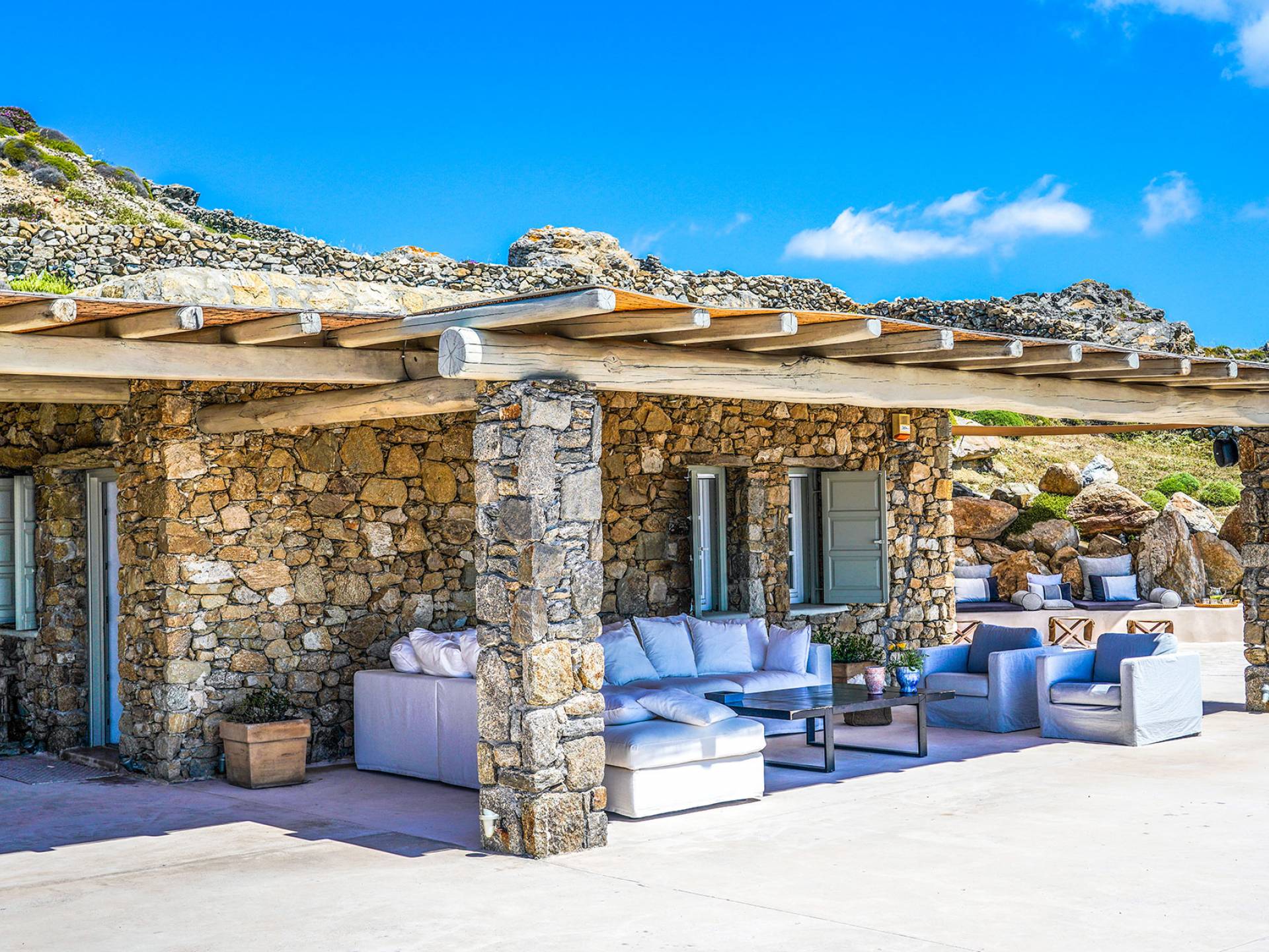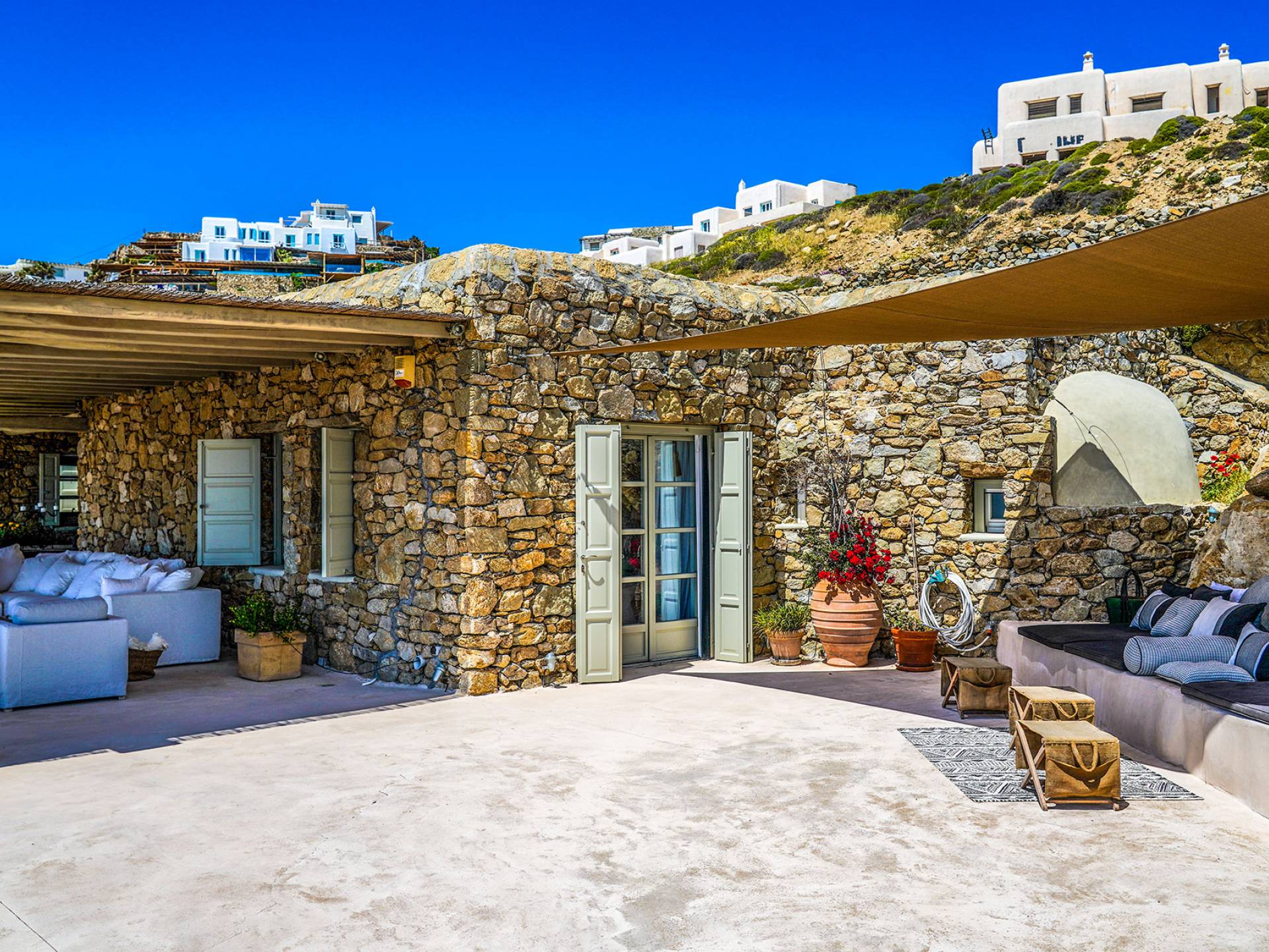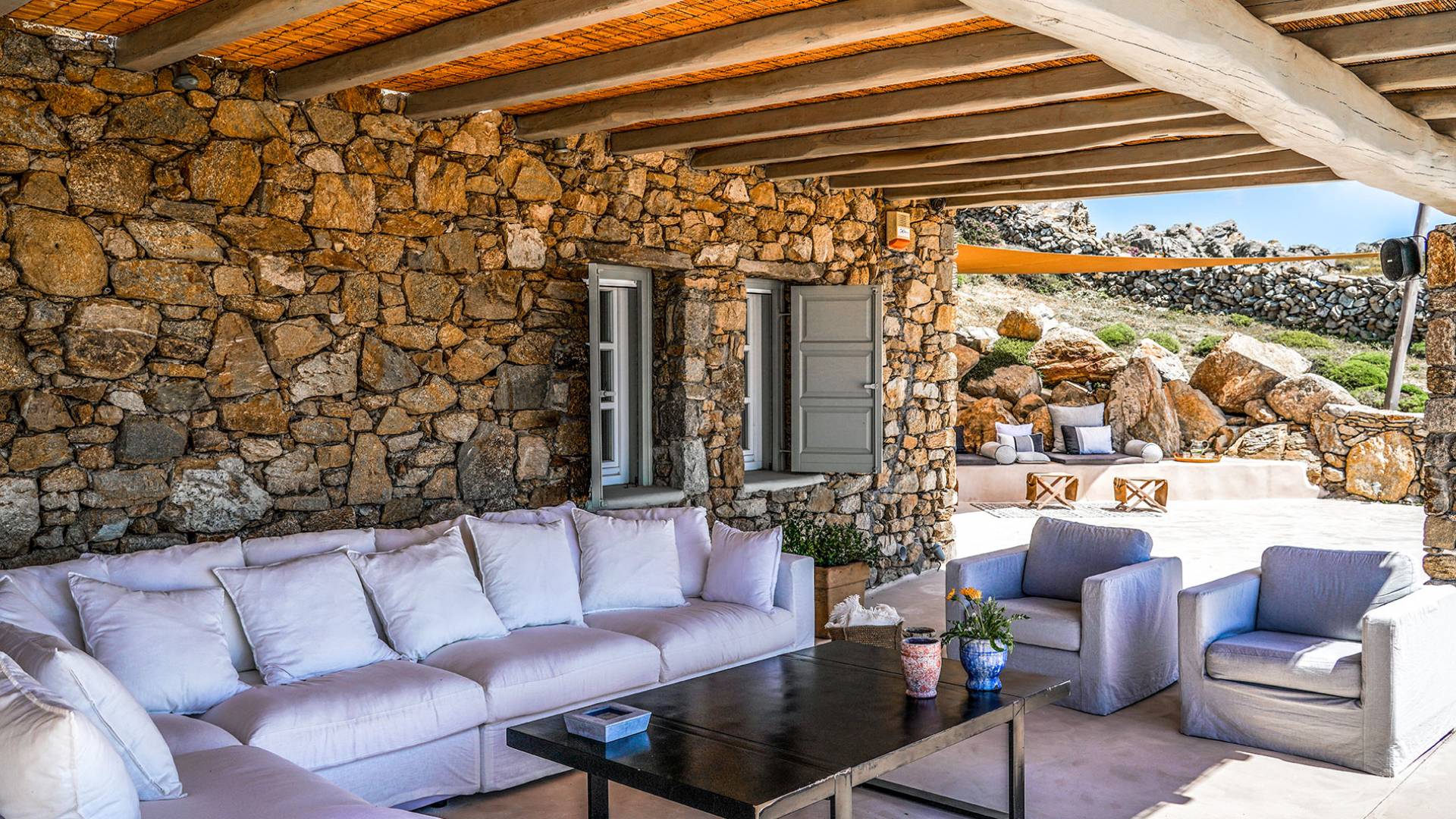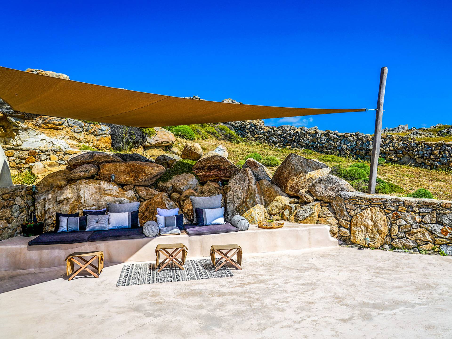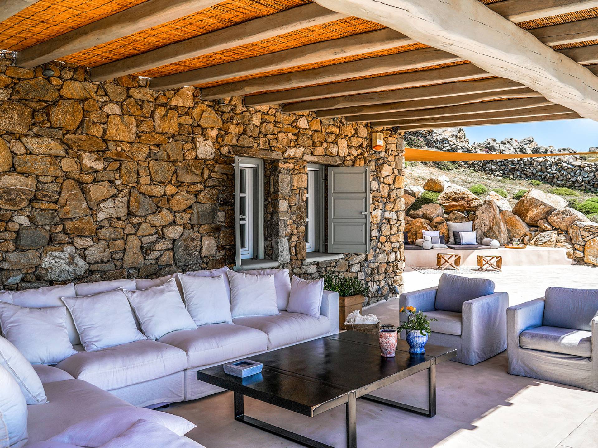 Villa Sandstone Mykonos si trova sul lato nord-ovest di Mykonos ed è composta da una casa principale, 3 pensioni indipendenti, diversi salottini all'aperto, zona pranzo e una vasca idromassaggio all'aperto. Gli ospiti godono di momenti di relax negli spazi esterni con comodi divani, cuscini a terra, tavolo da pranzo ecc.