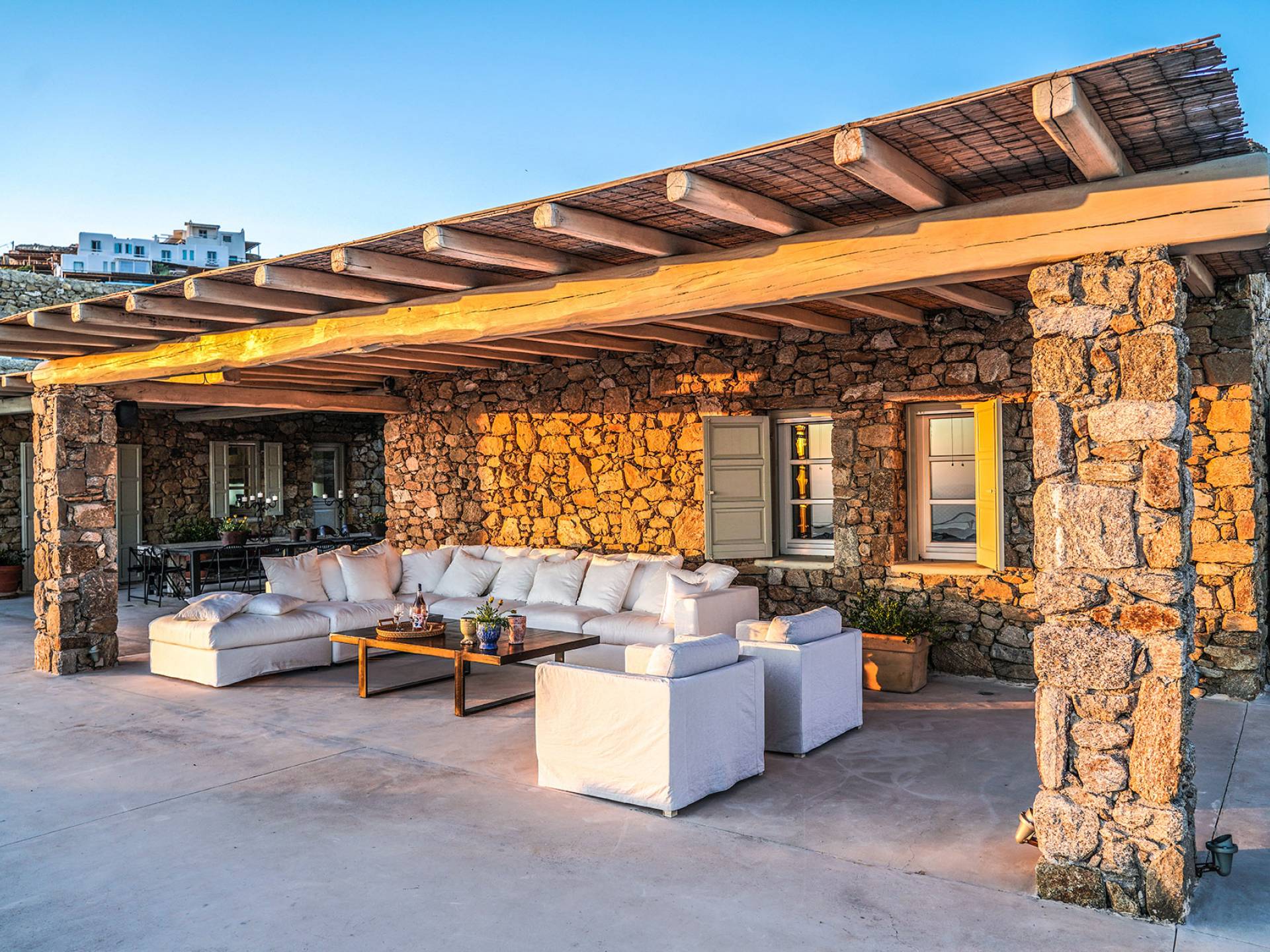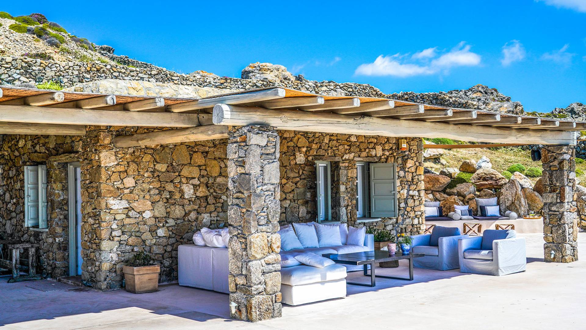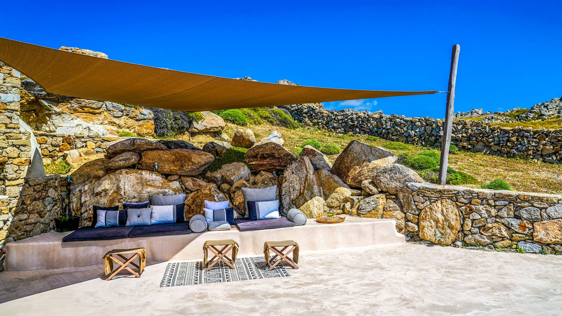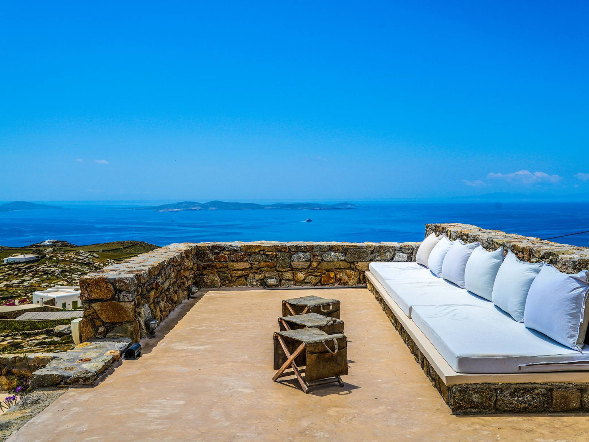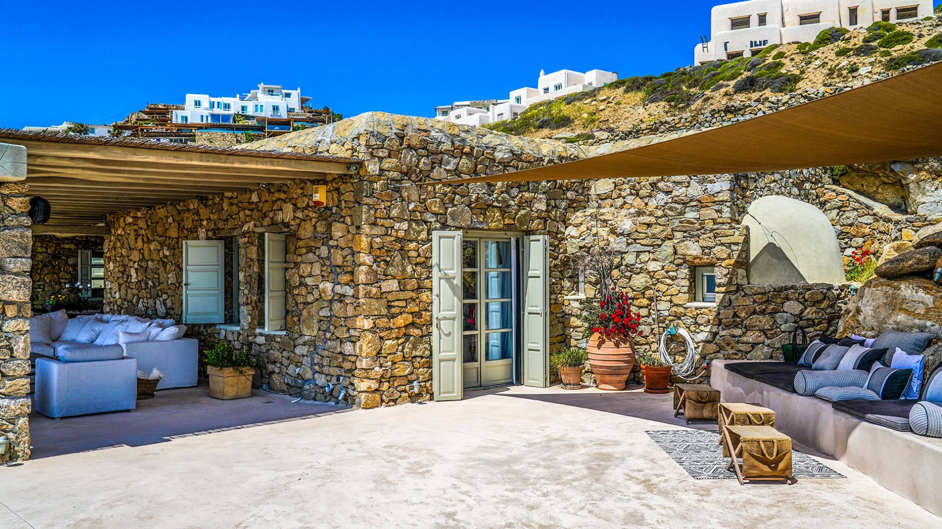 Villa Sandstone Mykonos si trova sul lato nord-ovest di Mykonos ed è composta da una casa principale, 3 pensioni indipendenti, diversi salottini all'aperto, zona pranzo e una vasca idromassaggio all'aperto. Gli ospiti godono di momenti di relax negli spazi esterni con comodi divani, cuscini a terra, tavolo da pranzo ecc.