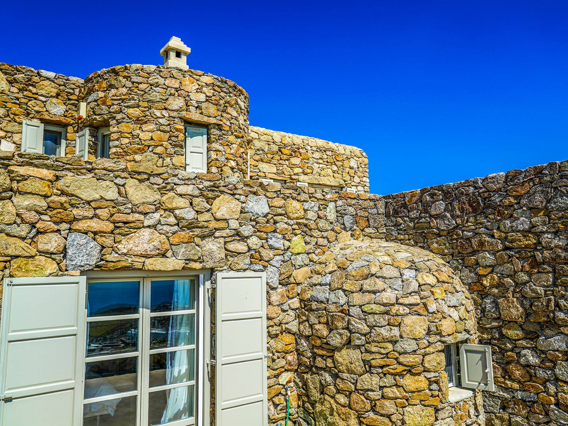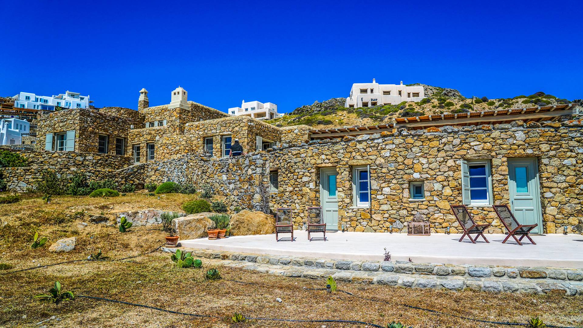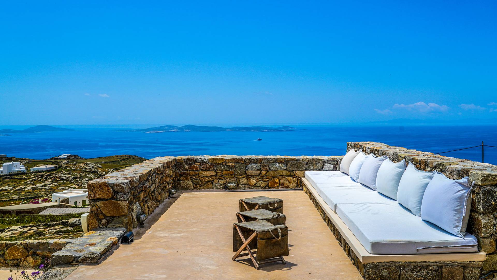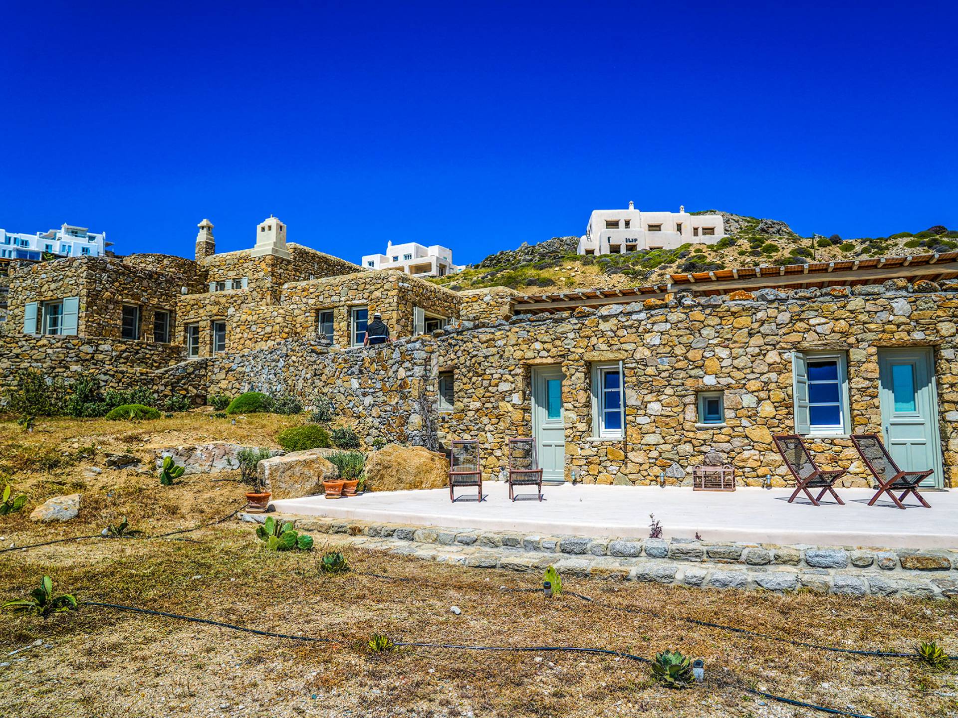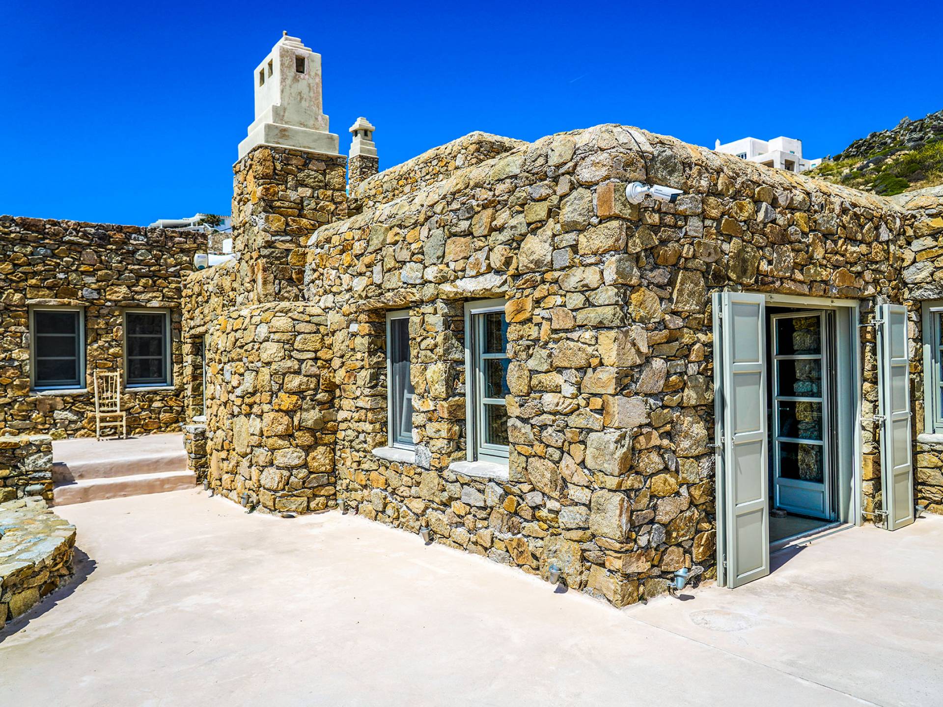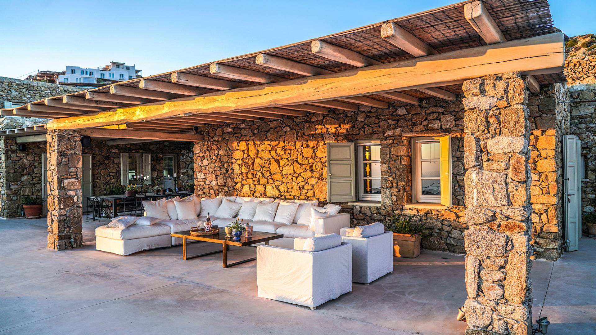 Villa Sandstone Mykonos si trova sul lato nord-ovest di Mykonos ed è composta da una casa principale, 3 pensioni indipendenti, diversi salottini all'aperto, zona pranzo e una vasca idromassaggio all'aperto. Gli ospiti godono di momenti di relax negli spazi esterni con comodi divani, cuscini a terra, tavolo da pranzo ecc.