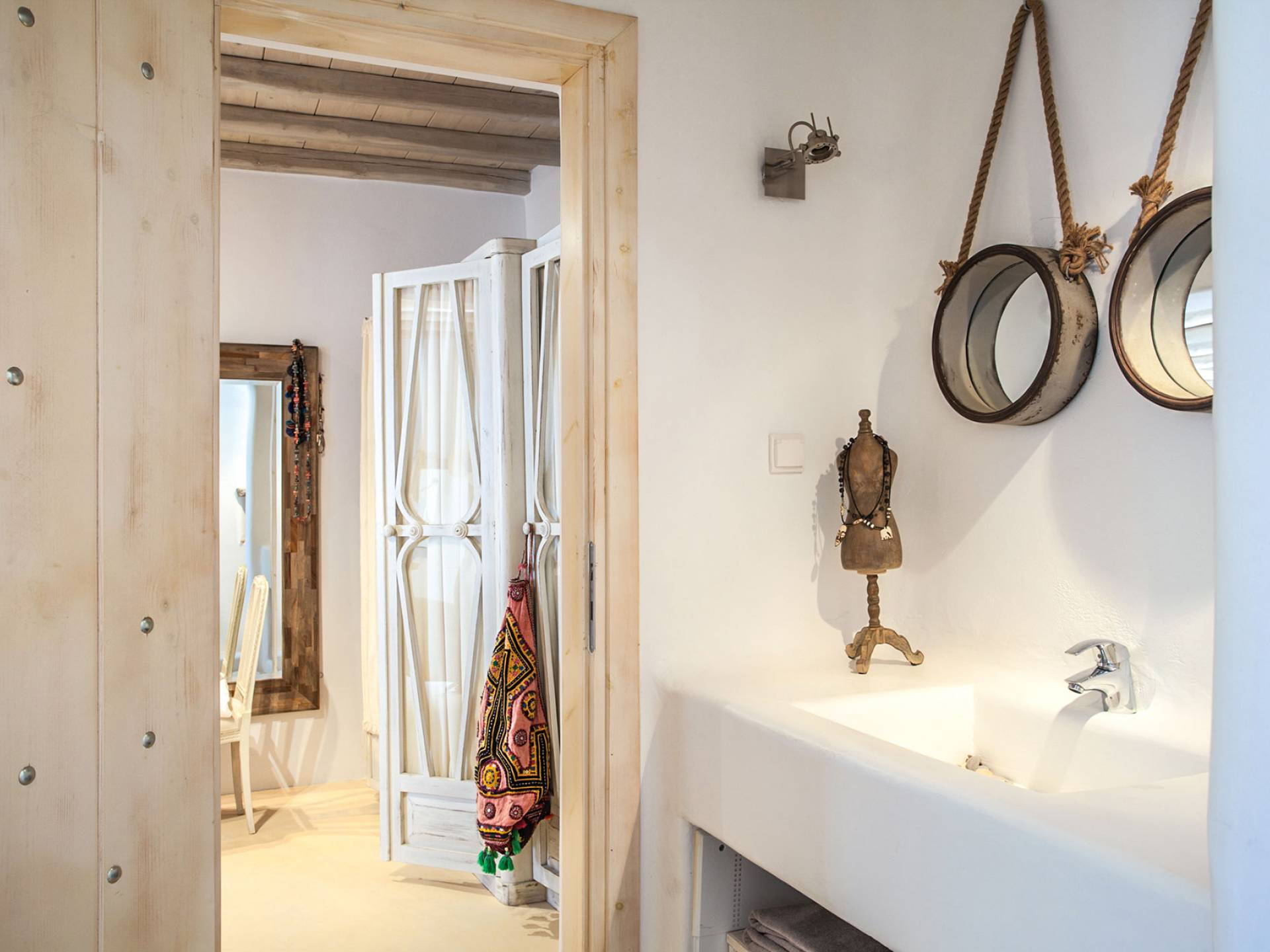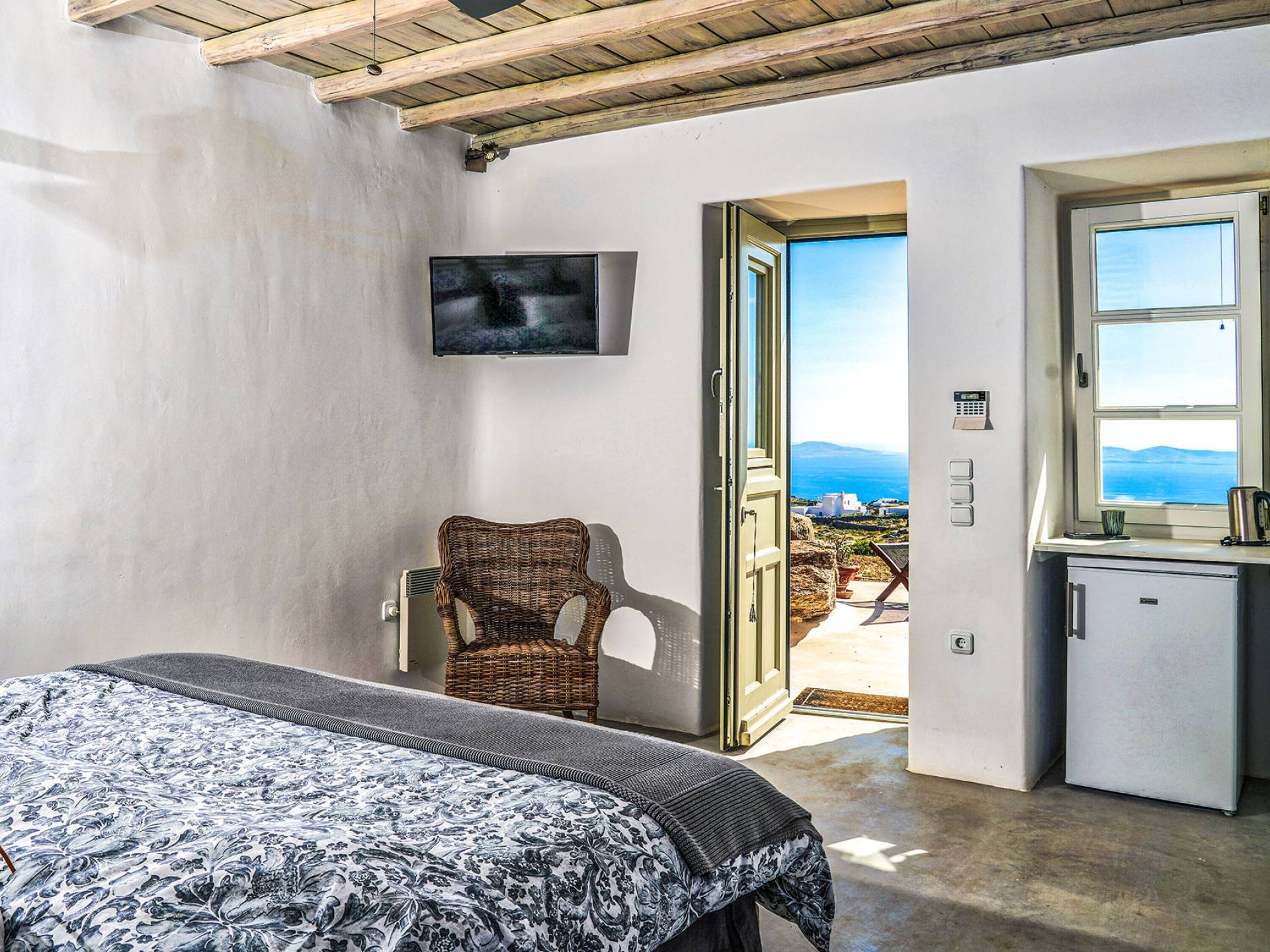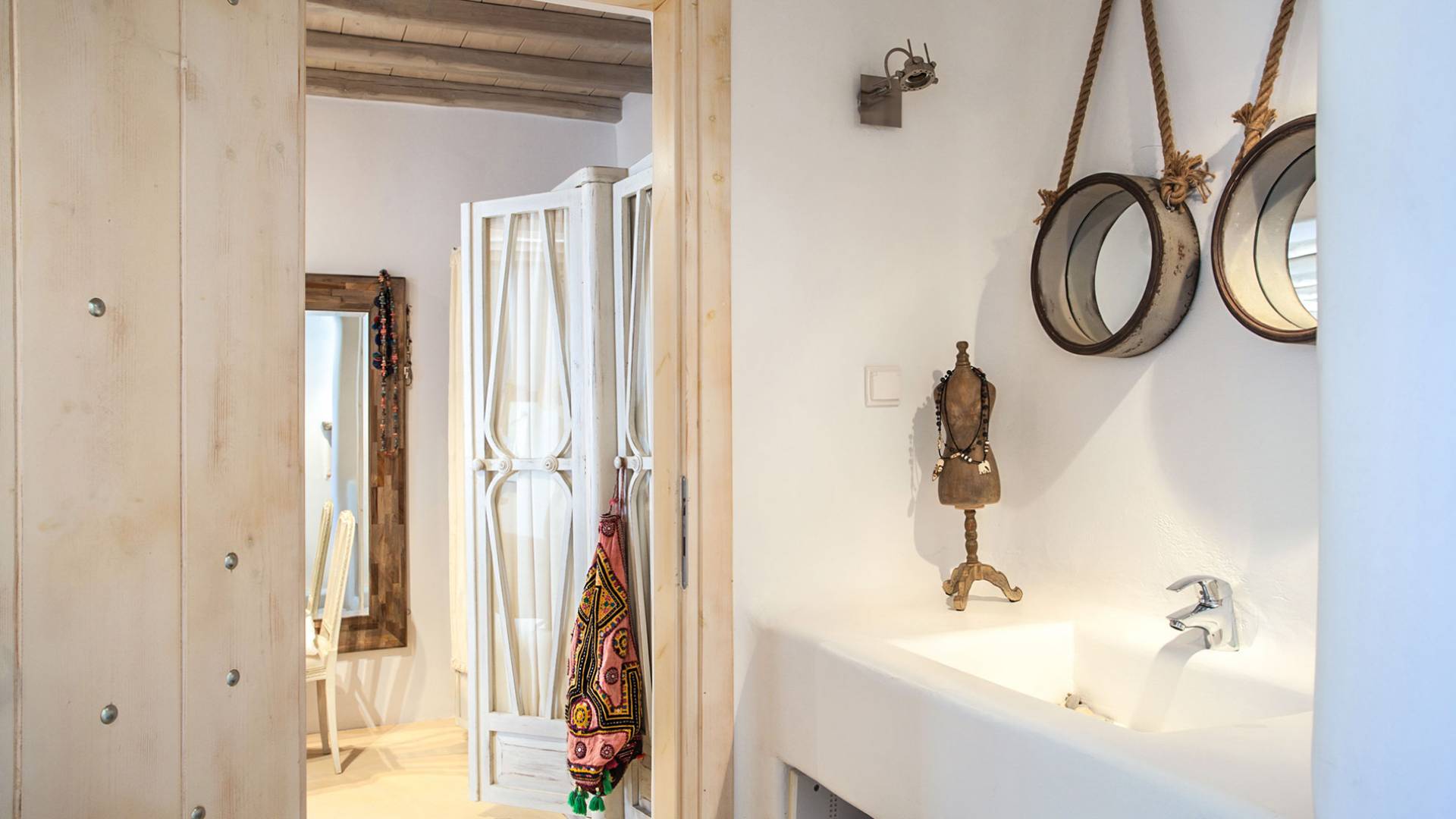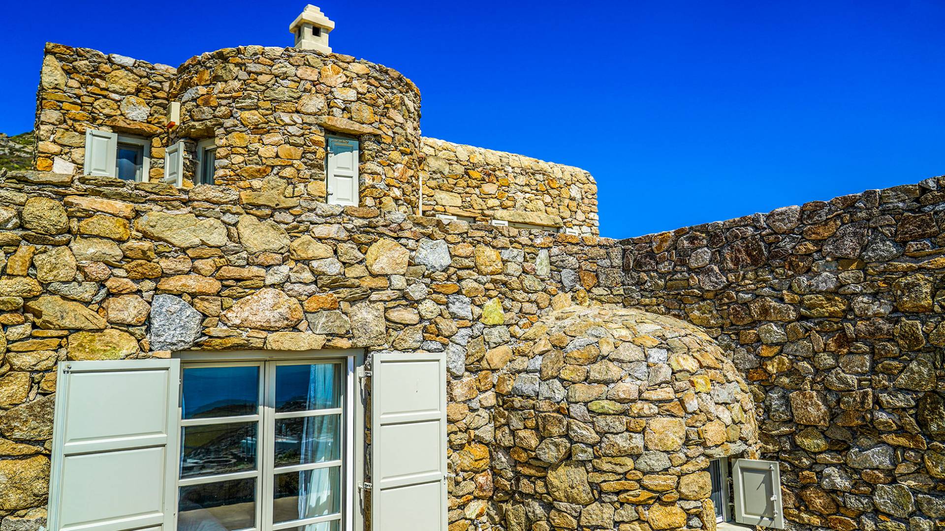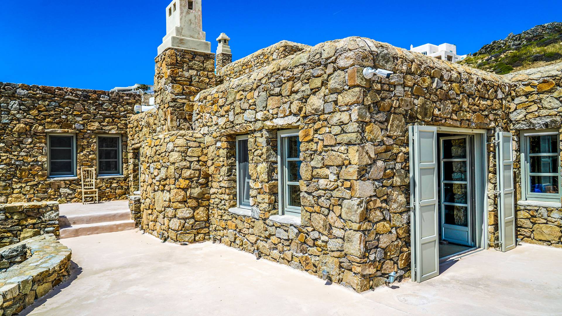 Villa Sandstone Mykonos si trova sul lato nord-ovest di Mykonos ed è composta da una casa principale, 3 pensioni indipendenti, diversi salottini all'aperto, zona pranzo e una vasca idromassaggio all'aperto. Gli ospiti godono di momenti di relax negli spazi esterni con comodi divani, cuscini a terra, tavolo da pranzo ecc.