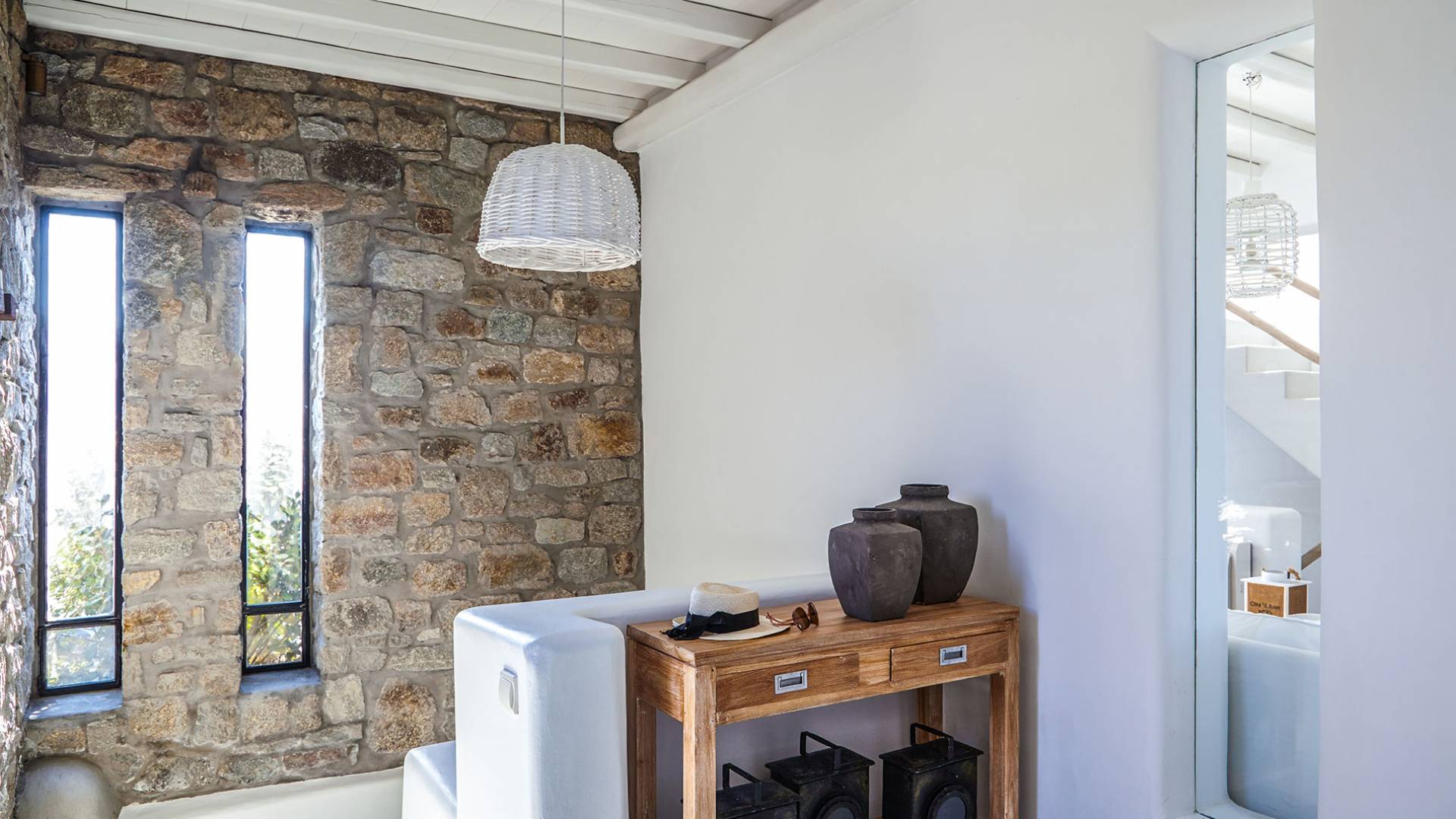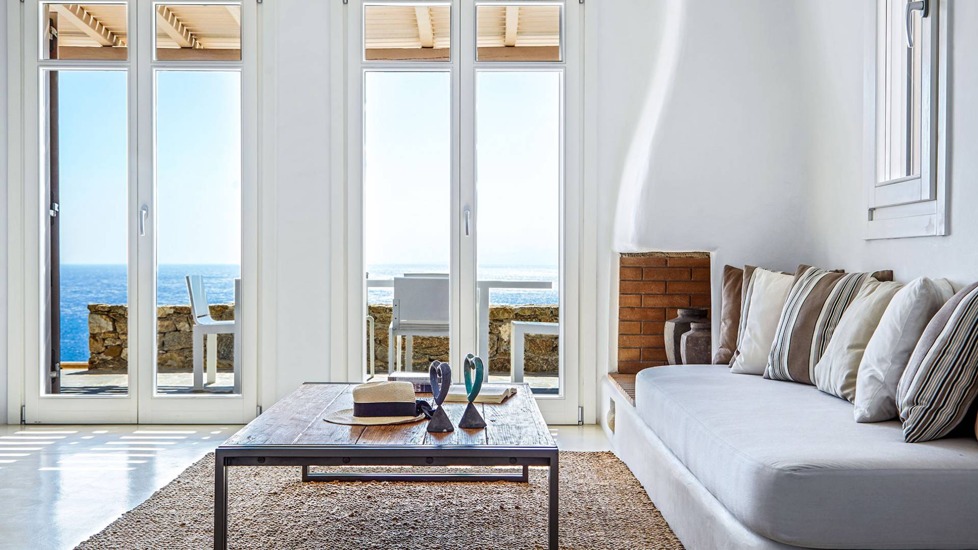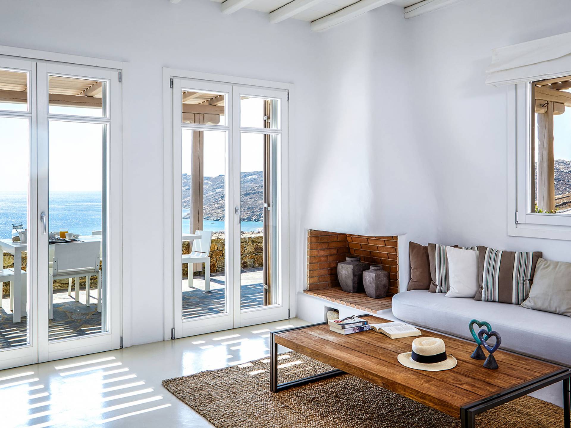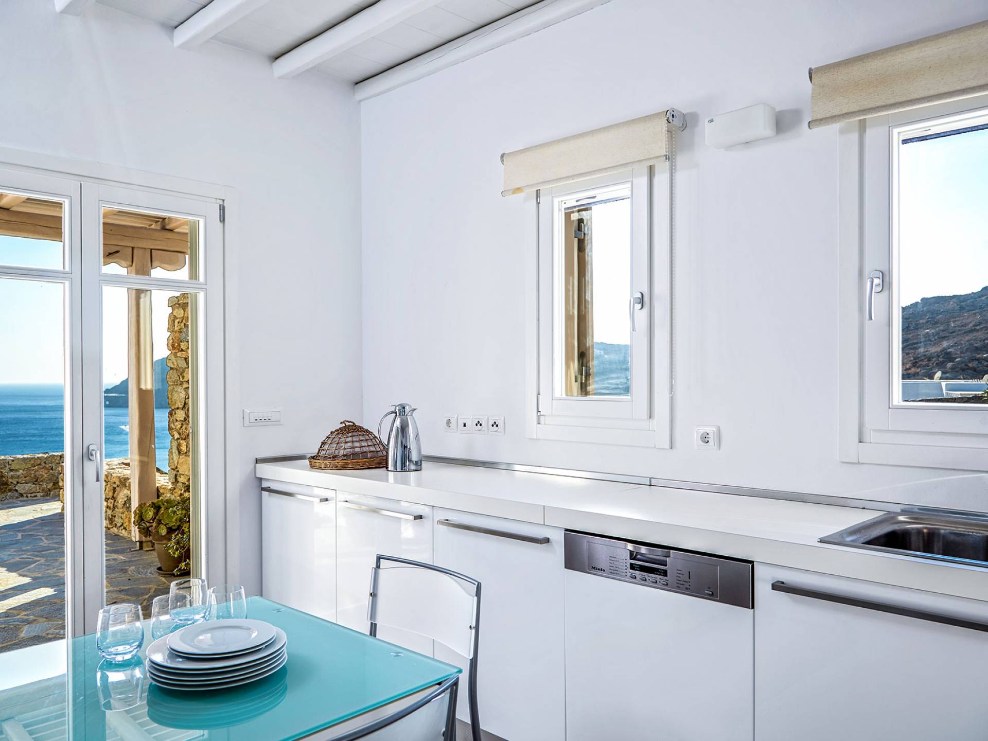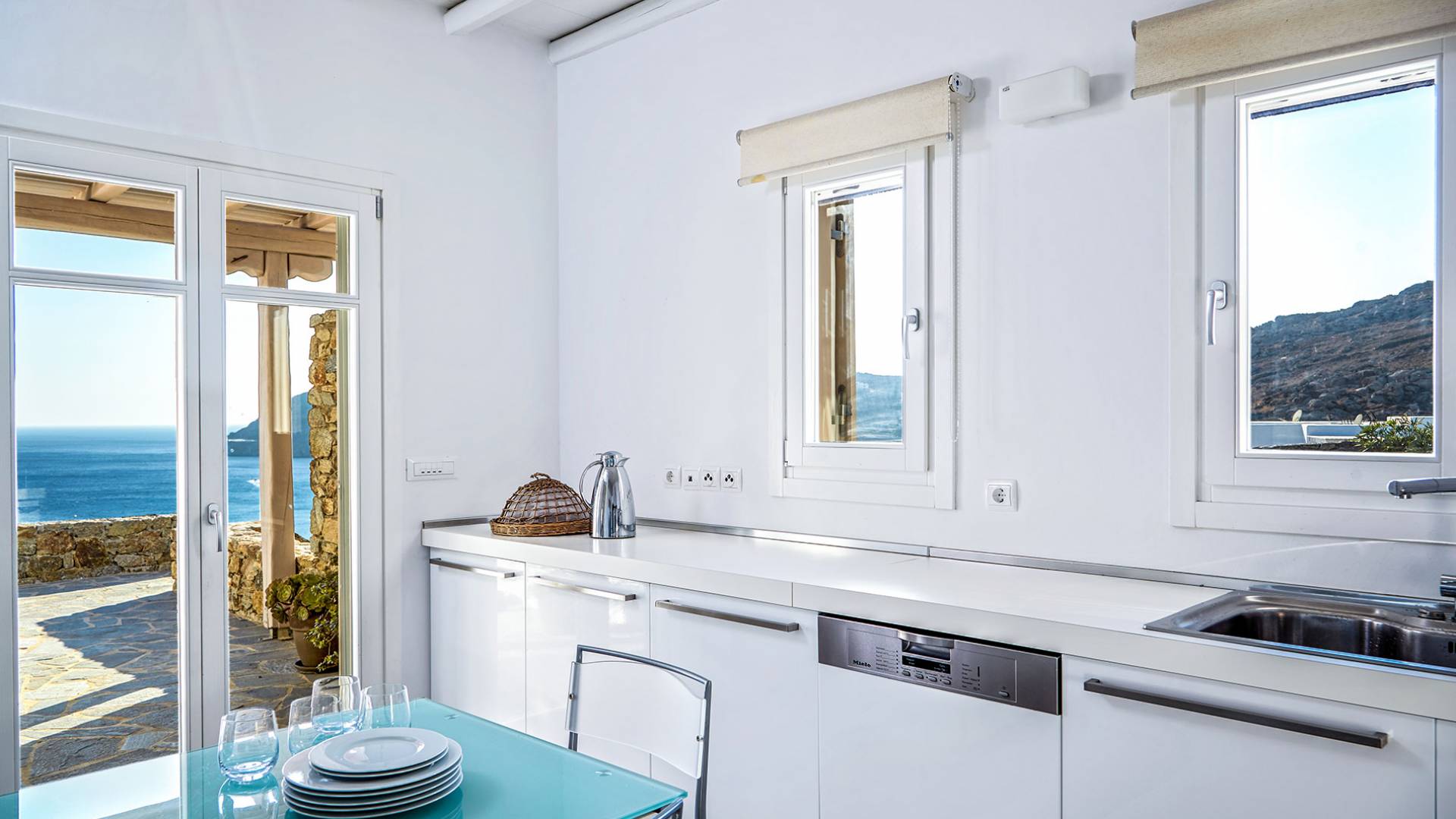 La vista da tutti gli angoli della casa è ininterrotta, non importa se ti trovi all'interno o all'esterno, poiché la casa è costruita con il concetto di avere un contatto visivo costante con l'acqua. I 6 bagni sono realizzati in cemento levigato con curve morbide e colori chiari. La villa è strategicamente situata sopra la spiaggia di Elia e Agrari e puoi guardare entrambe le spiagge da ogni angolo della casa.