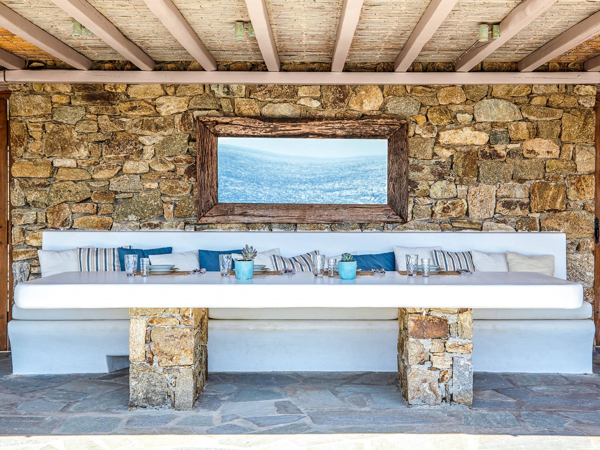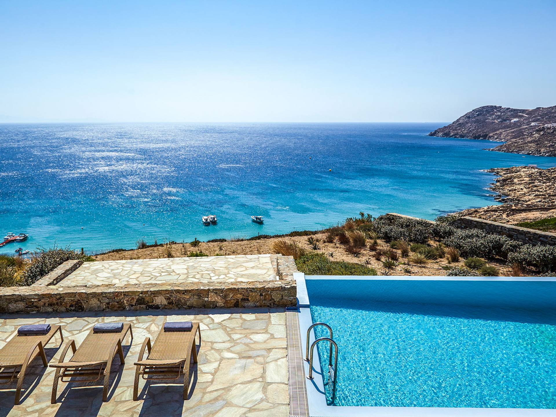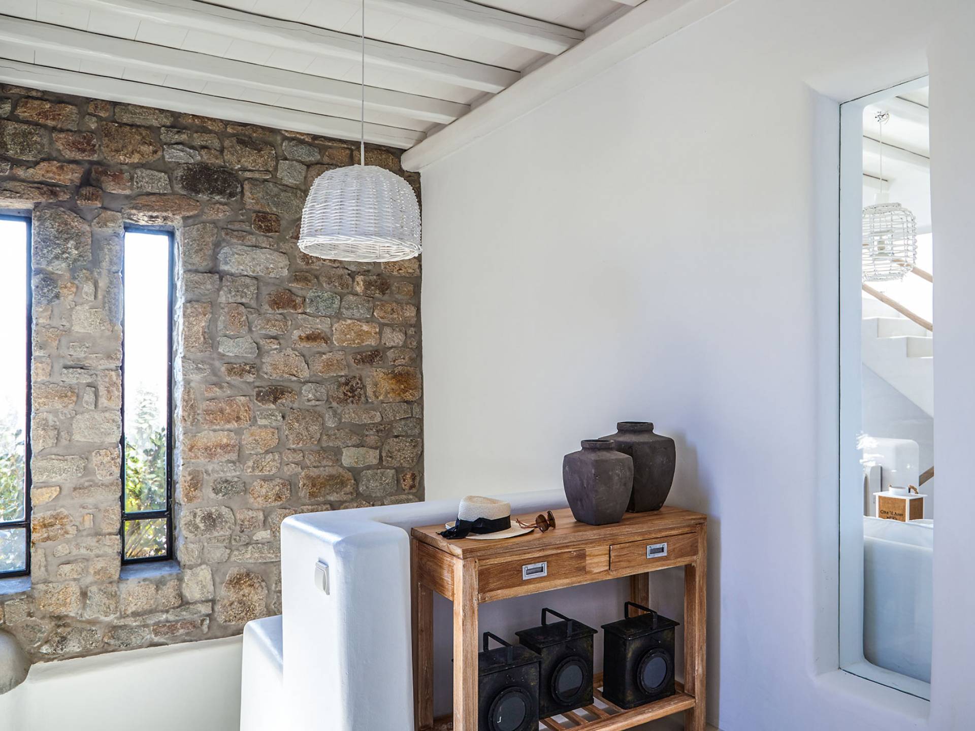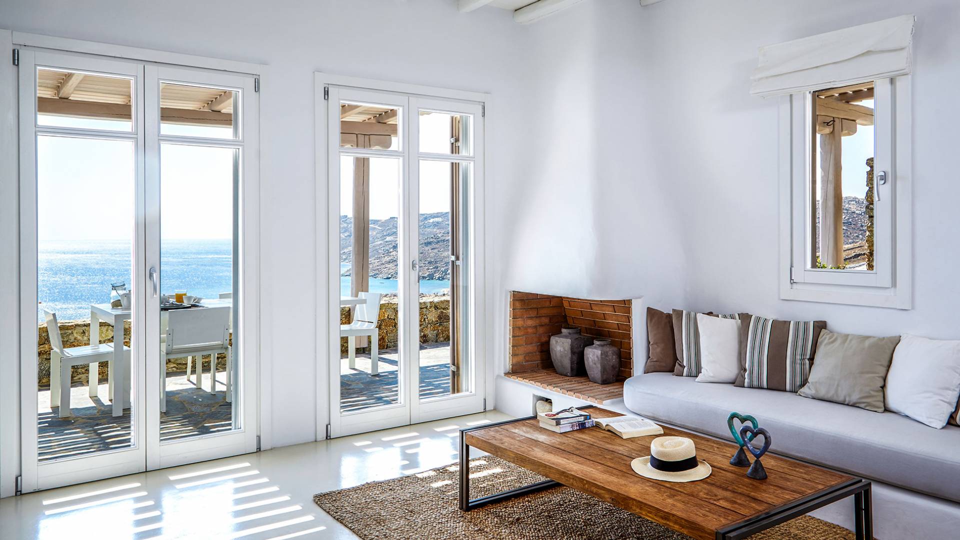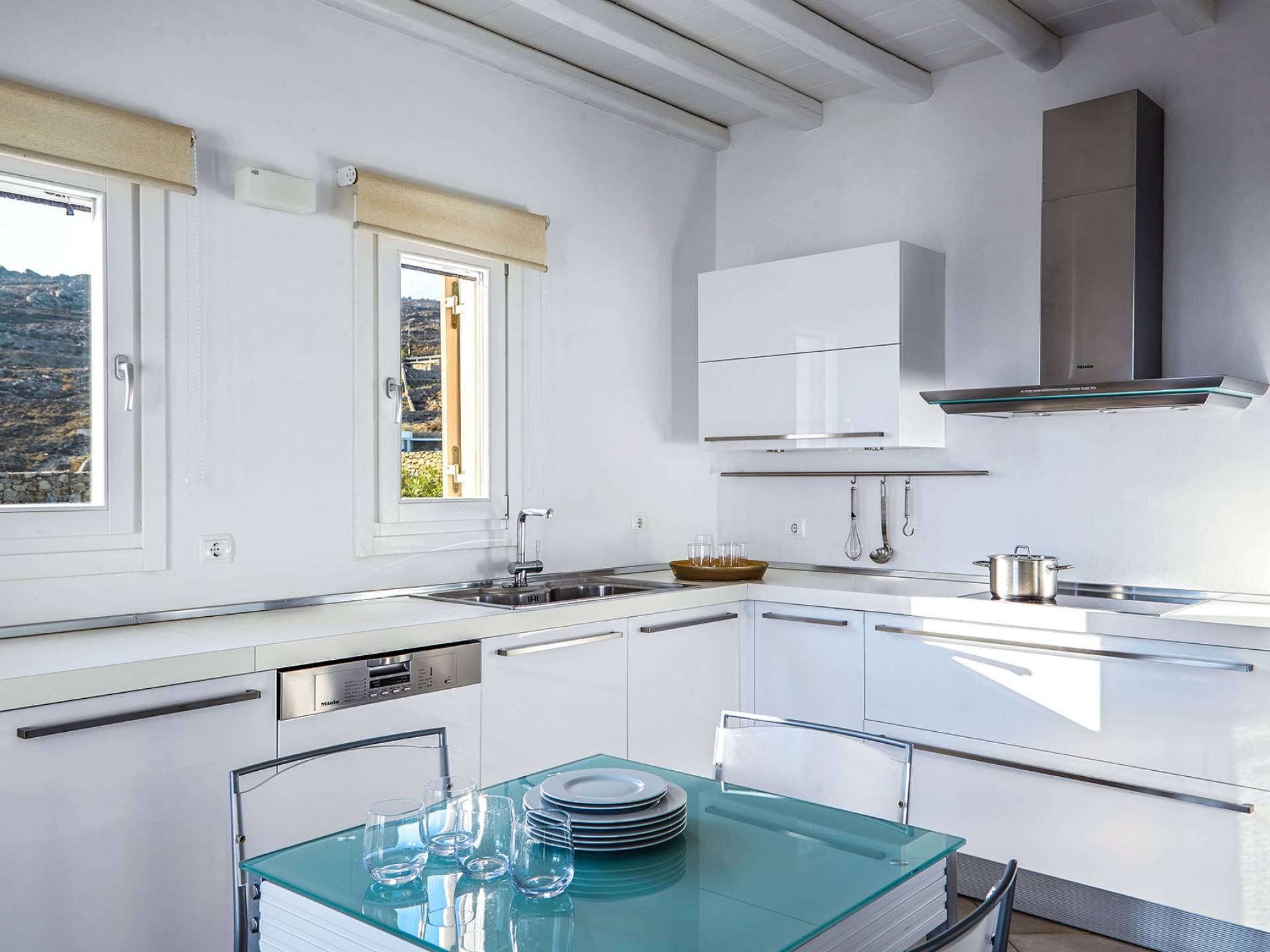 La vista da tutti gli angoli della casa è ininterrotta, non importa se ti trovi all'interno o all'esterno, poiché la casa è costruita con il concetto di avere un contatto visivo costante con l'acqua. I 6 bagni sono realizzati in cemento levigato con curve morbide e colori chiari. La villa è strategicamente situata sopra la spiaggia di Elia e Agrari e puoi guardare entrambe le spiagge da ogni angolo della casa.