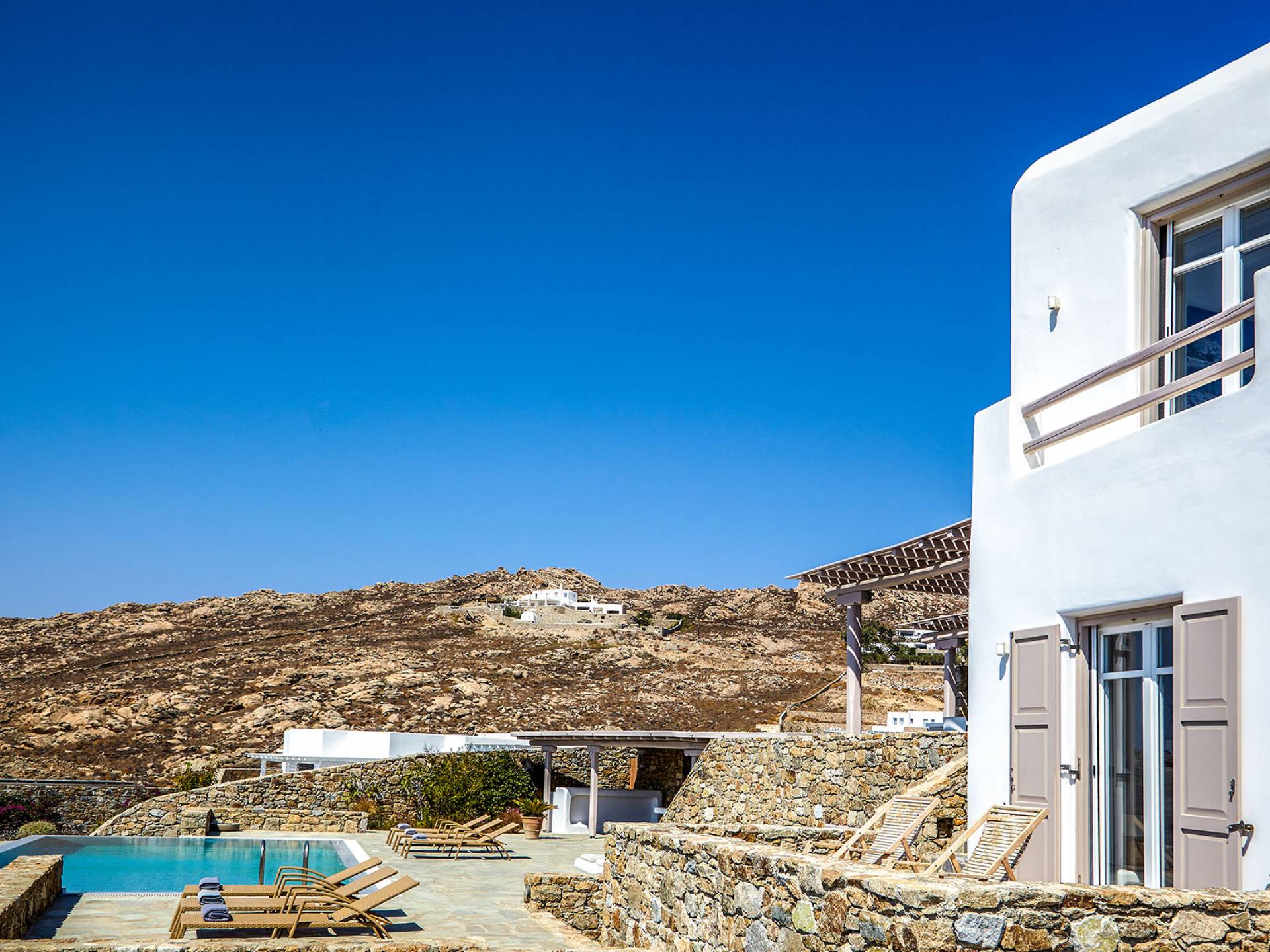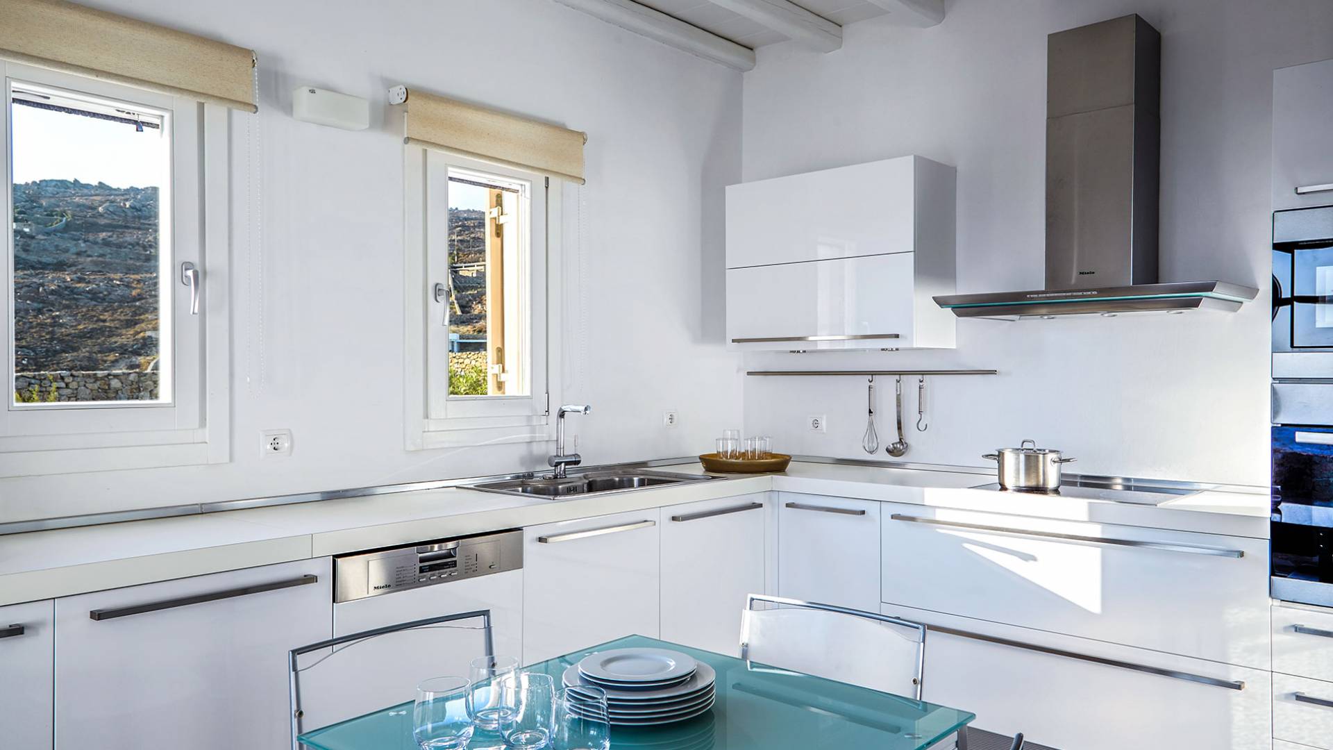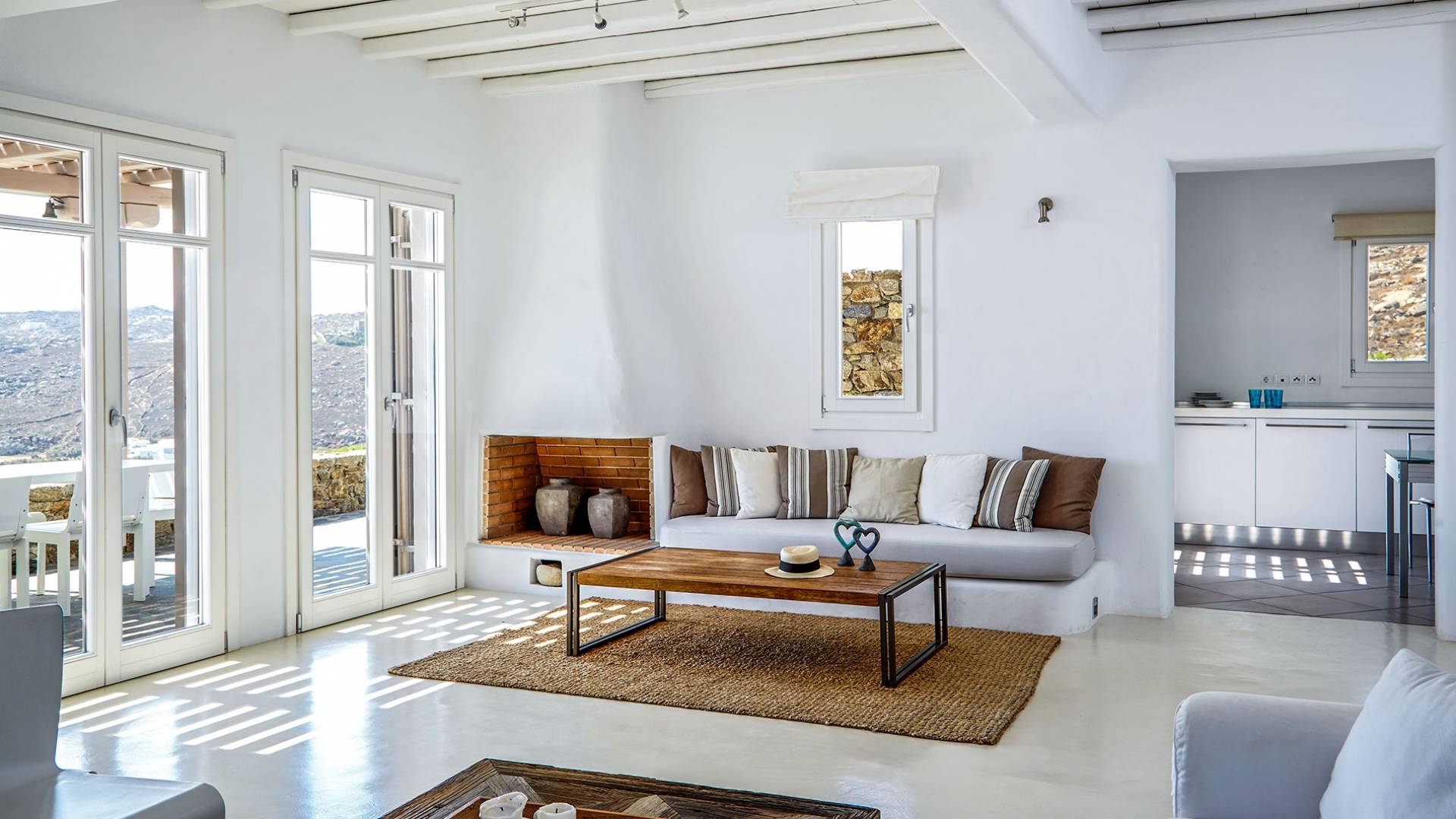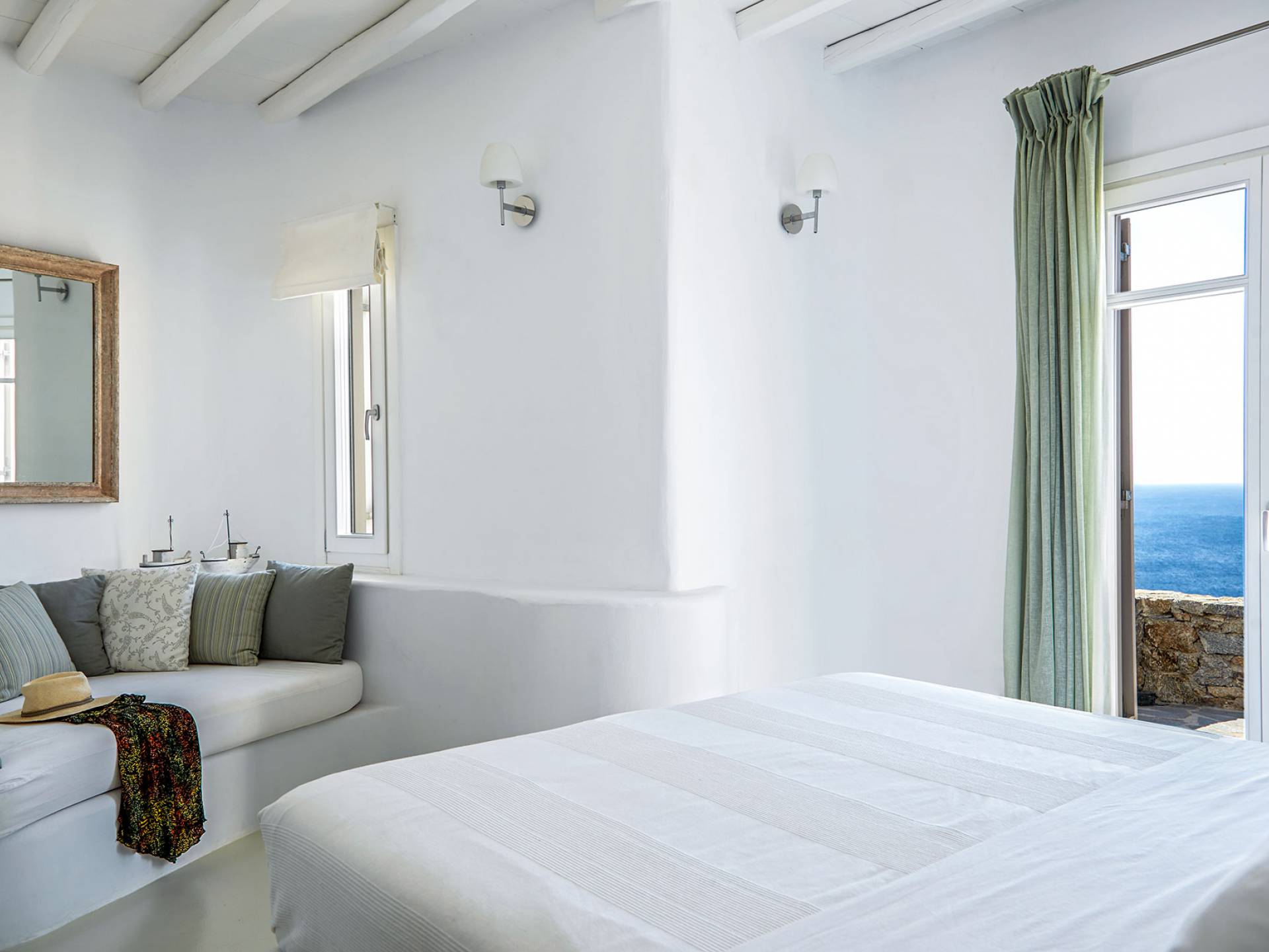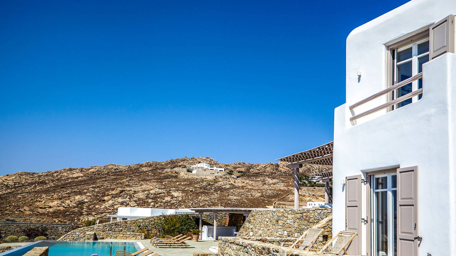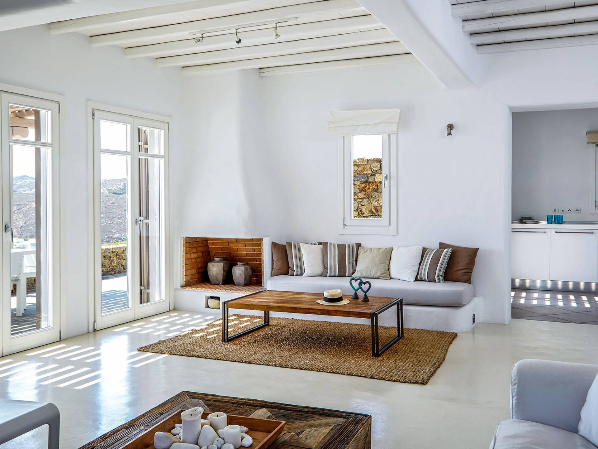 La vista da tutti gli angoli della casa è ininterrotta, non importa se ti trovi all'interno o all'esterno, poiché la casa è costruita con il concetto di avere un contatto visivo costante con l'acqua. I 6 bagni sono realizzati in cemento levigato con curve morbide e colori chiari. La villa è strategicamente situata sopra la spiaggia di Elia e Agrari e puoi guardare entrambe le spiagge da ogni angolo della casa.