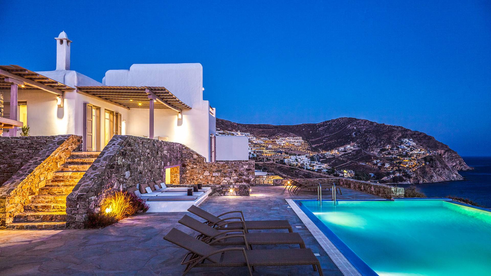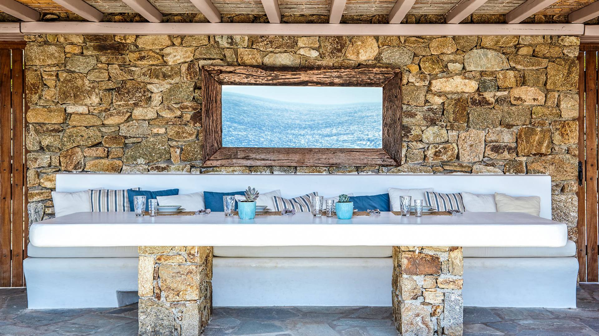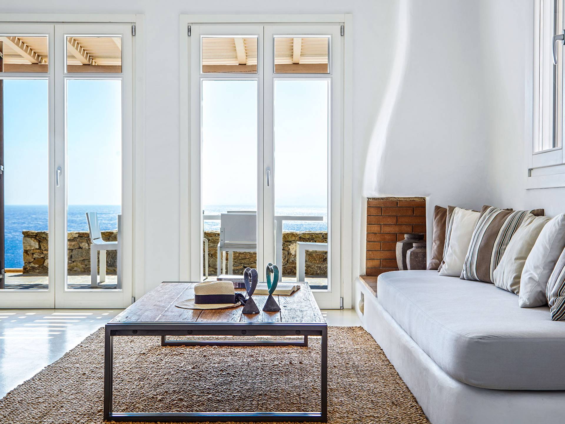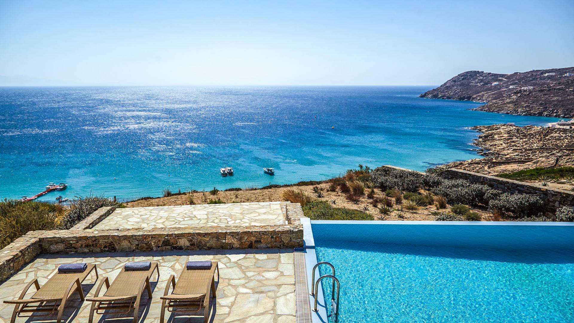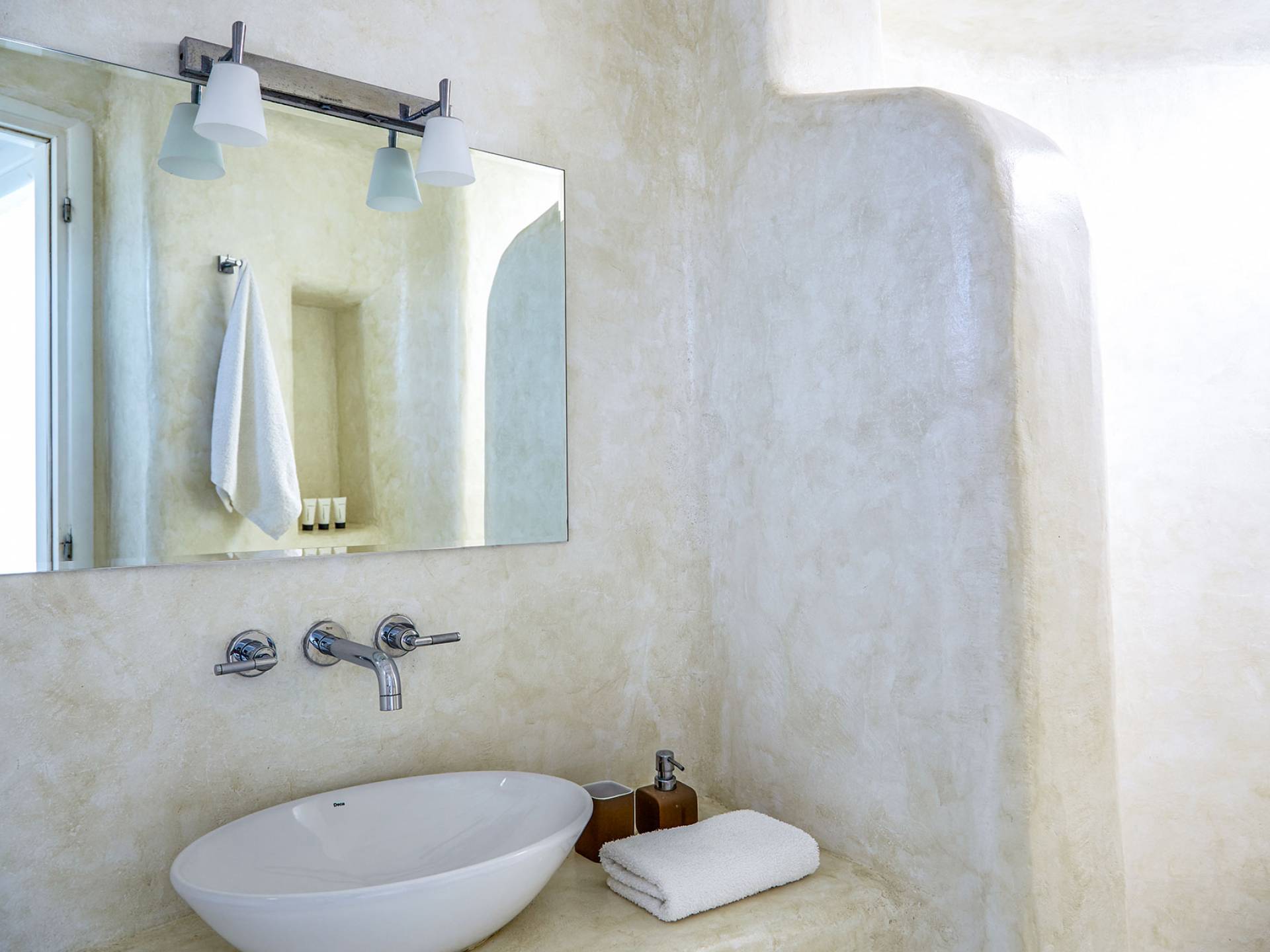 La vista da tutti gli angoli della casa è ininterrotta, non importa se ti trovi all'interno o all'esterno, poiché la casa è costruita con il concetto di avere un contatto visivo costante con l'acqua. I 6 bagni sono realizzati in cemento levigato con curve morbide e colori chiari. La villa è strategicamente situata sopra la spiaggia di Elia e Agrari e puoi guardare entrambe le spiagge da ogni angolo della casa.