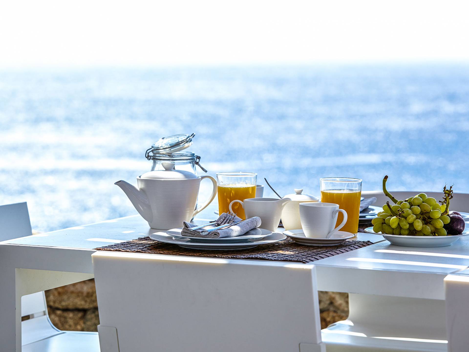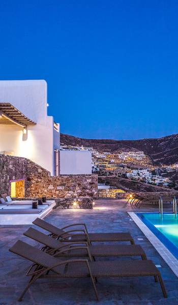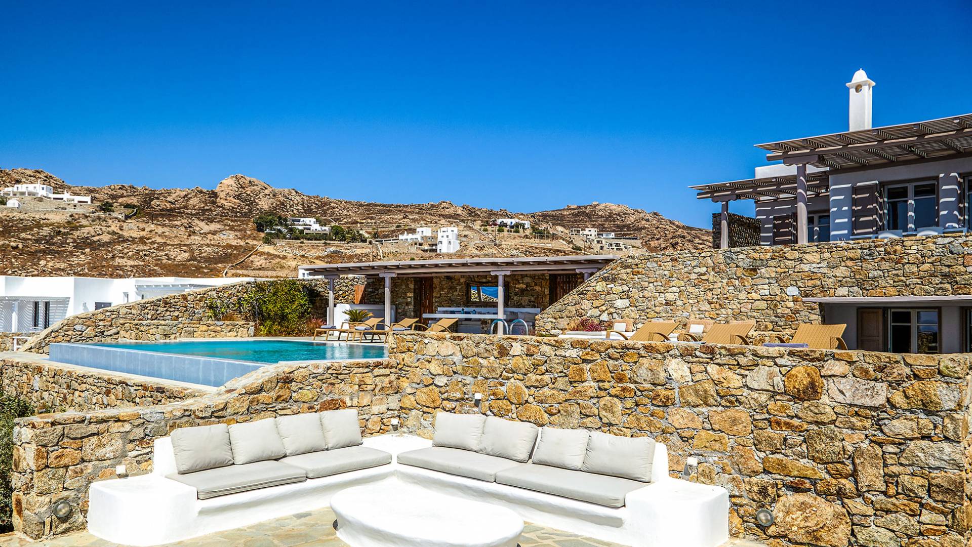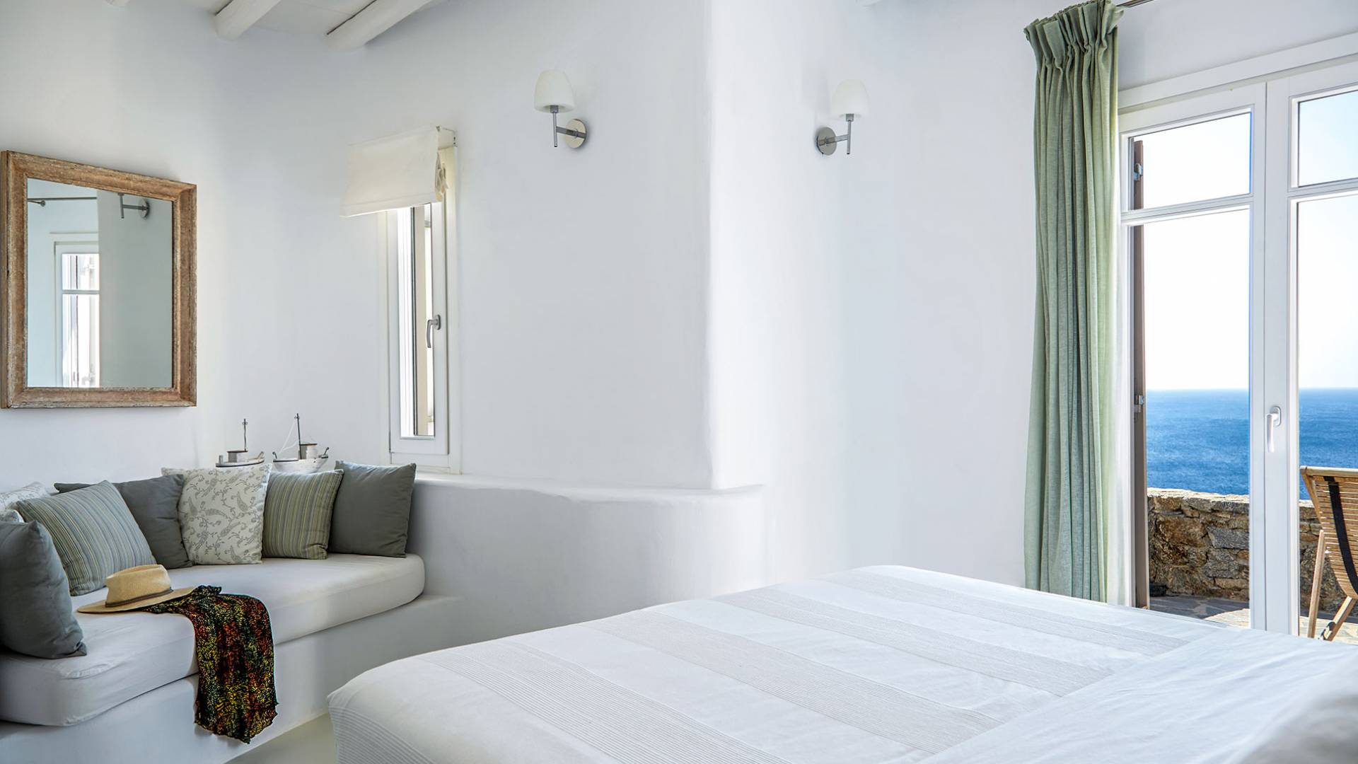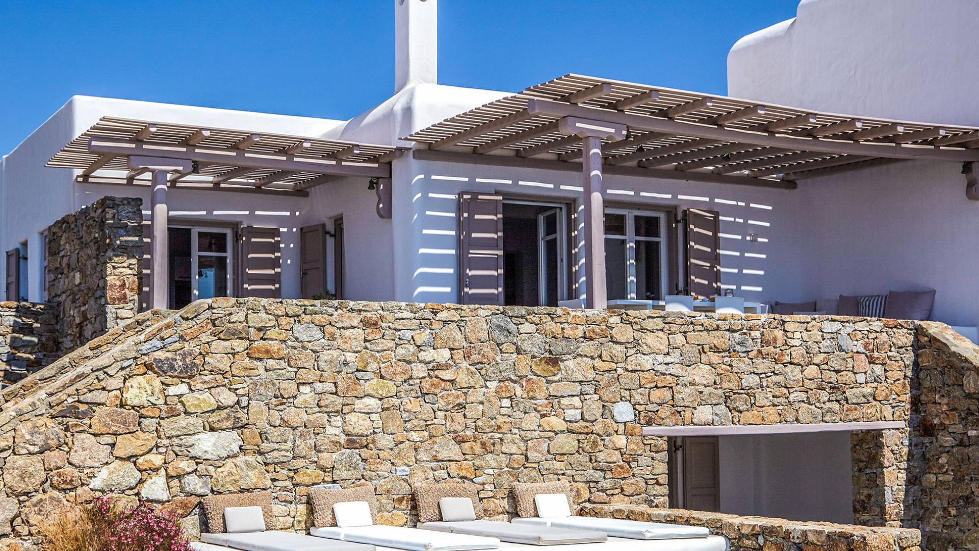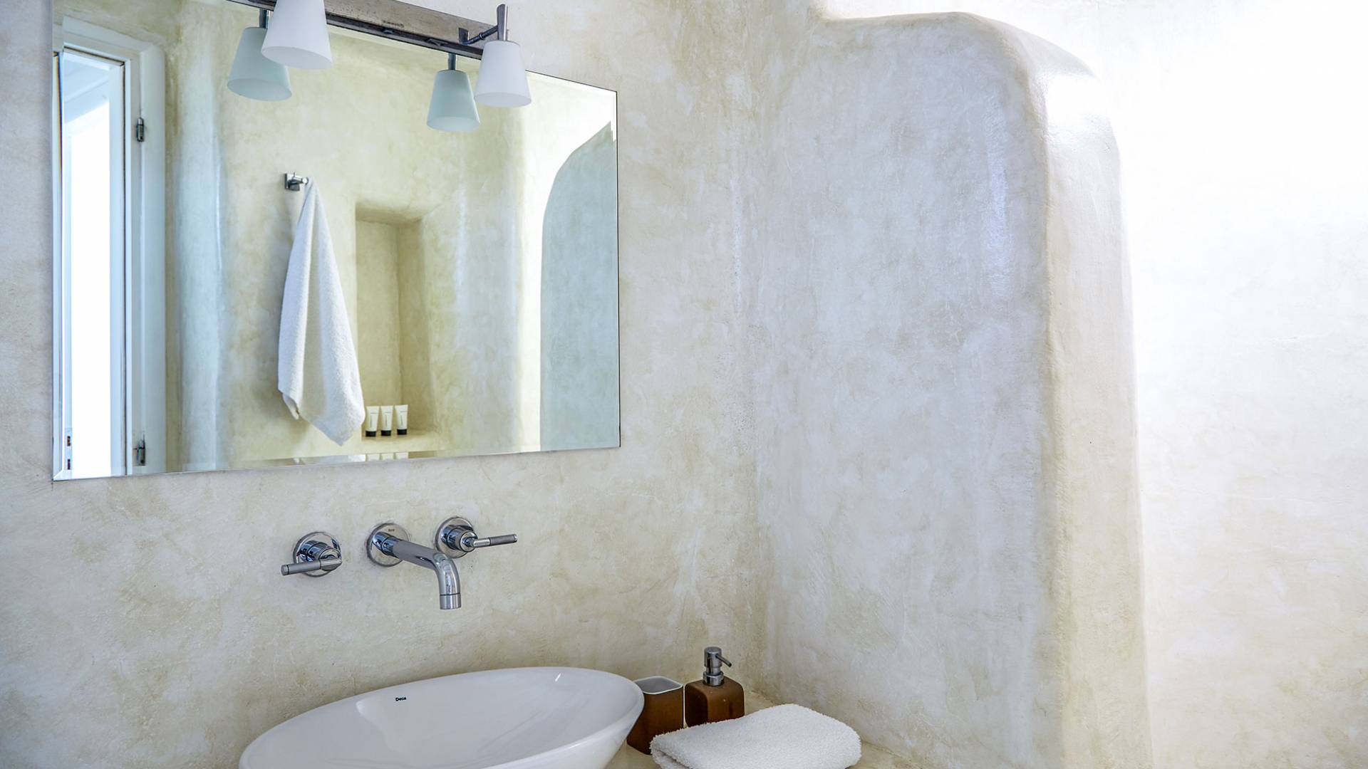 La vista da tutti gli angoli della casa è ininterrotta, non importa se ti trovi all'interno o all'esterno, poiché la casa è costruita con il concetto di avere un contatto visivo costante con l'acqua. I 6 bagni sono realizzati in cemento levigato con curve morbide e colori chiari. La villa è strategicamente situata sopra la spiaggia di Elia e Agrari e puoi guardare entrambe le spiagge da ogni angolo della casa.