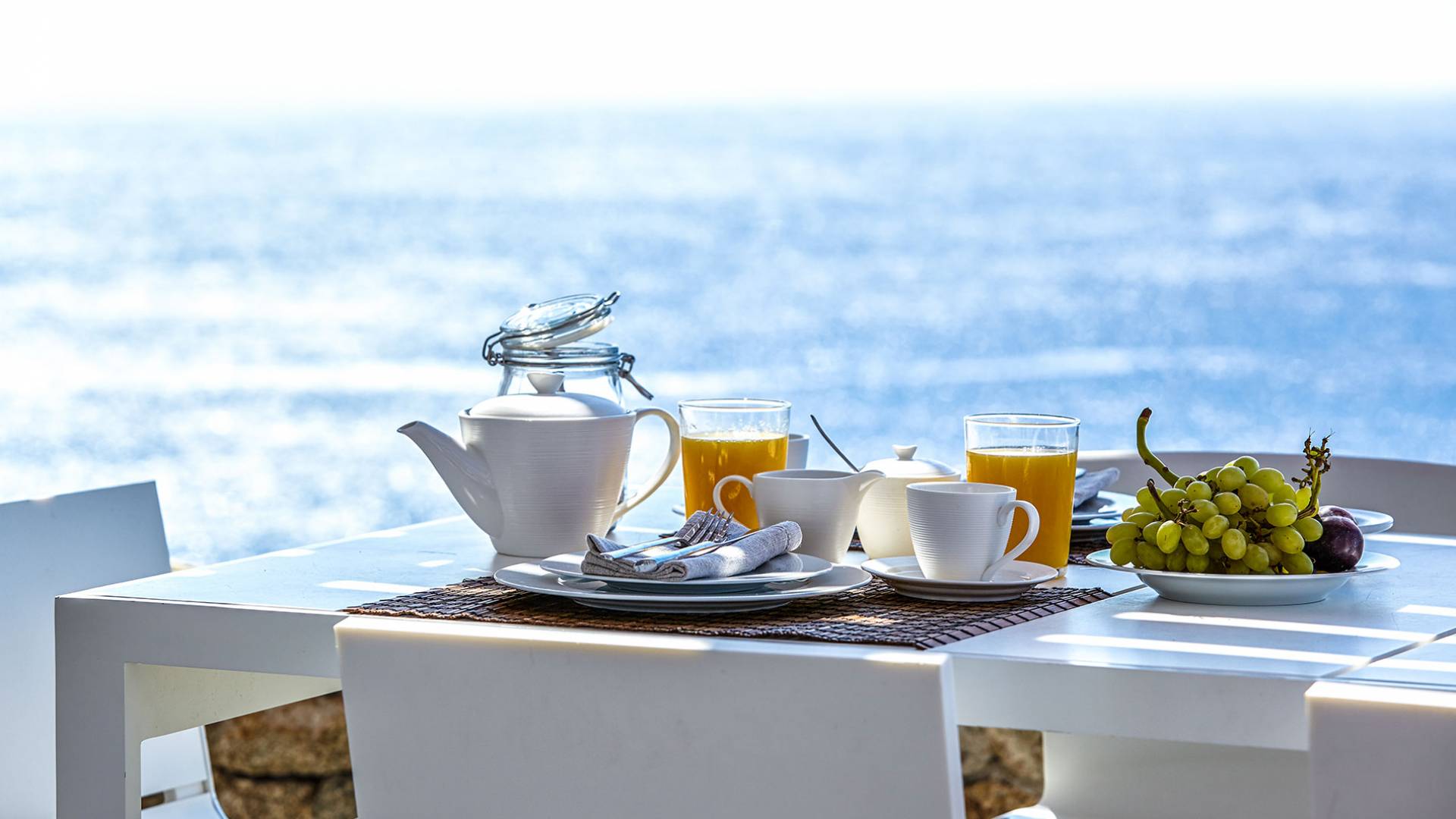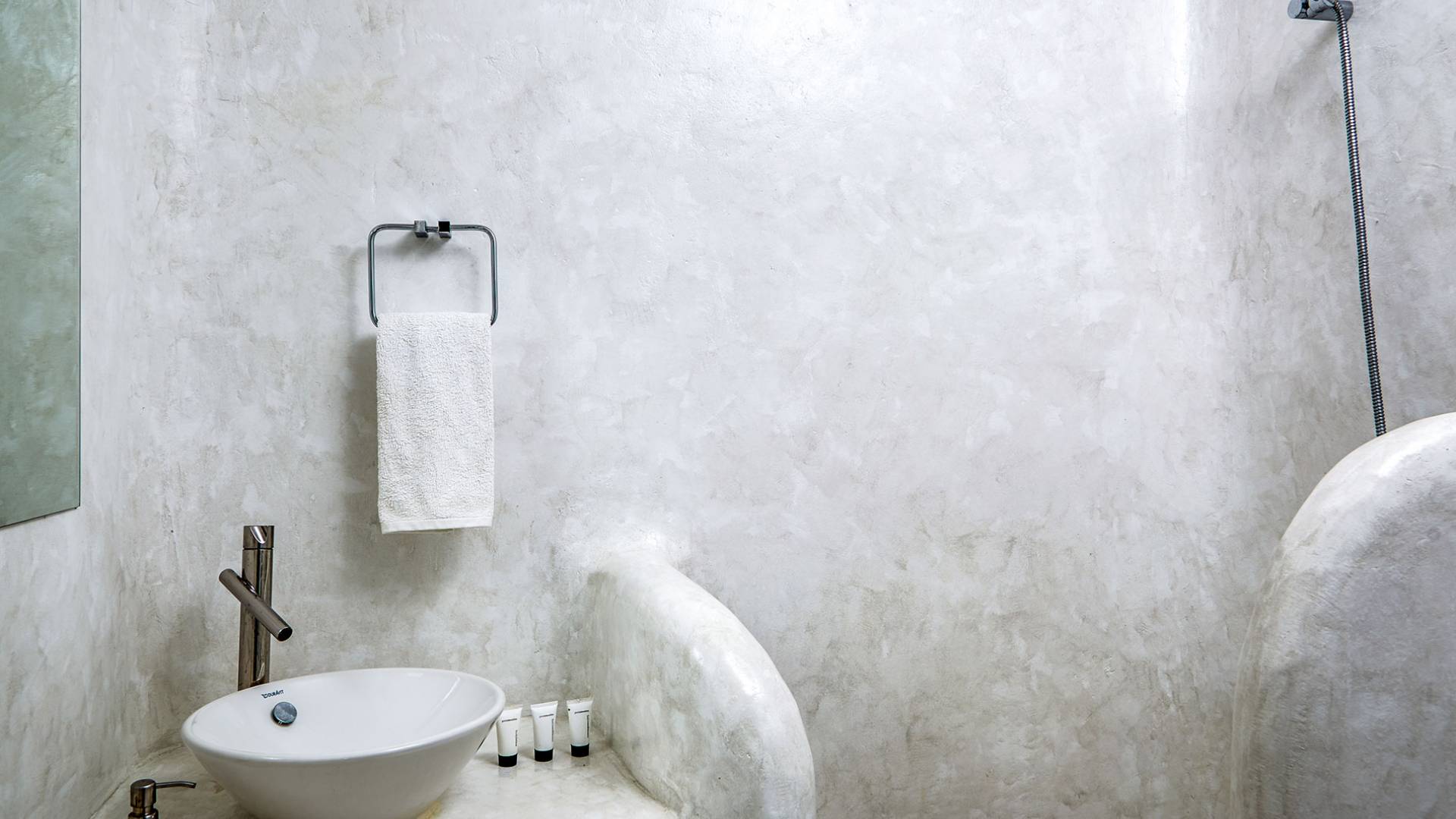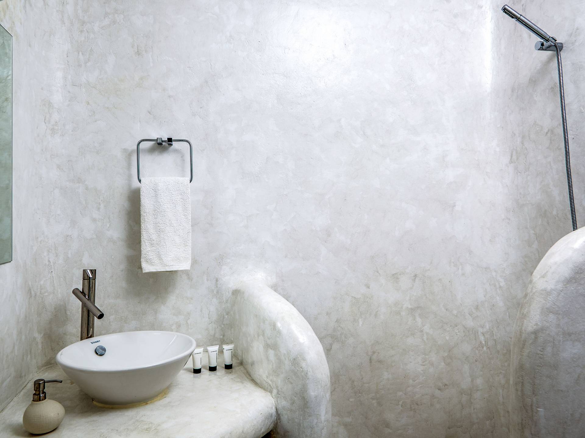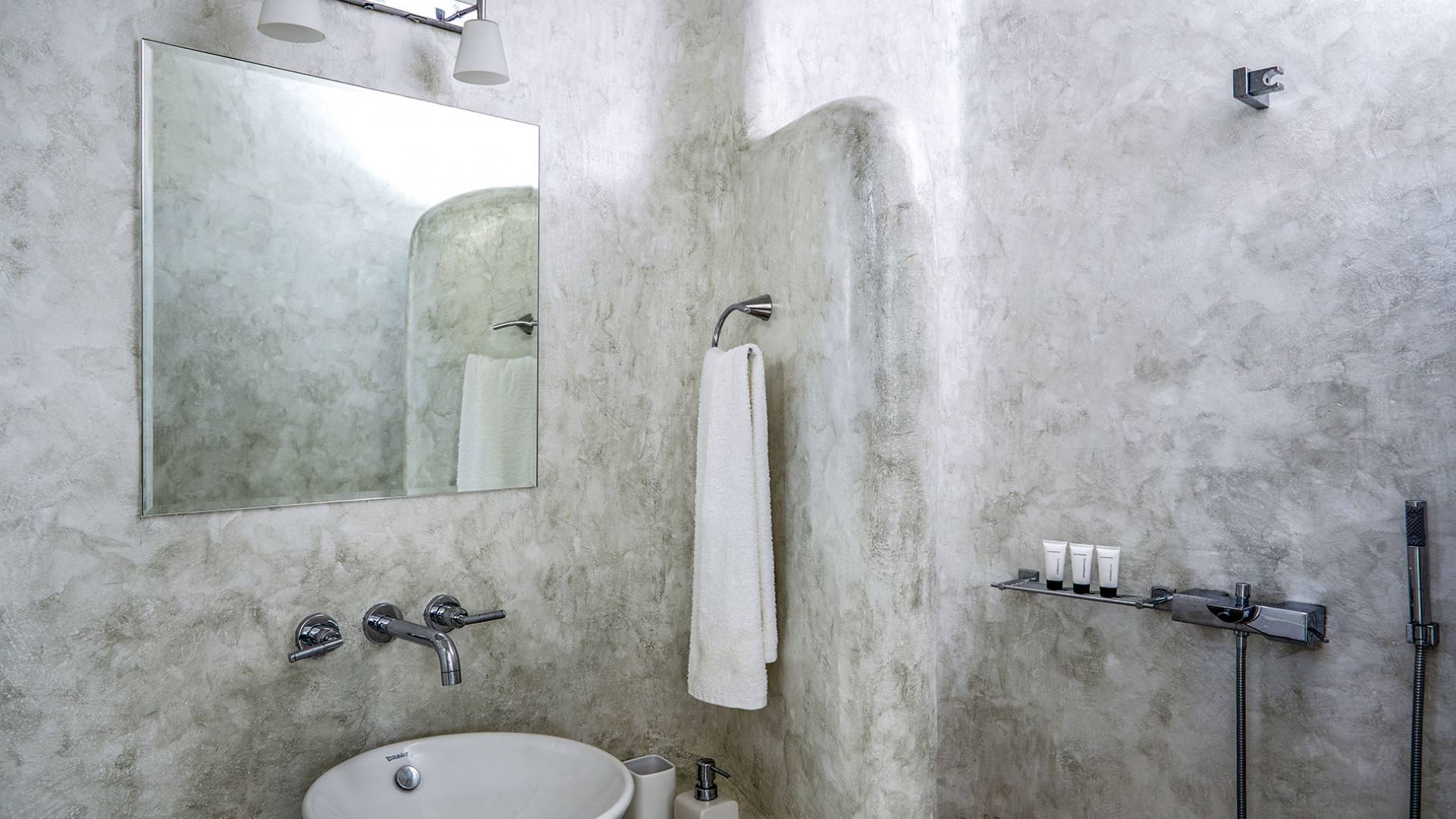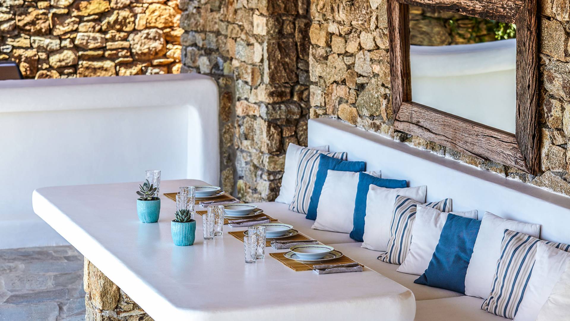 La vista da tutti gli angoli della casa è ininterrotta, non importa se ti trovi all'interno o all'esterno, poiché la casa è costruita con il concetto di avere un contatto visivo costante con l'acqua. I 6 bagni sono realizzati in cemento levigato con curve morbide e colori chiari. La villa è strategicamente situata sopra la spiaggia di Elia e Agrari e puoi guardare entrambe le spiagge da ogni angolo della casa.