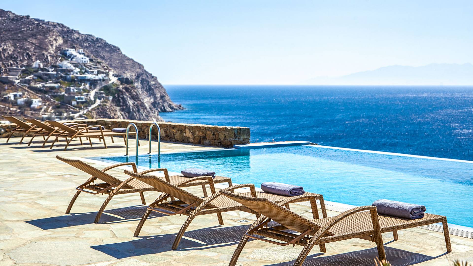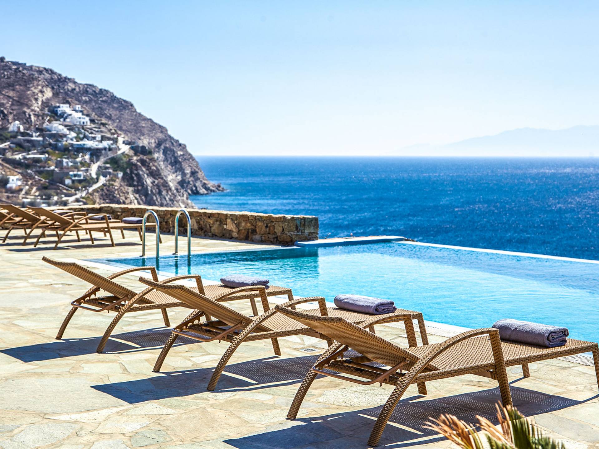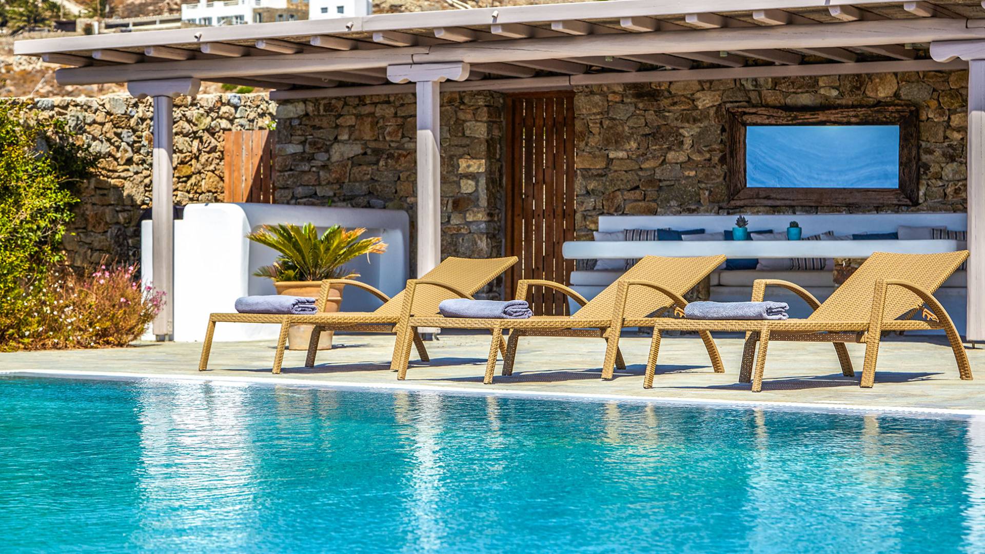 La piscina privata a sfioro è situata in una posizione in cui la vista sull'acqua della piscina si tuffa nell'azzurro del mare. L'acqua scorre da ogni punto di vista della villa. La sinfonia di colori del mare e del cielo cambia durante il giorno e raggiunge il suo apice all'ora del tramonto. C'è un tavolo costruito sotto un pergolato ombreggiato adatto per pasti epicurei o momenti di relax. C'è anche un barbecue e un bar esterno nell'area della piscina. Le dimensioni dell'area della piscina privata possono contenere facilmente eventi fino a 150 persone.