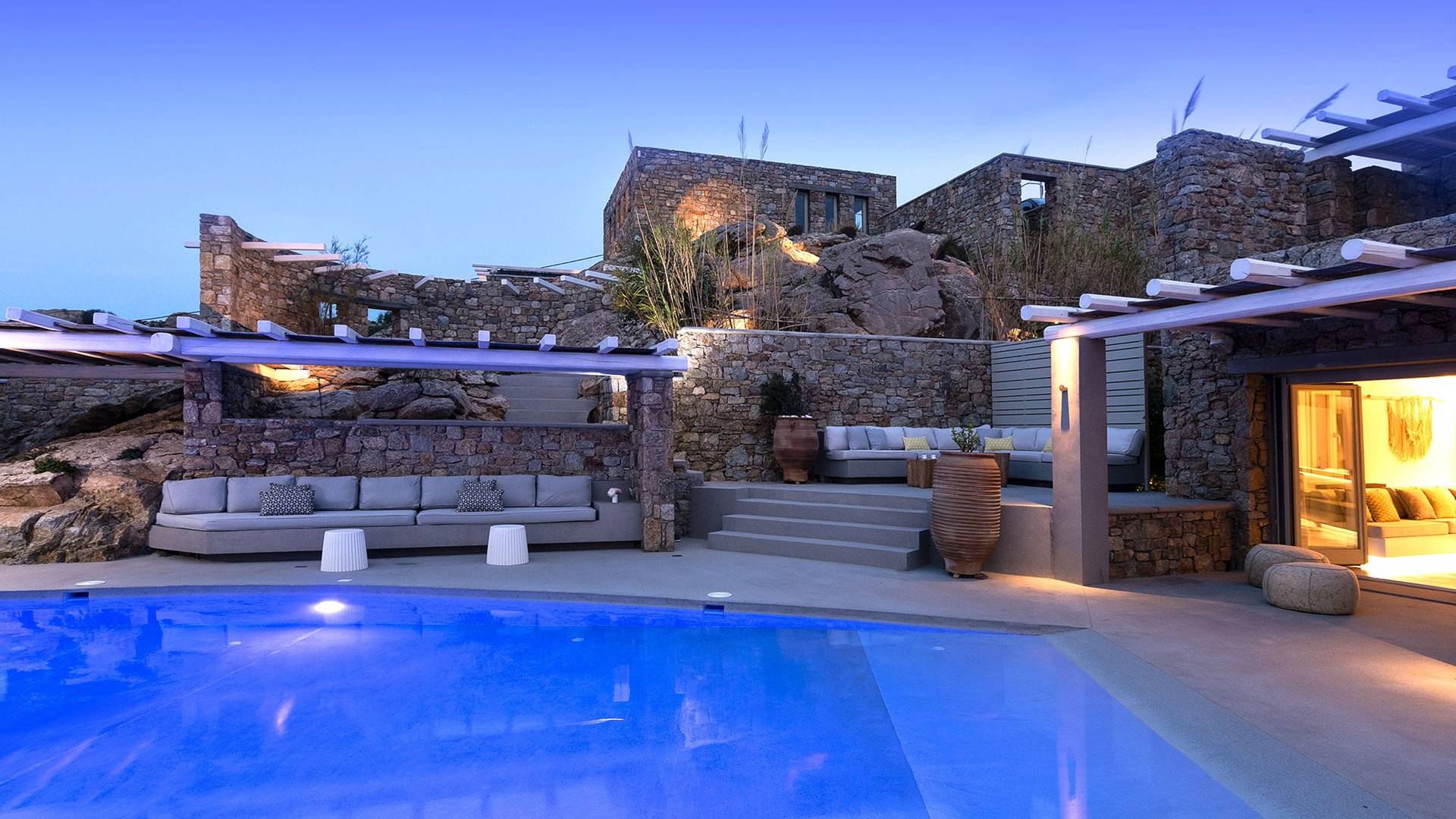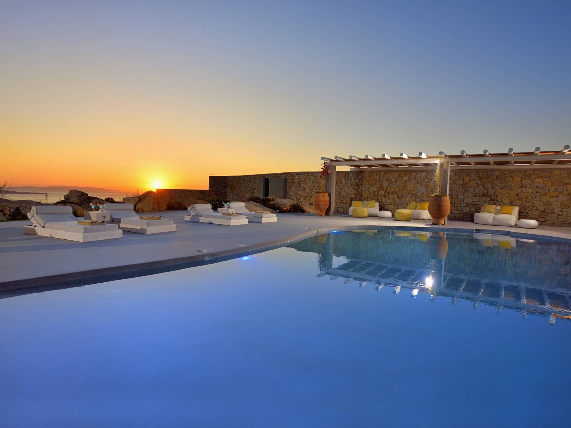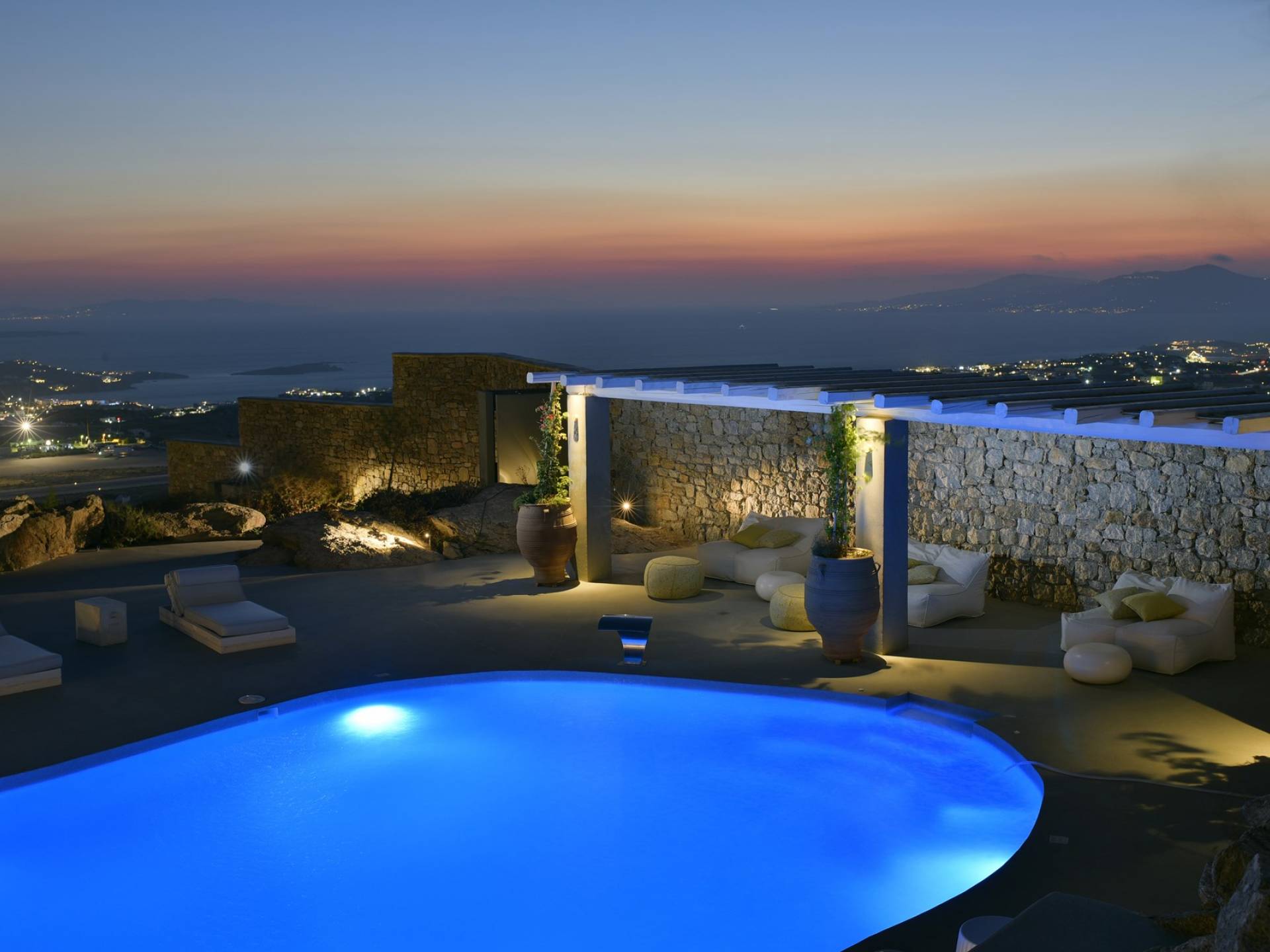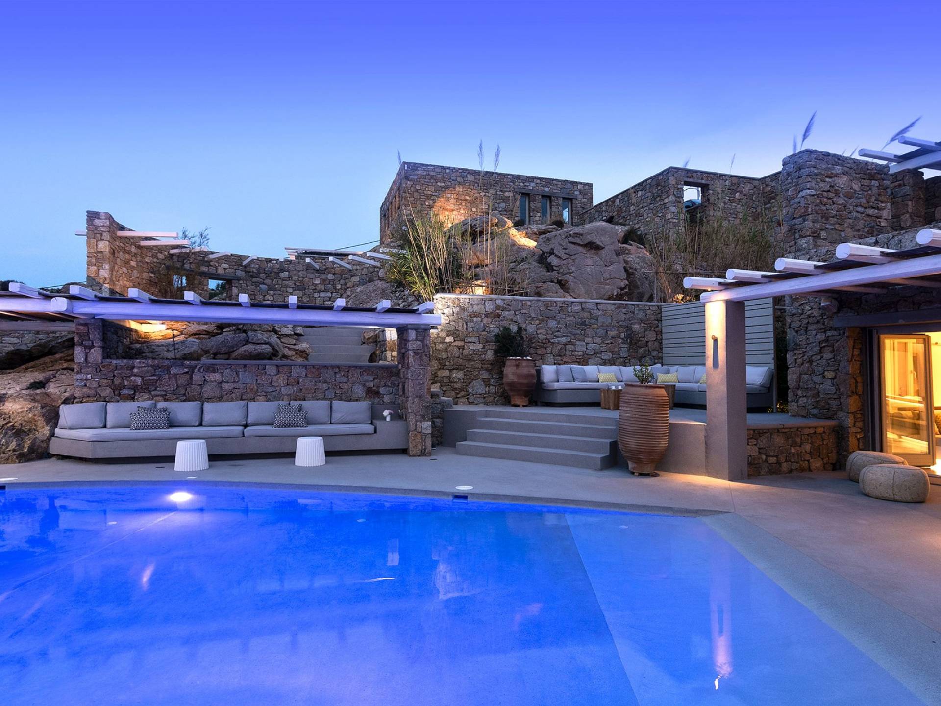Villa Moonstone Mykonos ha l'area esterna da sogno di 500 mq in totale. Divani letto, lettini prendisole e tre livelli di patii con comodi cuscini e una piscina privata con vasca idromassaggio (100 mq) sono solo alcune delle sue infinite caratteristiche.