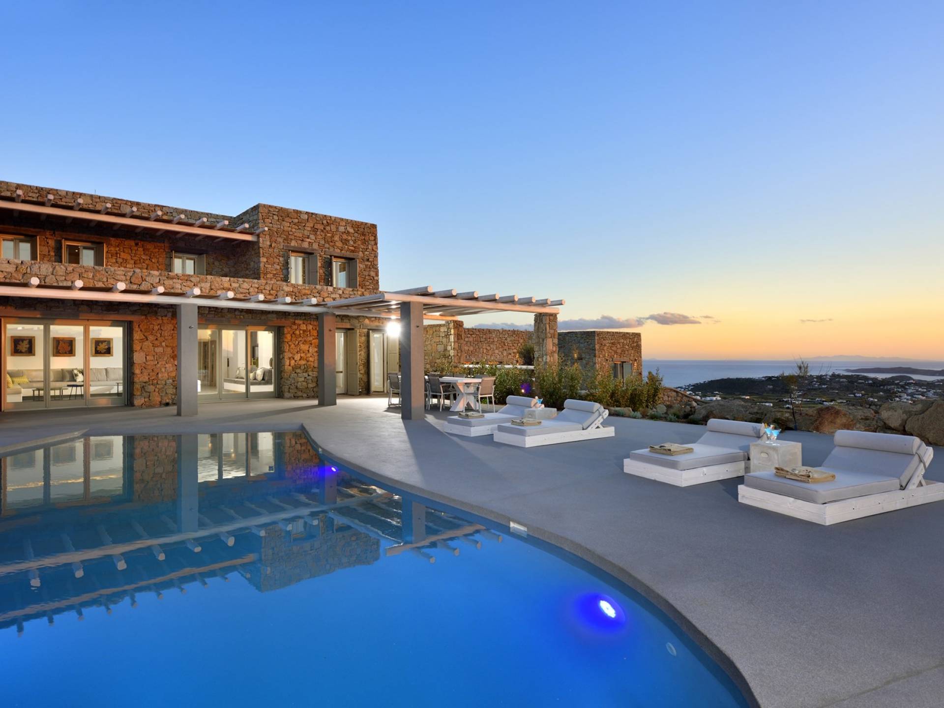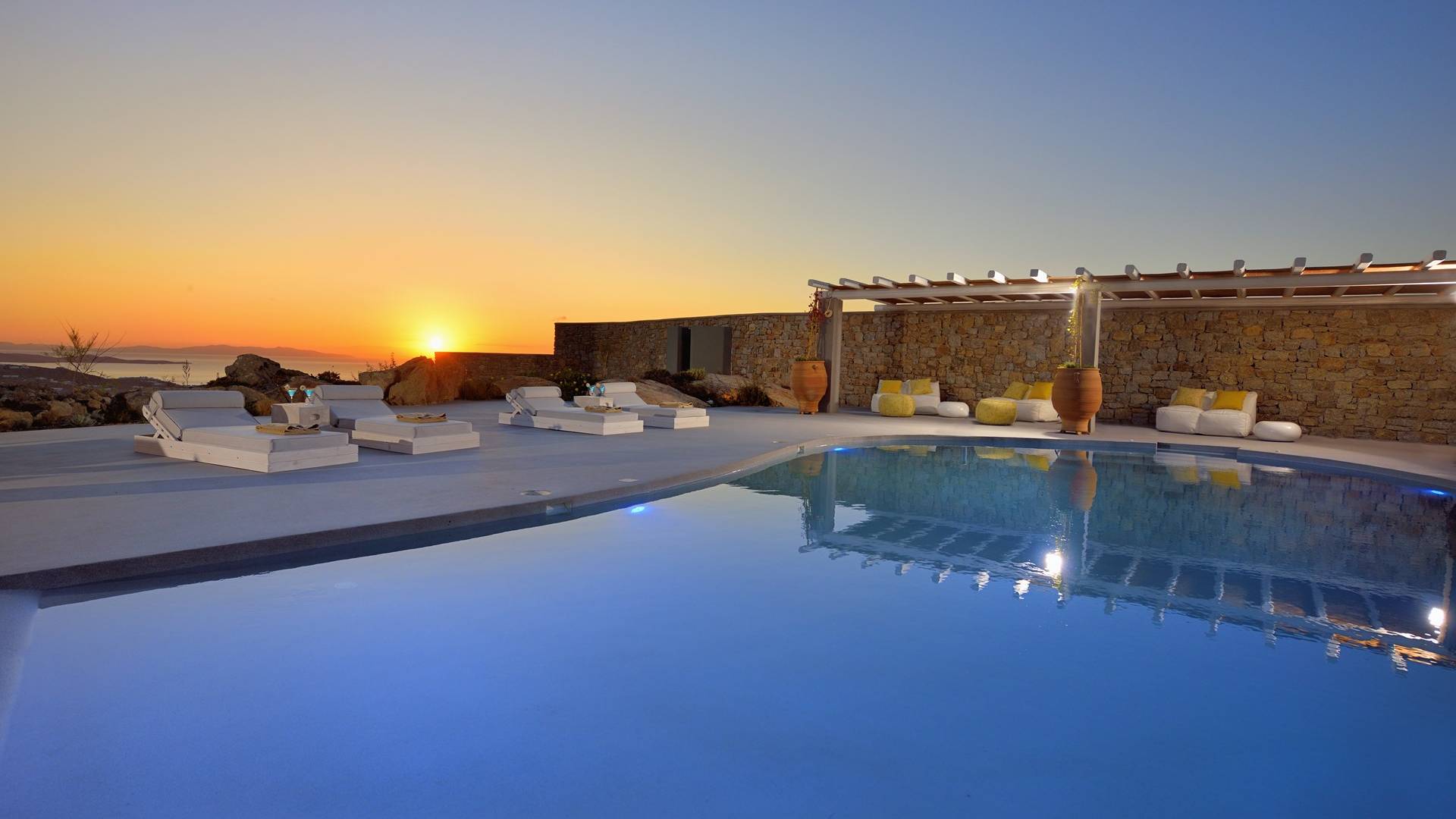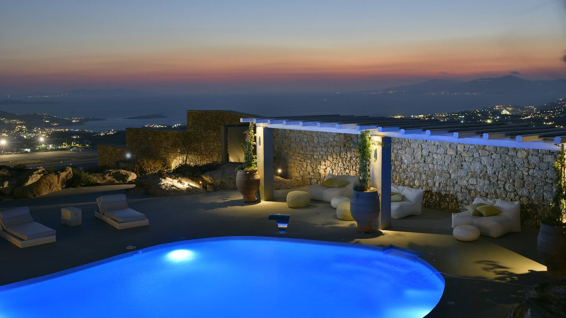 Villa Moonstone Mykonos ha l'area esterna da sogno di 500 mq in totale. Divani letto, lettini prendisole e tre livelli di patii con comodi cuscini e una piscina privata con vasca idromassaggio (100 mq) sono solo alcune delle sue infinite caratteristiche.