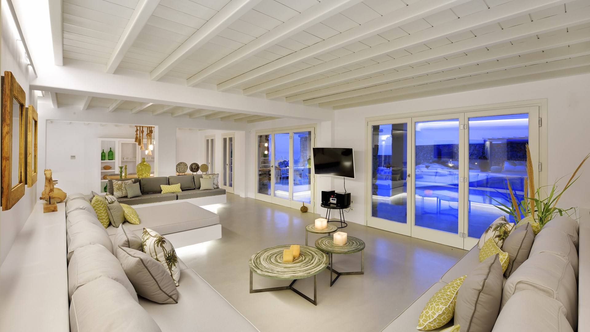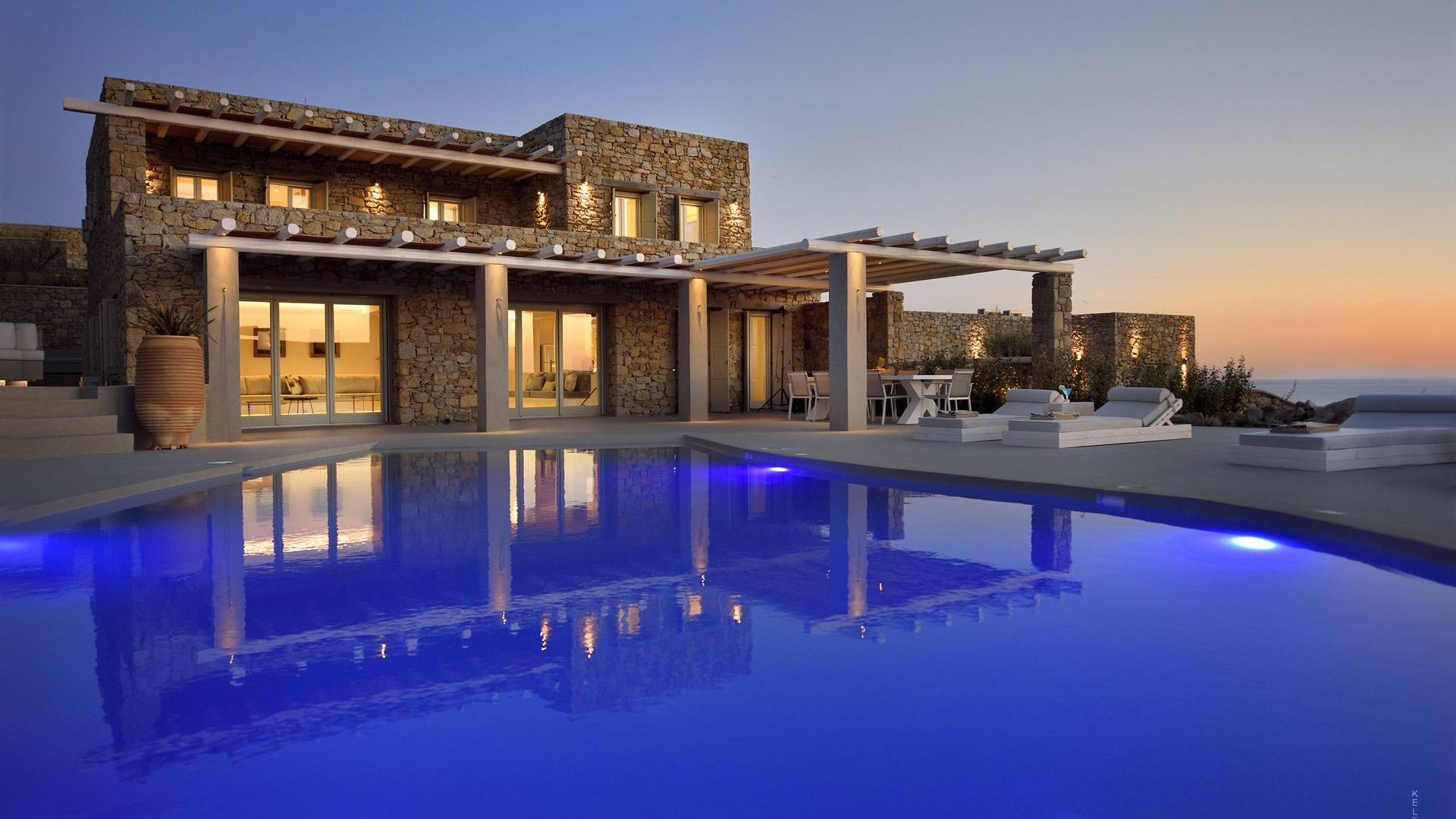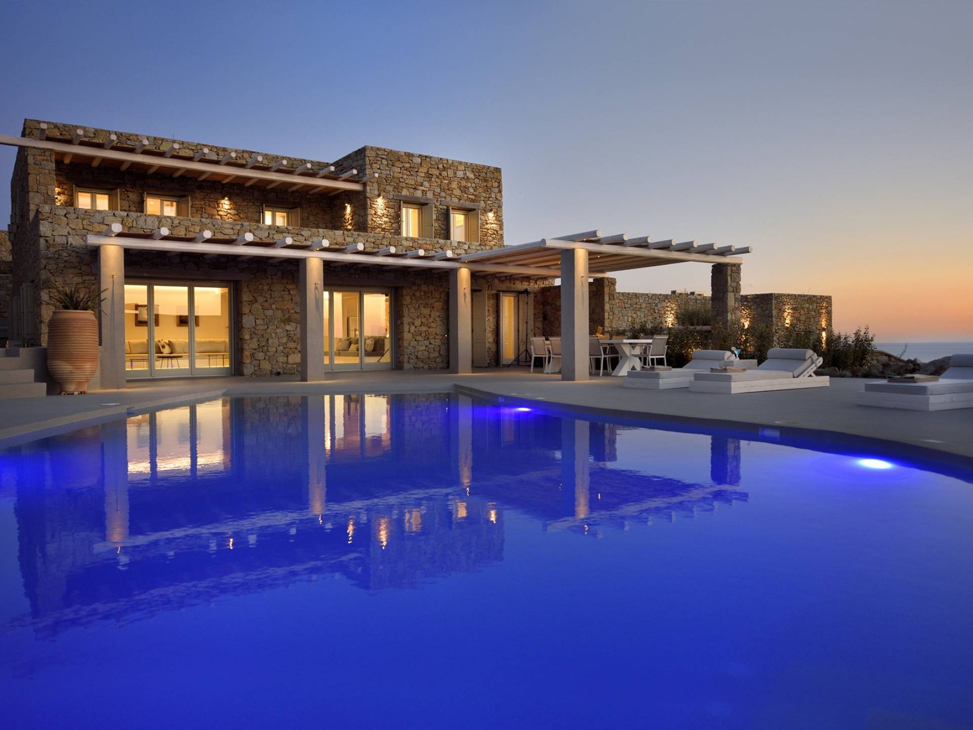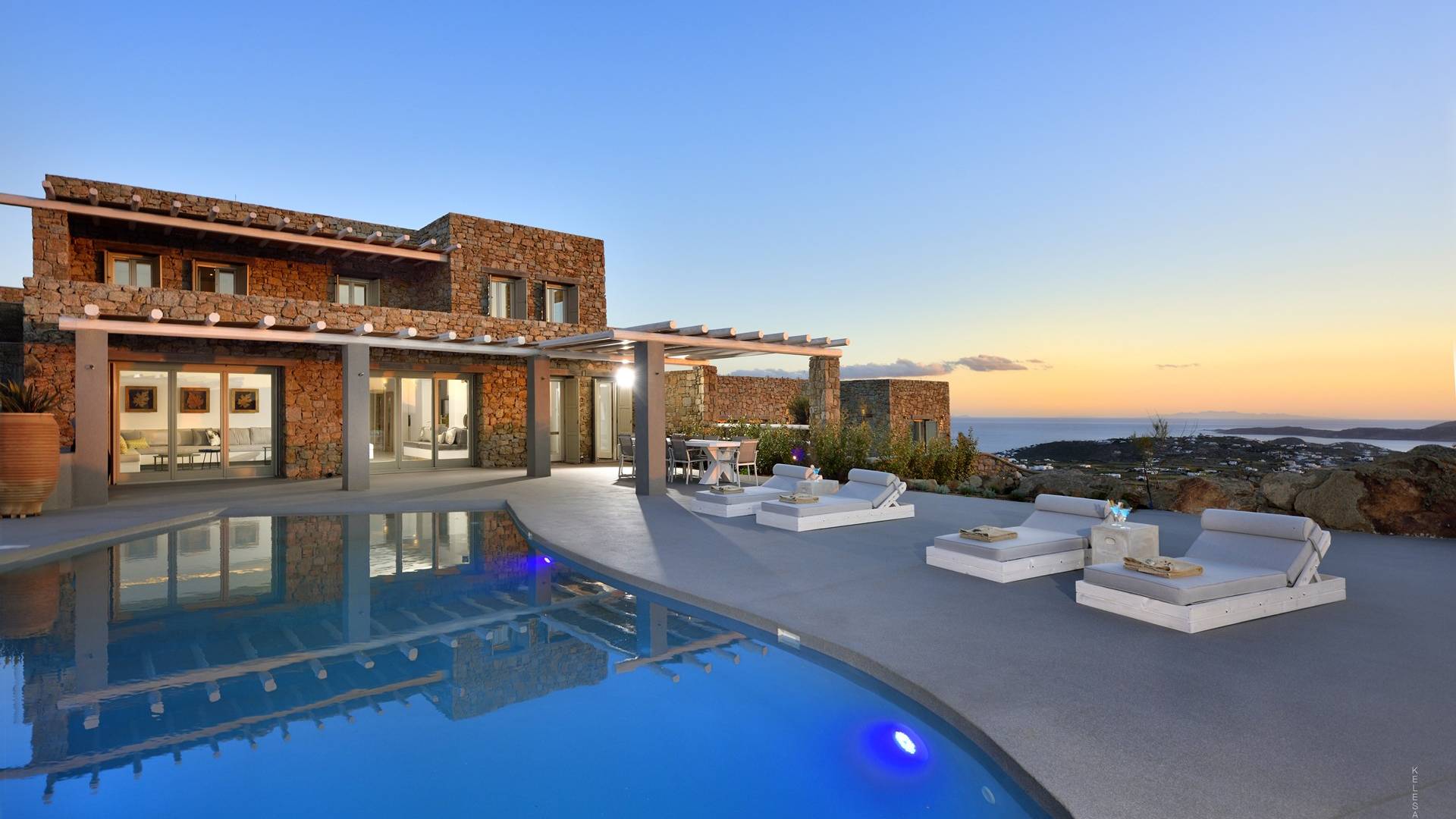 Villa Moonstone Mykonos ha l'area esterna da sogno di 500 mq in totale. Divani letto, lettini prendisole e tre livelli di patii con comodi cuscini e una piscina privata con vasca idromassaggio (100 mq) sono solo alcune delle sue infinite caratteristiche.