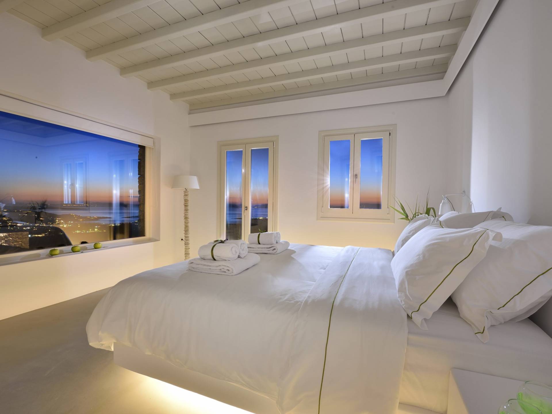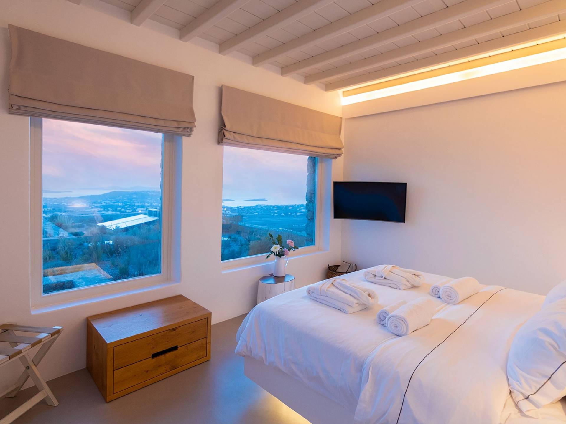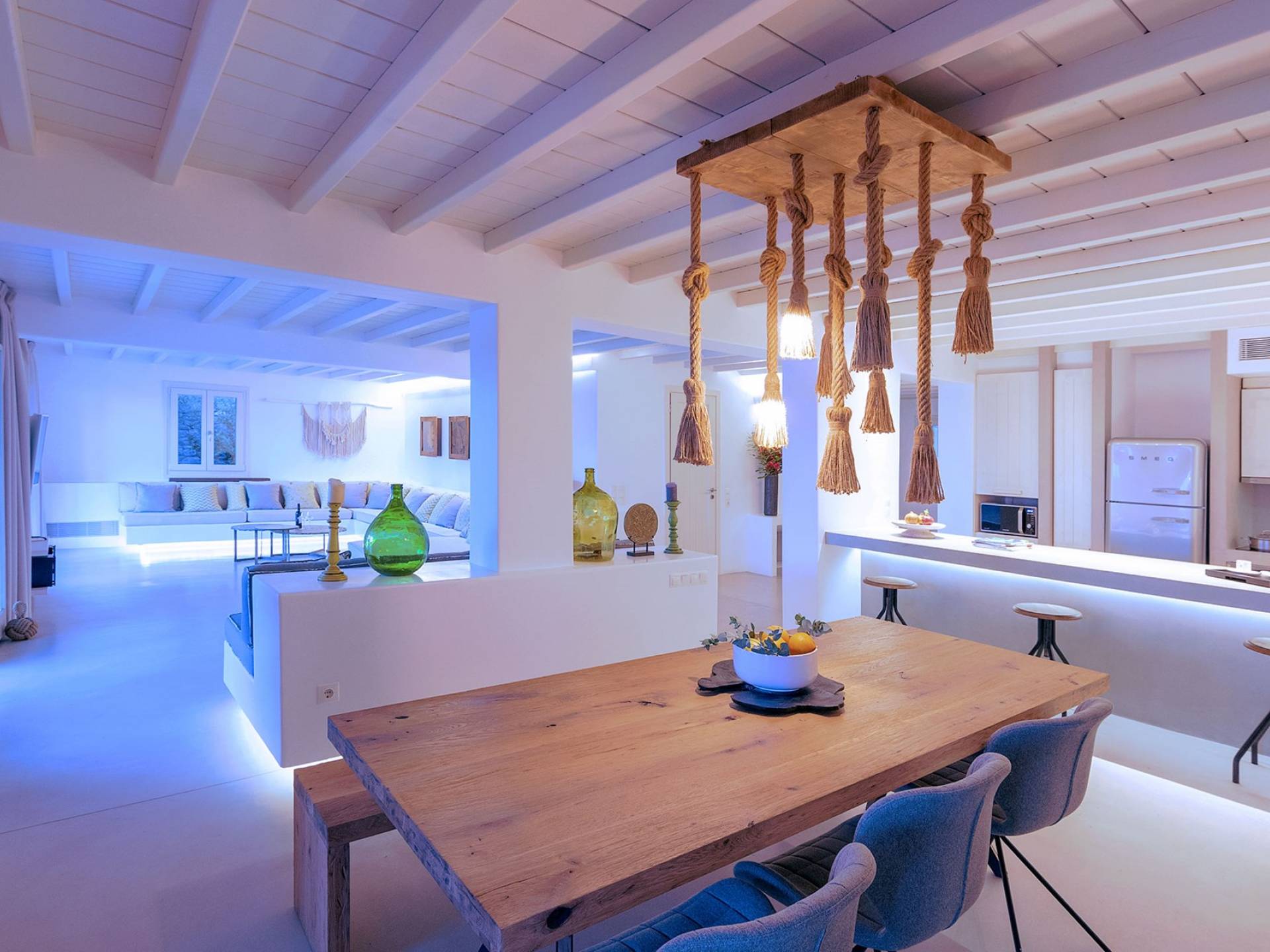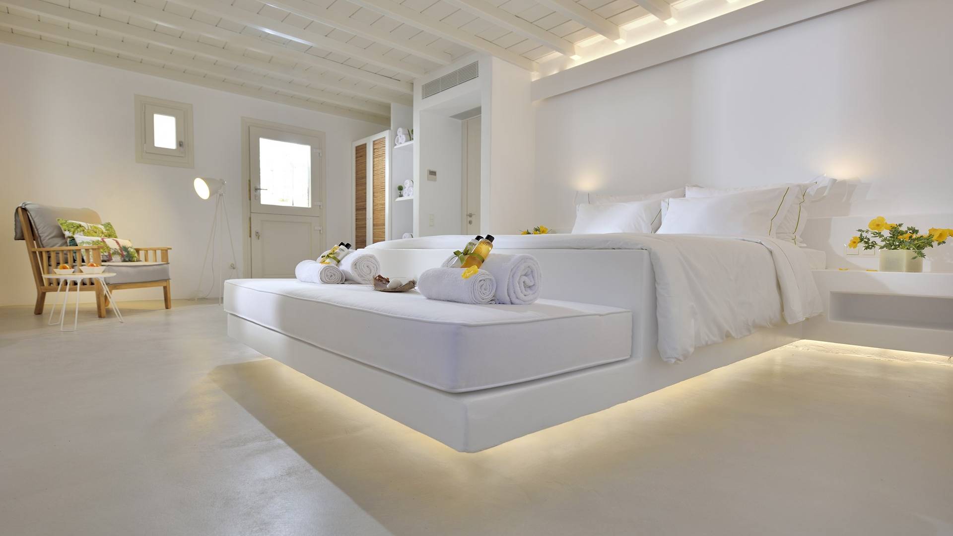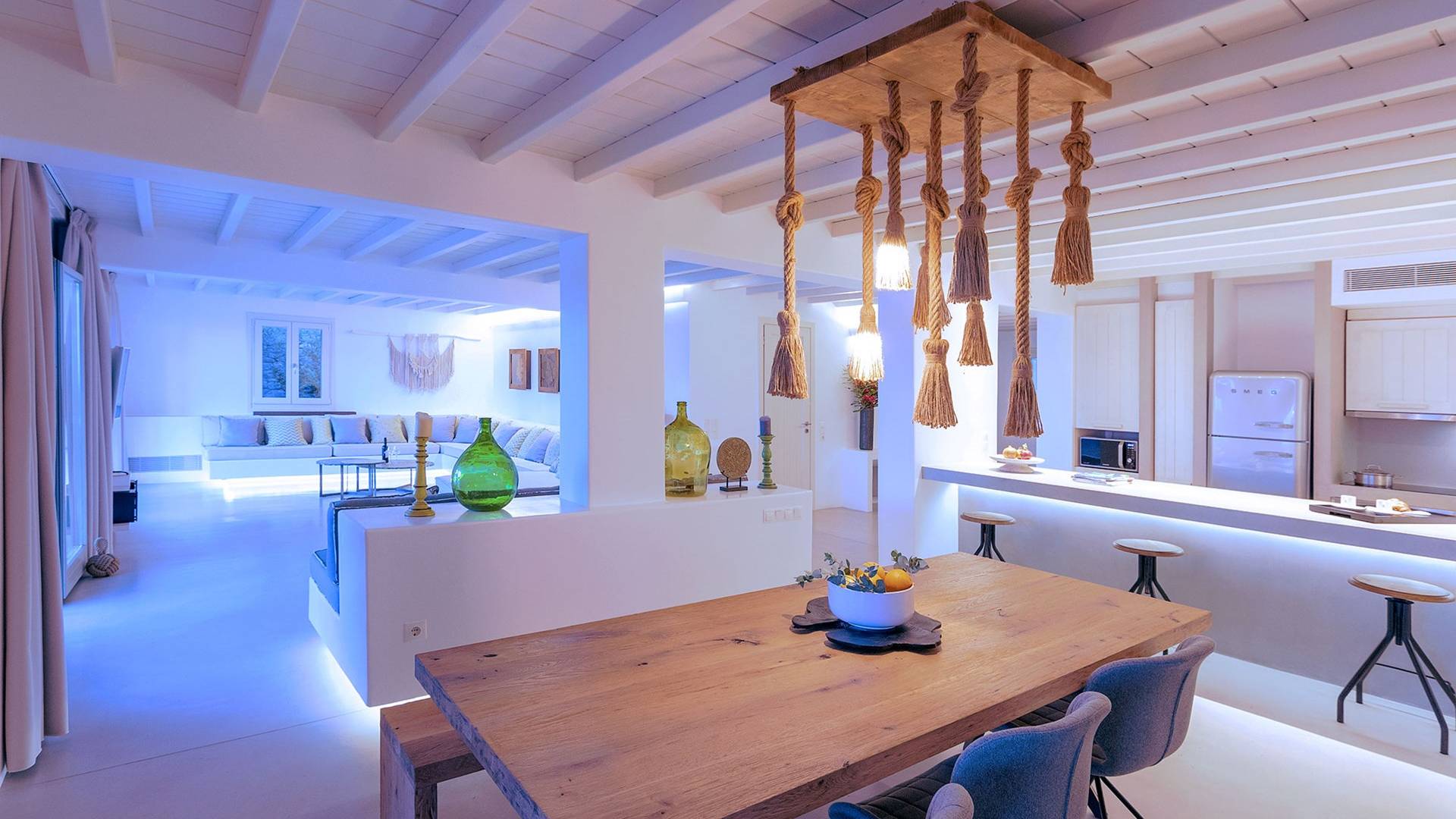 Villa Moonstone Mykonos ha due livelli di alloggio, uno può trovare al piano terra 2 ampie camere da letto con bagno privato, soggiorno e sala da pranzo all'avanguardia, cucina completamente attrezzata, WC. Al livello superiore si trovano 3 ampie camere da letto con bagno privato e terrazza. Può ospitare comodamente fino a 10 ospiti.