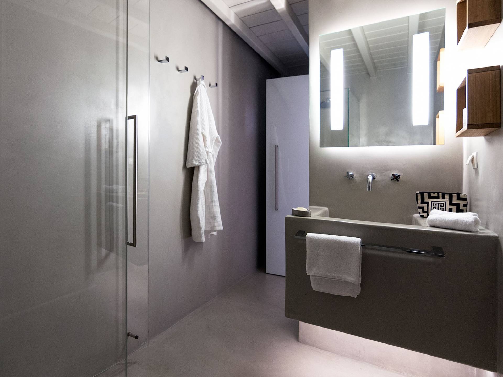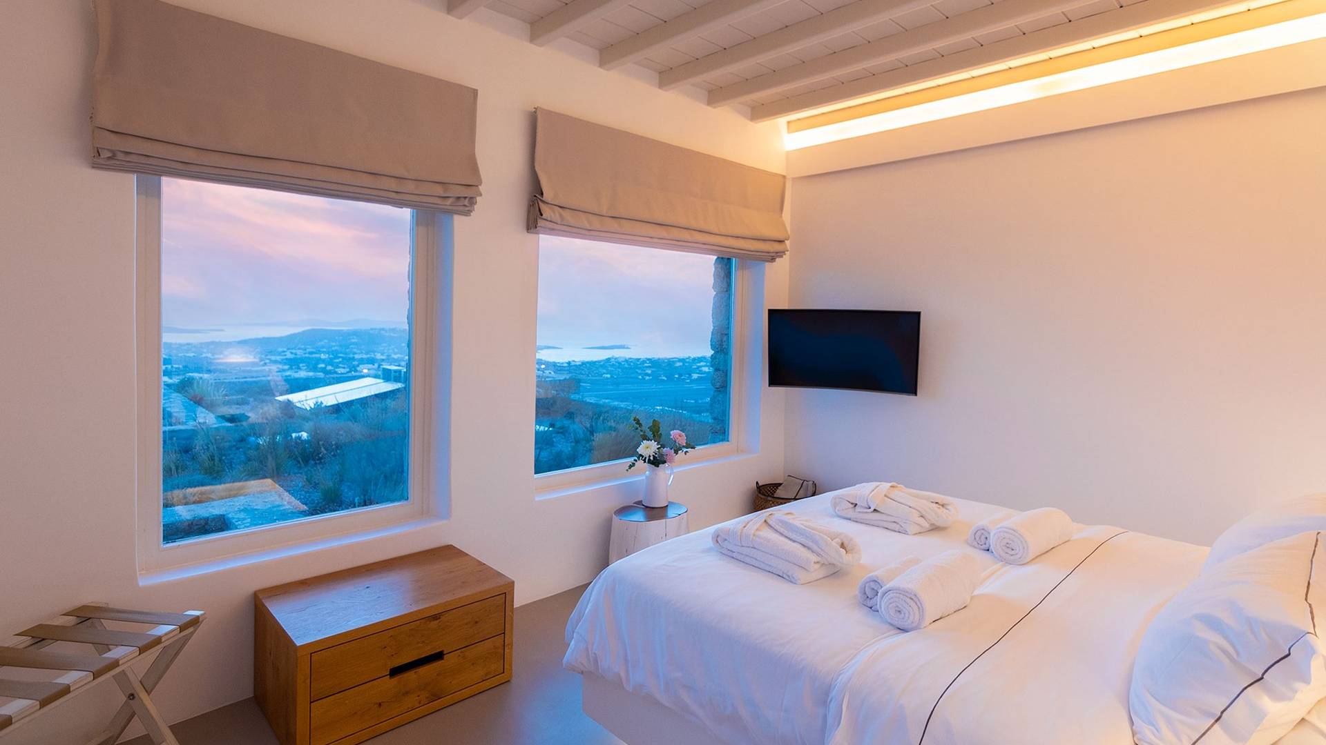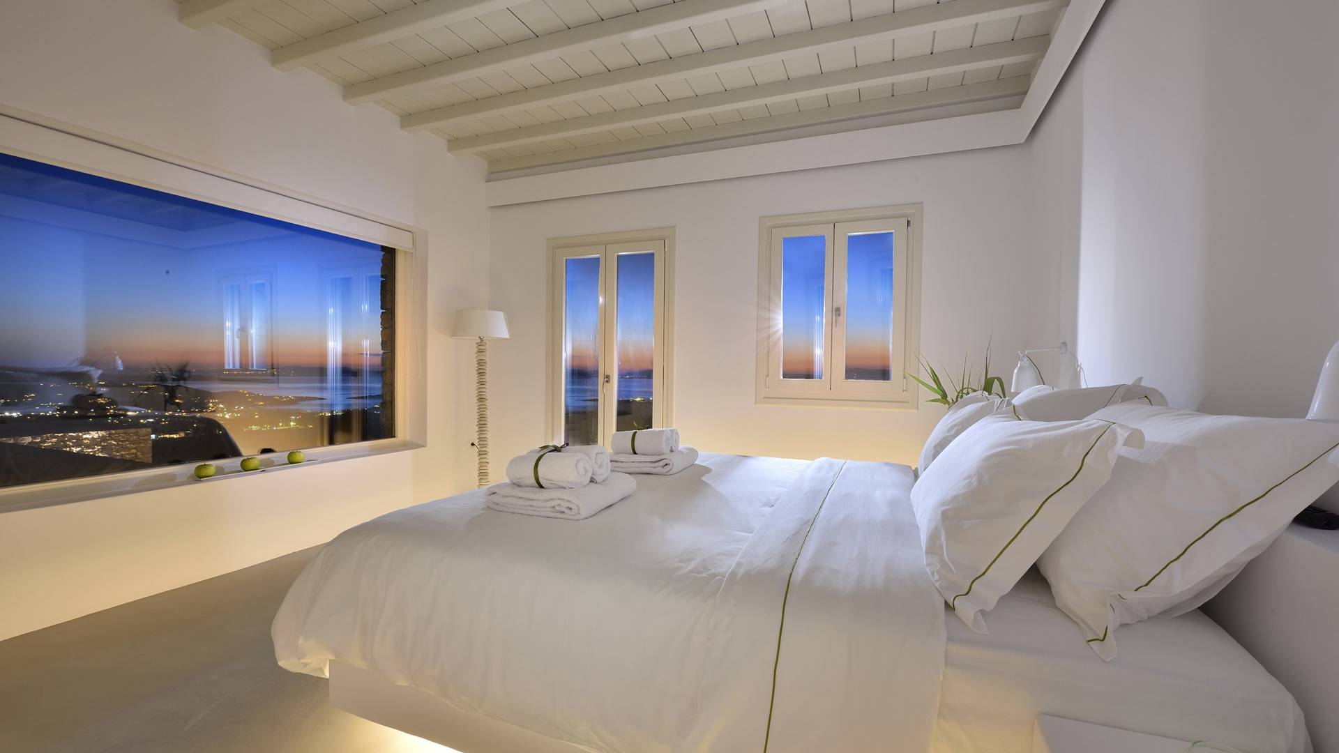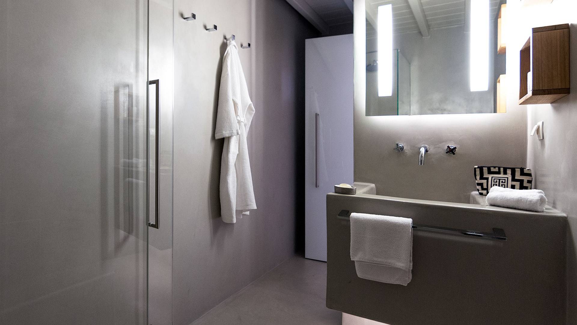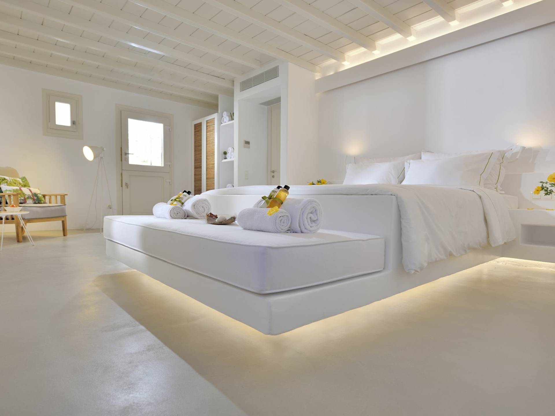 Villa Moonstone Mykonos ha due livelli di alloggio, uno può trovare al piano terra 2 ampie camere da letto con bagno privato, soggiorno e sala da pranzo all'avanguardia, cucina completamente attrezzata, WC. Al livello superiore si trovano 3 ampie camere da letto con bagno privato e terrazza. Può ospitare comodamente fino a 10 ospiti.