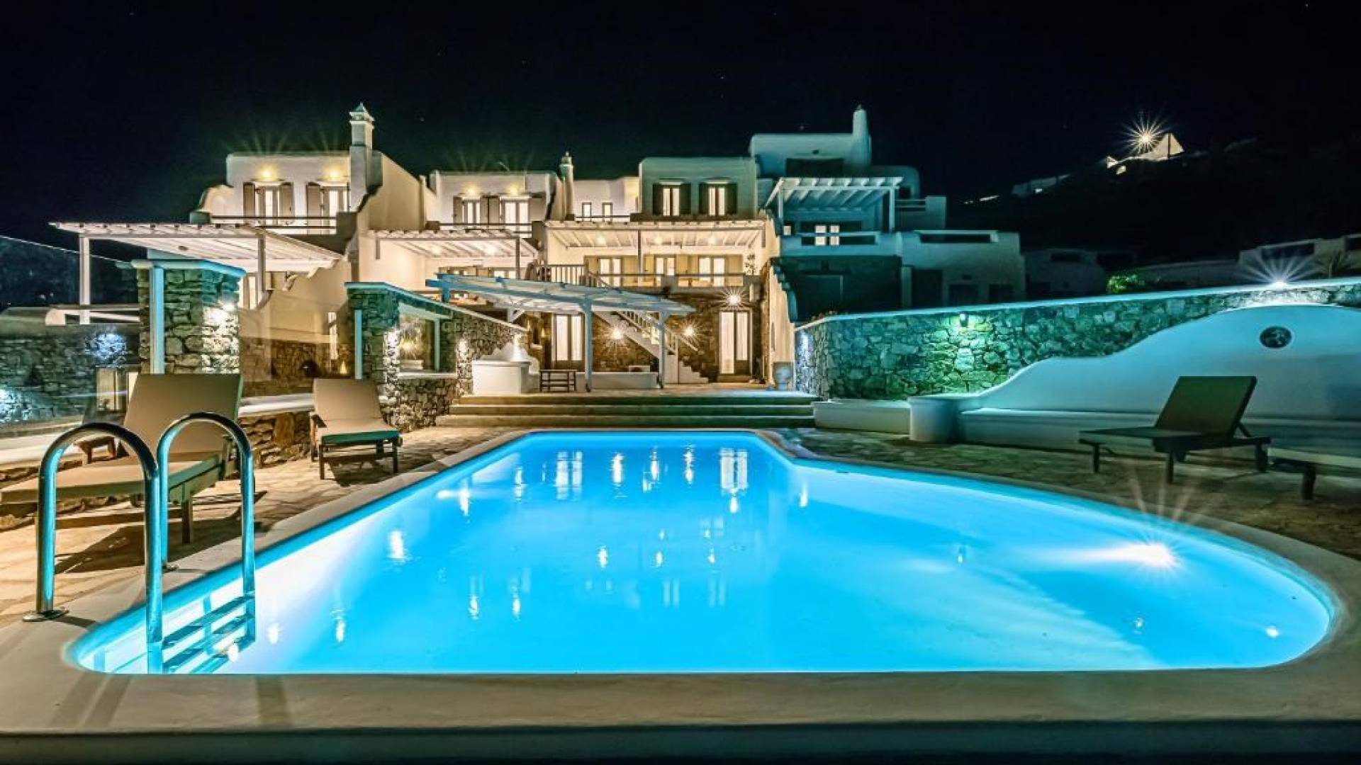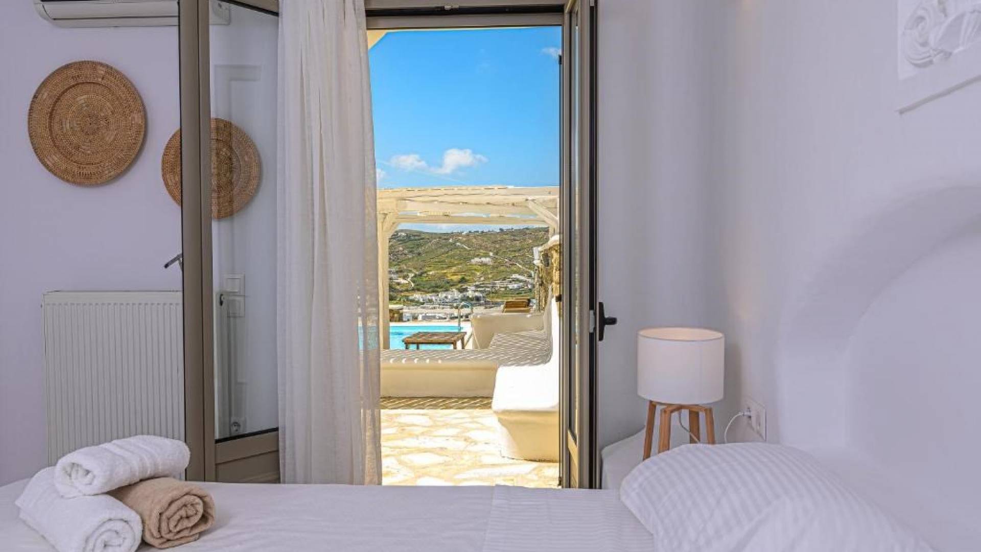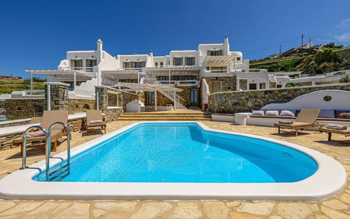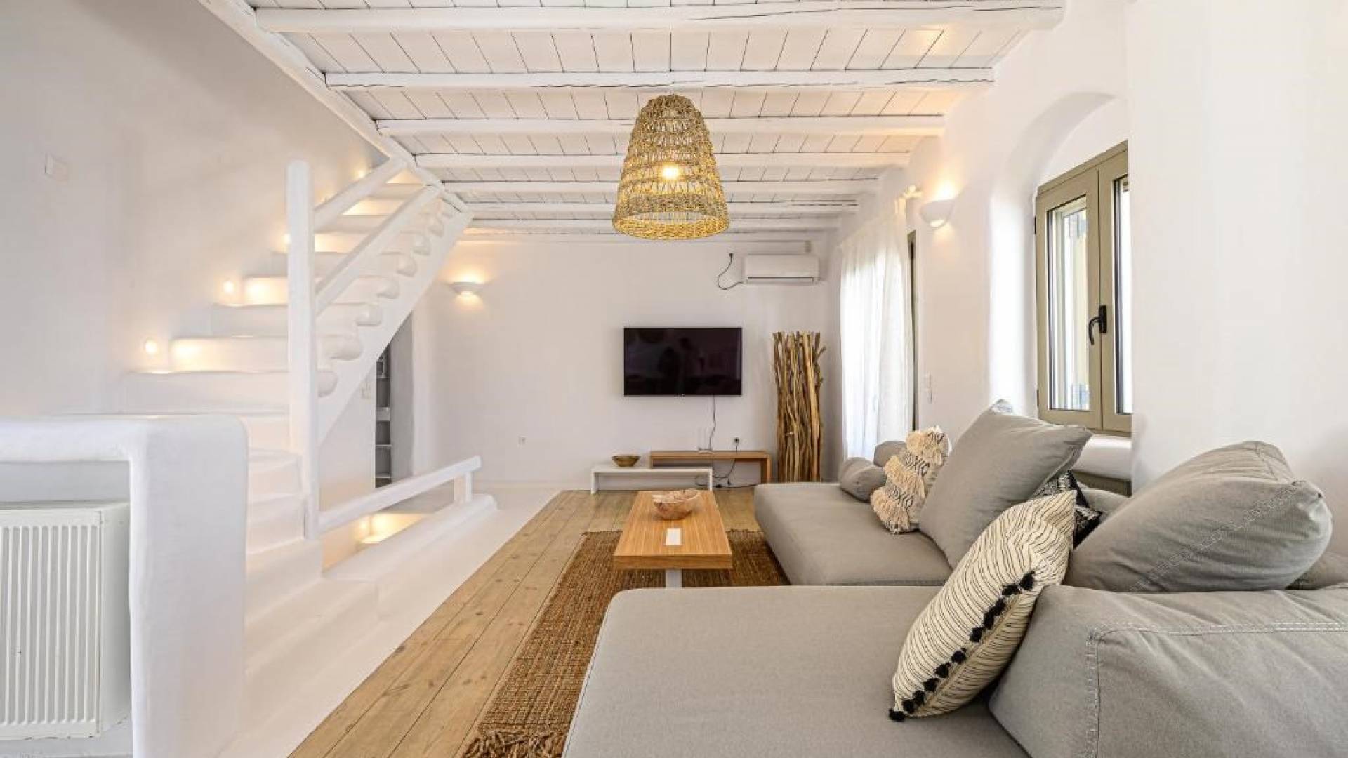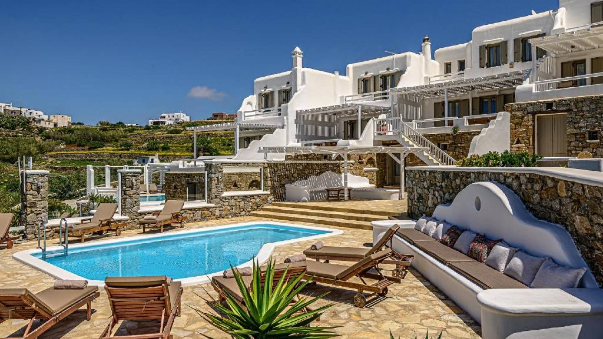Interni tradizionali, tutti in bianco, arroccati su una collina con viste panoramiche mozzafiato sul Mar Egeo che vantano un'ampia zona giorno a pianta aperta interna ed esterna e offrono privacy e isolamento in un luogo molto idilliaco. Il livello Medio è composto da un luminoso ed elegante soggiorno e una graziosa e spaziosa sala da pranzo, entrambi con accesso diretto alla zona piscina, una cucina completamente attrezzata, un WC per gli ospiti e un'ampia veranda con un grande tavolo da pranzo che offre una splendida vista il mare. Il livello superiore è composto da una camera matrimoniale queen size con bagno privato completamente attrezzato. Il piano terra è costituito dal resto delle camere da letto, tutte con i loro bagni privati e completamente attrezzati. Ogni villa dispone di un sistema audio, un'elegante piscina a sfioro e più aree salotto per godersi il bellissimo sole greco