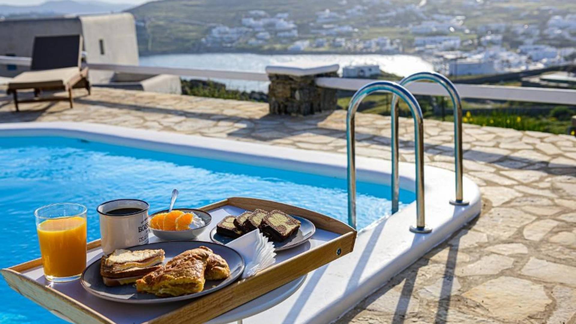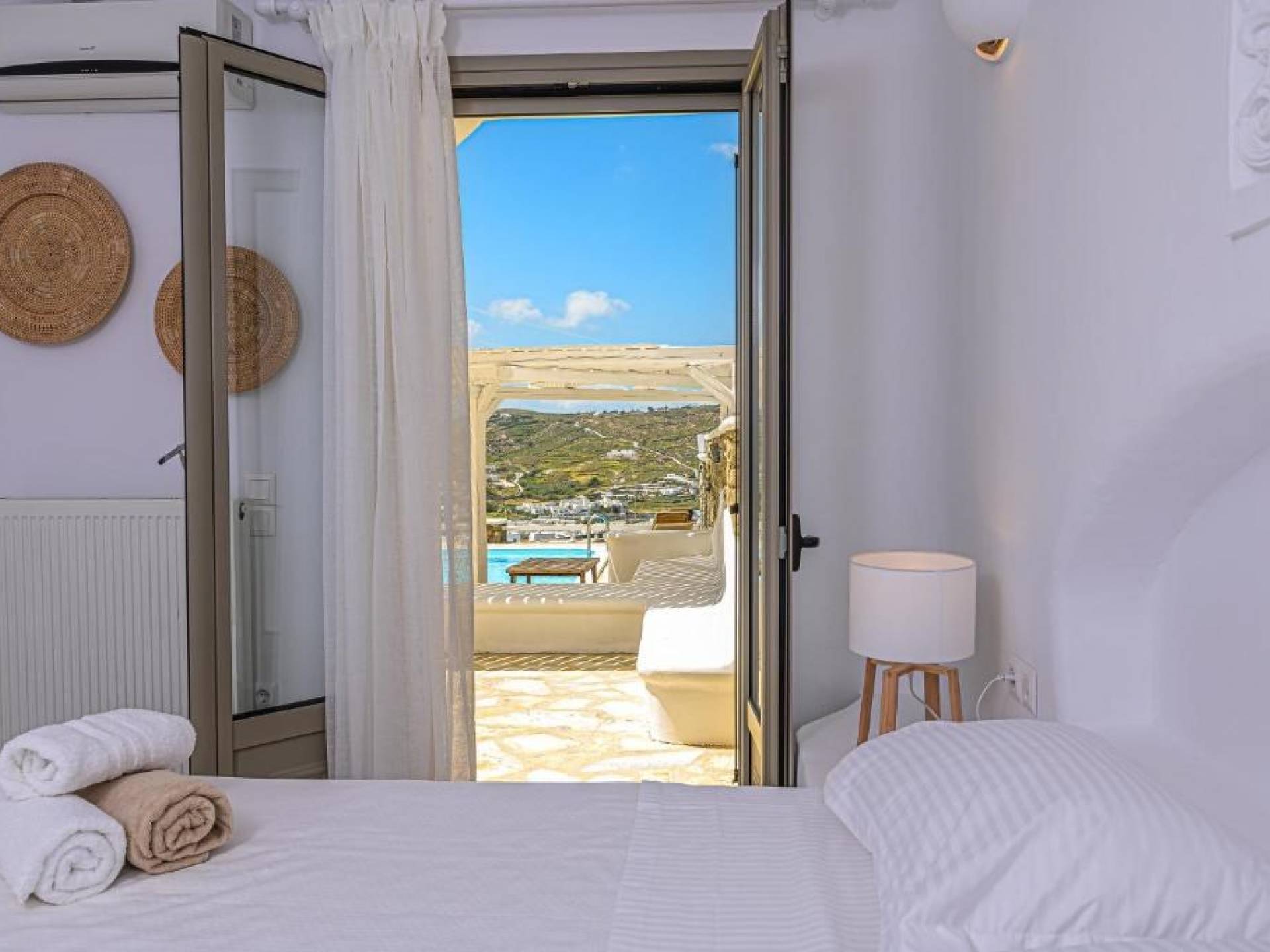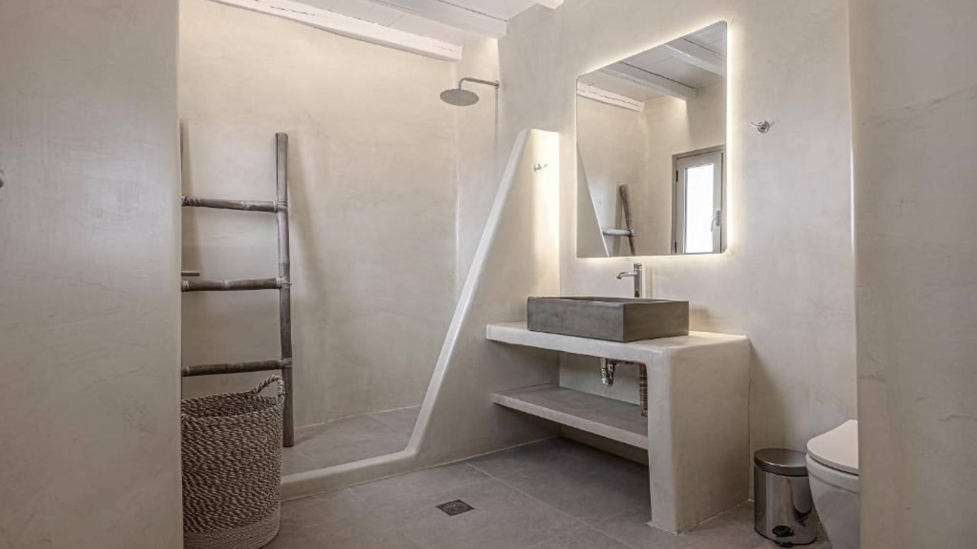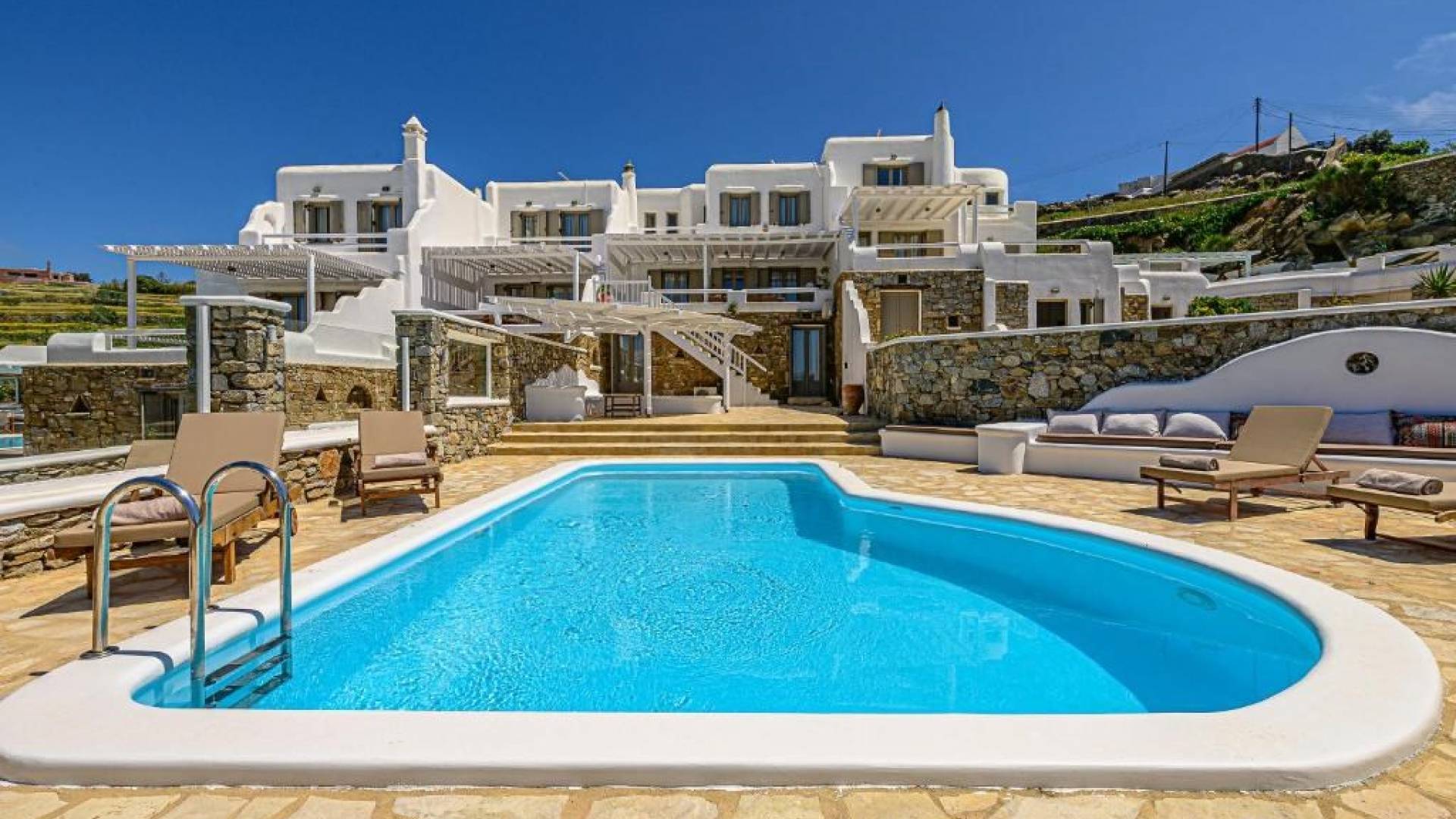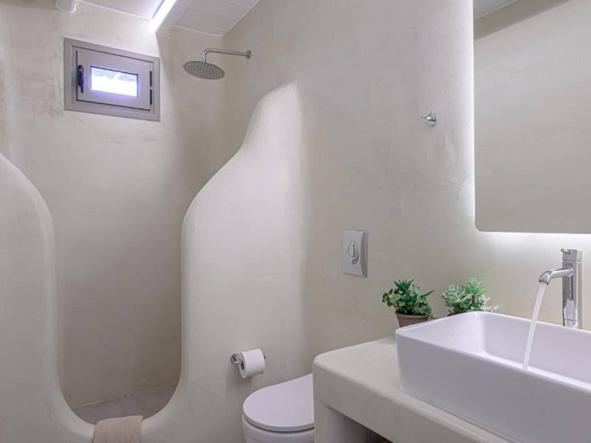 Interni tradizionali, tutti in bianco, arroccati su una collina con viste panoramiche mozzafiato sul Mar Egeo che vantano un'ampia zona giorno a pianta aperta interna ed esterna e offrono privacy e isolamento in un luogo molto idilliaco. Il livello Medio è composto da un luminoso ed elegante soggiorno e una graziosa e spaziosa sala da pranzo, entrambi con accesso diretto alla zona piscina, una cucina completamente attrezzata, un WC per gli ospiti e un'ampia veranda con un grande tavolo da pranzo che offre una splendida vista il mare. Il livello superiore è composto da una camera matrimoniale queen size con bagno privato completamente attrezzato. Il piano terra è costituito dal resto delle camere da letto, tutte con i loro bagni privati e completamente attrezzati. Ogni villa dispone di un sistema audio, un'elegante piscina a sfioro e più aree salotto per godersi il bellissimo sole greco