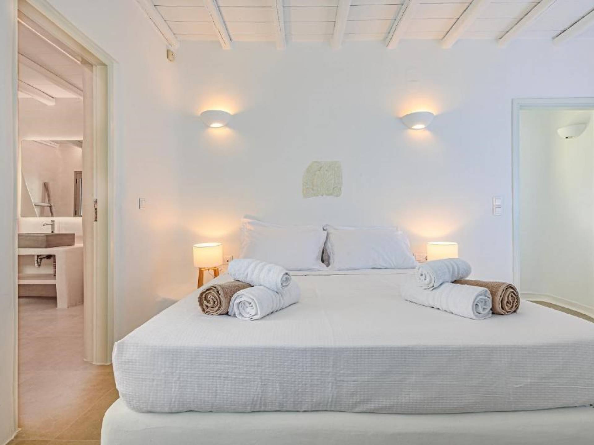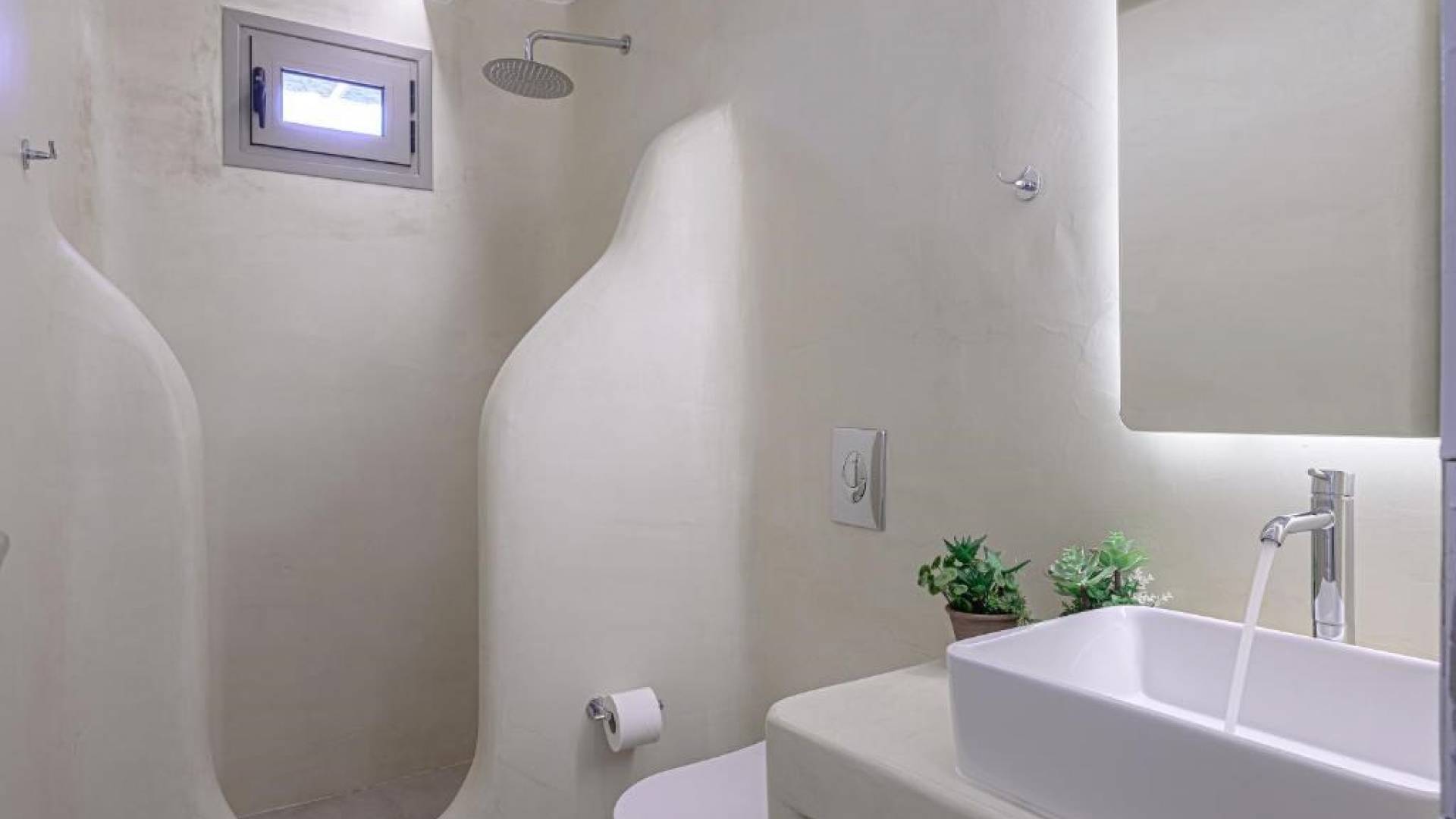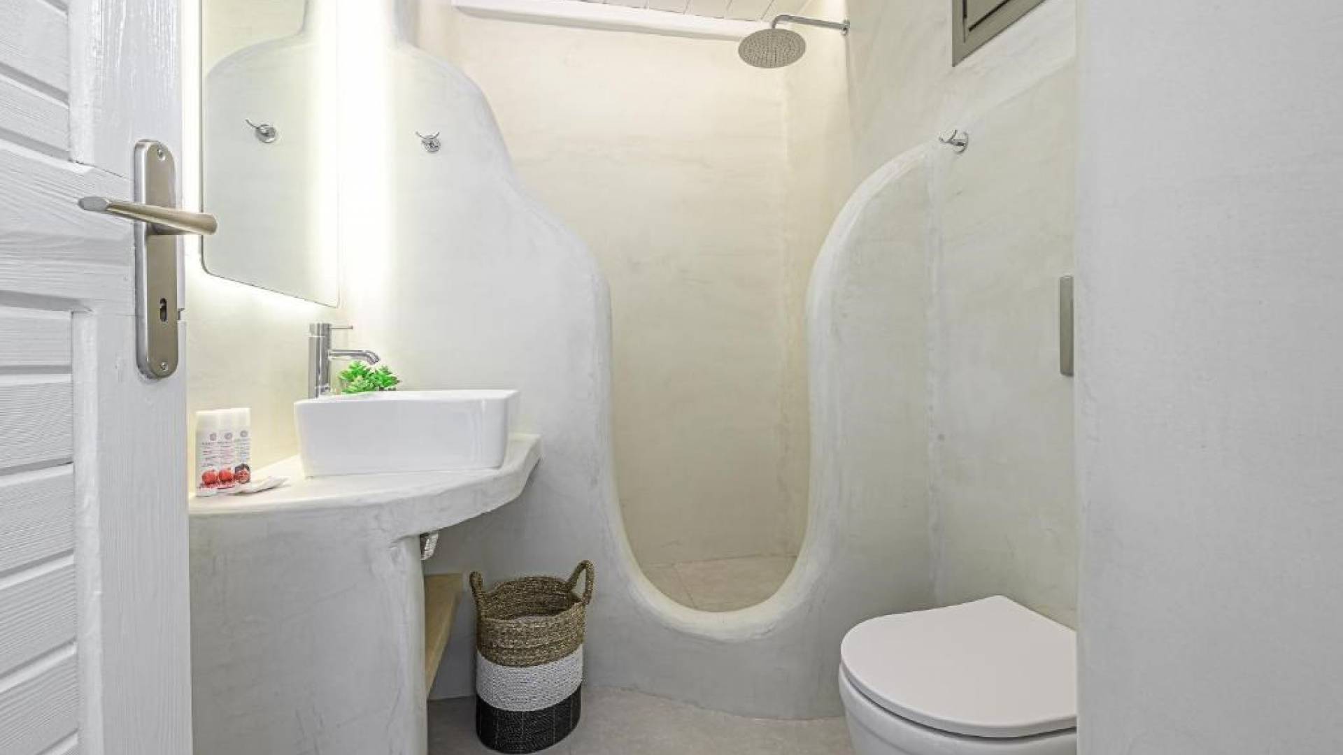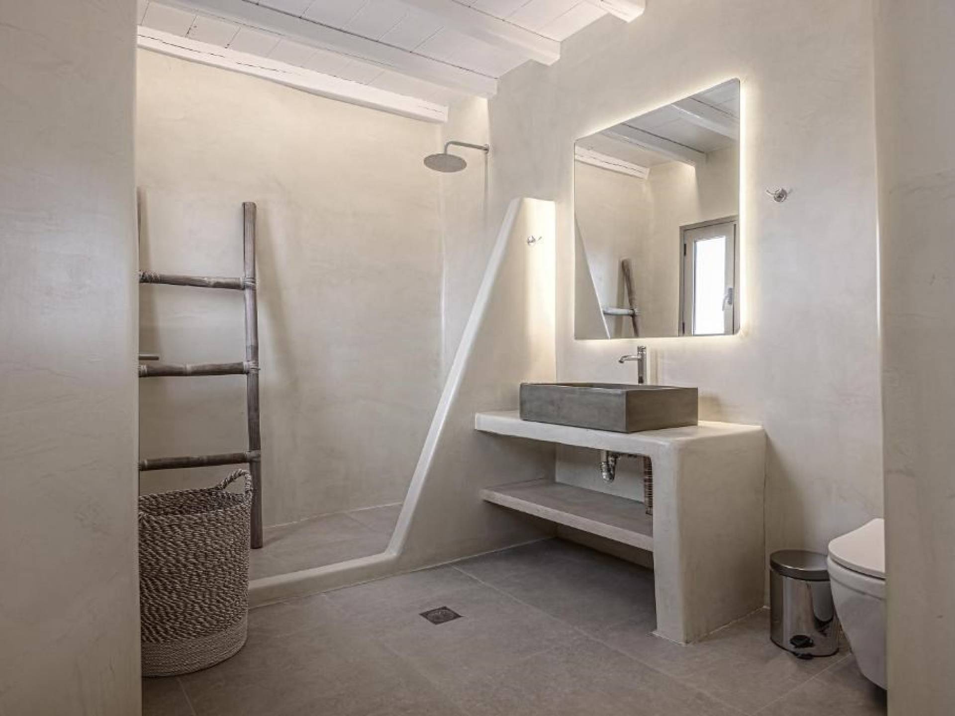 Interni tradizionali, tutti in bianco, arroccati su una collina con viste panoramiche mozzafiato sul Mar Egeo che vantano un'ampia zona giorno a pianta aperta interna ed esterna e offrono privacy e isolamento in un luogo molto idilliaco. Il livello Medio è composto da un luminoso ed elegante soggiorno e una graziosa e spaziosa sala da pranzo, entrambi con accesso diretto alla zona piscina, una cucina completamente attrezzata, un WC per gli ospiti e un'ampia veranda con un grande tavolo da pranzo che offre una splendida vista il mare. Il livello superiore è composto da una camera matrimoniale queen size con bagno privato completamente attrezzato. Il piano terra è costituito dal resto delle camere da letto, tutte con i loro bagni privati e completamente attrezzati. Ogni villa dispone di un sistema audio, un'elegante piscina a sfioro e più aree salotto per godersi il bellissimo sole greco