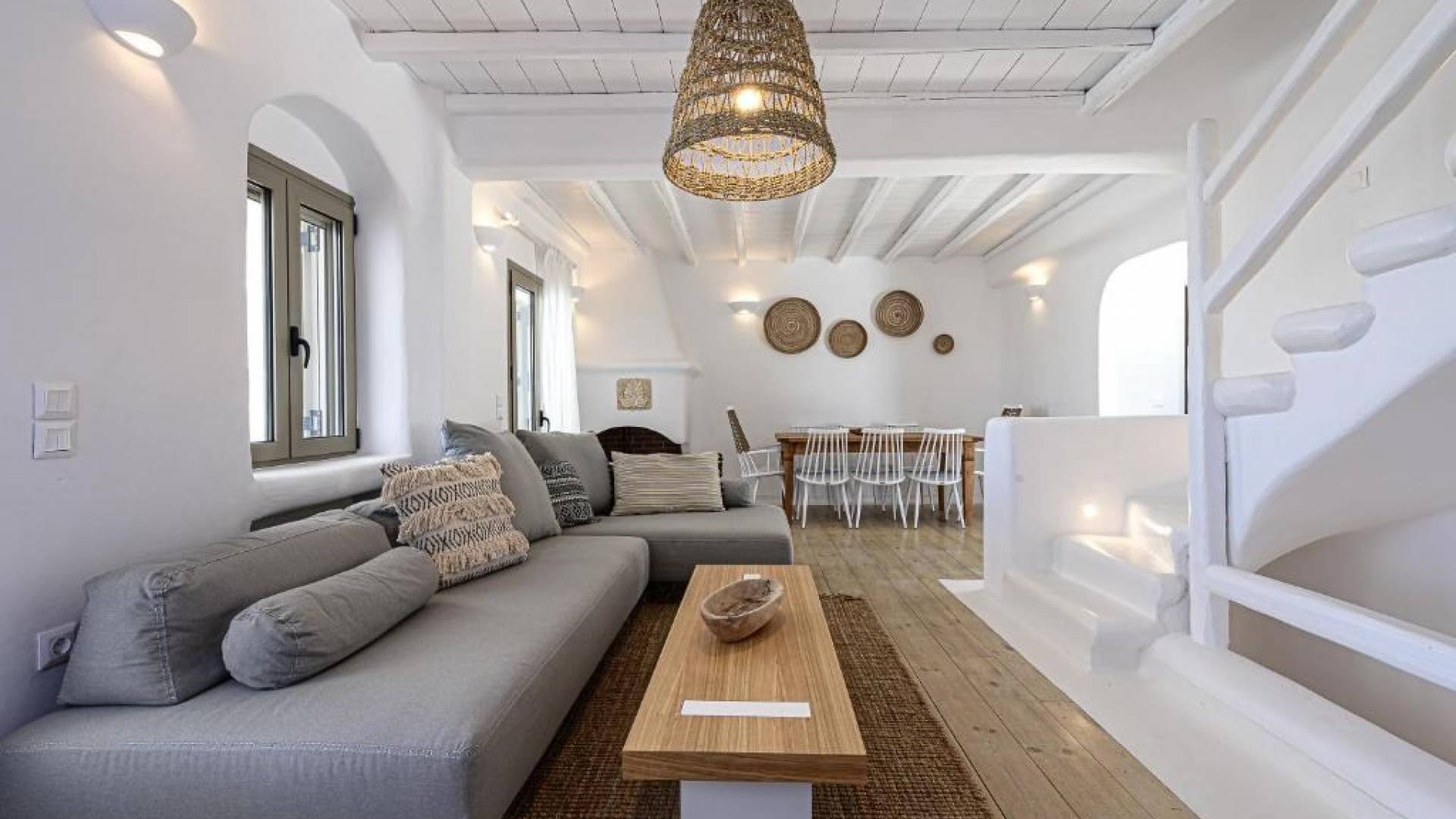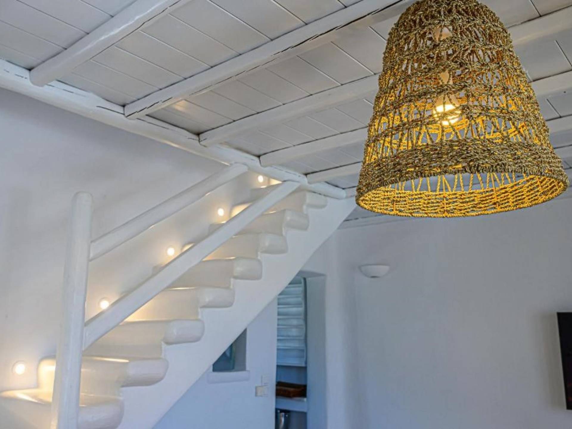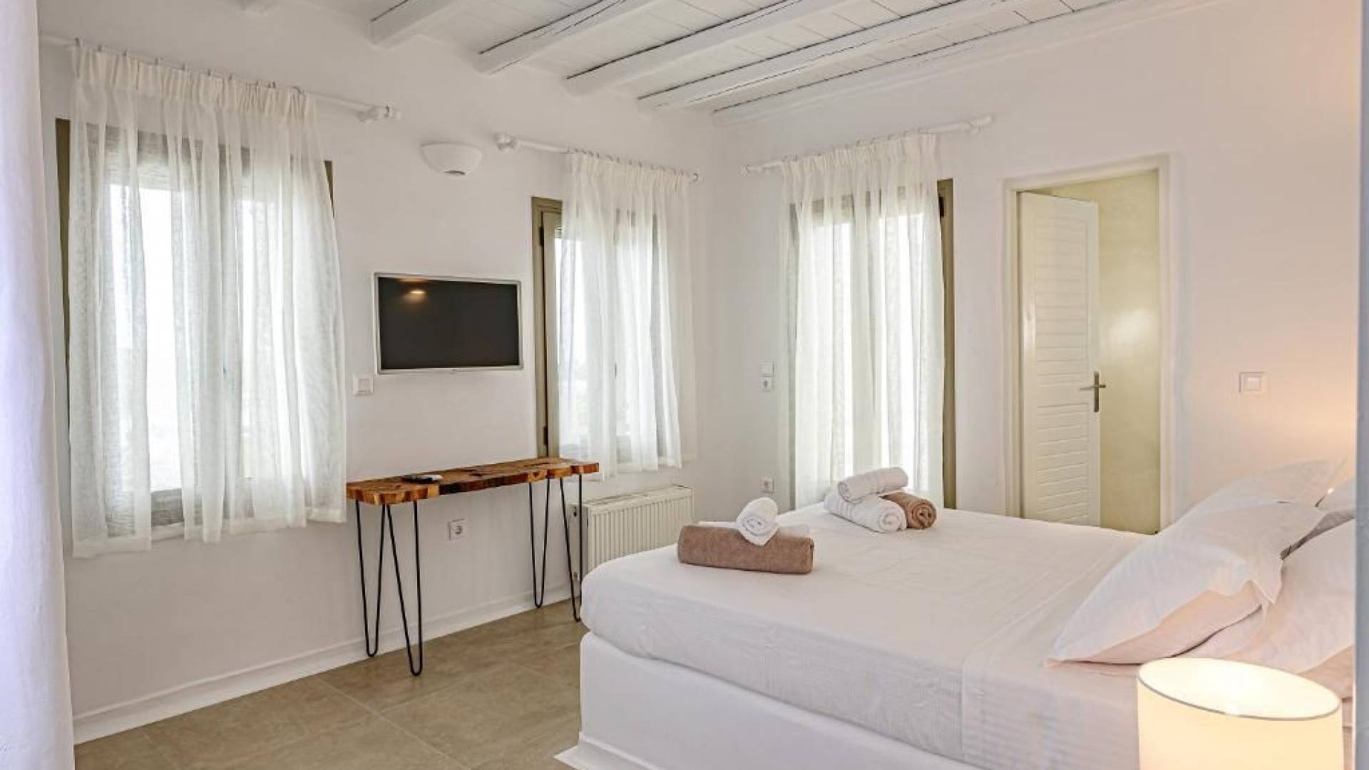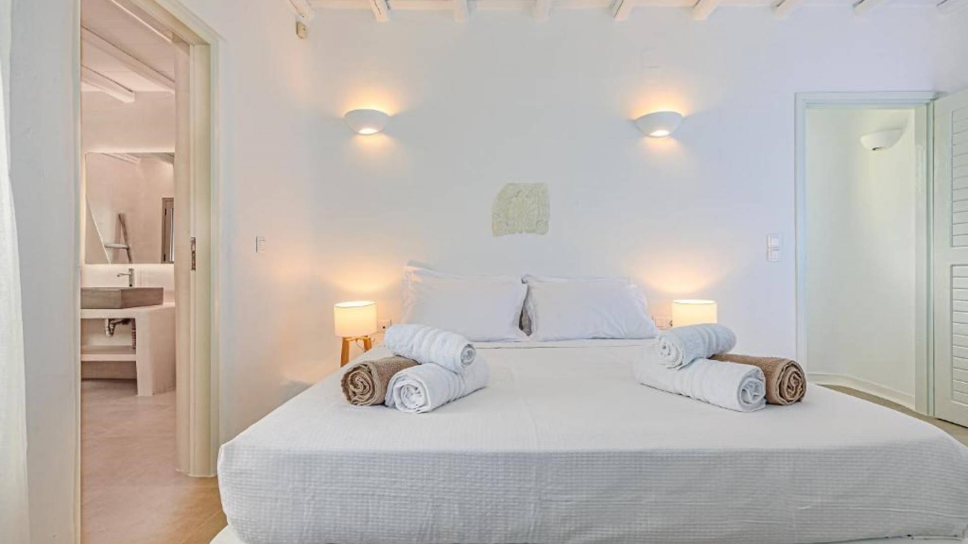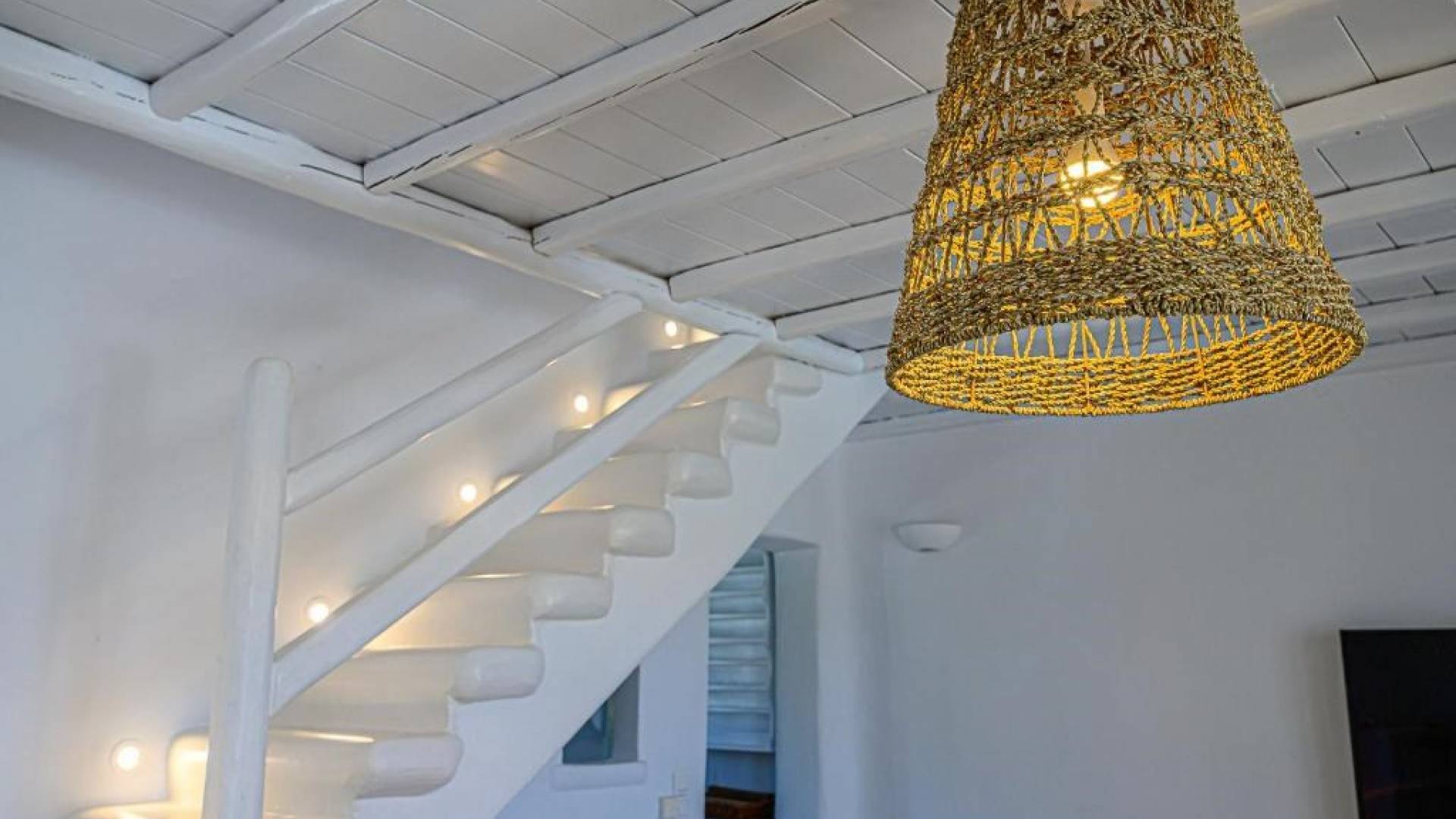 Sullo stesso livello, c'è una cucina tradizionale ma completamente attrezzata. Una grande scala interna conduce al piano superiore alla camera matrimoniale con il grande bagno in pietra. La camera da letto principale ha il proprio balcone privato con una panca in pietra, in cui l'ospite può godersi momenti privati di relax con una vista illimitata su Ornos e Korfos. Al piano inferiore ci sono tre ampie camere da letto e un piccolo locale di servizio. Ogni camera ha il proprio bagno, impianto di riscaldamento e condizionamento. La villa è inoltre dotata di TV satellitare, connessione internet Wi-Fi, sistema di allarme e illuminazione di sicurezza.