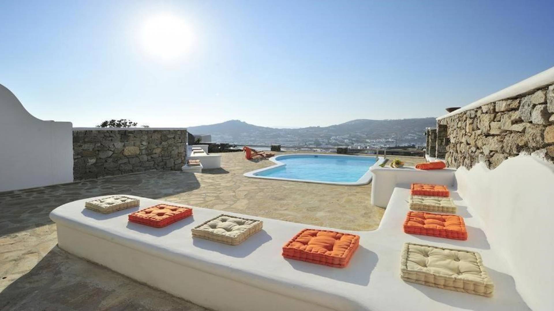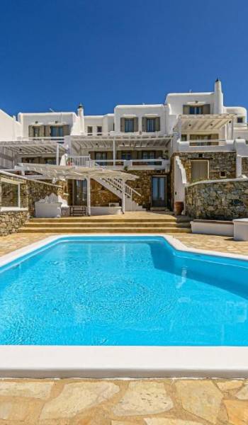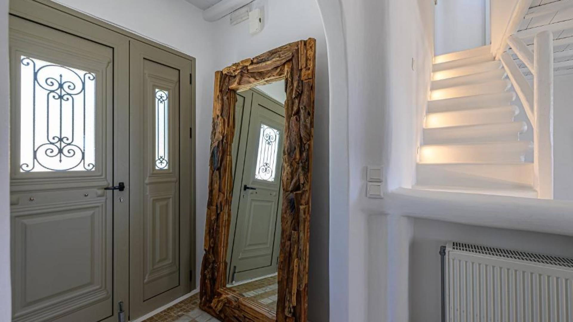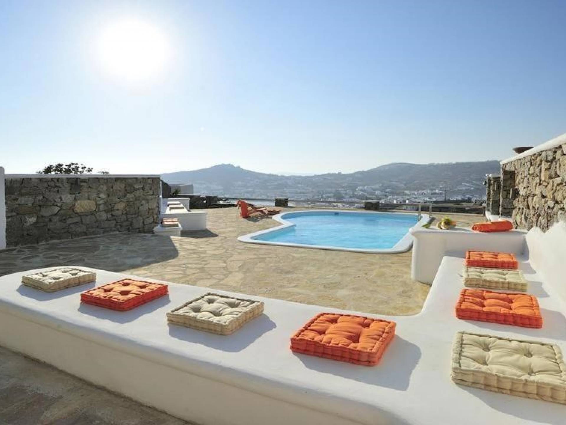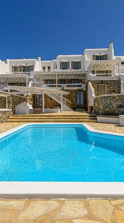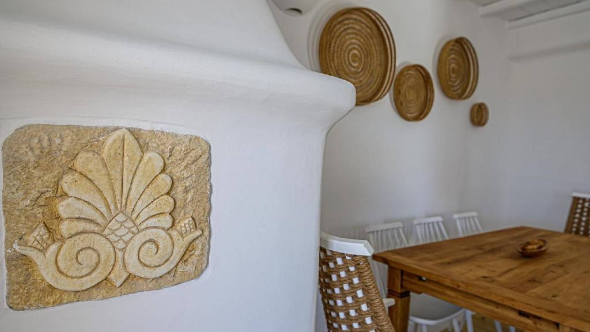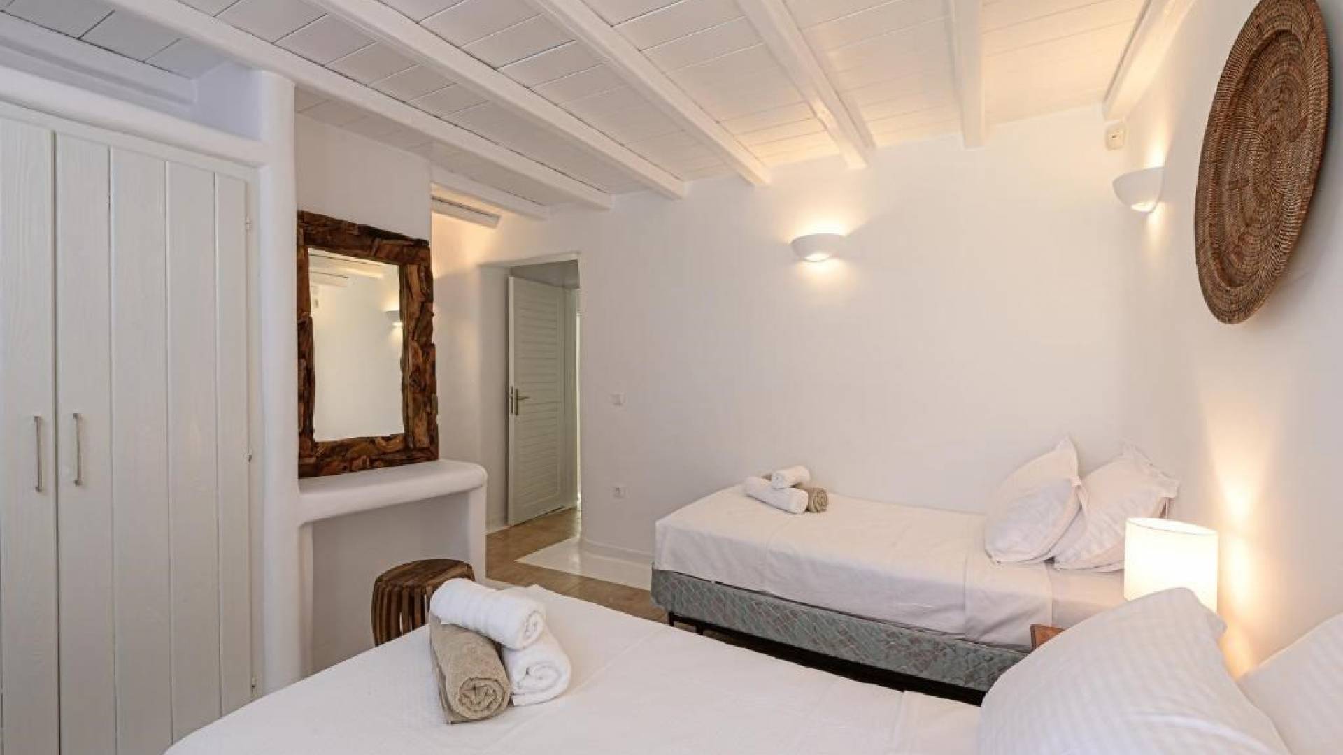 Sullo stesso livello, c'è una cucina tradizionale ma completamente attrezzata. Una grande scala interna conduce al piano superiore alla camera matrimoniale con il grande bagno in pietra. La camera da letto principale ha il proprio balcone privato con una panca in pietra, in cui l'ospite può godersi momenti privati di relax con una vista illimitata su Ornos e Korfos. Al piano inferiore ci sono tre ampie camere da letto e un piccolo locale di servizio. Ogni camera ha il proprio bagno, impianto di riscaldamento e condizionamento. La villa è inoltre dotata di TV satellitare, connessione internet Wi-Fi, sistema di allarme e illuminazione di sicurezza.
