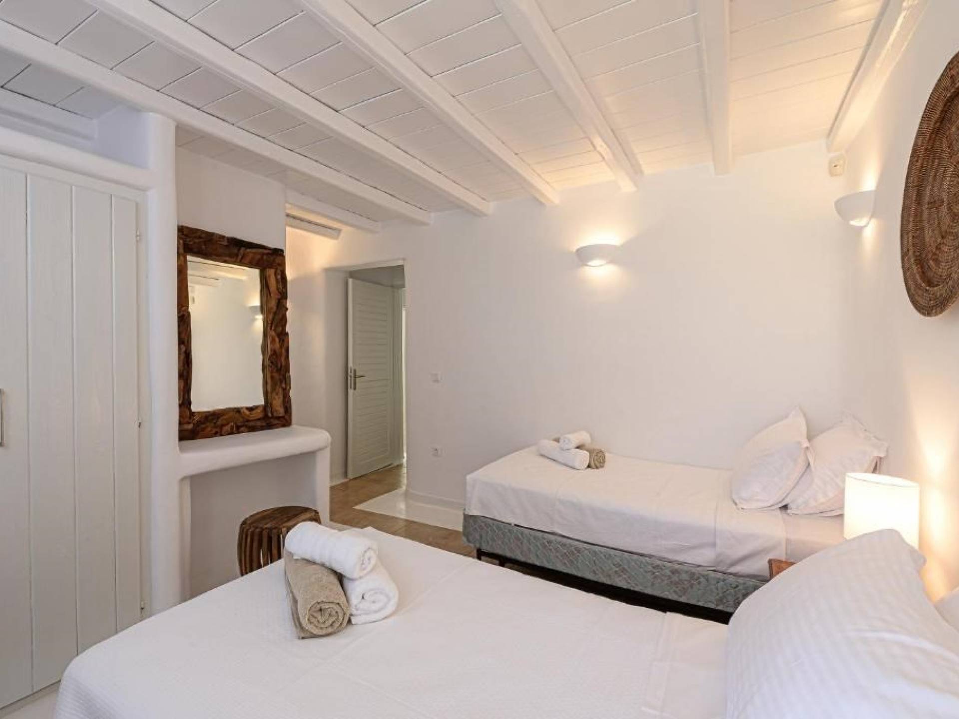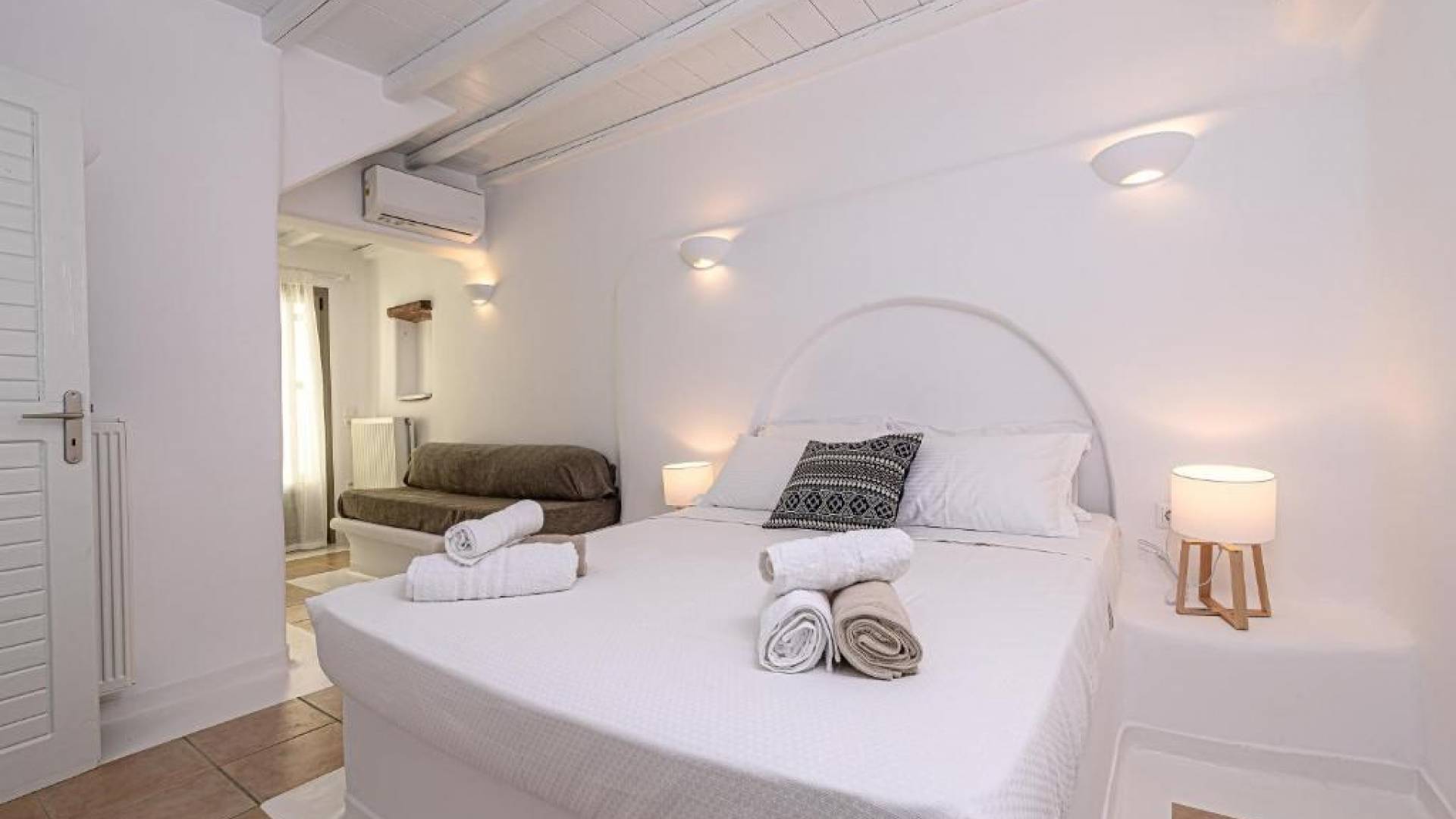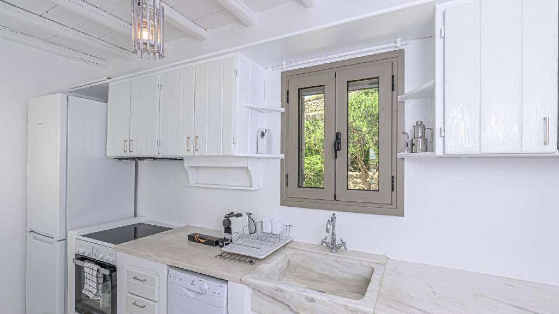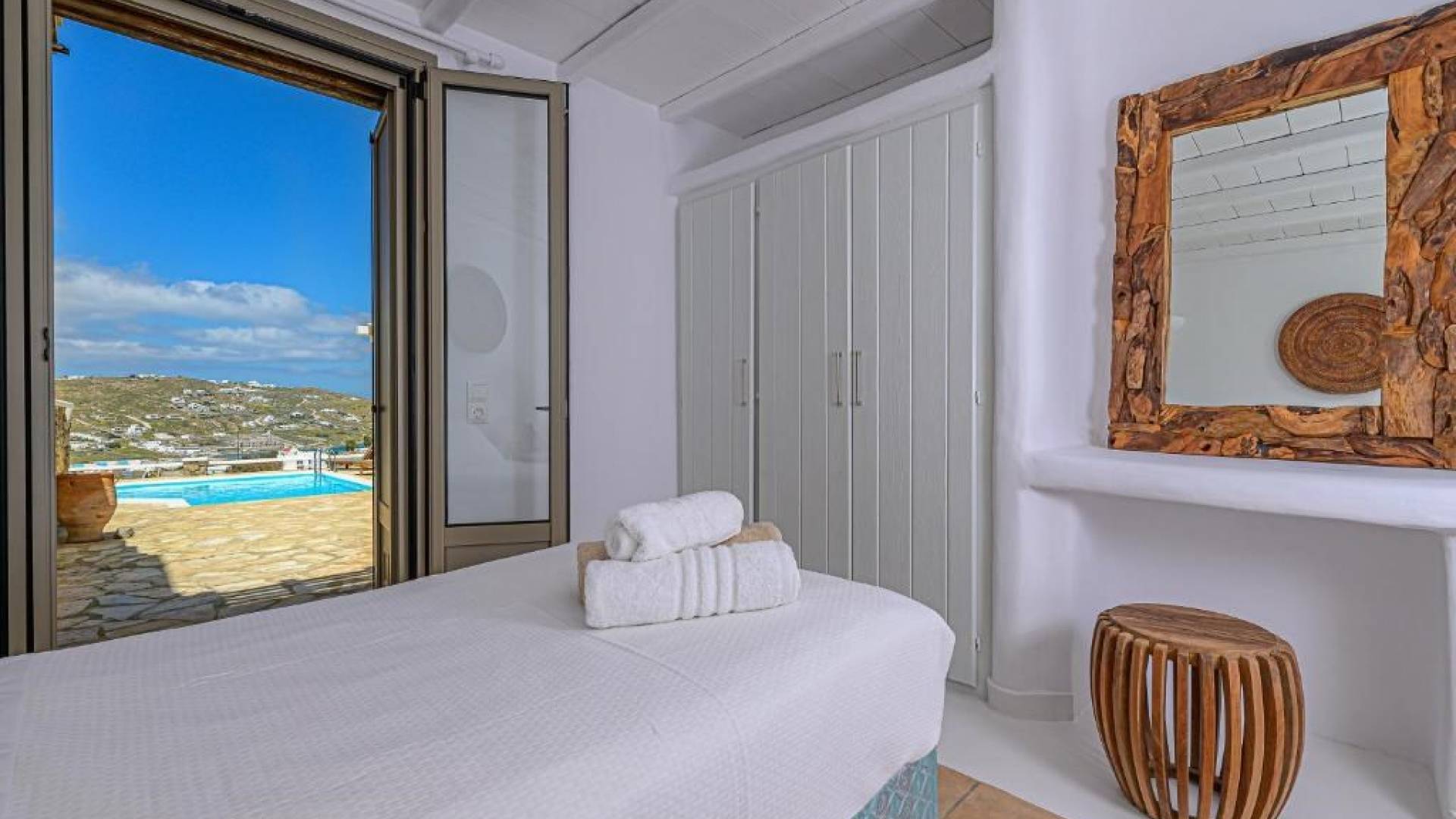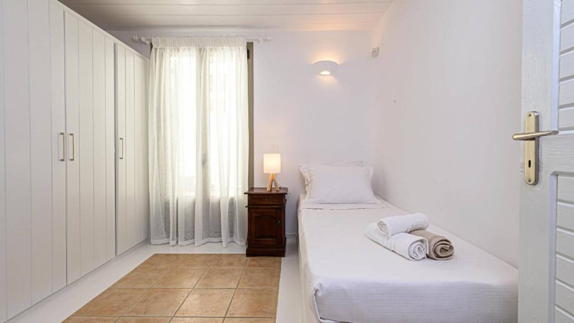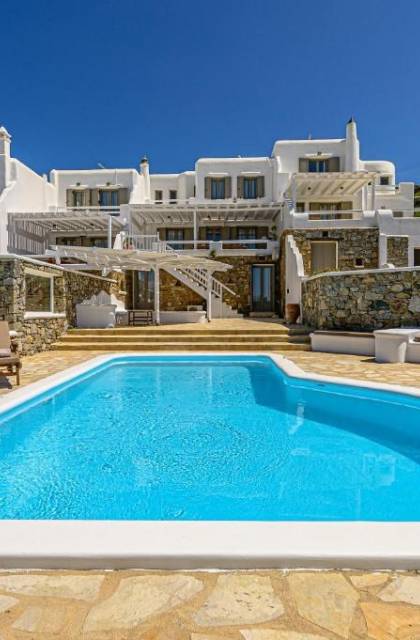 Sullo stesso livello, c'è una cucina tradizionale ma completamente attrezzata. Una grande scala interna conduce al piano superiore alla camera matrimoniale con il grande bagno in pietra. La camera da letto principale ha il proprio balcone privato con una panca in pietra, in cui l'ospite può godersi momenti privati di relax con una vista illimitata su Ornos e Korfos. Al piano inferiore ci sono tre ampie camere da letto e un piccolo locale di servizio. Ogni camera ha il proprio bagno, impianto di riscaldamento e condizionamento. La villa è inoltre dotata di TV satellitare, connessione internet Wi-Fi, sistema di allarme e illuminazione di sicurezza.