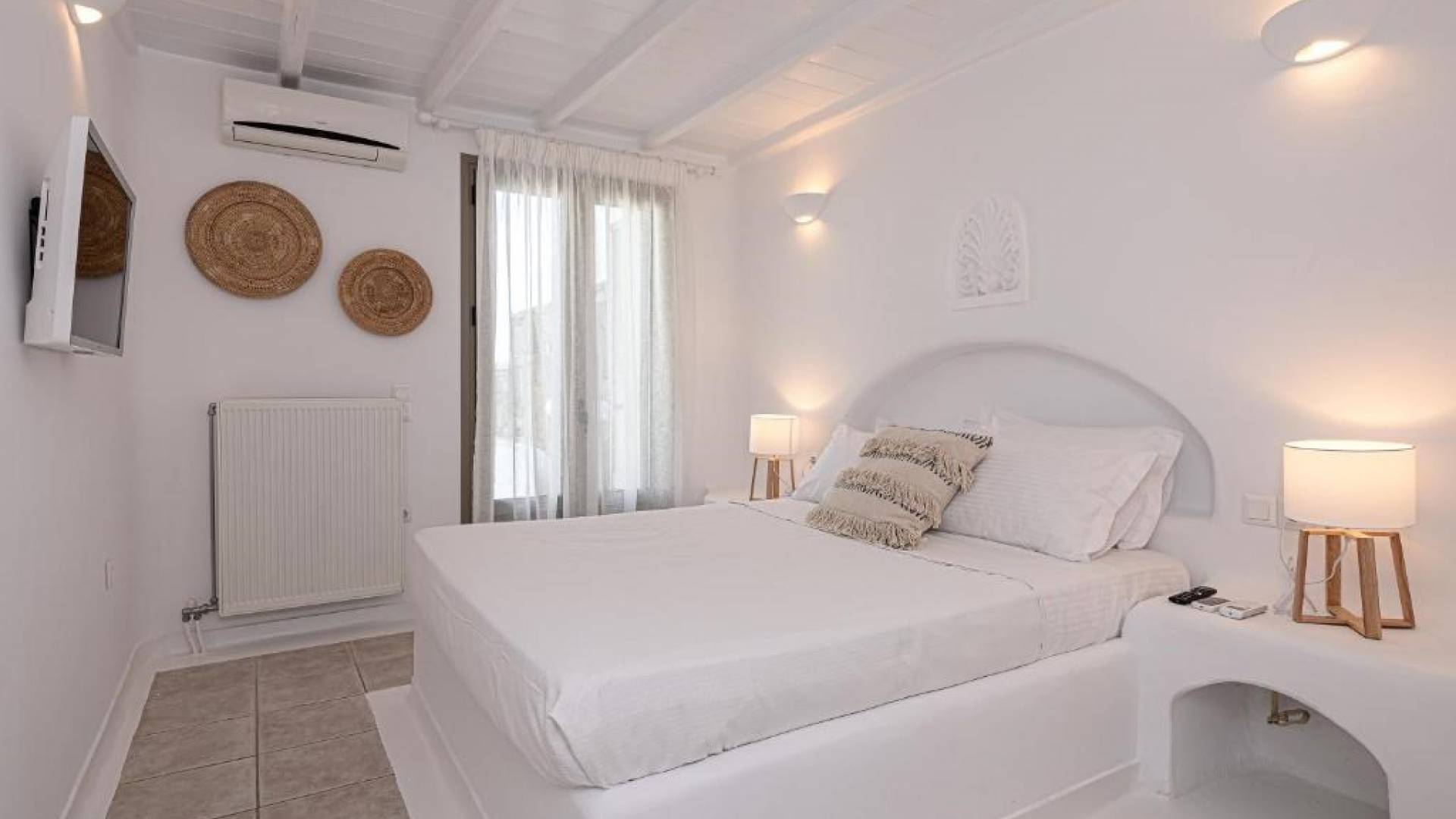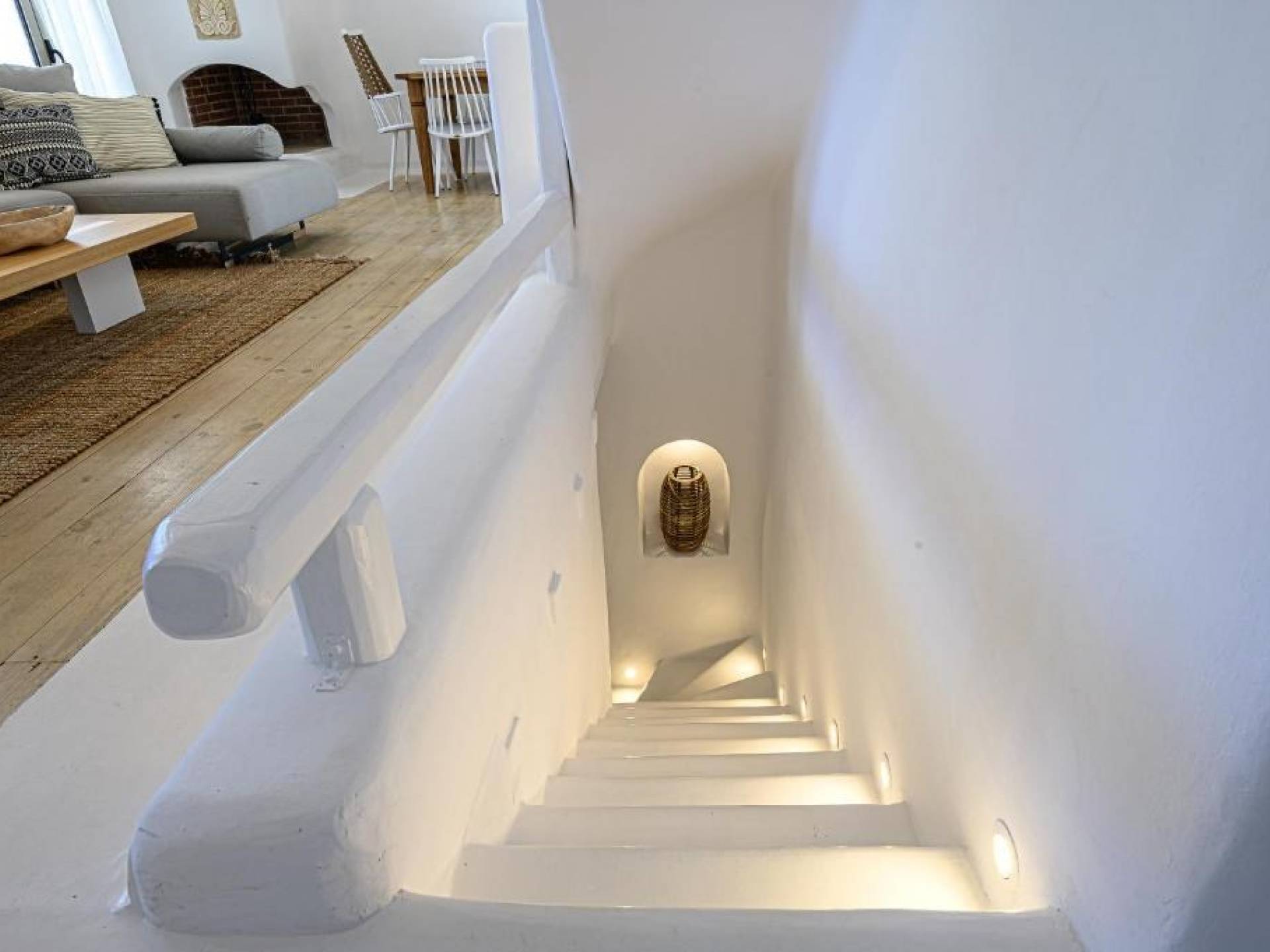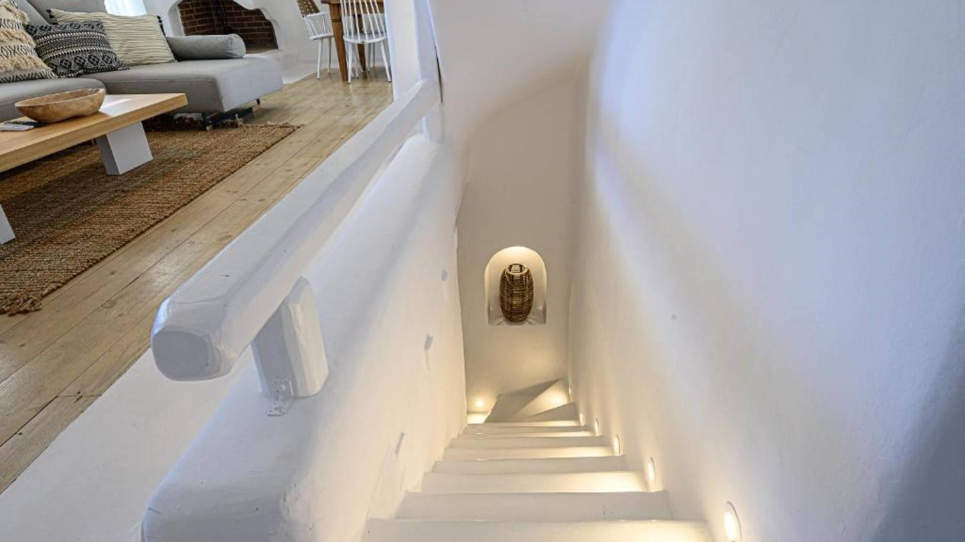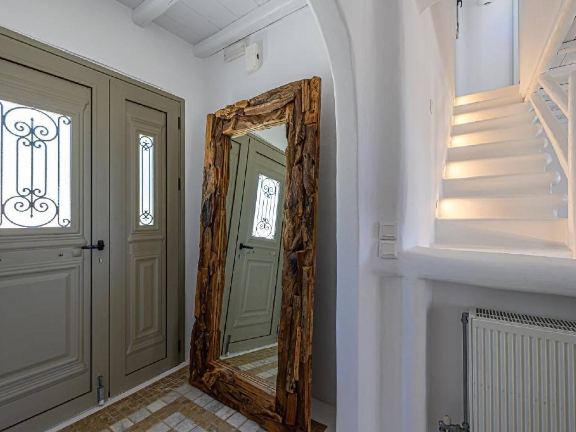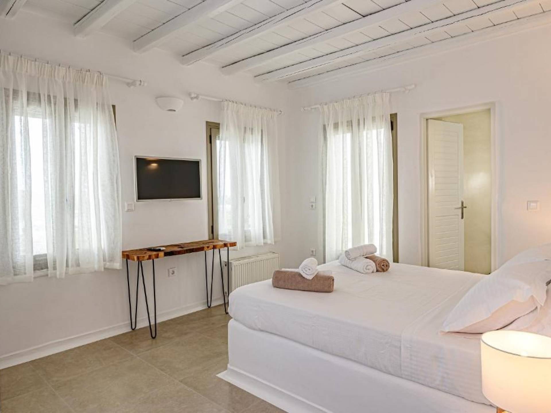 Sullo stesso livello, c'è una cucina tradizionale ma completamente attrezzata. Una grande scala interna conduce al piano superiore alla camera matrimoniale con il grande bagno in pietra. La camera da letto principale ha il proprio balcone privato con una panca in pietra, in cui l'ospite può godersi momenti privati di relax con una vista illimitata su Ornos e Korfos. Al piano inferiore ci sono tre ampie camere da letto e un piccolo locale di servizio. Ogni camera ha il proprio bagno, impianto di riscaldamento e condizionamento. La villa è inoltre dotata di TV satellitare, connessione internet Wi-Fi, sistema di allarme e illuminazione di sicurezza.