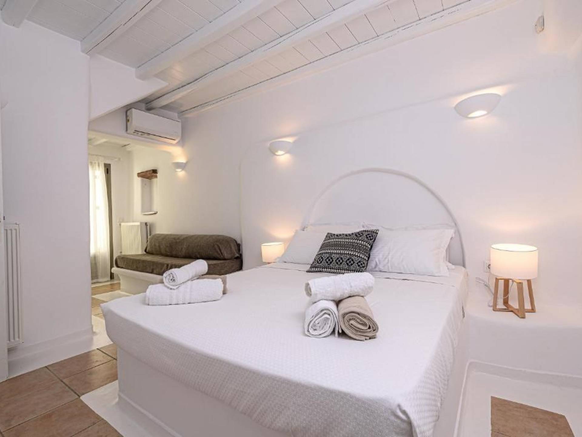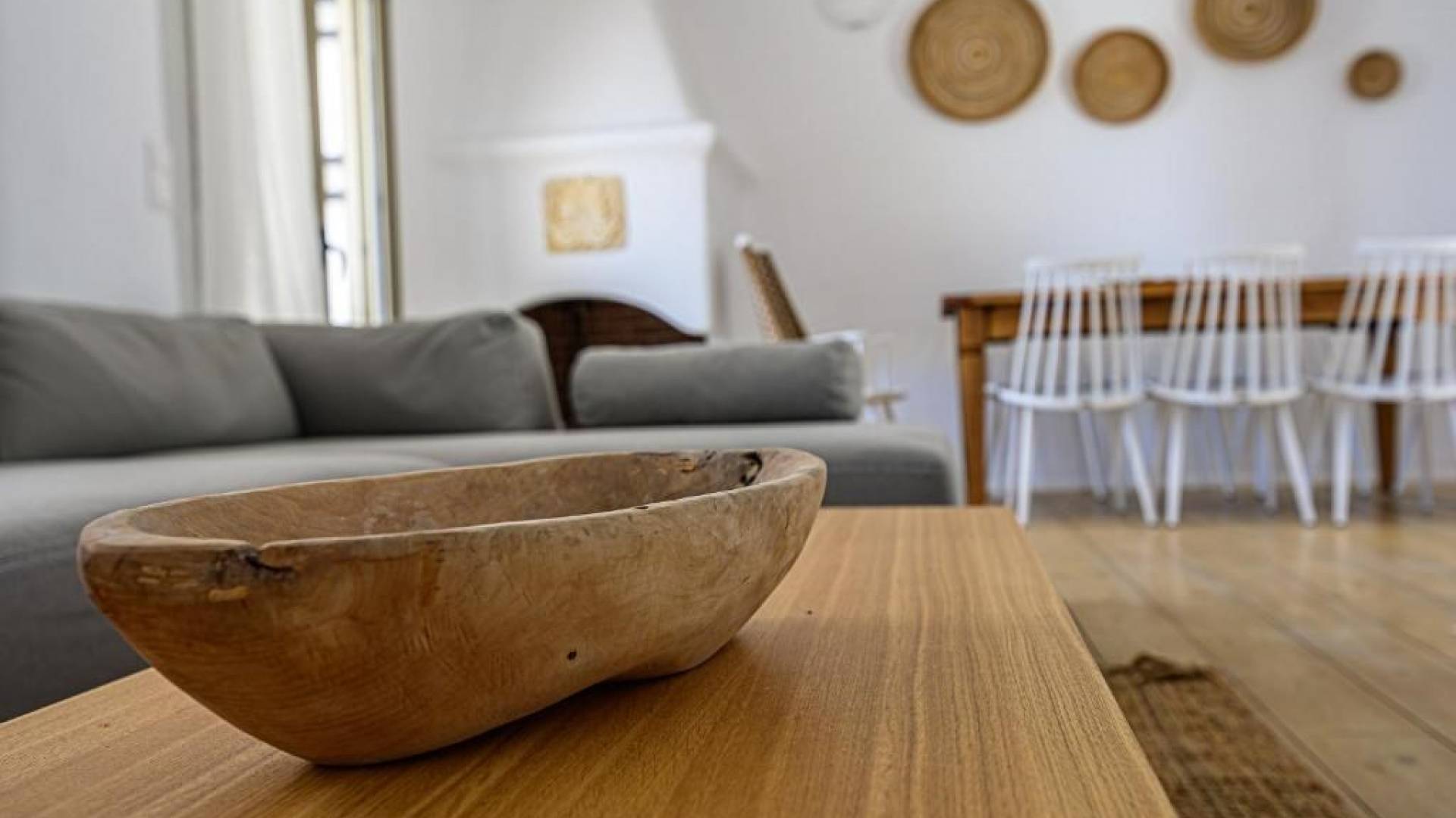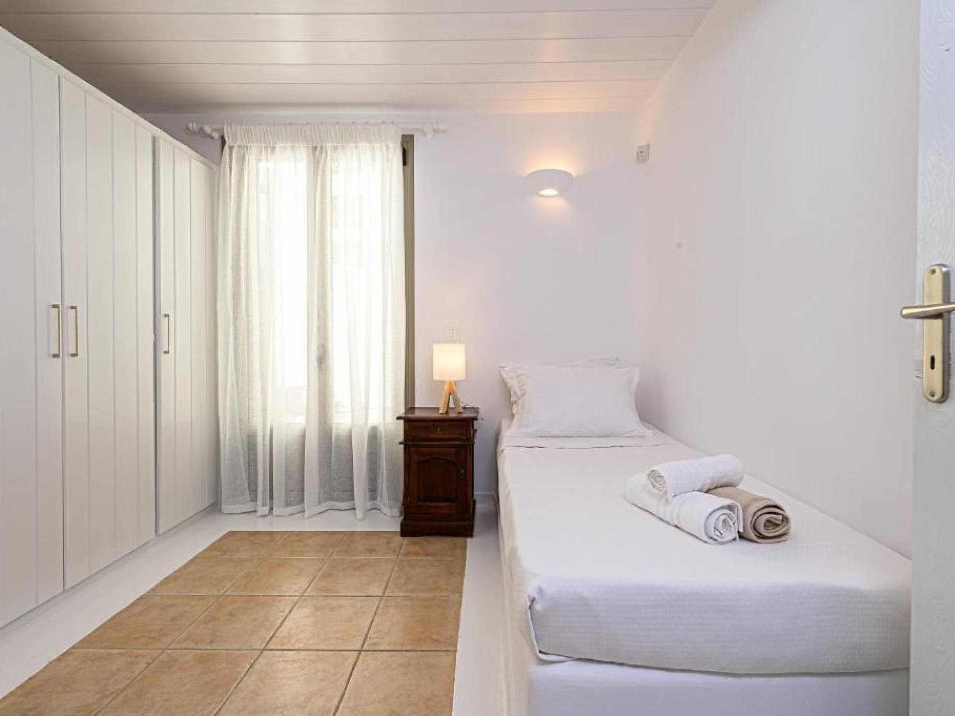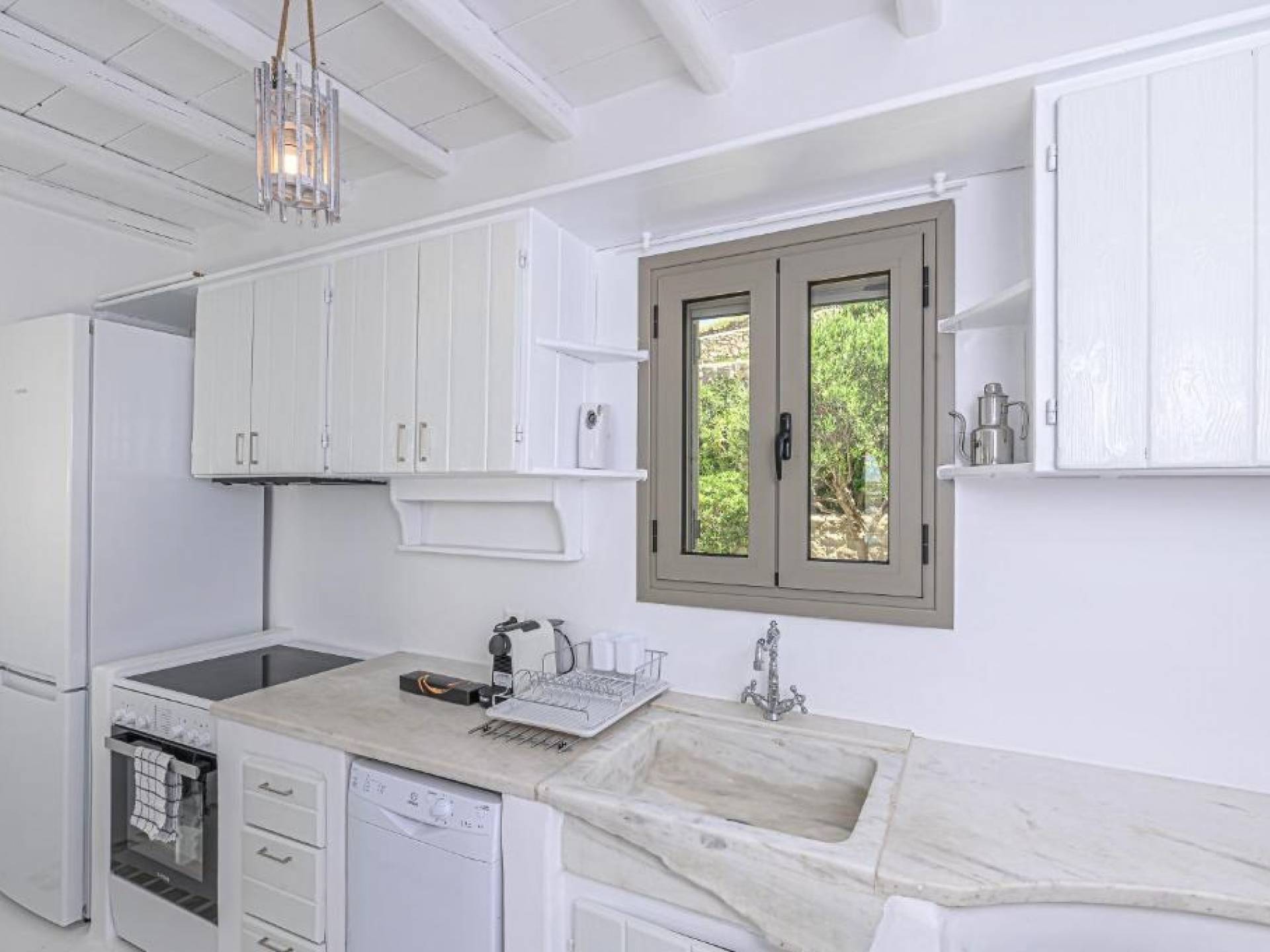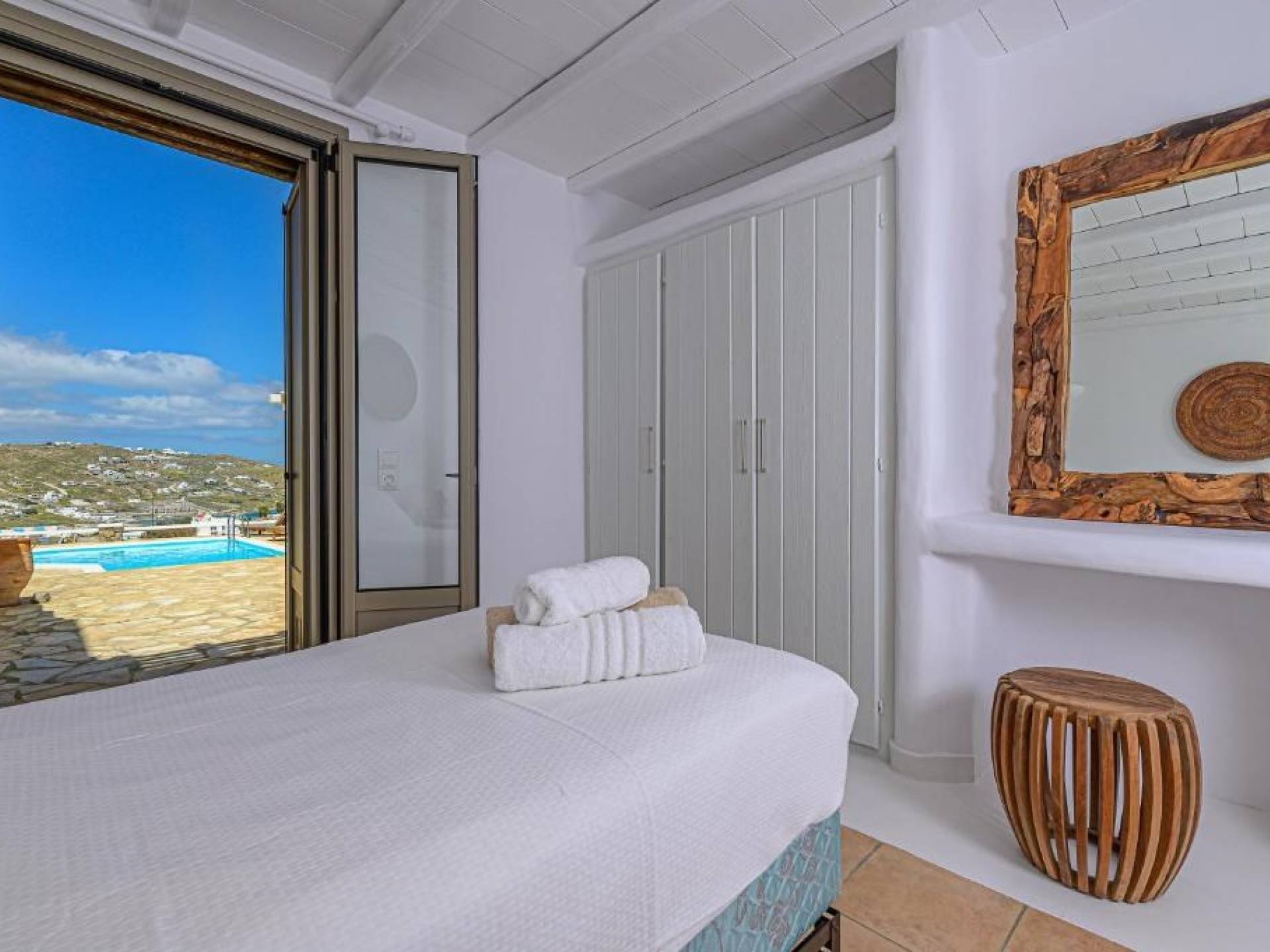 Sullo stesso livello, c'è una cucina tradizionale ma completamente attrezzata. Una grande scala interna conduce al piano superiore alla camera matrimoniale con il grande bagno in pietra. La camera da letto principale ha il proprio balcone privato con una panca in pietra, in cui l'ospite può godersi momenti privati di relax con una vista illimitata su Ornos e Korfos. Al piano inferiore ci sono tre ampie camere da letto e un piccolo locale di servizio. Ogni camera ha il proprio bagno, impianto di riscaldamento e condizionamento. La villa è inoltre dotata di TV satellitare, connessione internet Wi-Fi, sistema di allarme e illuminazione di sicurezza.