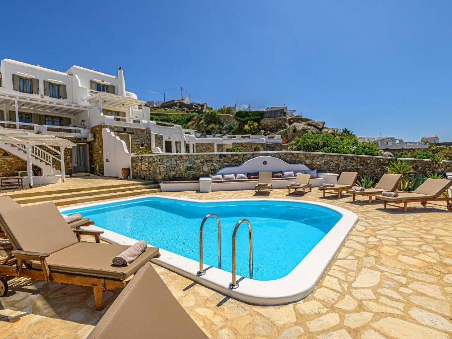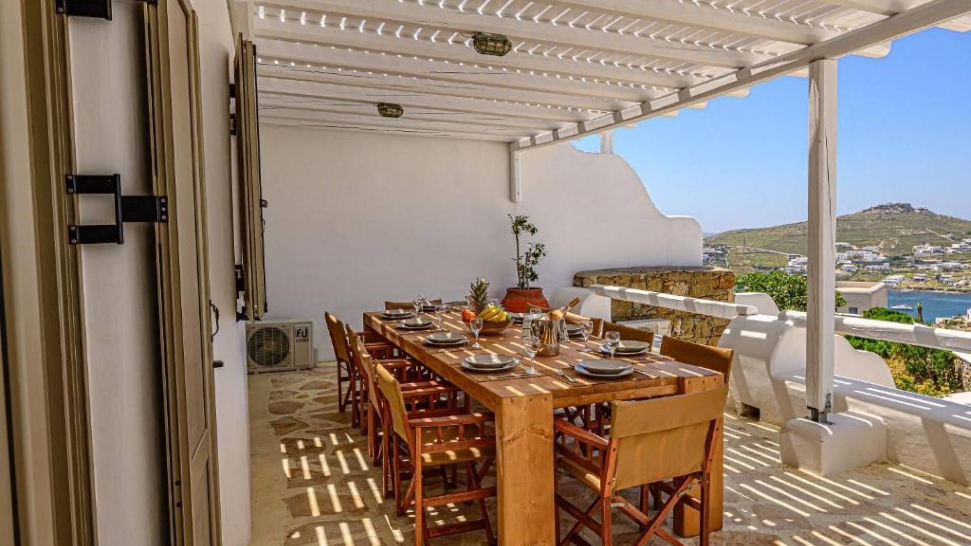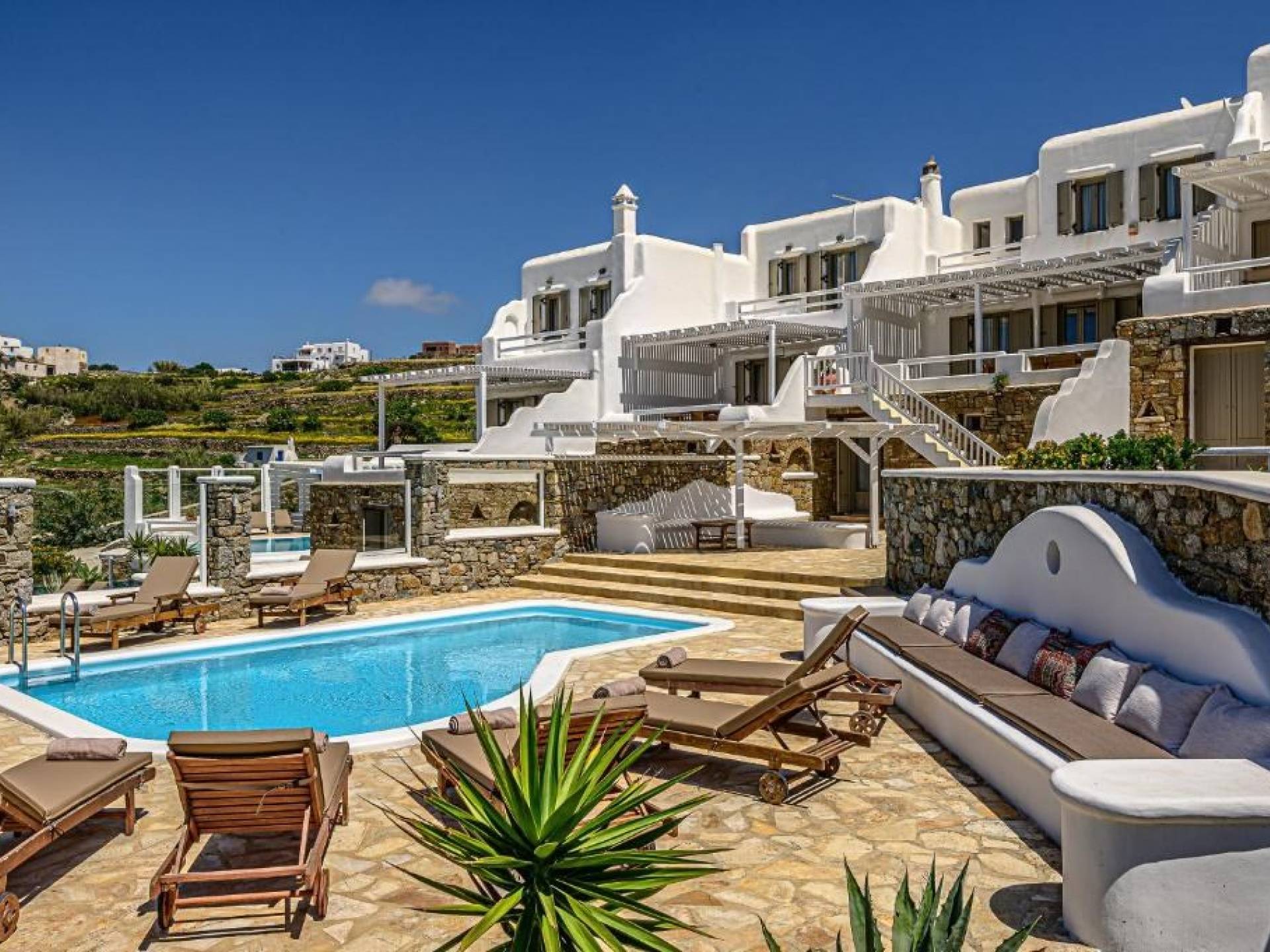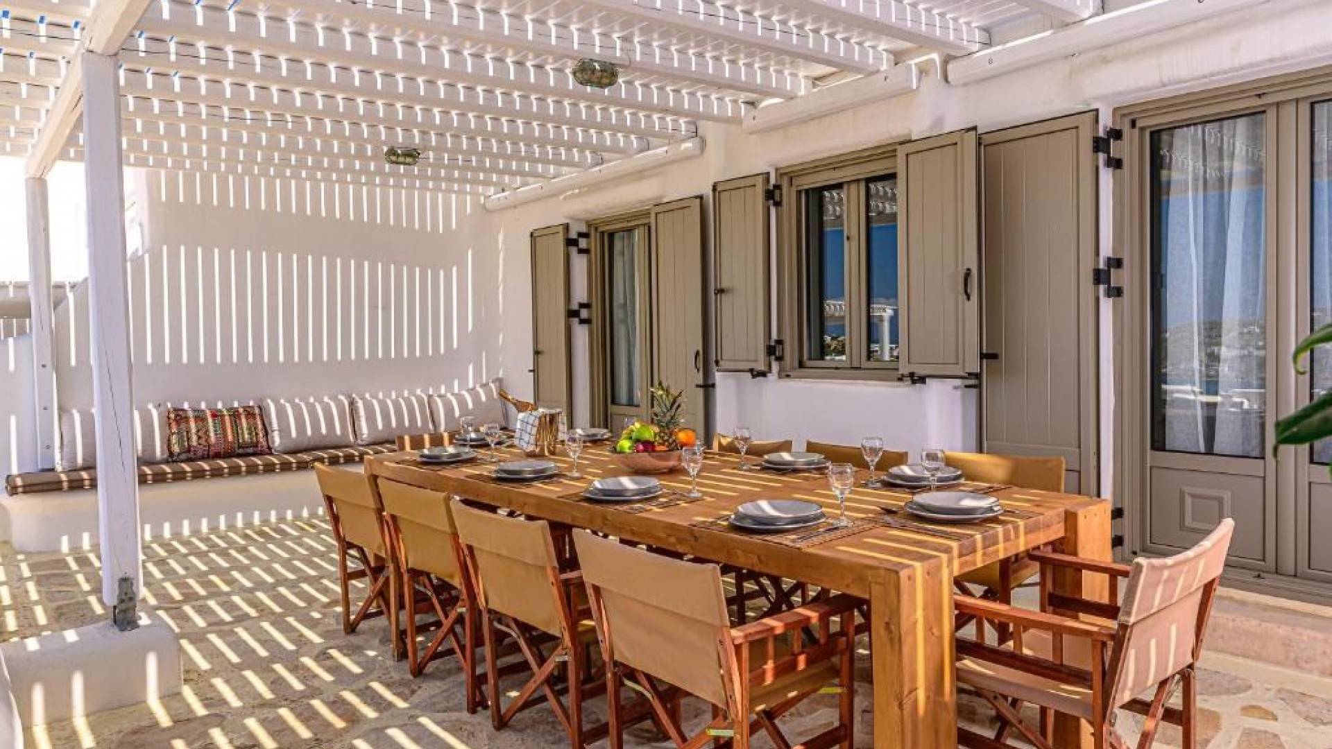 Questi ultimi sono circondati da un ampio prendisole che comprende un'ampia area lounge all'aperto e ombreggiata da pergolato dotata di comodi divani con cuscini lettini prendisole sedie a sdraio abbinati ad un grande tavolo da pranzo che predispone gli ospiti a gustare un delizioso pasto o un cocktail mentre si guarda la maestosa alba, ascoltando i suoni del mare e affacciandosi sulla Piccola Venezia di Mykonos. L'eccellente giardino paesaggistico è pieno di palme e una selezione di fiori che calmano i sensi e creano un'atmosfera romantica di relax e benessere. 9muses Villa Mykonos è considerata un rifugio lussuoso, tradizionale e sensazionale.