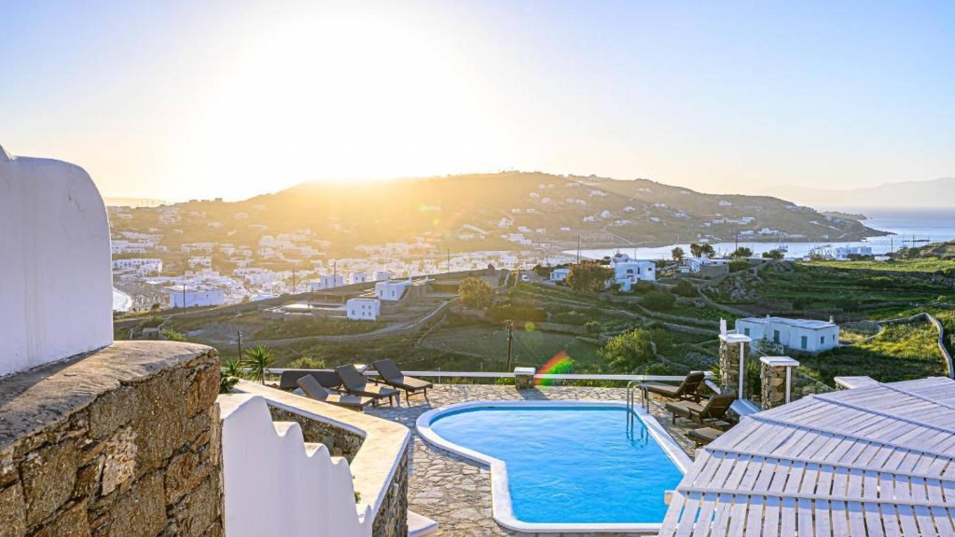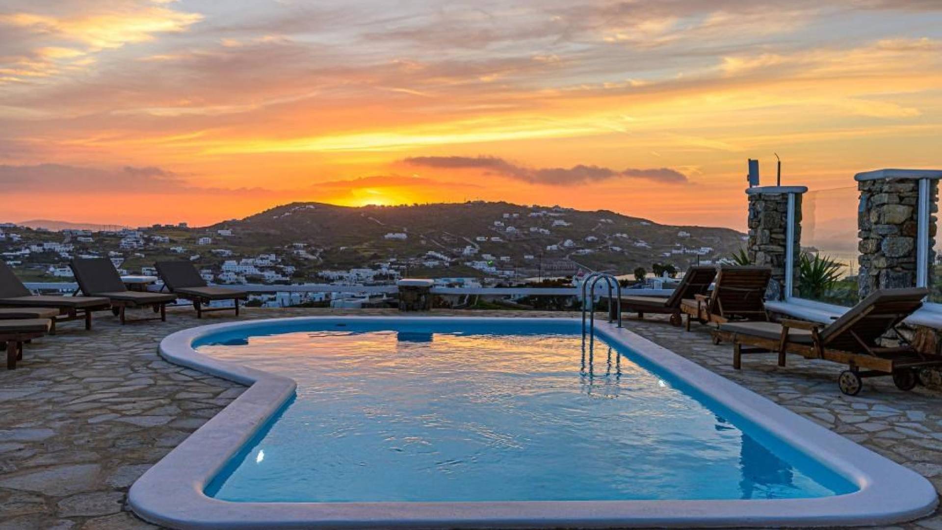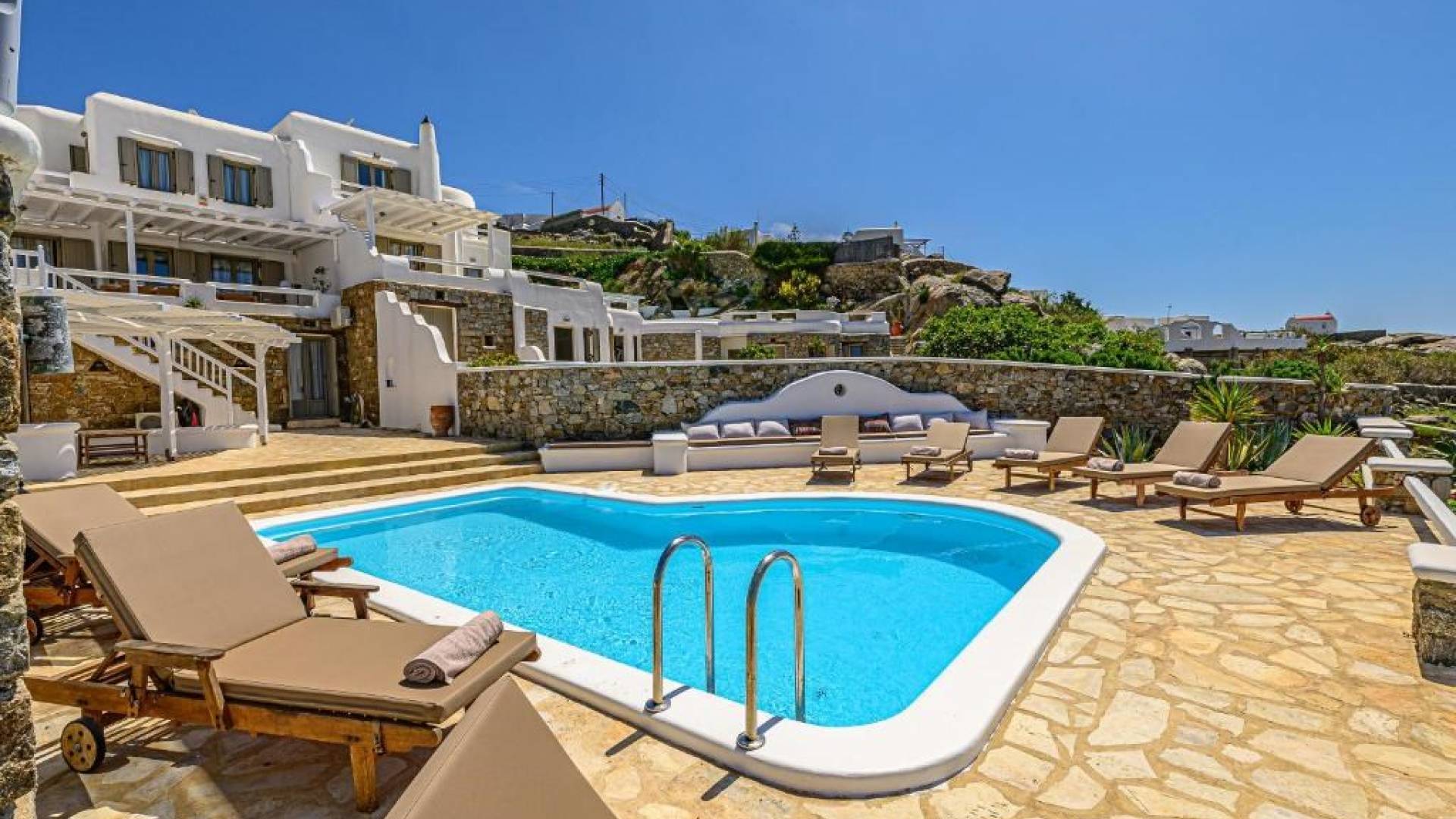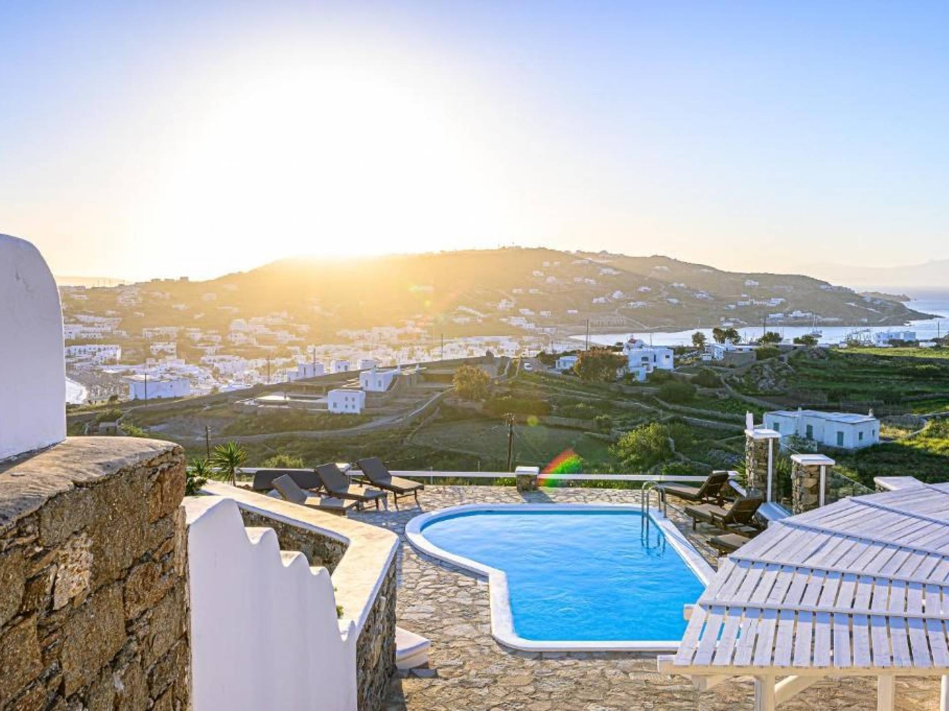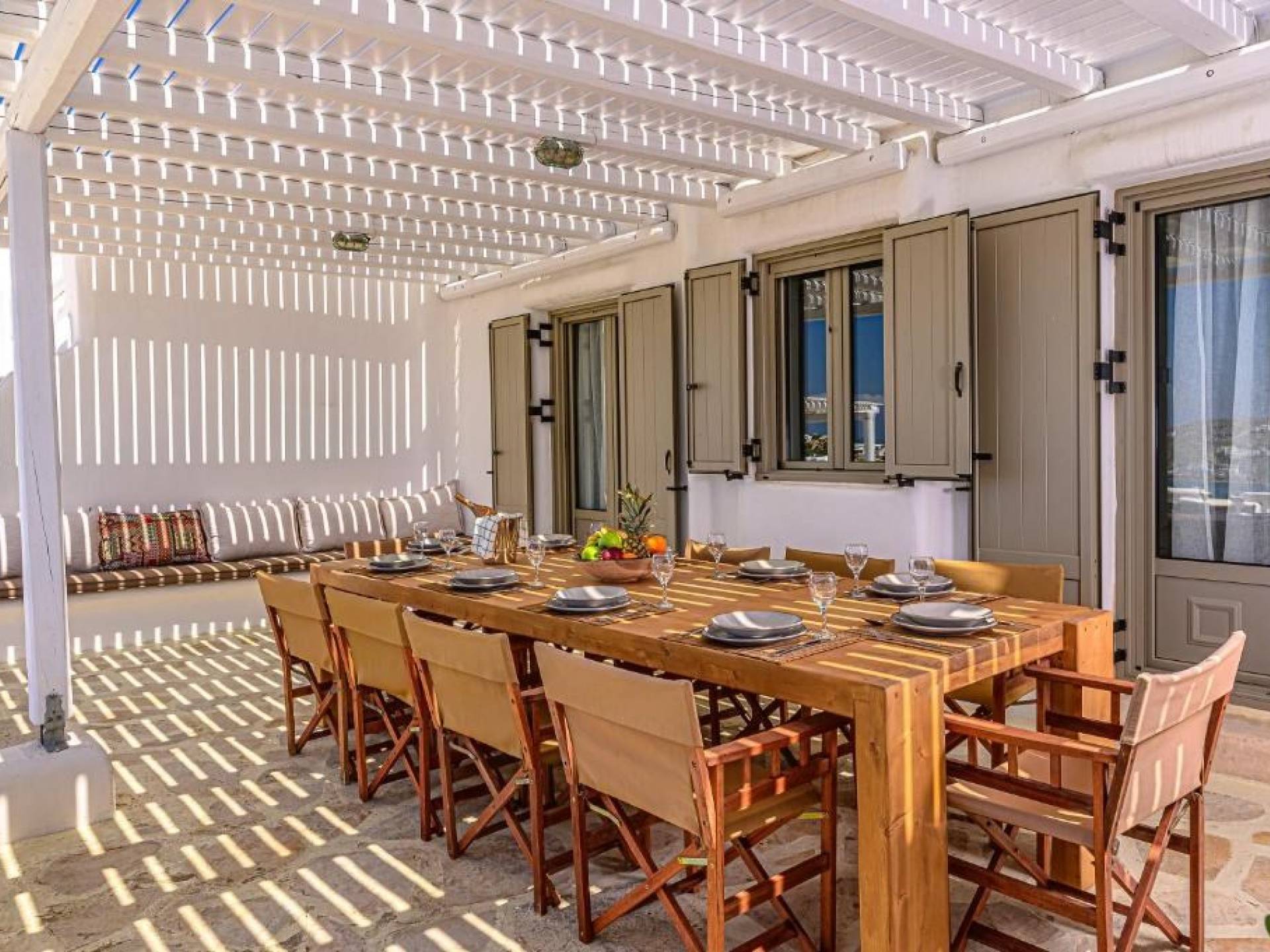 Questi ultimi sono circondati da un ampio prendisole che comprende un'ampia area lounge all'aperto e ombreggiata da pergolato dotata di comodi divani con cuscini lettini prendisole sedie a sdraio abbinati ad un grande tavolo da pranzo che predispone gli ospiti a gustare un delizioso pasto o un cocktail mentre si guarda la maestosa alba, ascoltando i suoni del mare e affacciandosi sulla Piccola Venezia di Mykonos. L'eccellente giardino paesaggistico è pieno di palme e una selezione di fiori che calmano i sensi e creano un'atmosfera romantica di relax e benessere. 9muses Villa Mykonos è considerata un rifugio lussuoso, tradizionale e sensazionale.