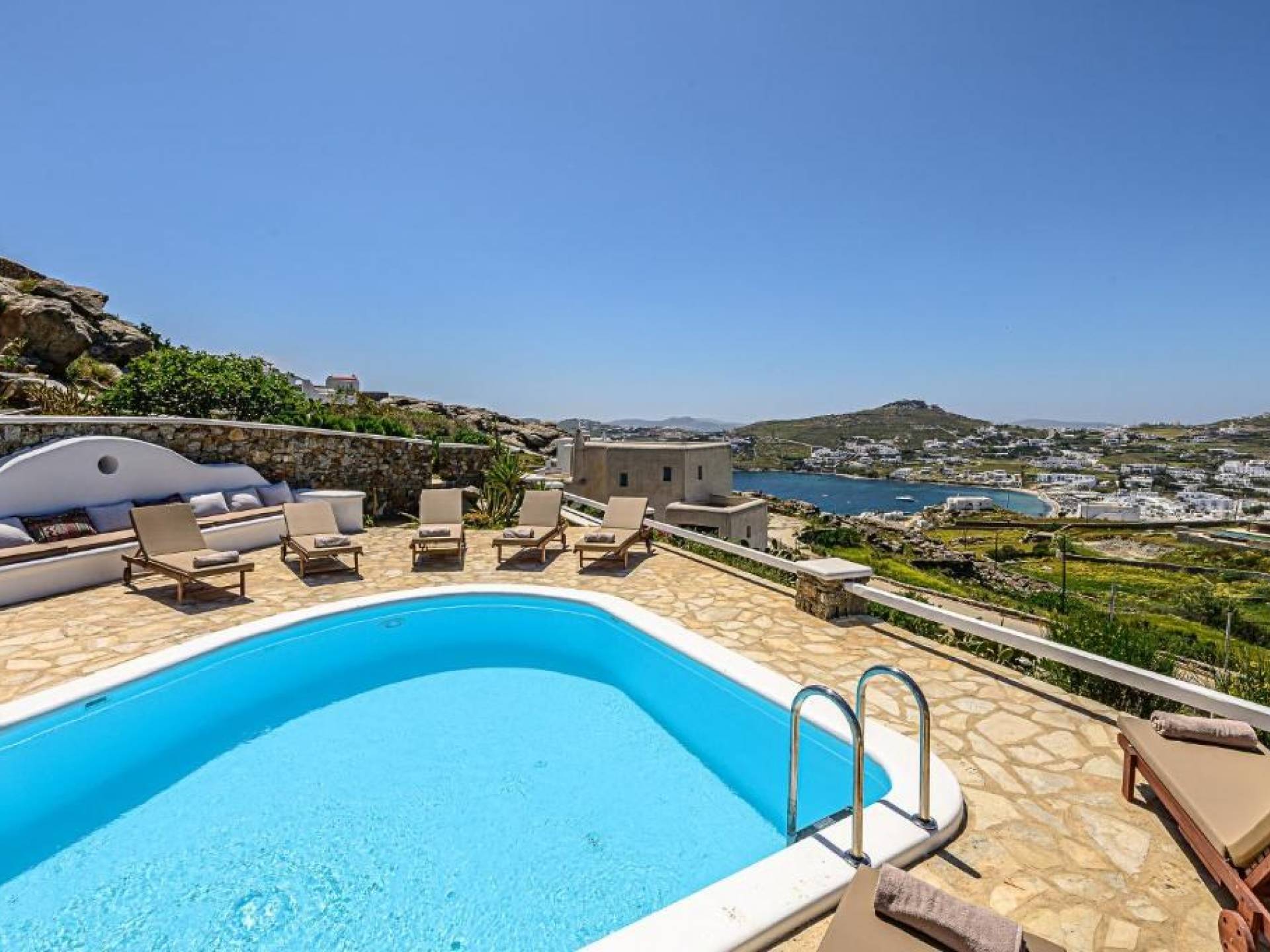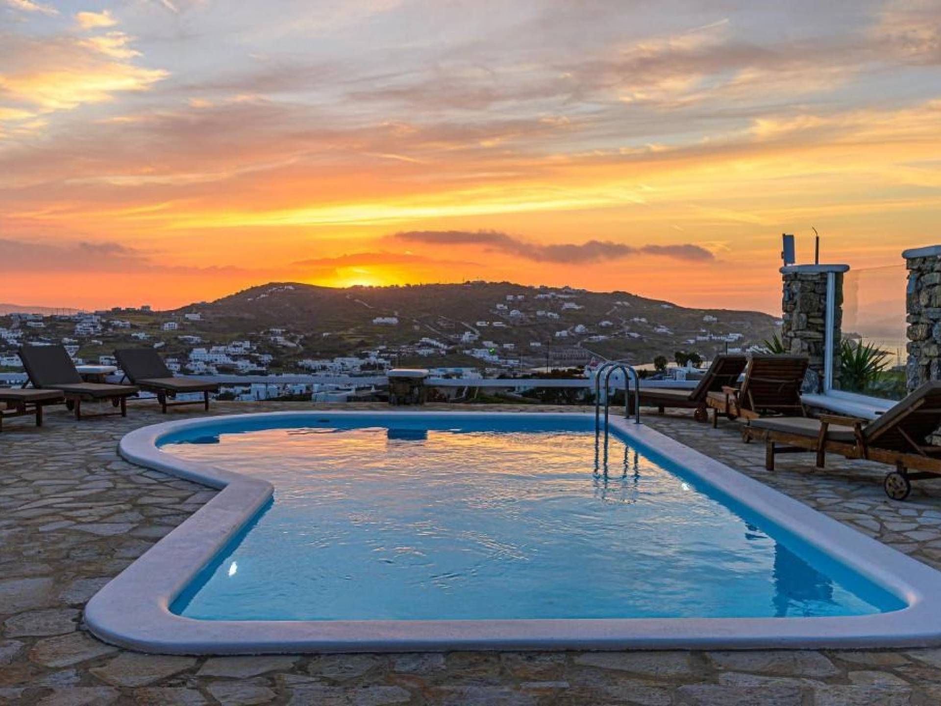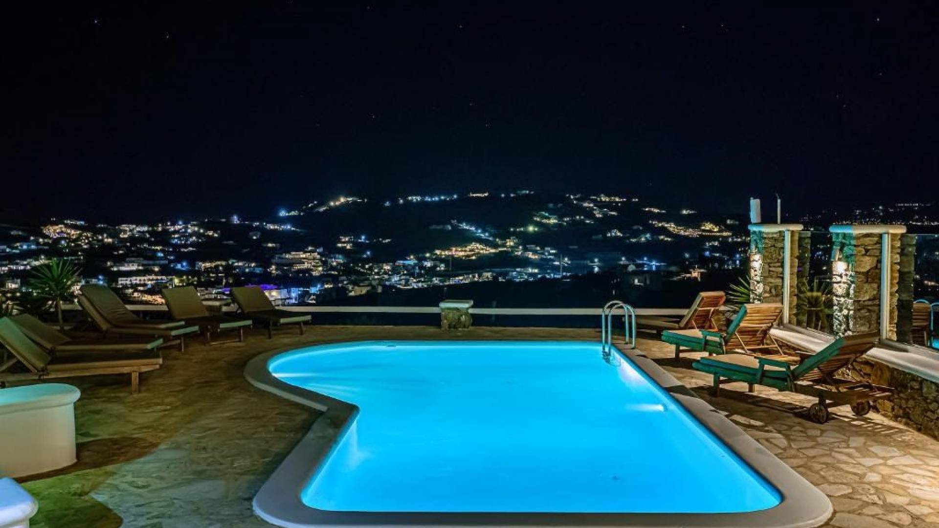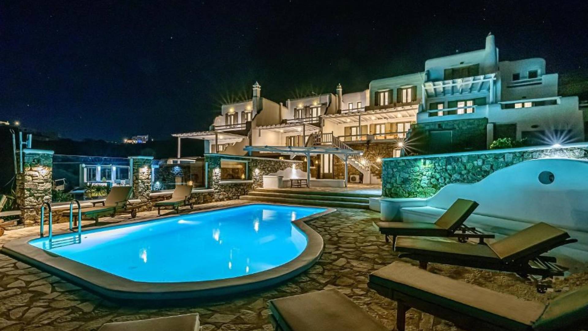 Questi ultimi sono circondati da un ampio prendisole che comprende un'ampia area lounge all'aperto e ombreggiata da pergolato dotata di comodi divani con cuscini lettini prendisole sedie a sdraio abbinati ad un grande tavolo da pranzo che predispone gli ospiti a gustare un delizioso pasto o un cocktail mentre si guarda la maestosa alba, ascoltando i suoni del mare e affacciandosi sulla Piccola Venezia di Mykonos. L'eccellente giardino paesaggistico è pieno di palme e una selezione di fiori che calmano i sensi e creano un'atmosfera romantica di relax e benessere. 9muses Villa Mykonos è considerata un rifugio lussuoso, tradizionale e sensazionale.