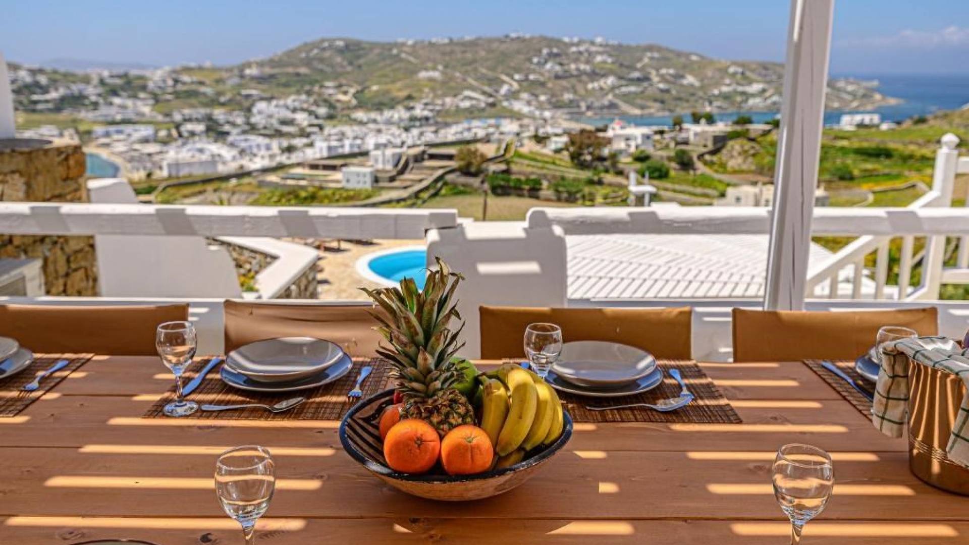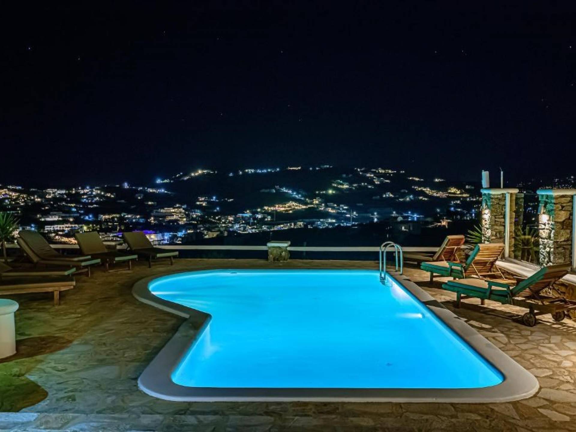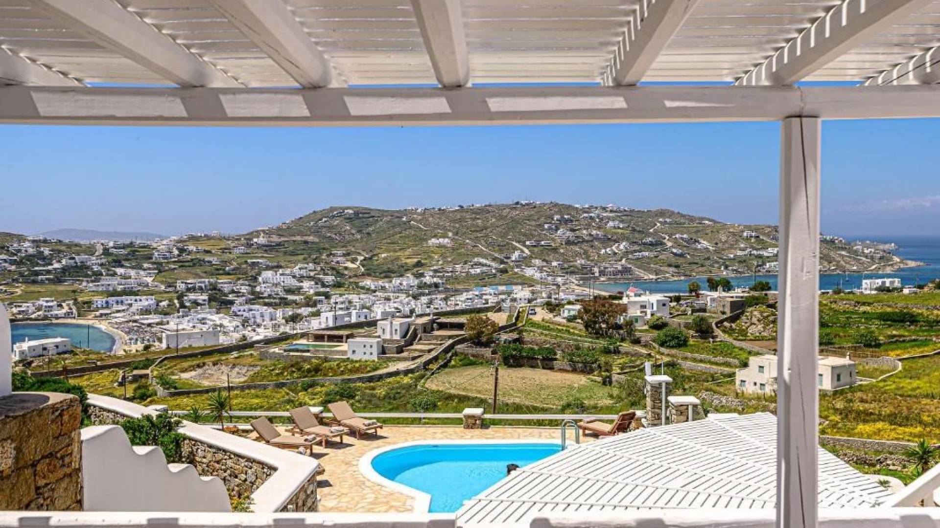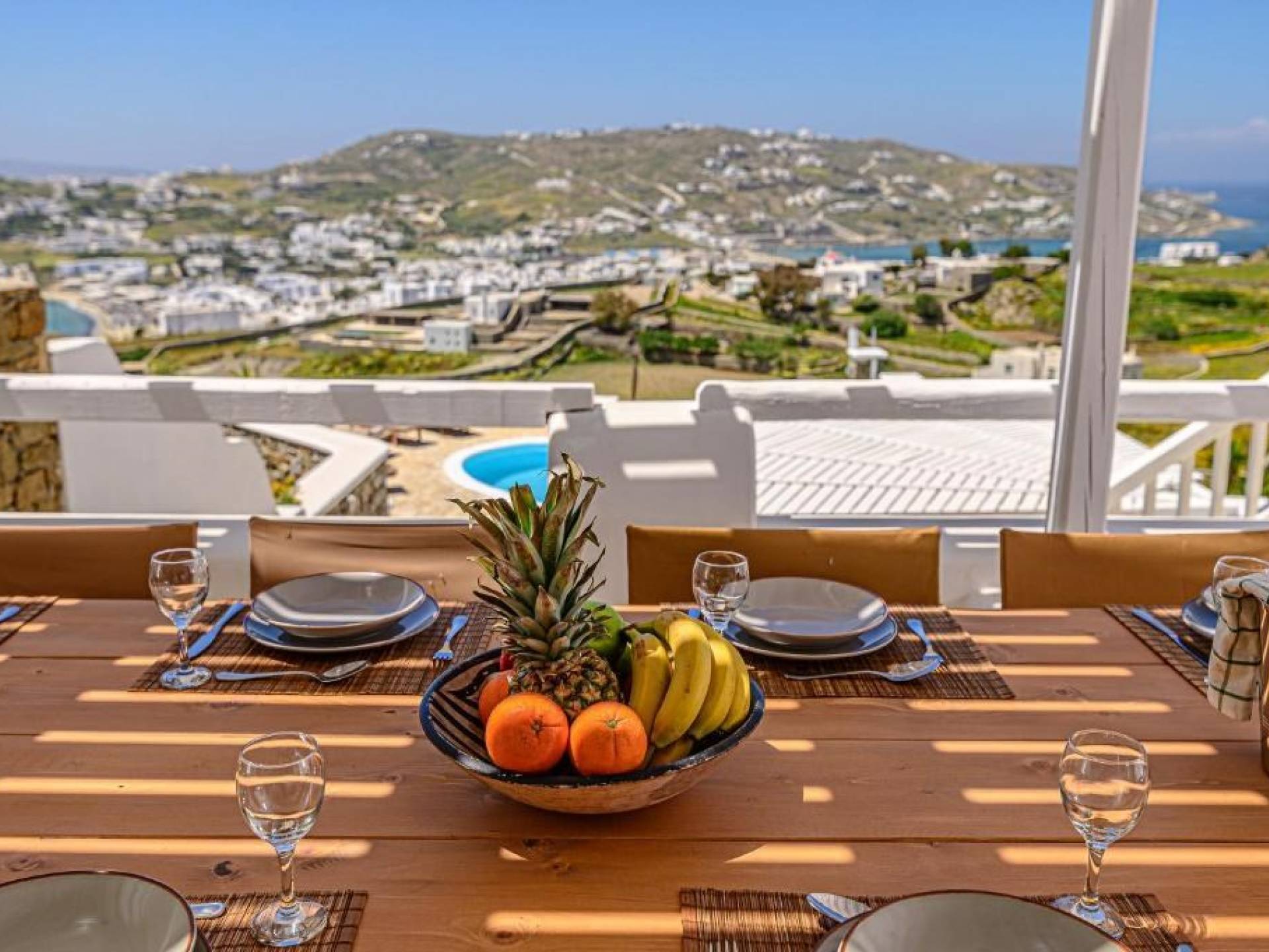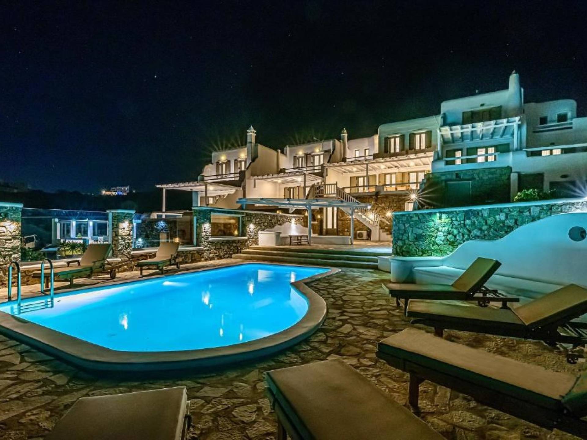 Questi ultimi sono circondati da un ampio prendisole che comprende un'ampia area lounge all'aperto e ombreggiata da pergolato dotata di comodi divani con cuscini lettini prendisole sedie a sdraio abbinati ad un grande tavolo da pranzo che predispone gli ospiti a gustare un delizioso pasto o un cocktail mentre si guarda la maestosa alba, ascoltando i suoni del mare e affacciandosi sulla Piccola Venezia di Mykonos. L'eccellente giardino paesaggistico è pieno di palme e una selezione di fiori che calmano i sensi e creano un'atmosfera romantica di relax e benessere. 9muses Villa Mykonos è considerata un rifugio lussuoso, tradizionale e sensazionale.