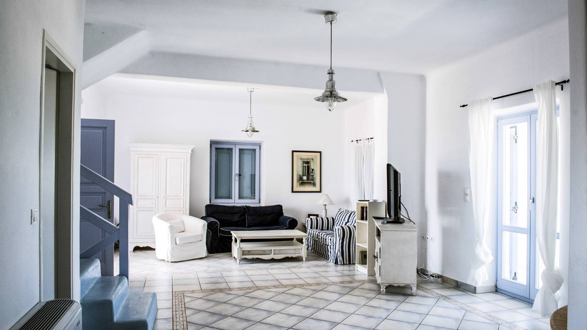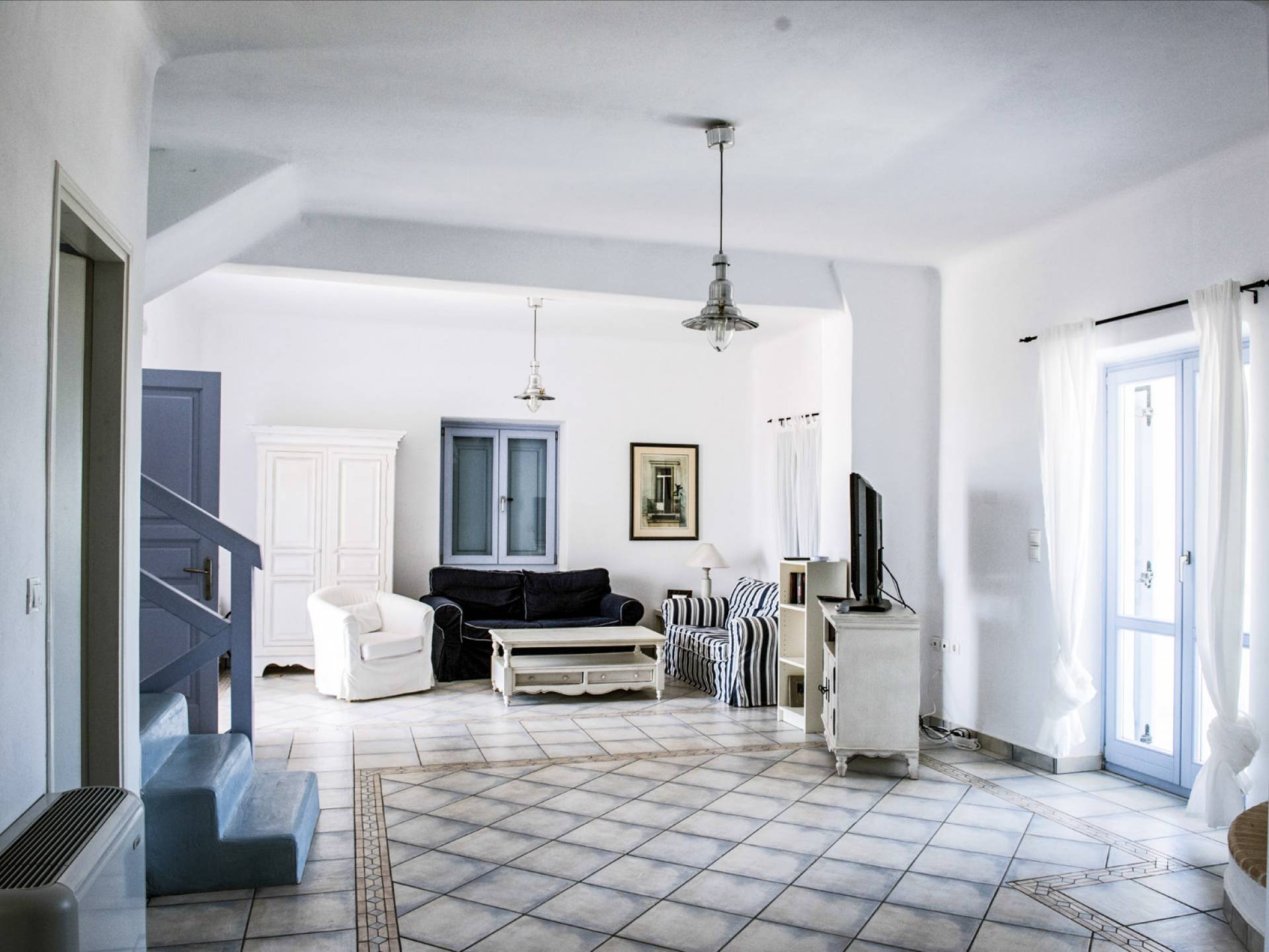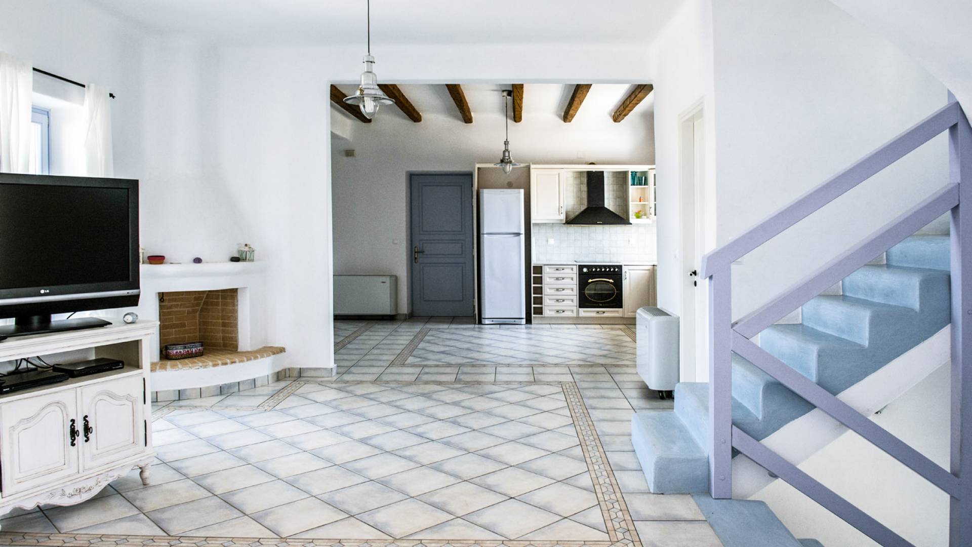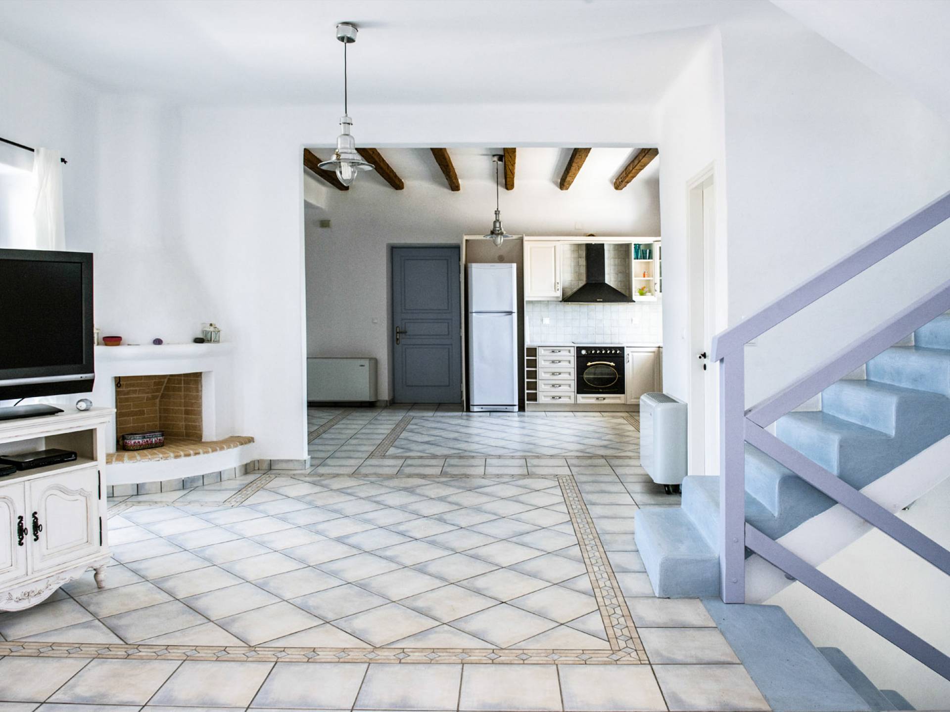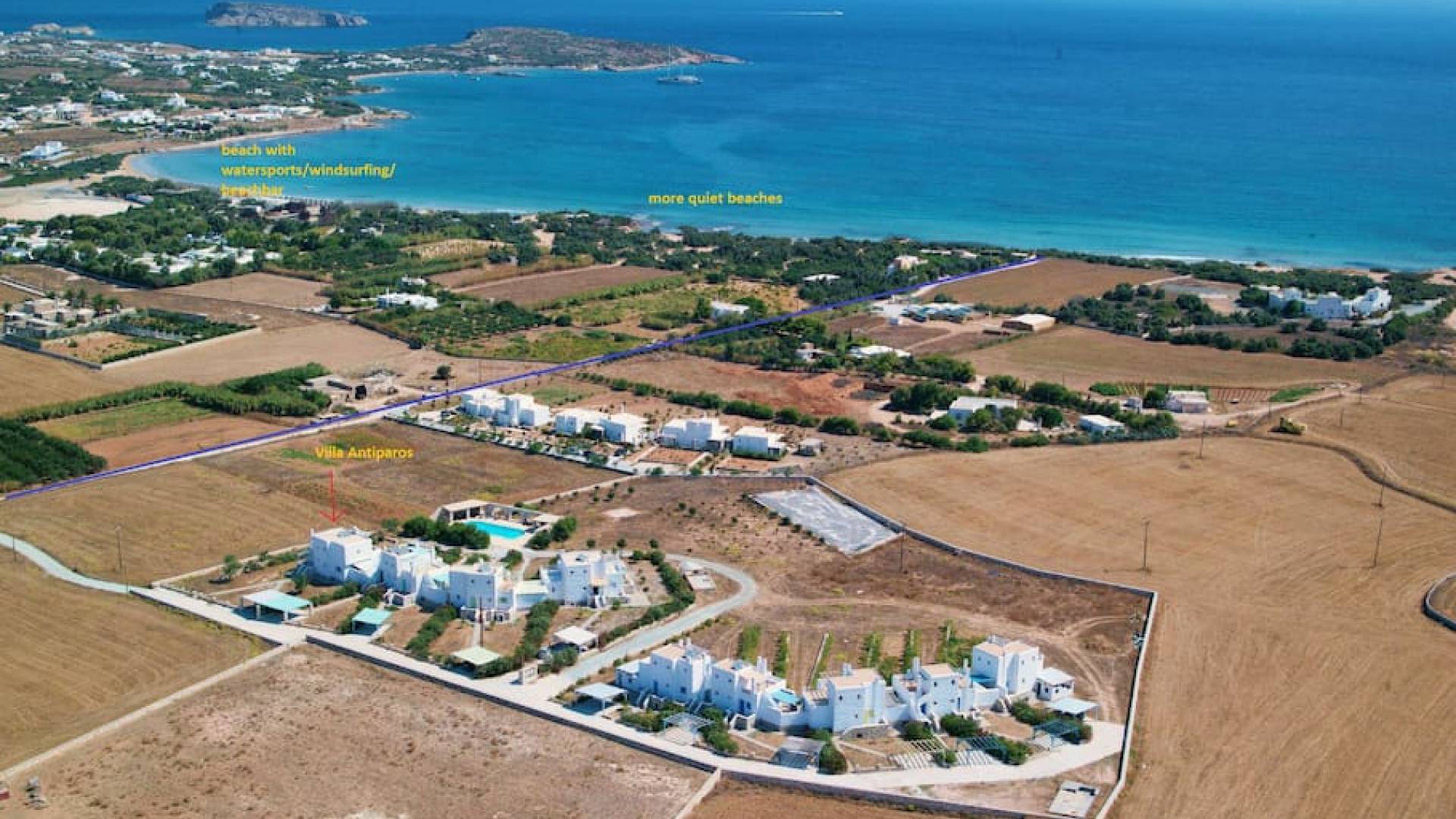 Antiparos Villa è composta da 3 livelli. Al primo livello (seminterrato) ci sono 3 camere da letto per 6 persone, 2 bagni, un ripostiglio con lavatrice e un grande soggiorno con camino, dove ci sono 2 letti singoli e un divano letto. Da questo livello si accede al cortile e alla piscina e tramite una scala interna si accede al primo piano.