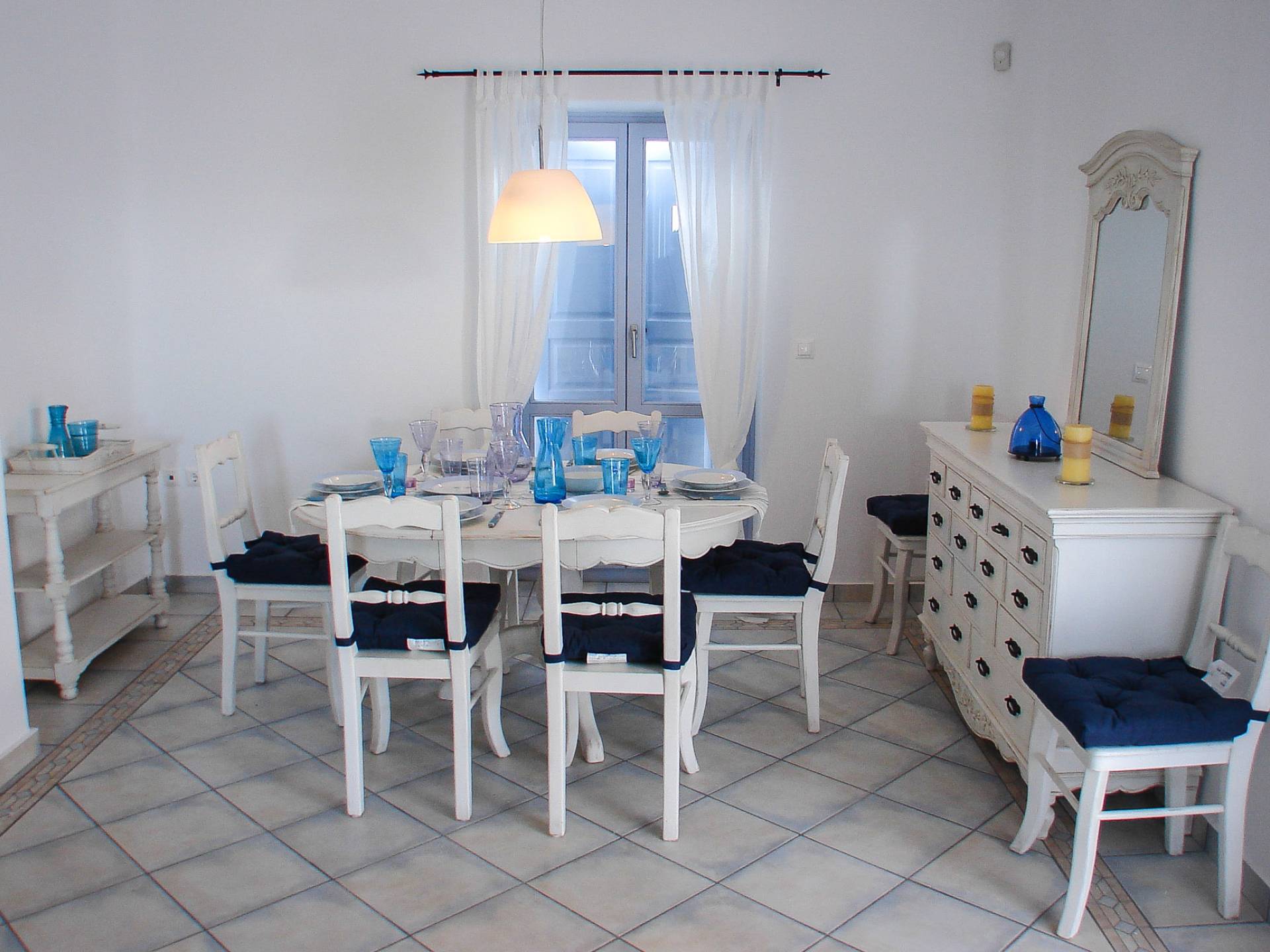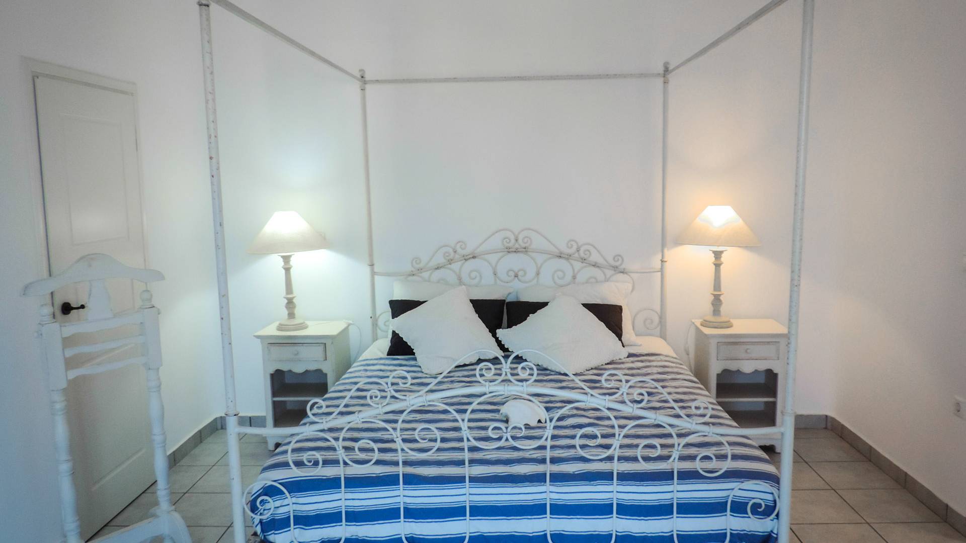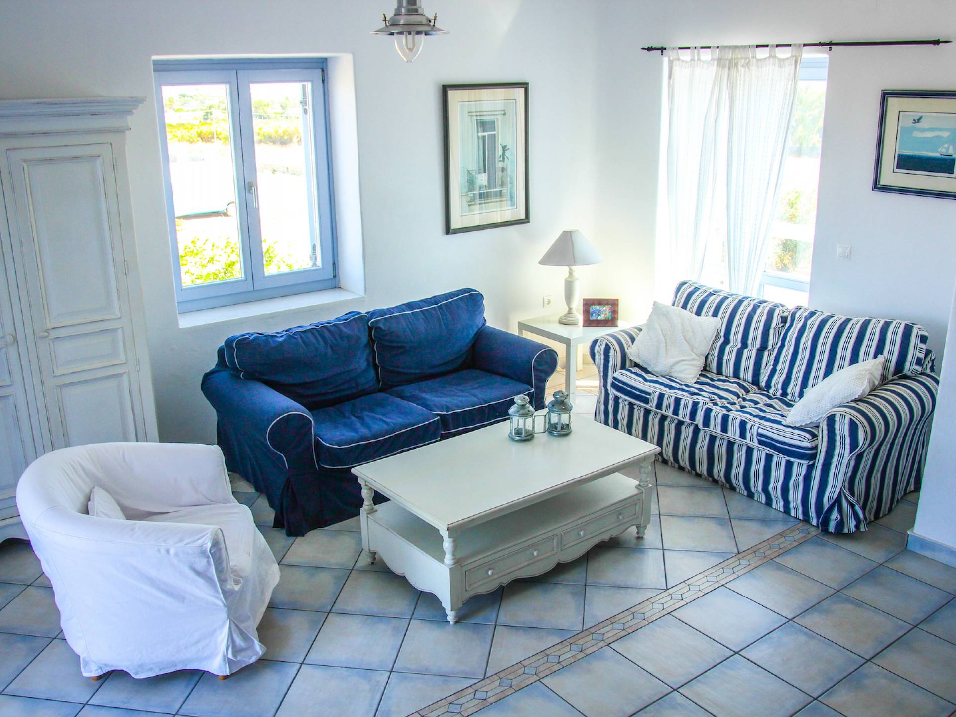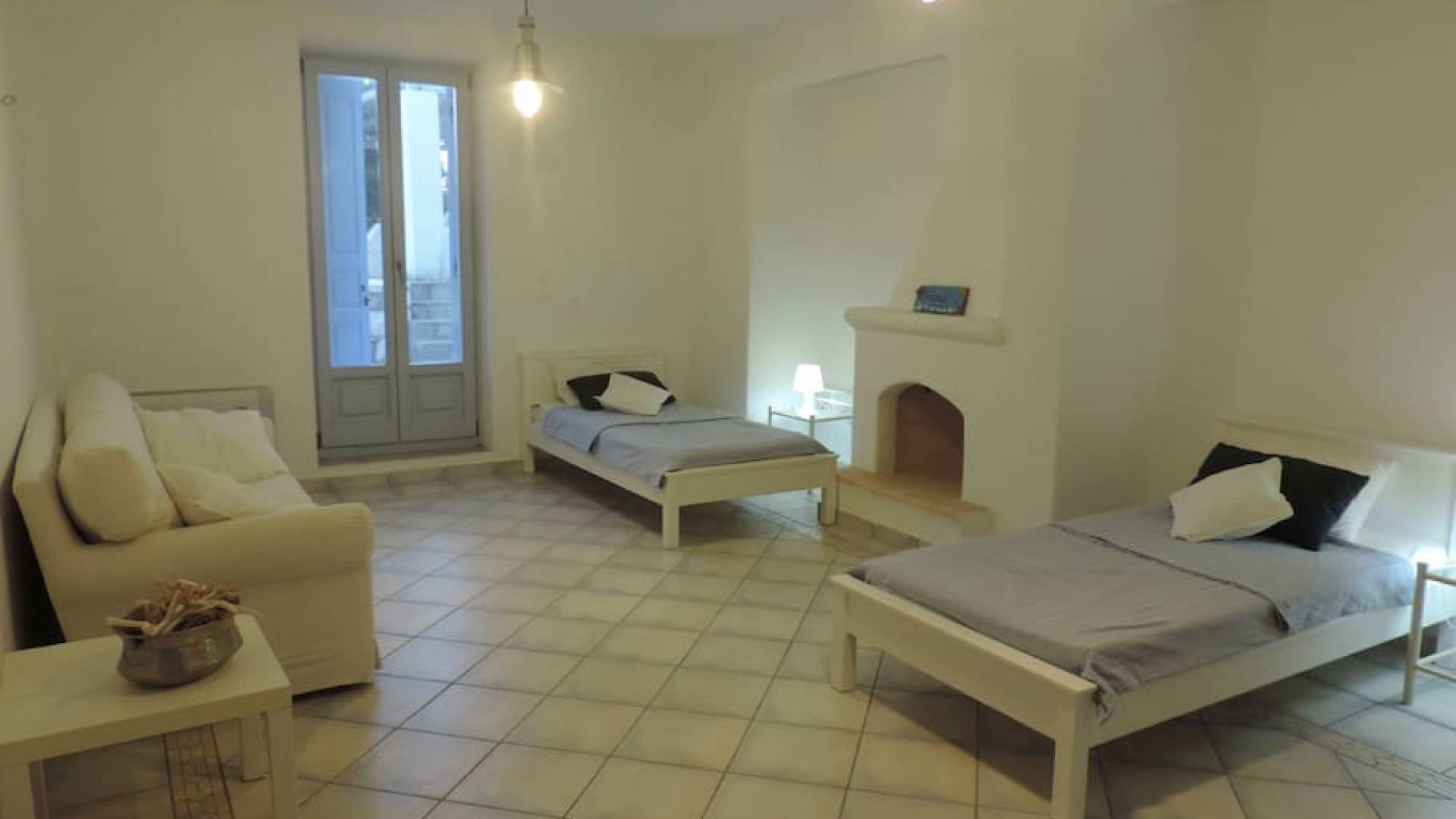 Antiparos Villa è composta da 3 livelli. Al primo livello (seminterrato) ci sono 3 camere da letto per 6 persone, 2 bagni, un ripostiglio con lavatrice e un grande soggiorno con camino, dove ci sono 2 letti singoli e un divano letto. Da questo livello si accede al cortile e alla piscina e tramite una scala interna si accede al primo piano.
