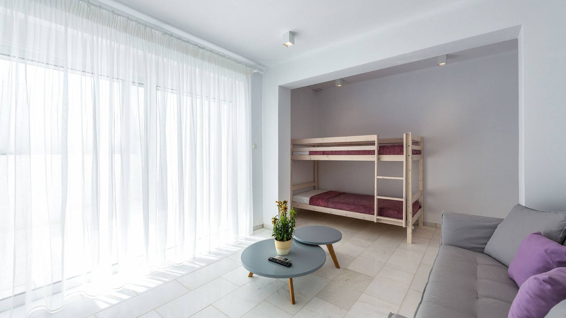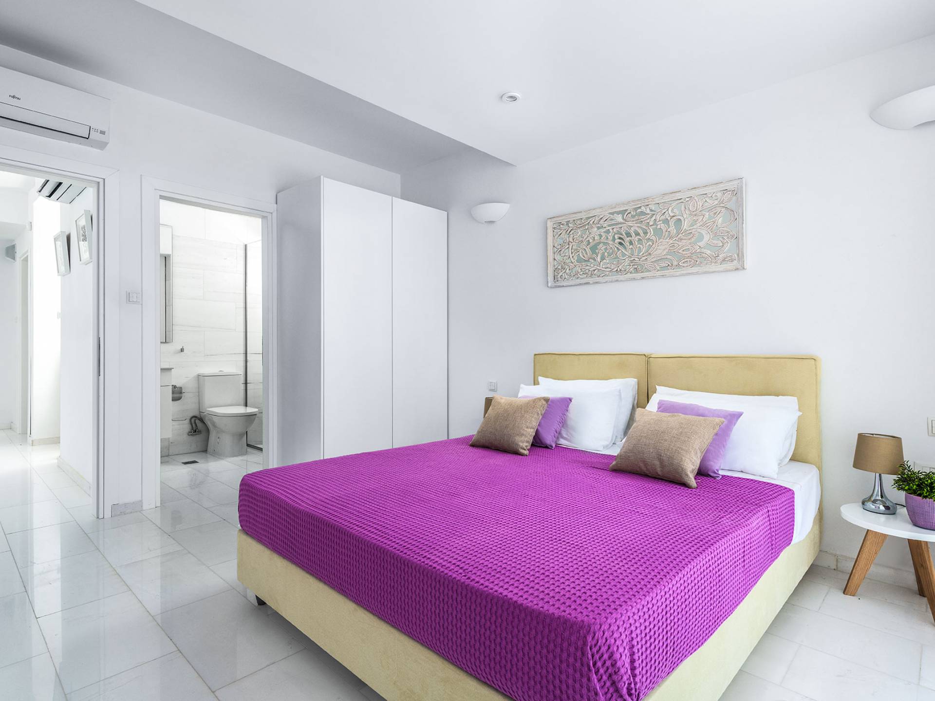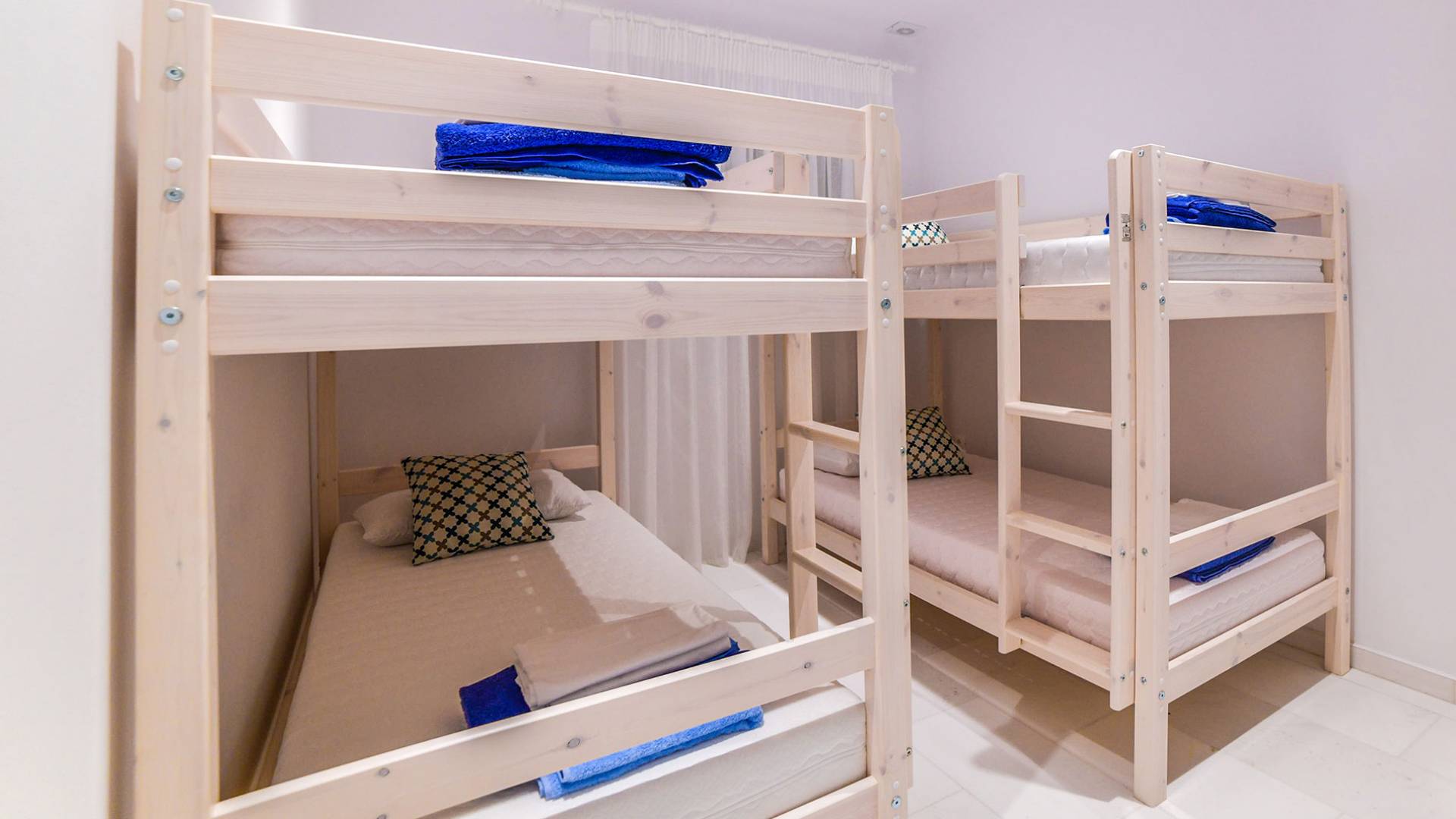 Salindo le scale si entra nelle camere da letto dove si trovano 2 camere da letto completamente climatizzate. La prima ha un letto matrimoniale e un balcone privato. La seconda camera ha un letto matrimoniale e una stanza attigua con un letto singolo. Entrambe le camere sono dotate di bagno privato. La villa ha altre tre camere da letto al piano di sotto. La prima è dotata di letti a castello, mentre la seconda ha letti a castello e un divano, che li rende ideali per famiglie con molti bambini. C'è anche una terza camera da letto con letto a castello.