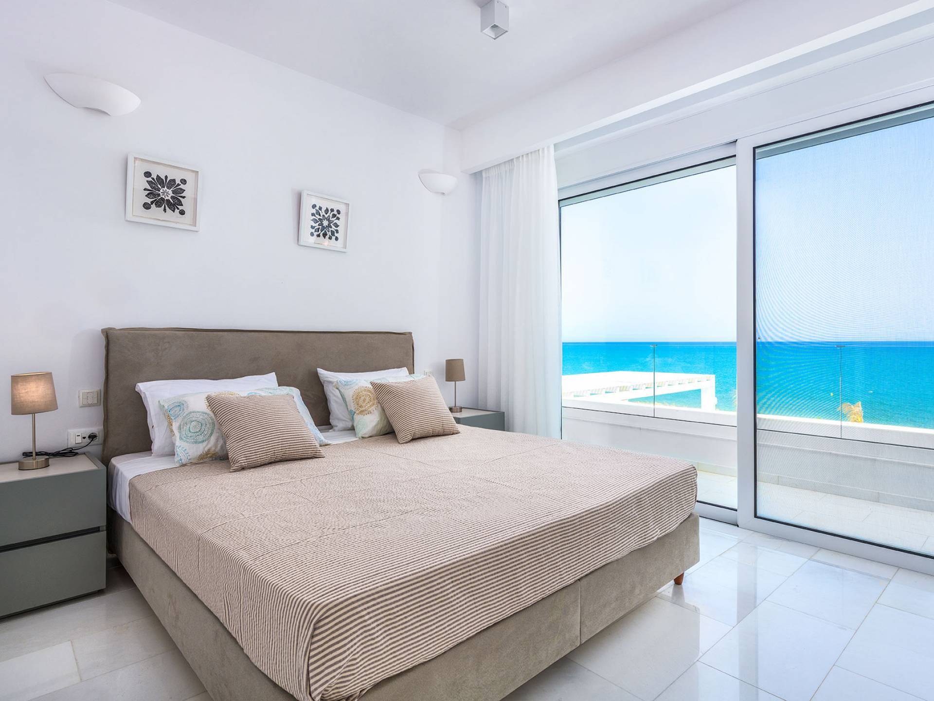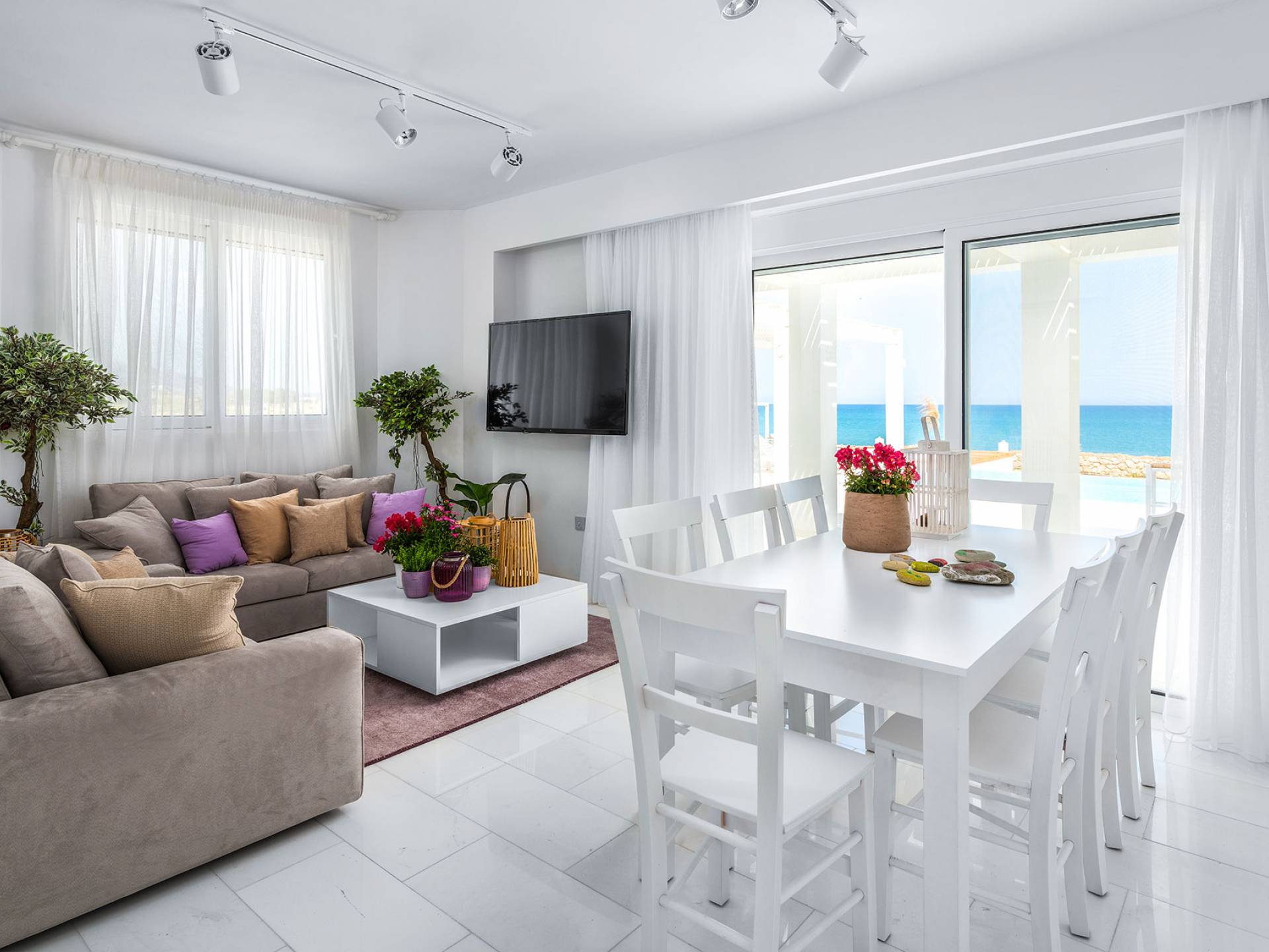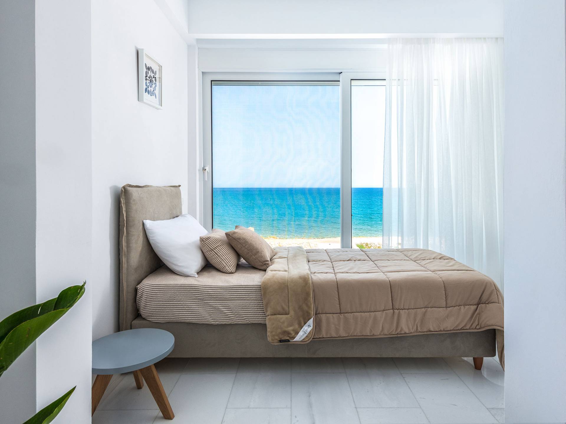 L'interno della villa è decorato in stile moderno con toni prevalentemente bianchi e della terra e tocchi colorati, creando un'atmosfera accogliente. Entrando dalla porta principale si entra in un soggiorno e cucina a pianta aperta. Il soggiorno è dotato di un comodo salottino, una grande smart TV a schermo piatto, che si apre su un'ampia veranda arredata con un'ottima vista mare. La cucina è completamente attrezzata e dispone di forno, frigorifero, congelatore e lavastoviglie. Al piano terra si trova una camera da letto completamente climatizzata con letto matrimoniale e bagno privato. Il piano terra dispone anche di un ulteriore bagno con doccia.