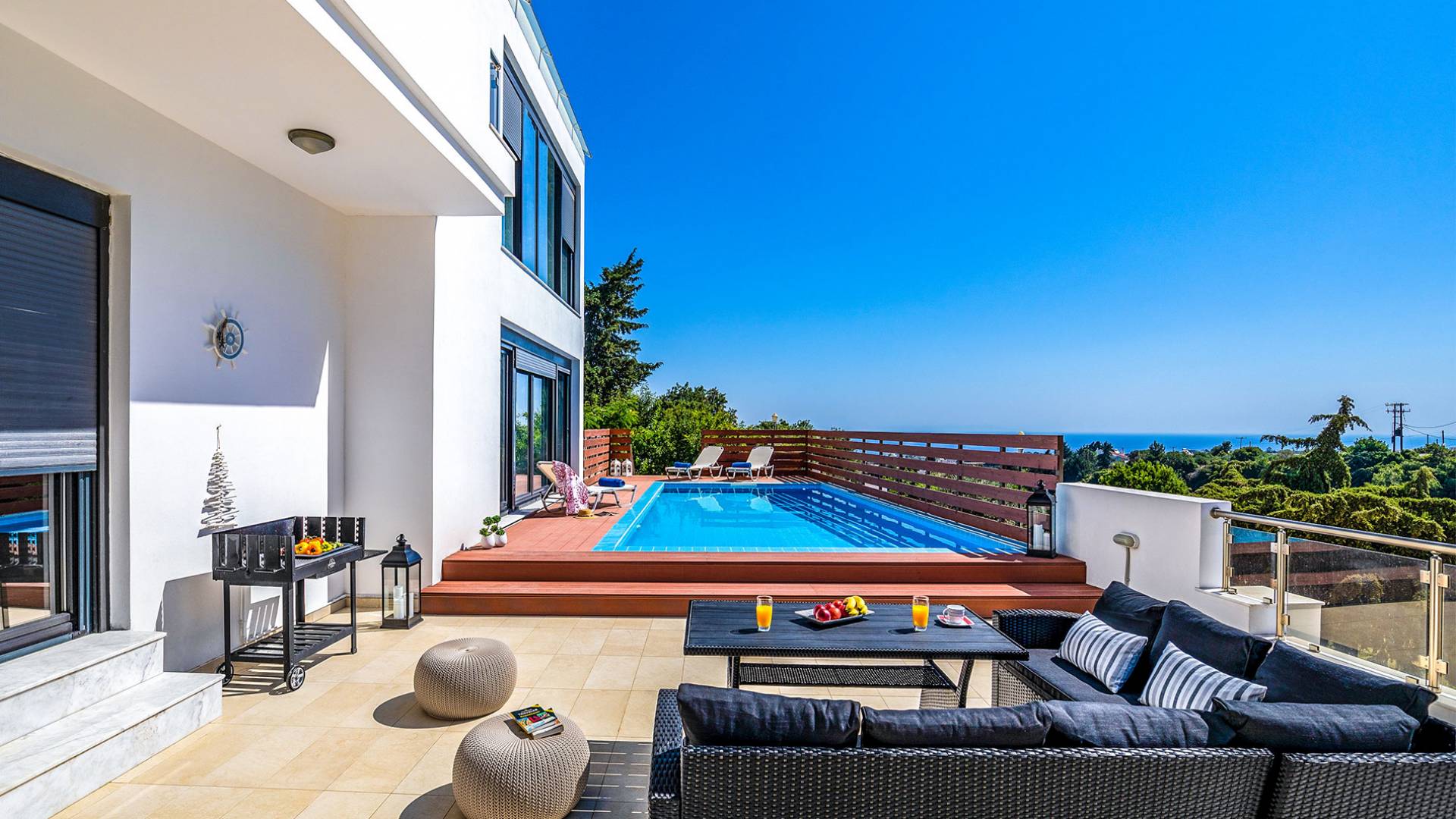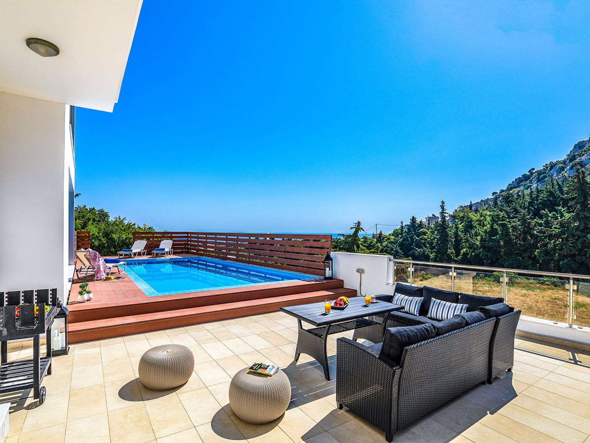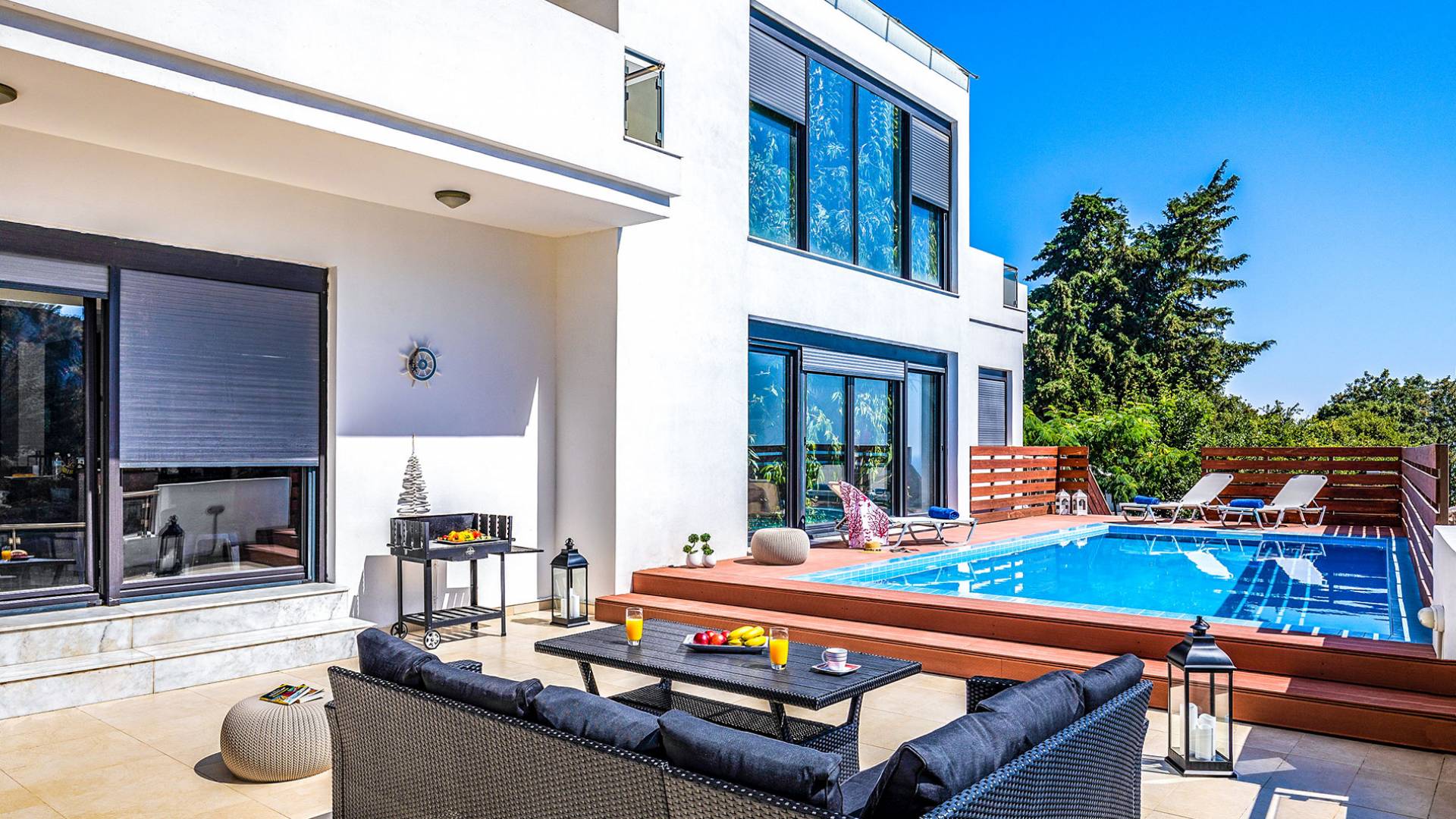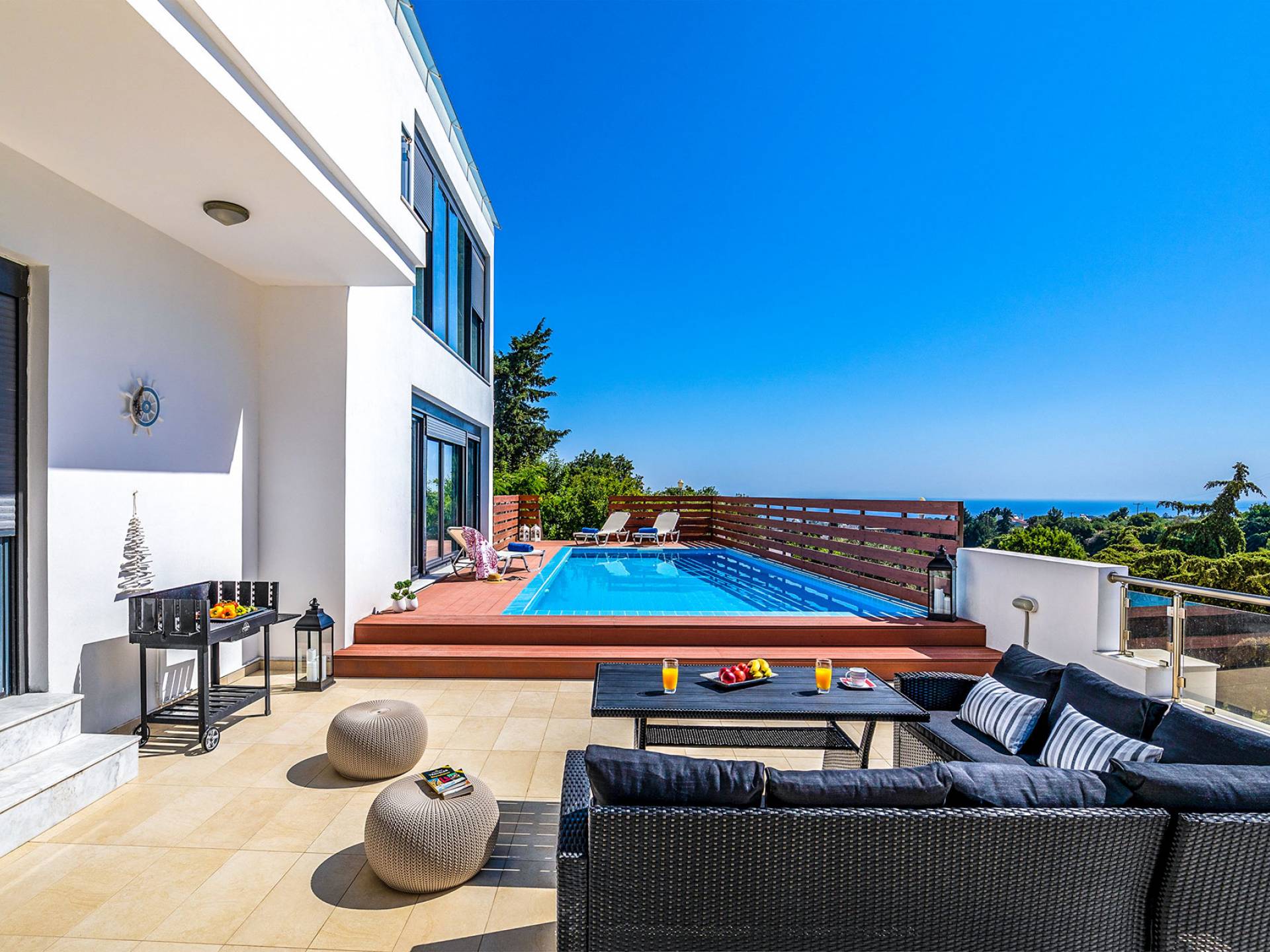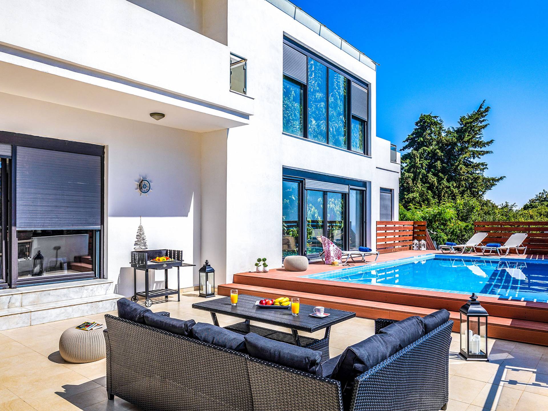 La villa è altrettanto imponente e offre ampi giardini ben curati con un'area piscina attrezzata con ombrelloni e lettini, che creano l'ambiente perfetto per un momento di relax sotto i raggi dorati del sole greco. La casa dispone inoltre di ampie verande sia al piano terra che al primo piano con splendida vista sulla zona circostante, ideali per rilassarsi al mattino o alla sera. La villa offre anche un barbecue completamente attrezzato con un'area salotto in giardino, dove gli ospiti possono vivere un'esperienza culinaria all'aperto davvero unica.