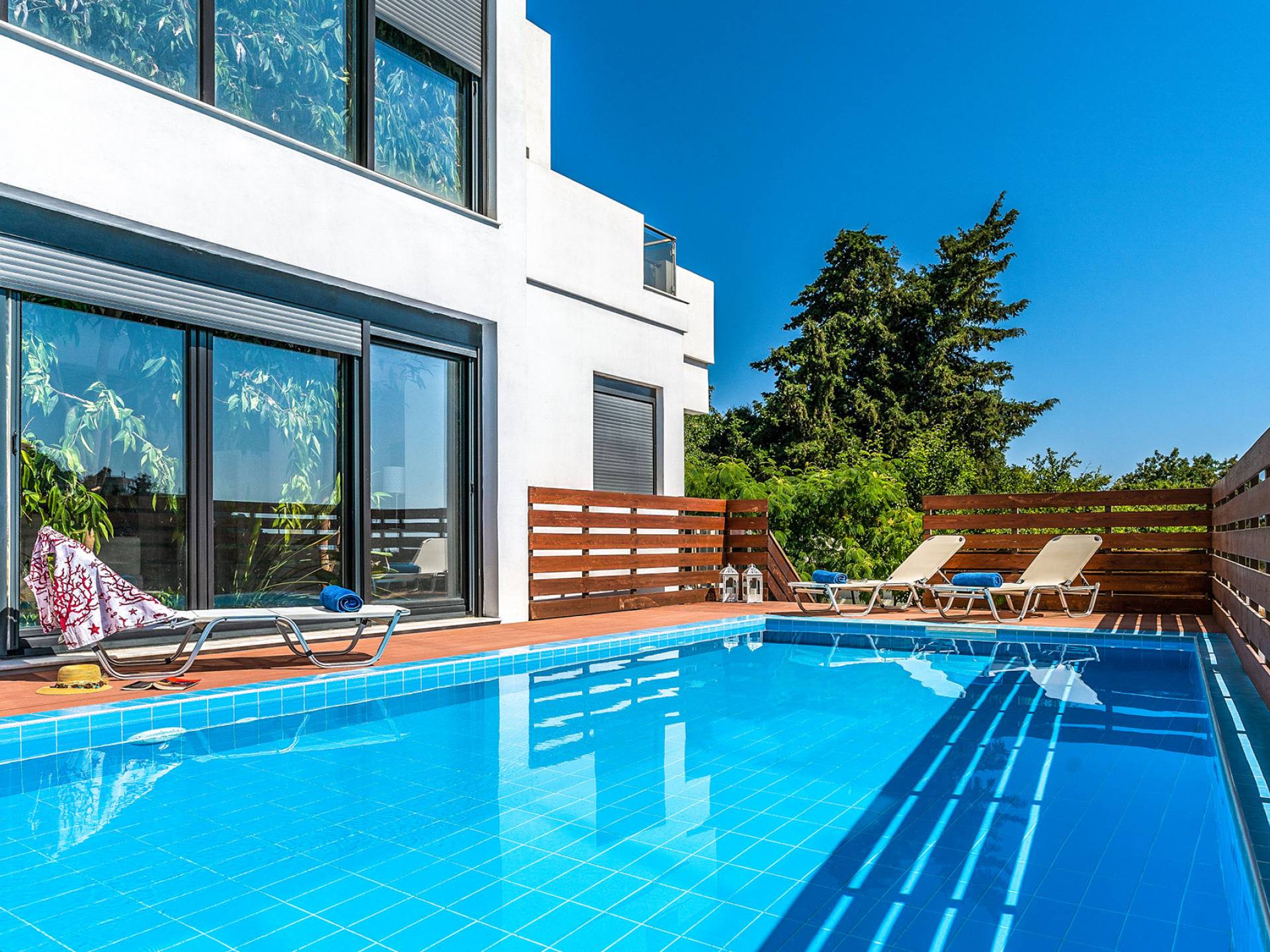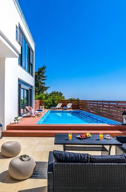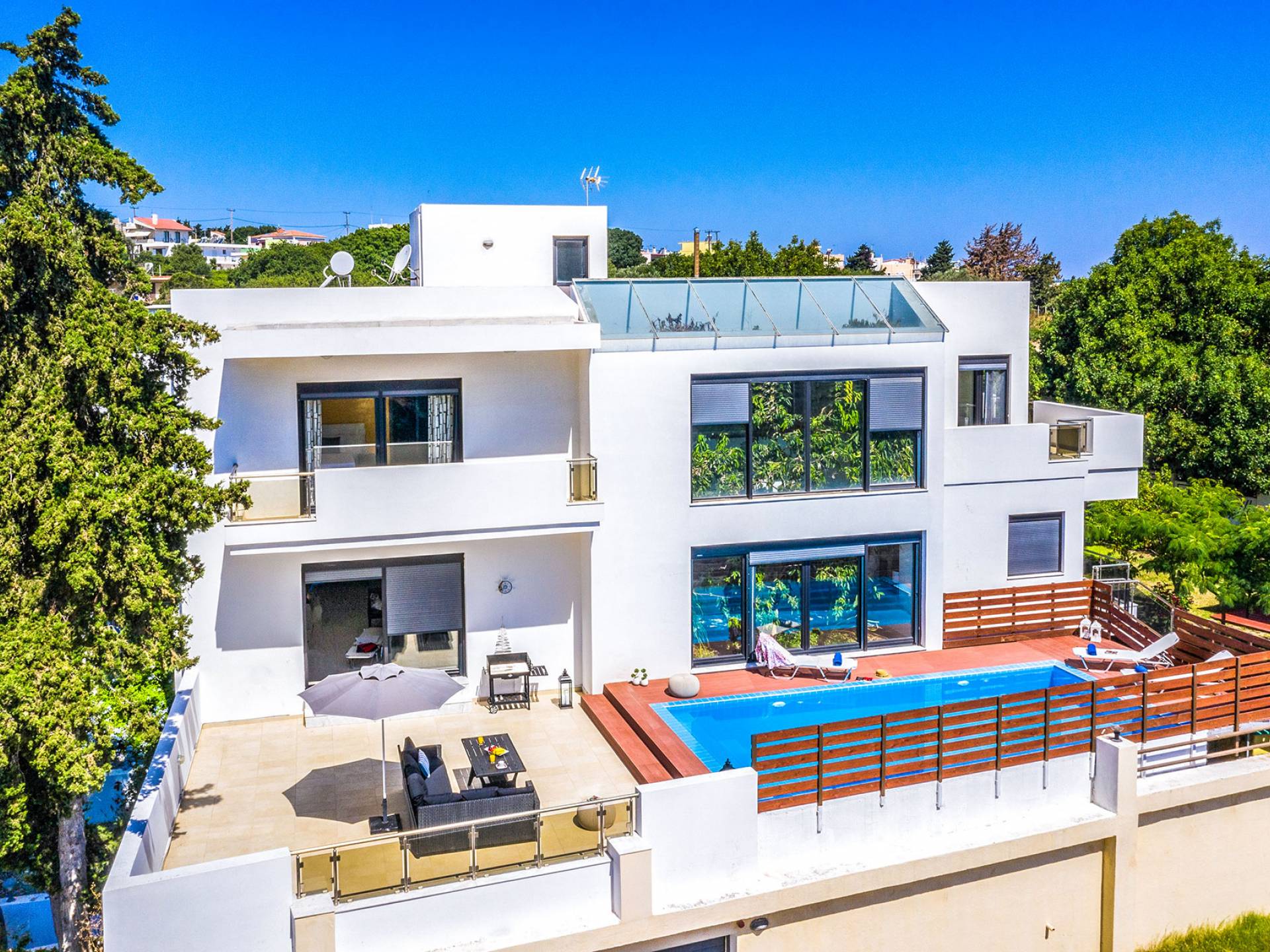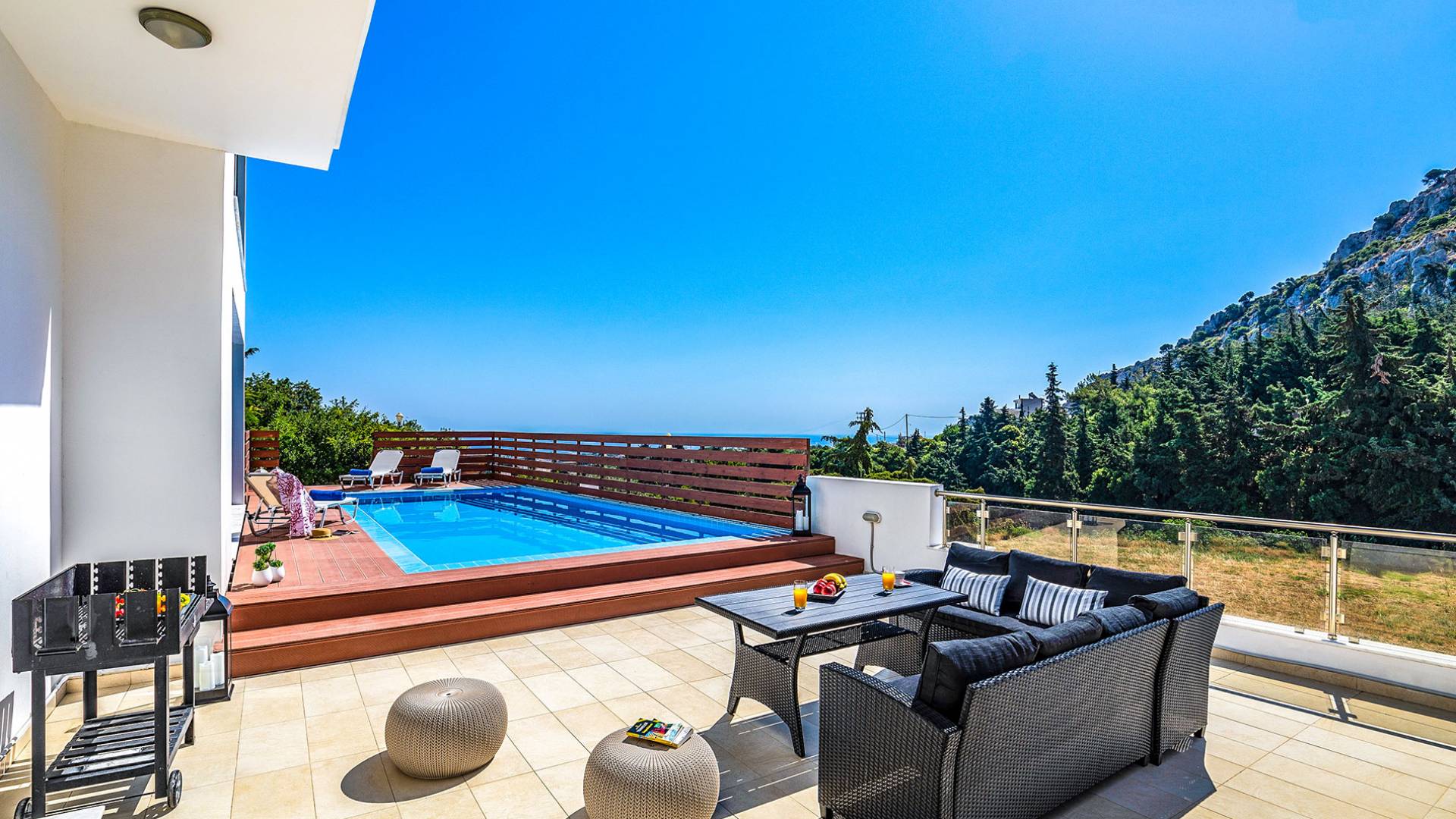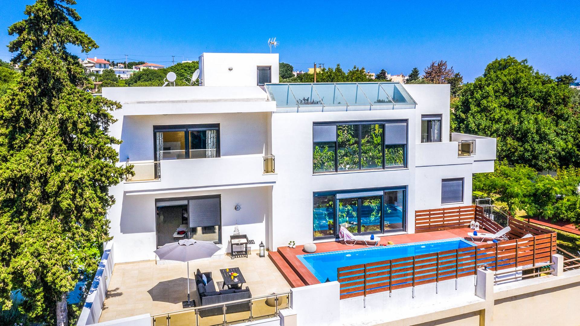 La villa è altrettanto imponente e offre ampi giardini ben curati con un'area piscina attrezzata con ombrelloni e lettini, che creano l'ambiente perfetto per un momento di relax sotto i raggi dorati del sole greco. La casa dispone inoltre di ampie verande sia al piano terra che al primo piano con splendida vista sulla zona circostante, ideali per rilassarsi al mattino o alla sera. La villa offre anche un barbecue completamente attrezzato con un'area salotto in giardino, dove gli ospiti possono vivere un'esperienza culinaria all'aperto davvero unica.
