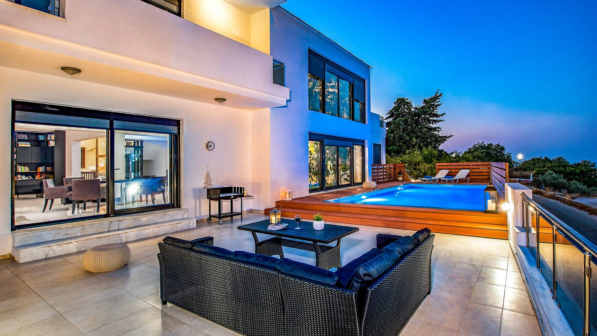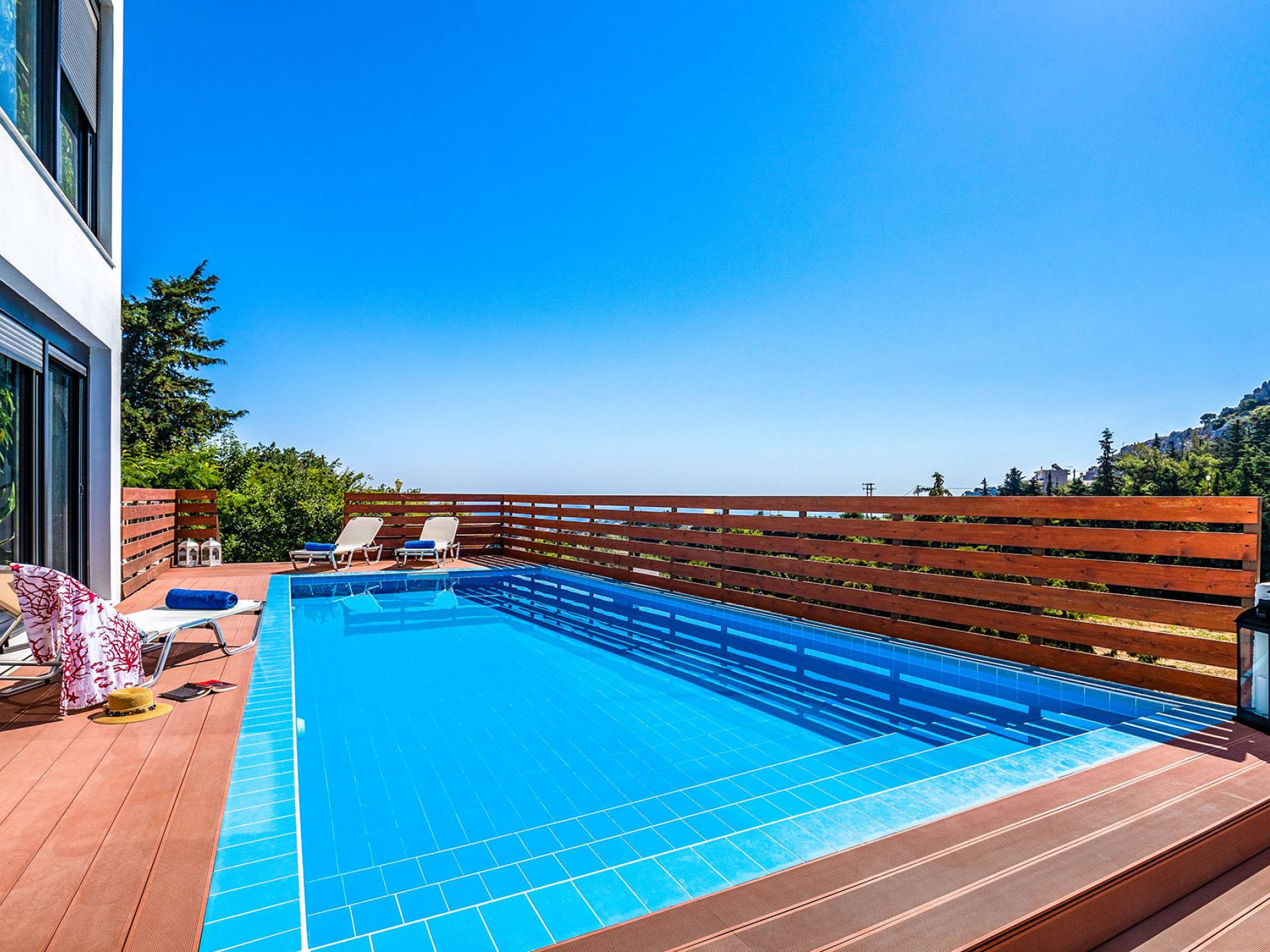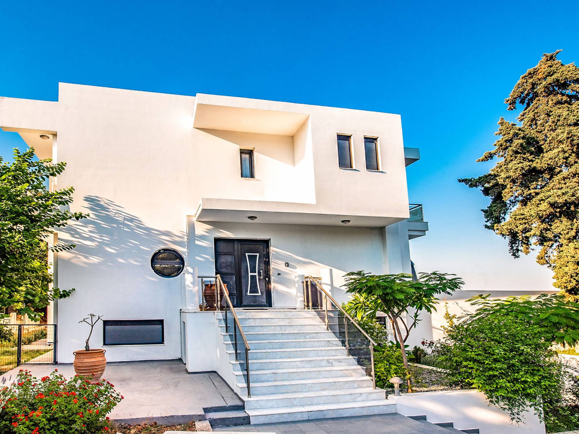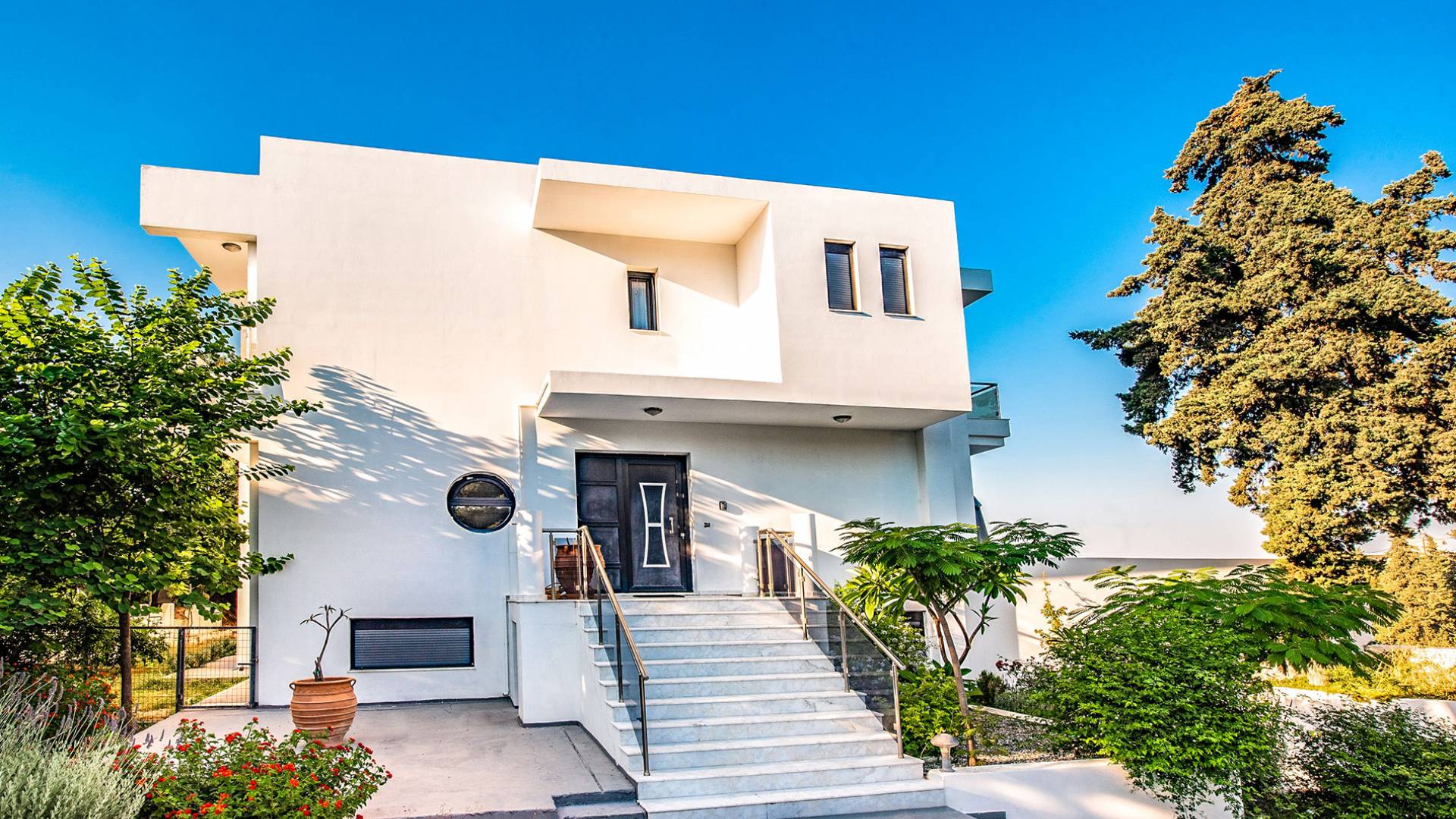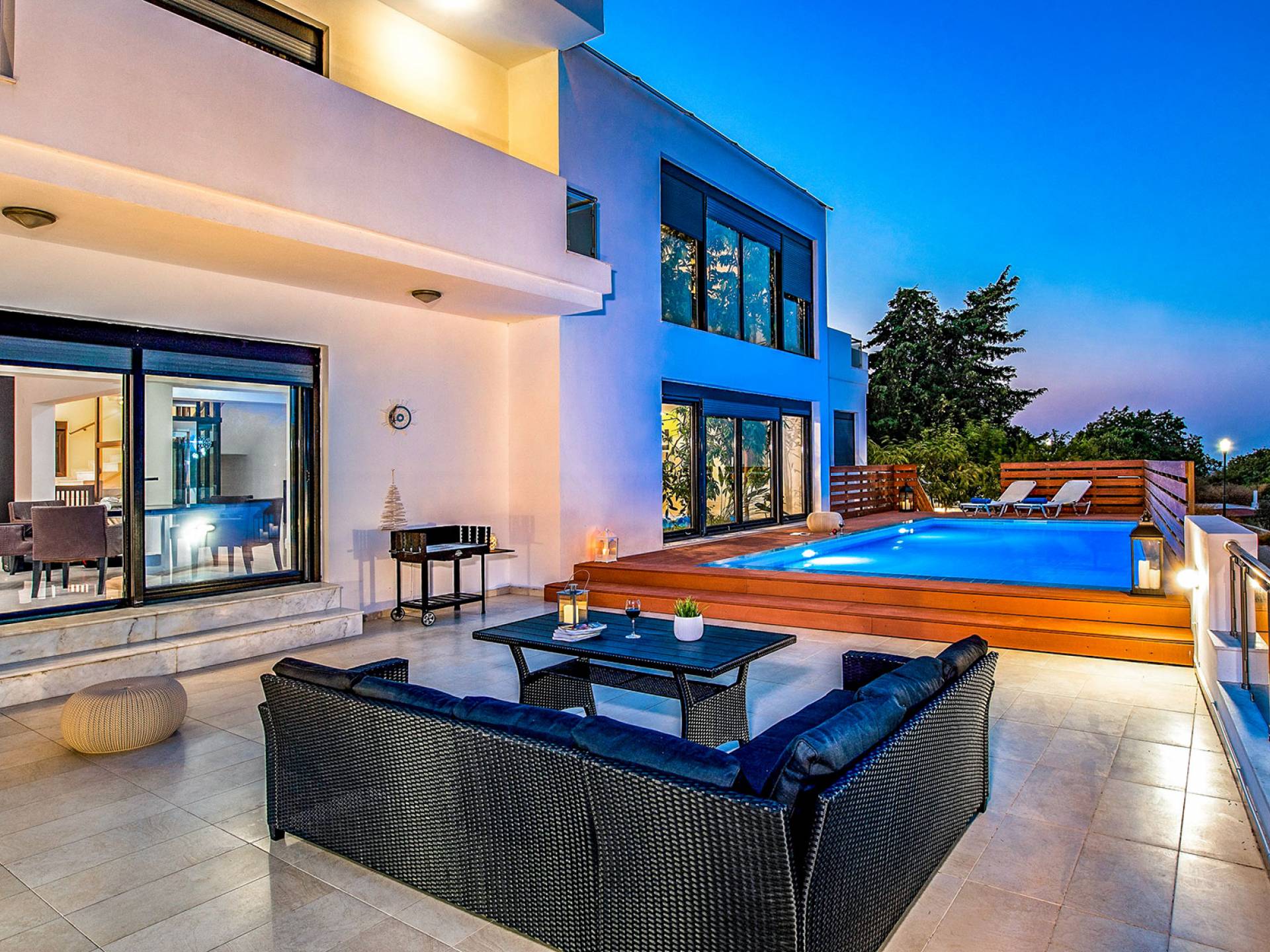 La villa è altrettanto imponente e offre ampi giardini ben curati con un'area piscina attrezzata con ombrelloni e lettini, che creano l'ambiente perfetto per un momento di relax sotto i raggi dorati del sole greco. La casa dispone inoltre di ampie verande sia al piano terra che al primo piano con splendida vista sulla zona circostante, ideali per rilassarsi al mattino o alla sera. La villa offre anche un barbecue completamente attrezzato con un'area salotto in giardino, dove gli ospiti possono vivere un'esperienza culinaria all'aperto davvero unica.