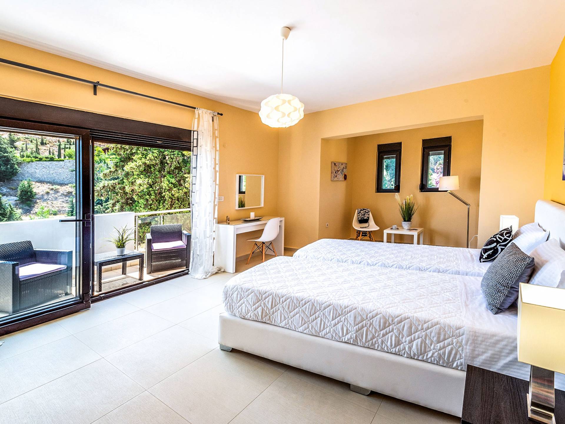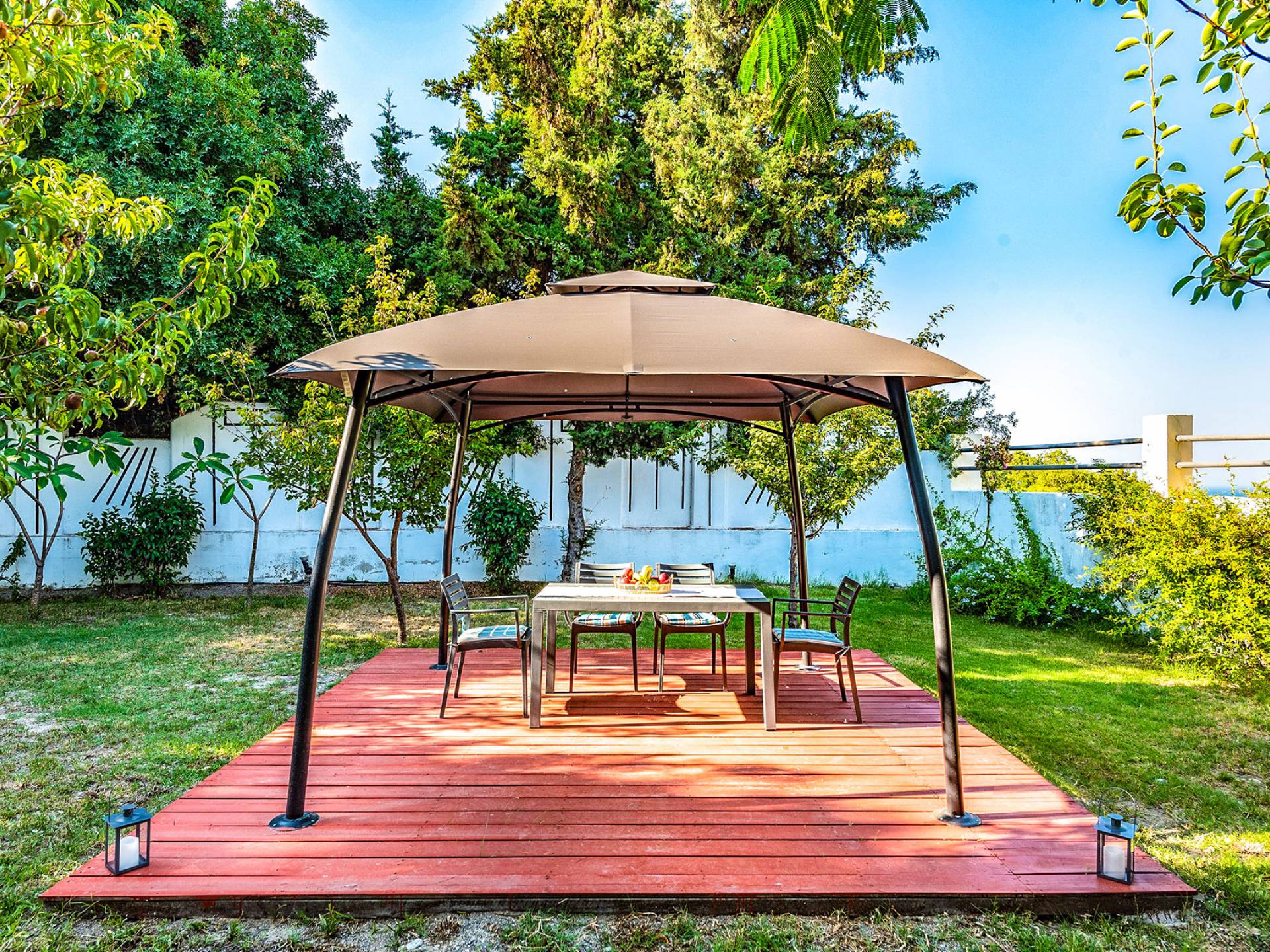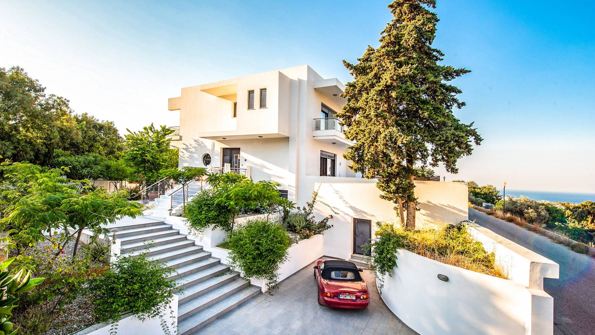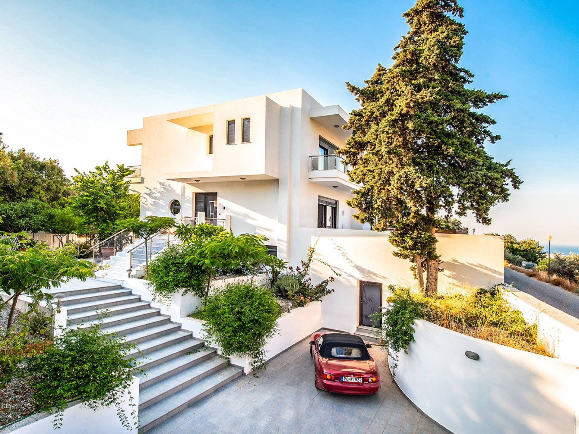 La villa è altrettanto imponente e offre ampi giardini ben curati con un'area piscina attrezzata con ombrelloni e lettini, che creano l'ambiente perfetto per un momento di relax sotto i raggi dorati del sole greco. La casa dispone inoltre di ampie verande sia al piano terra che al primo piano con splendida vista sulla zona circostante, ideali per rilassarsi al mattino o alla sera. La villa offre anche un barbecue completamente attrezzato con un'area salotto in giardino, dove gli ospiti possono vivere un'esperienza culinaria all'aperto davvero unica.