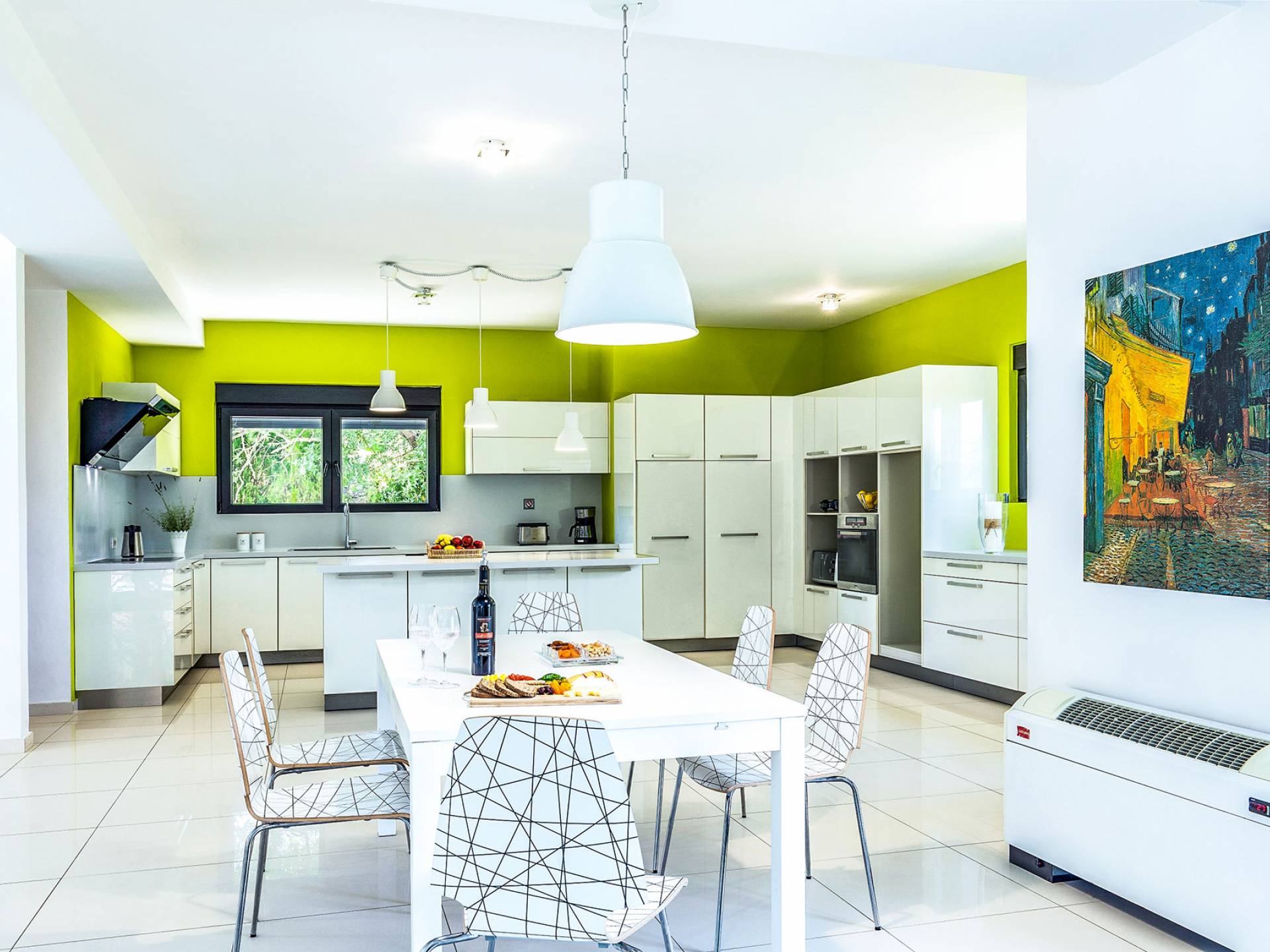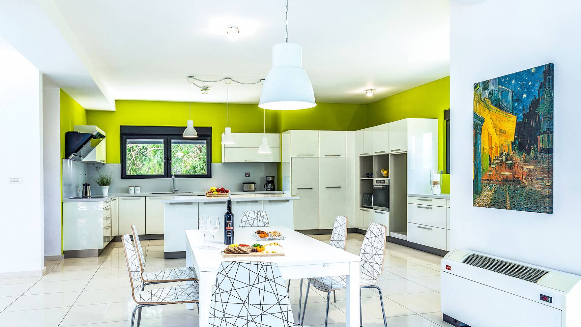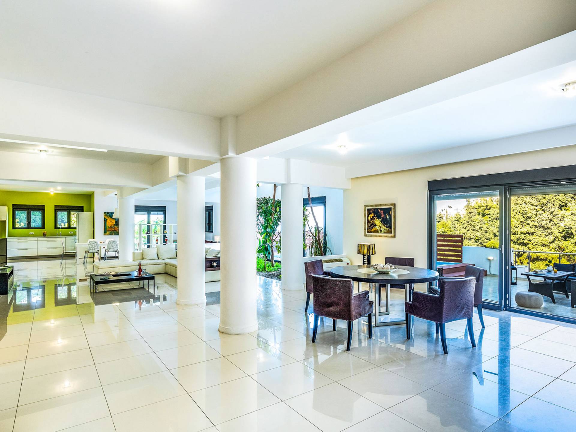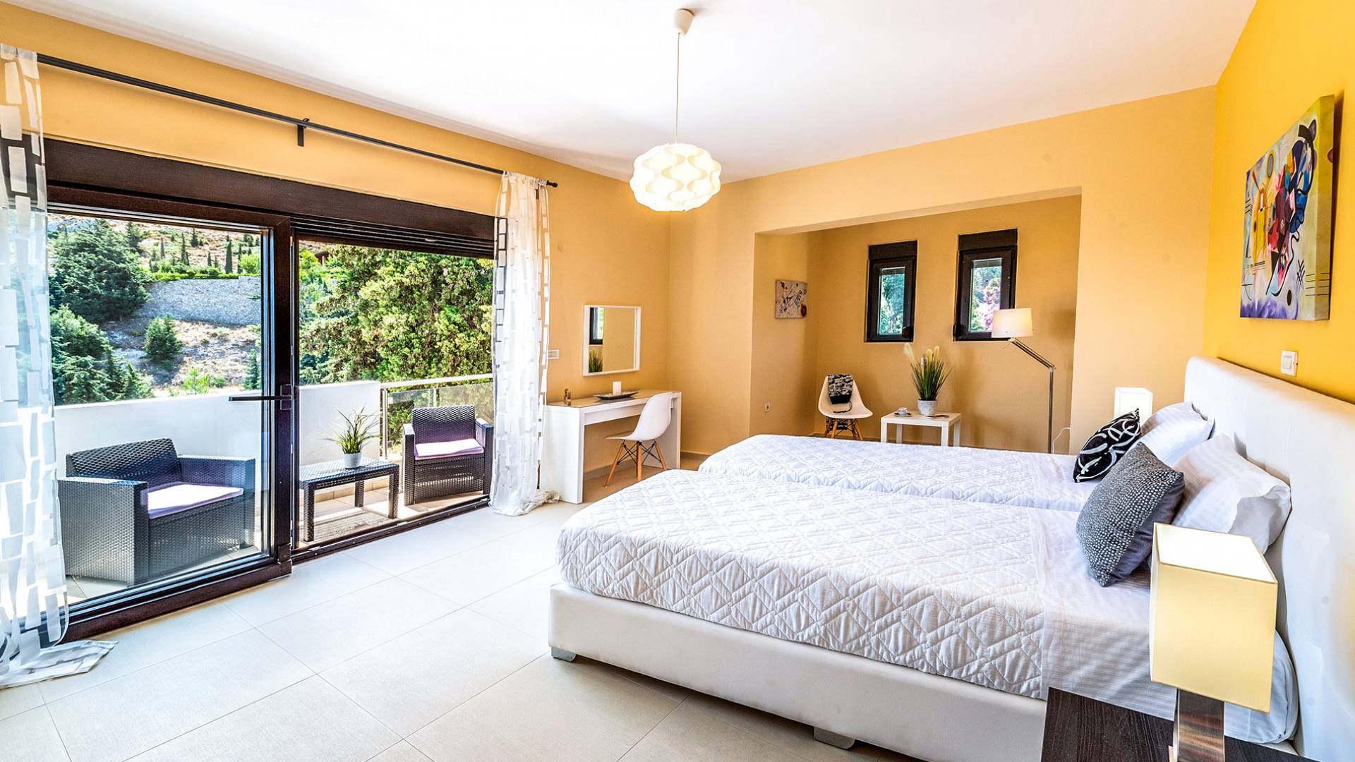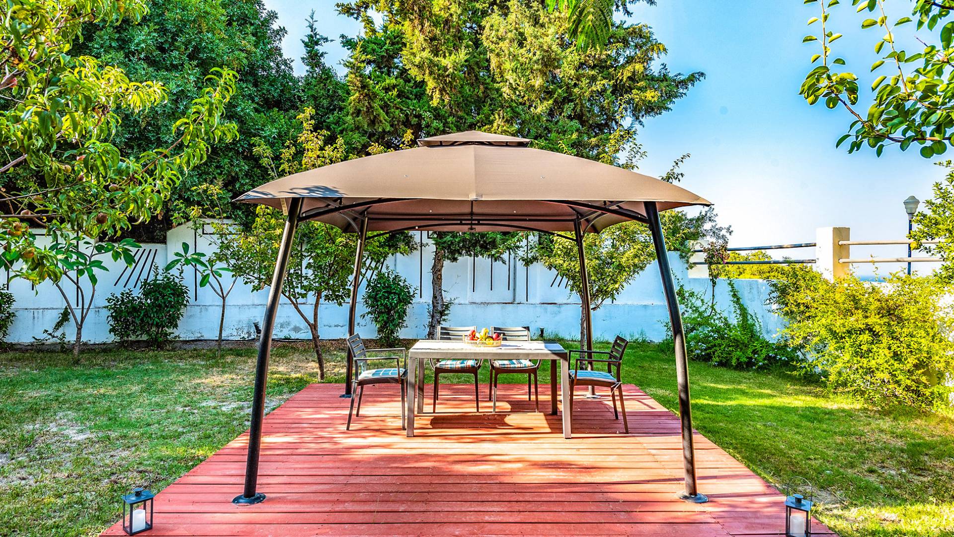 La villa è altrettanto imponente e offre ampi giardini ben curati con un'area piscina attrezzata con ombrelloni e lettini, che creano l'ambiente perfetto per un momento di relax sotto i raggi dorati del sole greco. La casa dispone inoltre di ampie verande sia al piano terra che al primo piano con splendida vista sulla zona circostante, ideali per rilassarsi al mattino o alla sera. La villa offre anche un barbecue completamente attrezzato con un'area salotto in giardino, dove gli ospiti possono vivere un'esperienza culinaria all'aperto davvero unica.