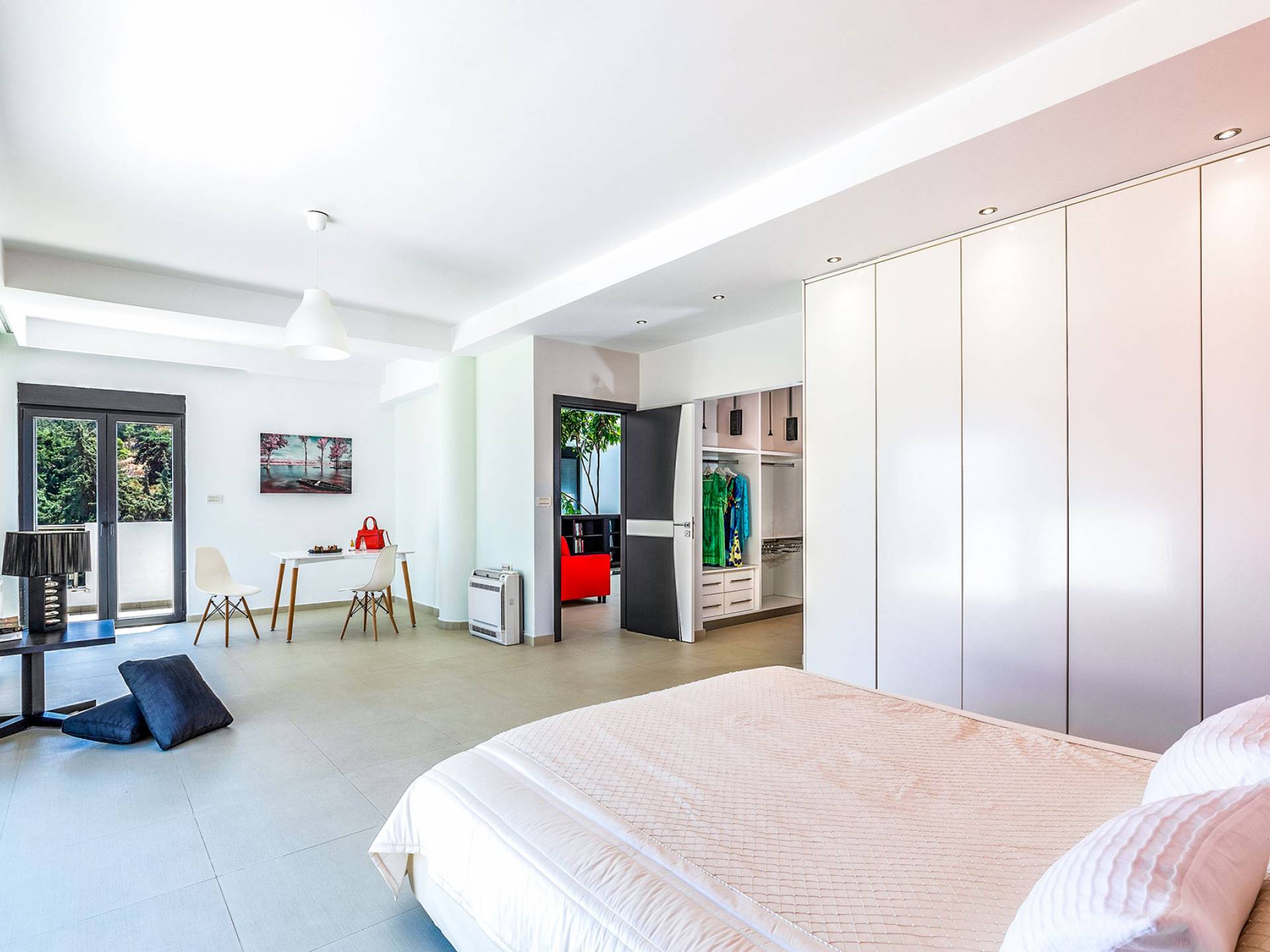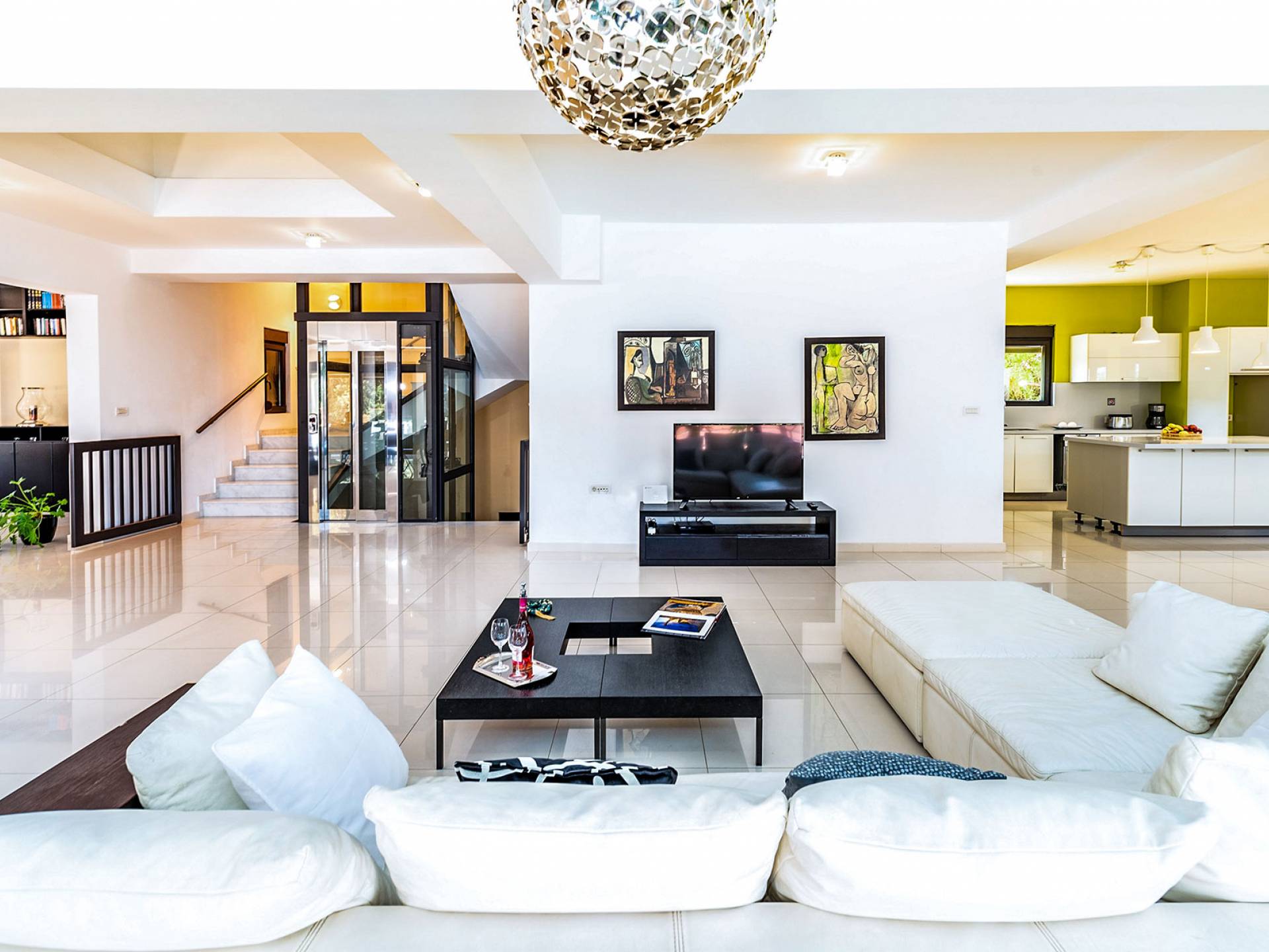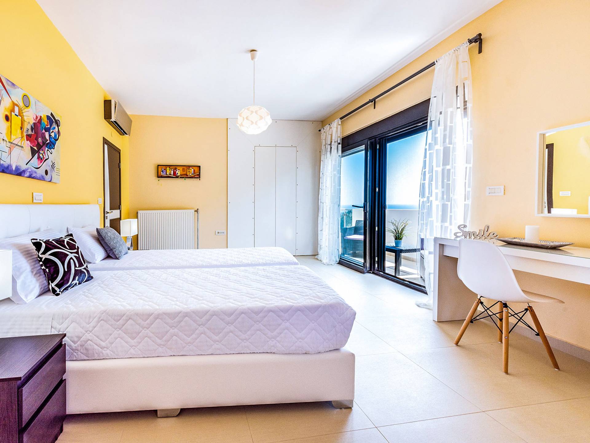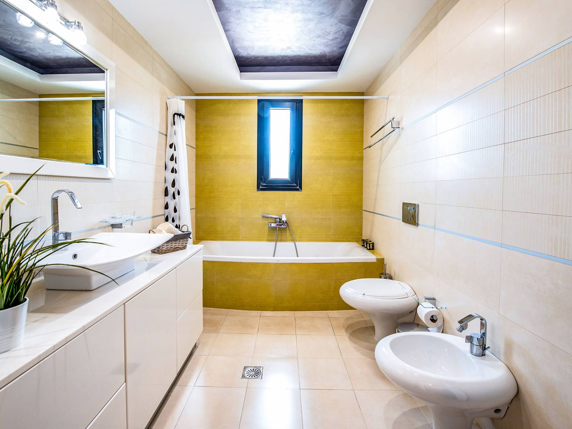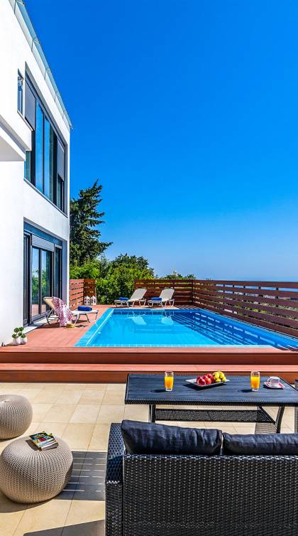 La villa offre camere spaziose e lussuose che si aprono su balconi privati e aggiungendo il divano letto matrimoniale può ospitare fino a 8 persone. Dispone inoltre di una cucina funzionale, completamente attrezzata con elettrodomestici moderni, una confortevole zona pranzo, un soggiorno a pianta aperta, un centro di intrattenimento con una grande TV a schermo piatto, un'elegante sala studio con biblioteca e ampi bagni con idromassaggio. La casa è progettata per offrire un soggiorno confortevole agli ospiti con tutto il necessario per farli sentire a casa. Ci sono molti servizi e caratteristiche come aria condizionata in tutti i due piani, connessione internet ad alta velocità, lavatrice e ferro da stiro, asciugacapelli, cassetta di sicurezza, ascensore, ampie verande arredate con vista mare, parcheggio privato, piscina e Attrezzature per il barbecue.
