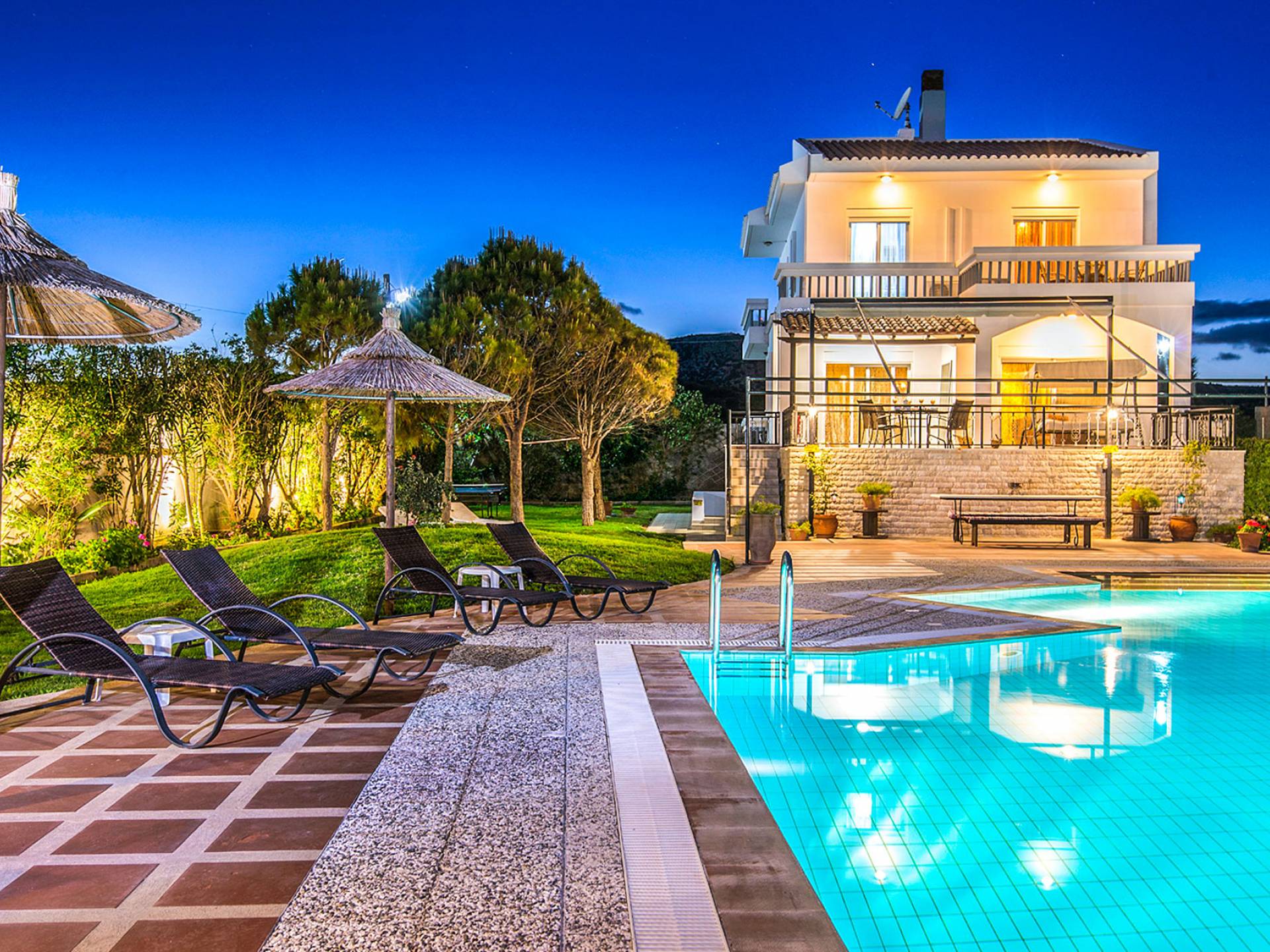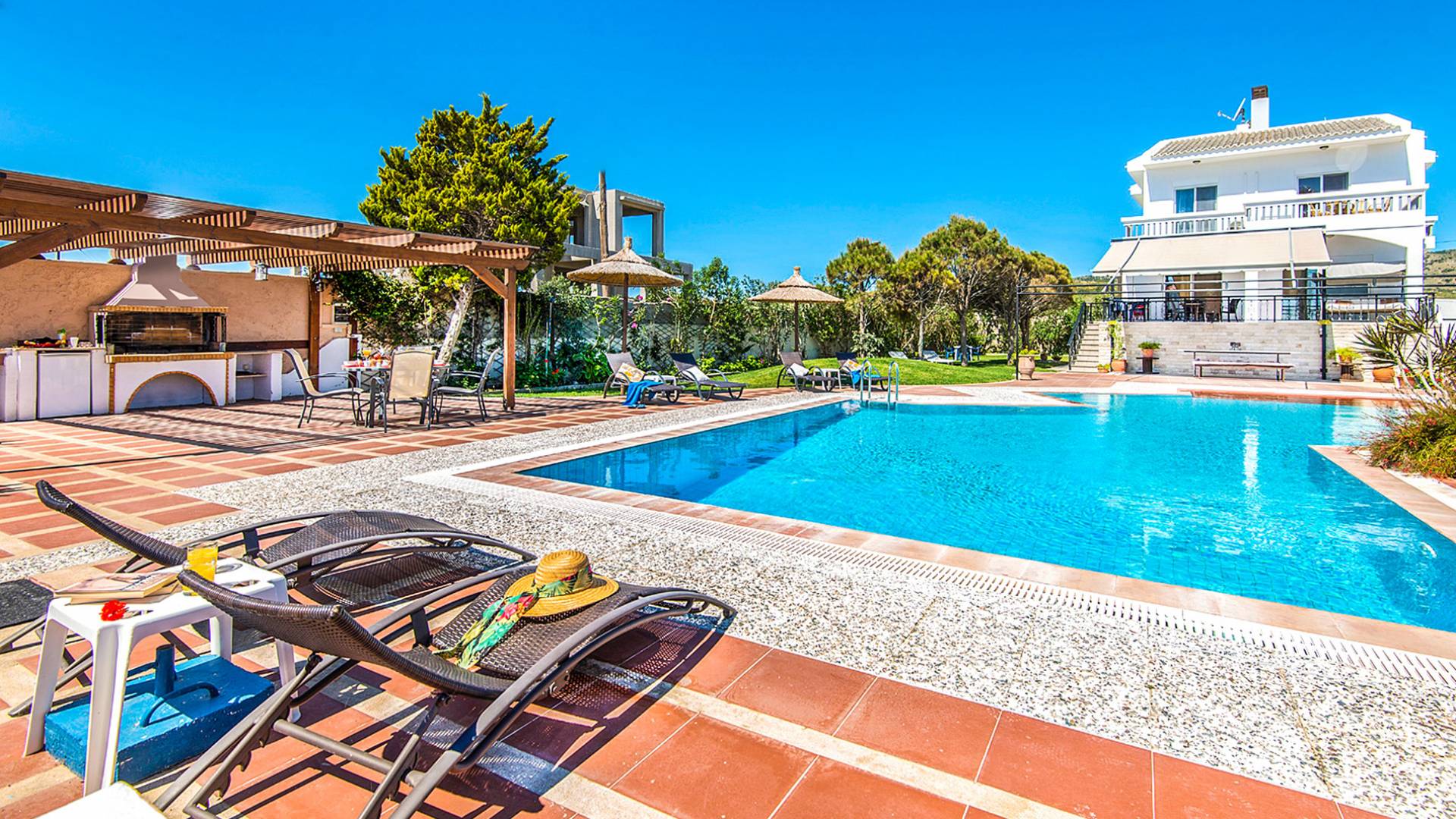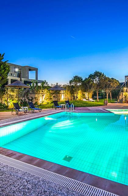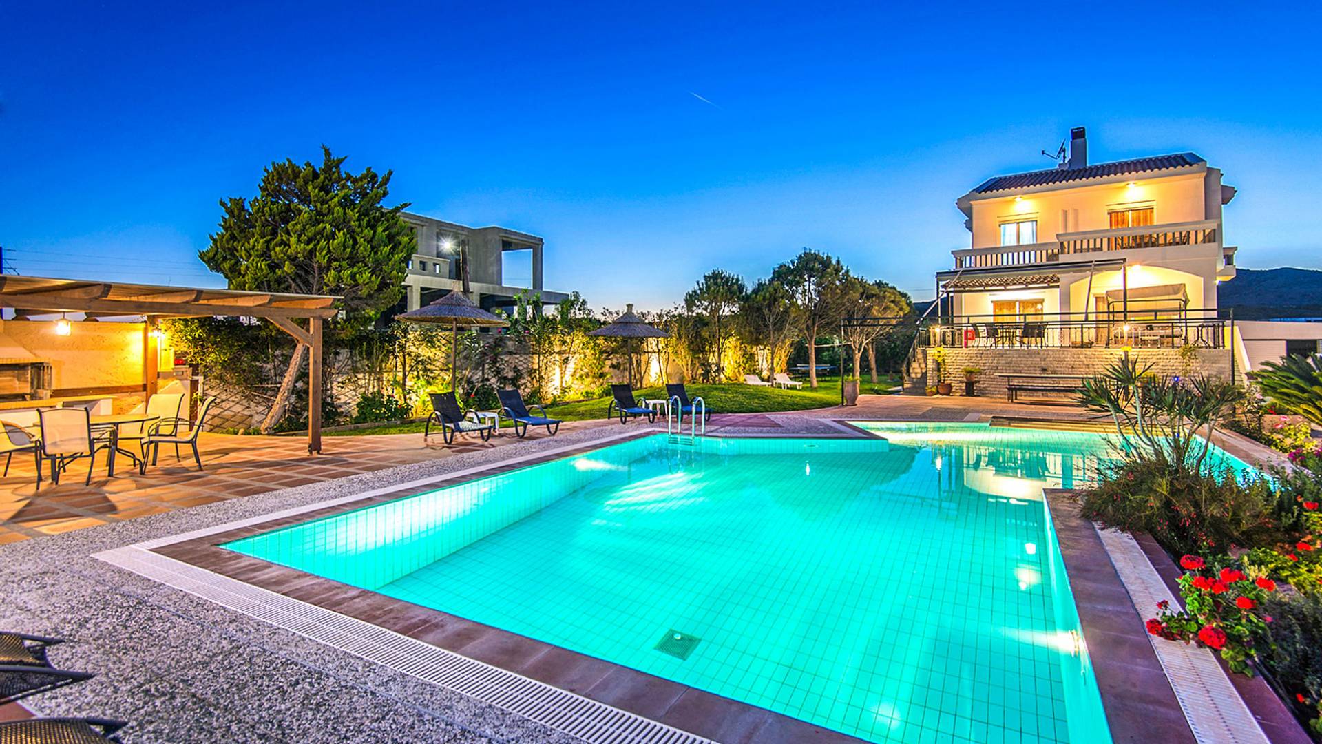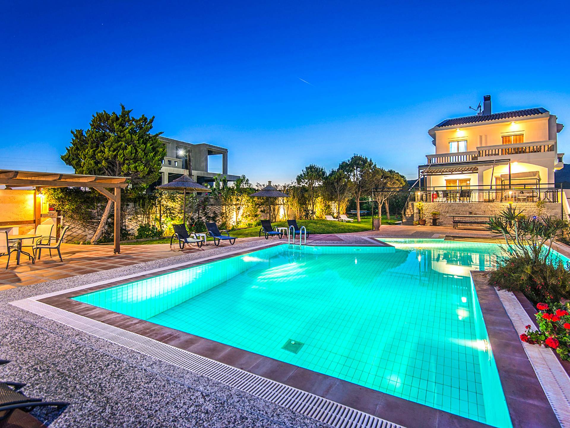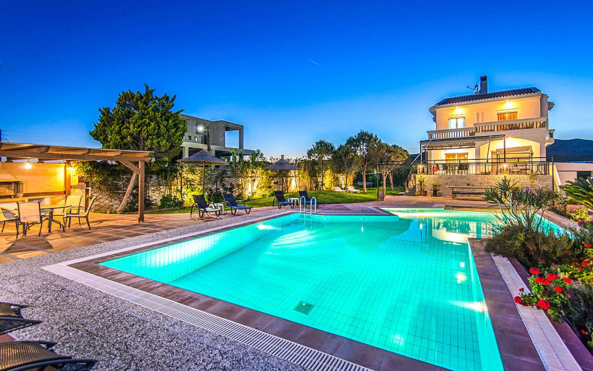 I 1,5 acri di terreno privato sono pieni di varietà di alberi mediterranei, erba, cespugli e fiori che essenzialmente formano un'oasi appartata per vacanze rinfrescanti e romantiche. Sono inoltre forniti mobili da esterno moderni e lettini per godere della vista del Mar Egeo e dell'ambiente sereno della vostra enorme piscina privata. Sono inoltre disponibili il Barbecue con il chiosco attrezzato per cene indimenticabili sotto il cielo limpido.
