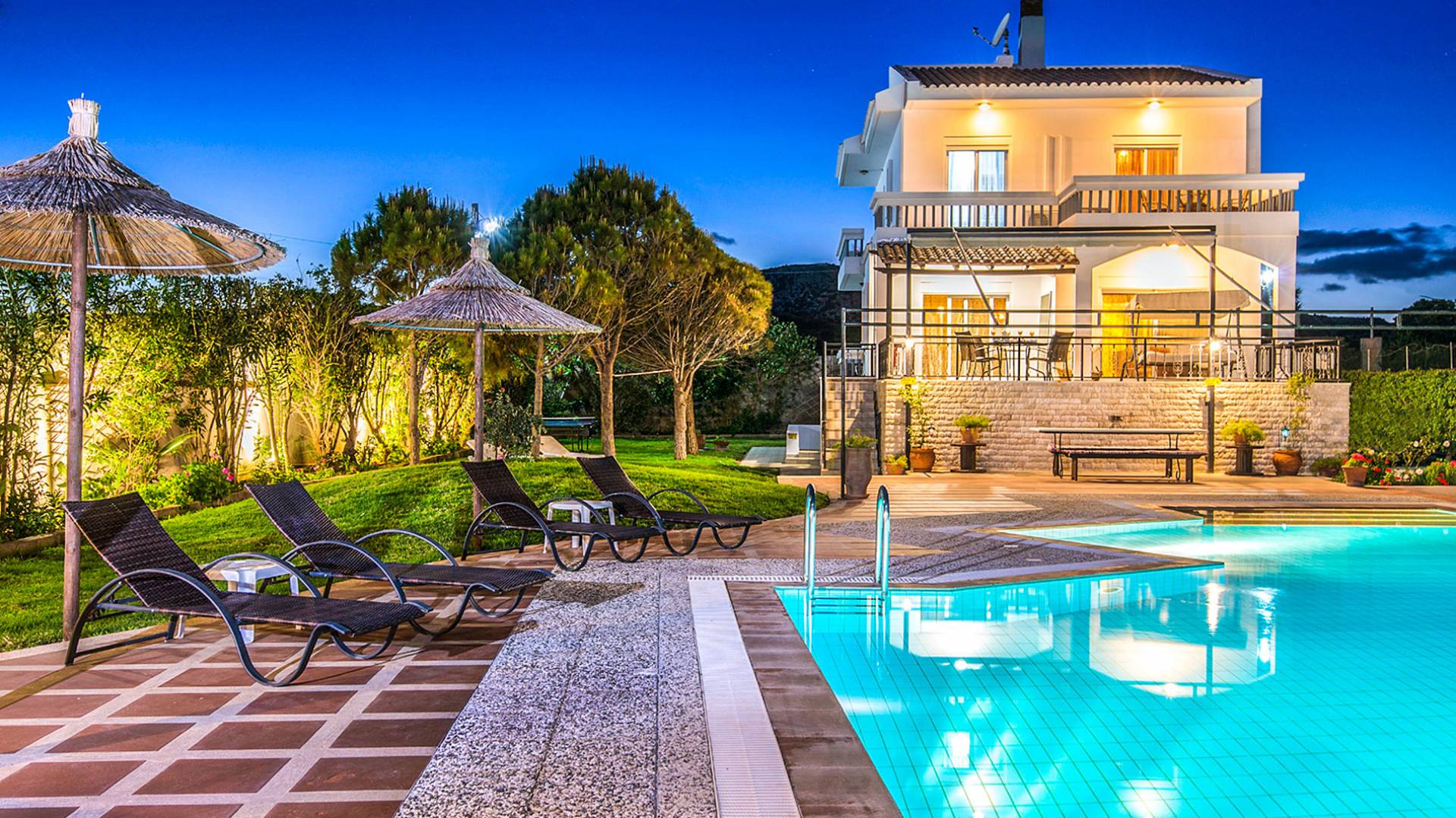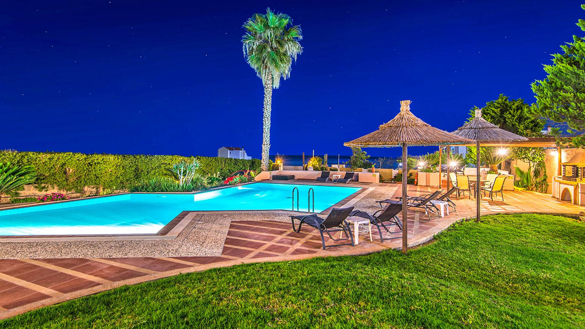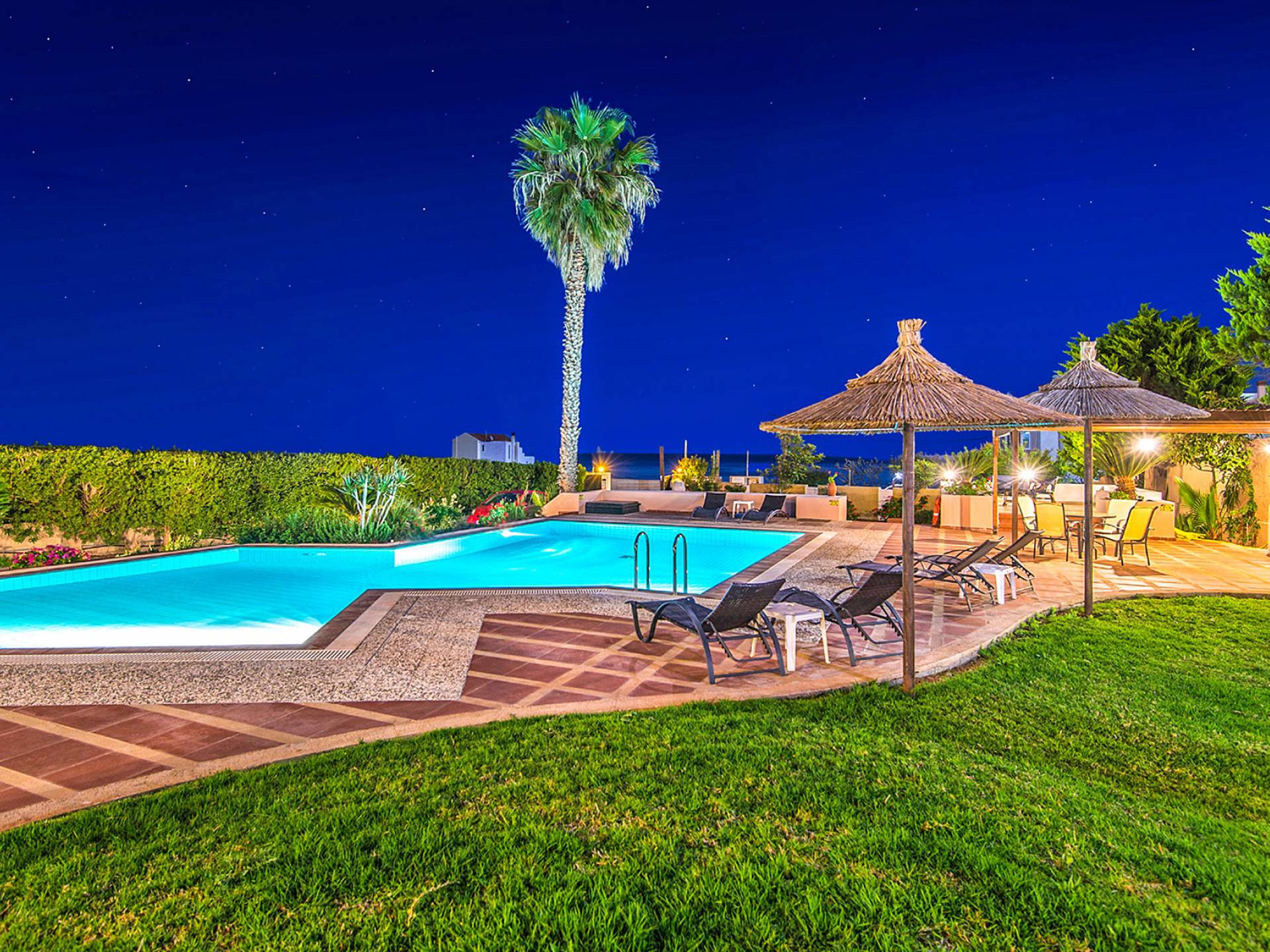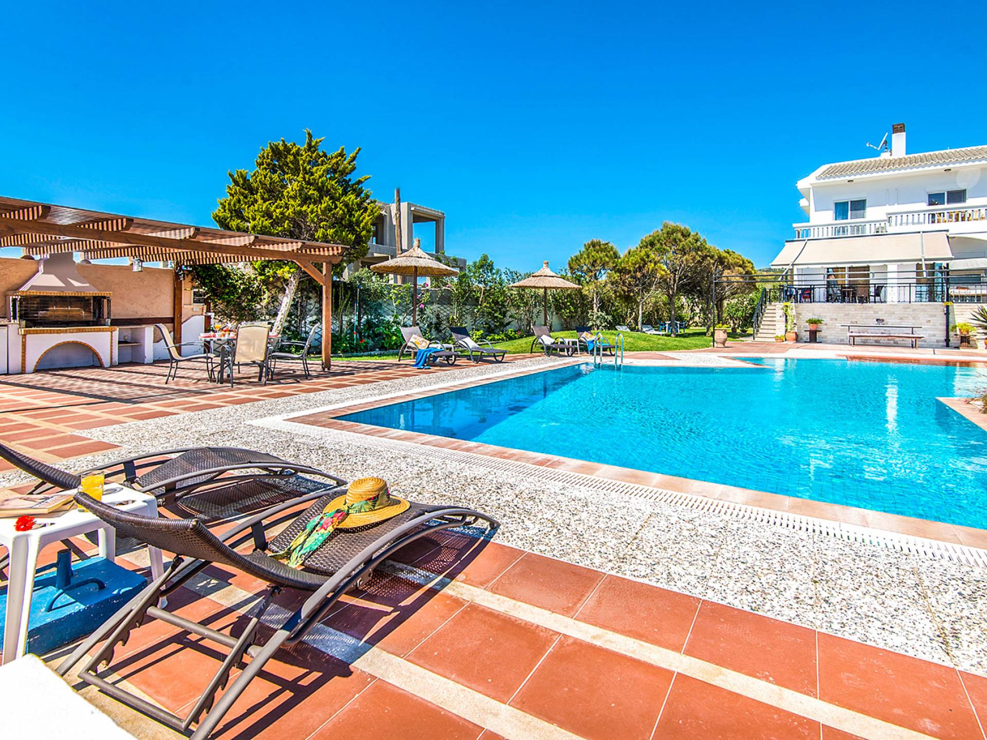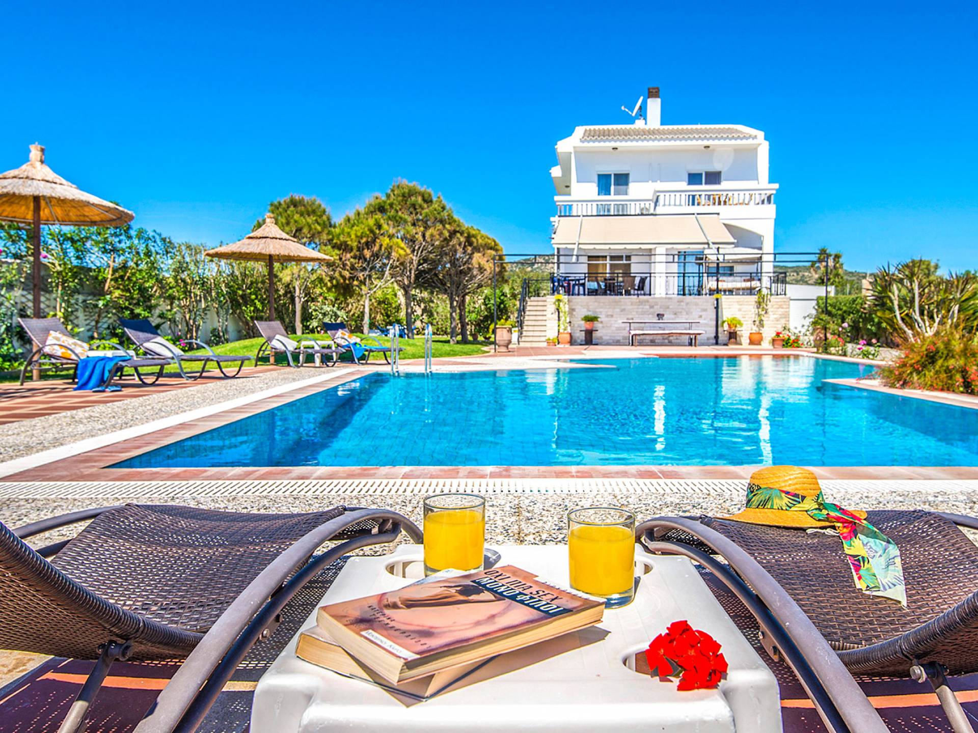 I 1,5 acri di terreno privato sono pieni di varietà di alberi mediterranei, erba, cespugli e fiori che essenzialmente formano un'oasi appartata per vacanze rinfrescanti e romantiche. Sono inoltre forniti mobili da esterno moderni e lettini per godere della vista del Mar Egeo e dell'ambiente sereno della vostra enorme piscina privata. Sono inoltre disponibili il Barbecue con il chiosco attrezzato per cene indimenticabili sotto il cielo limpido.