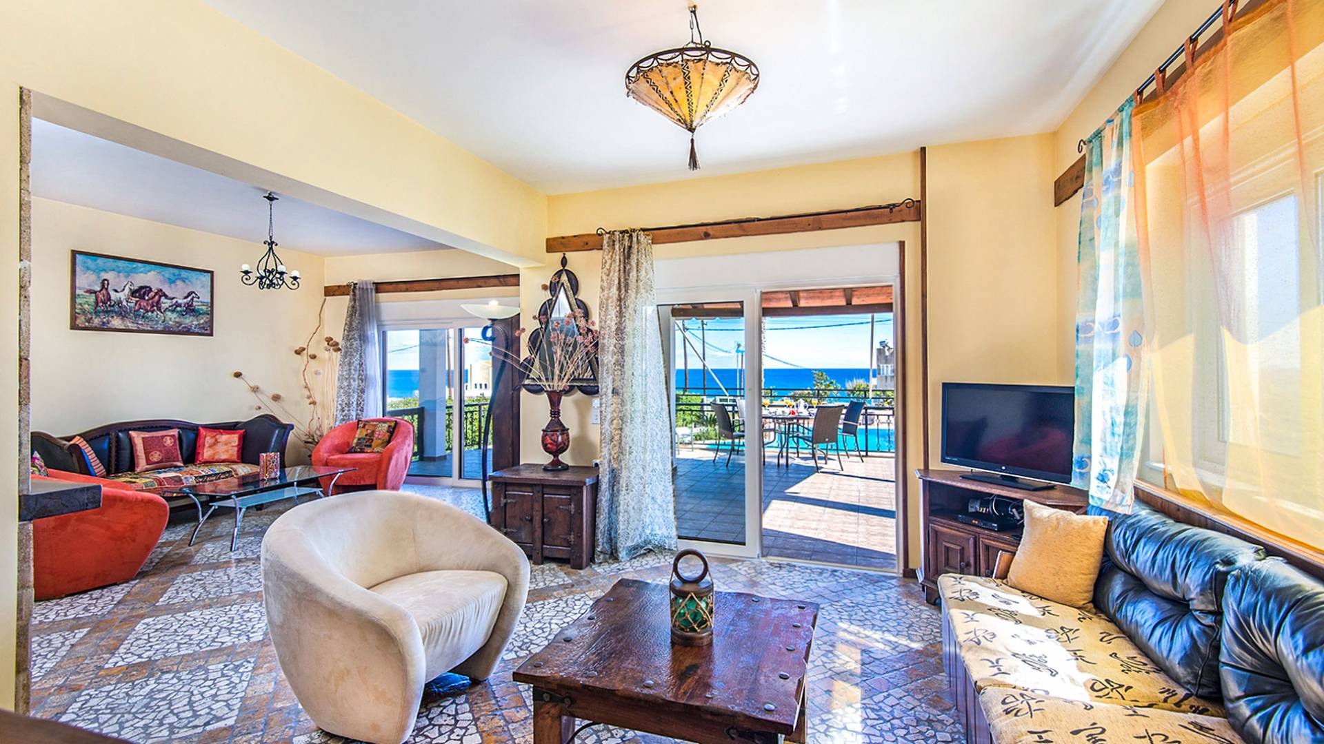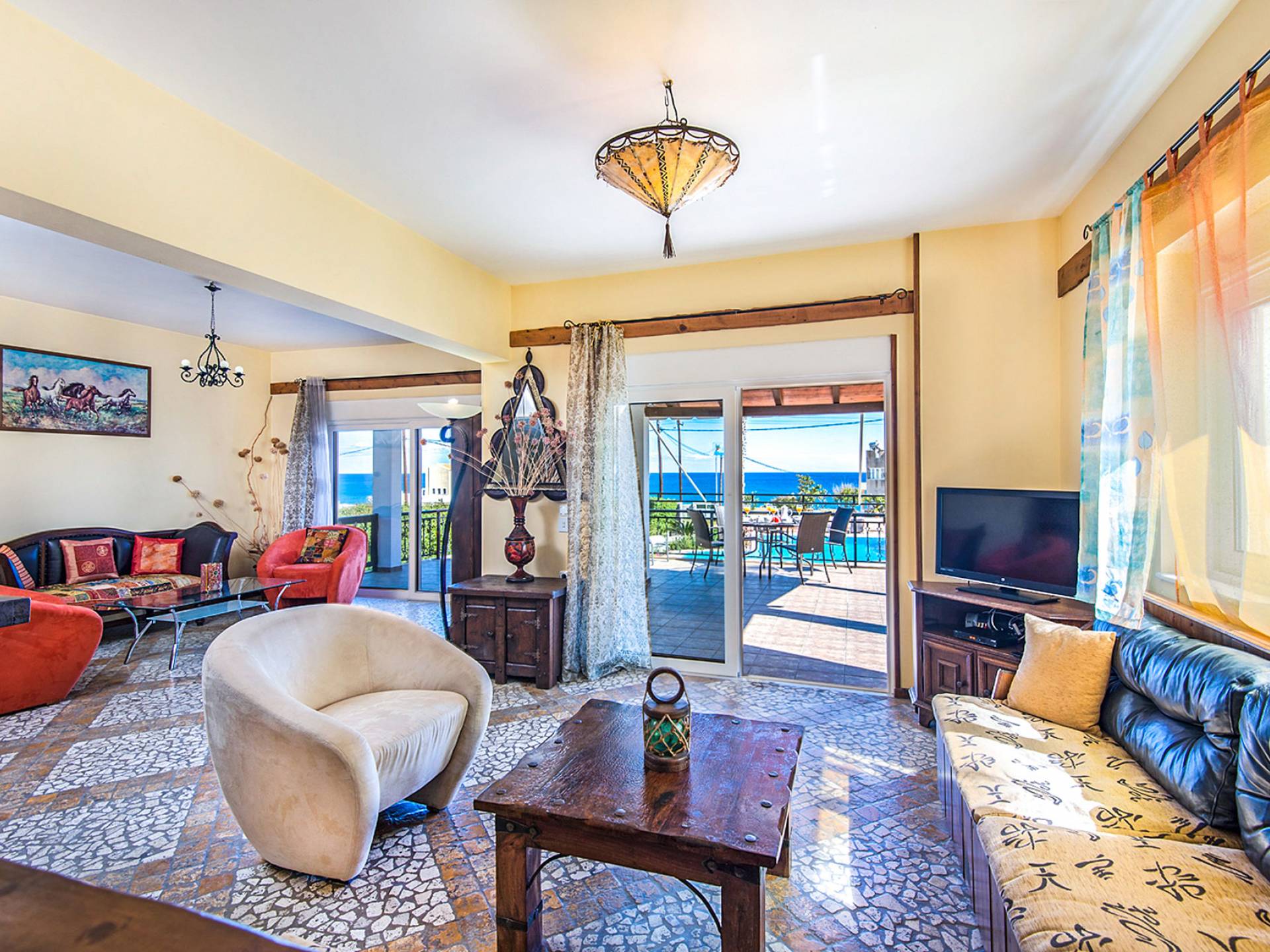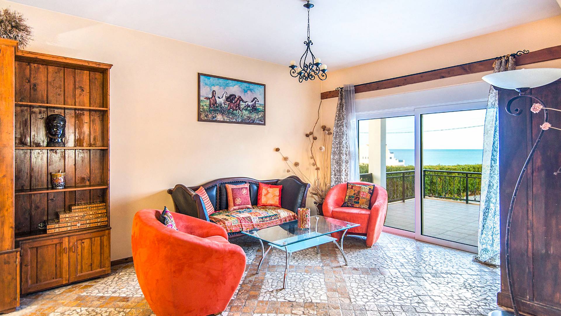 C'è un soggiorno spazioso e climatizzato (40 mq). La zona pranzo e il centro di intrattenimento costituiscono la cornice per momenti di relax di qualità intorno al camino, mentre all'esterno la veranda rialzata attrezzata con mobili da salotto e un'accattivante vista panoramica di 225 gradi sull'Egeo, vi lascerà senza fiato! I mobili eleganti e moderni forniranno il massimo senso di comfort. La cucina è completamente attrezzata con tutti i tipi di elettrodomestici, pronta a soddisfare gli ospiti più esigenti.