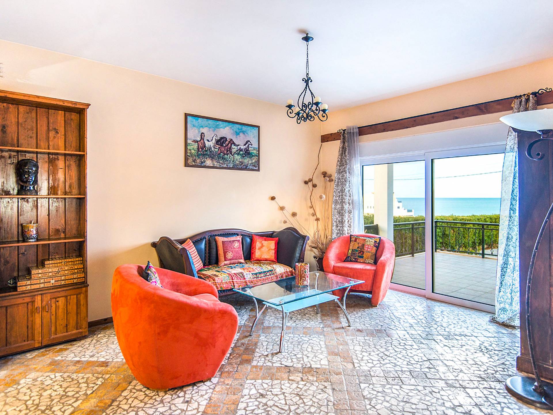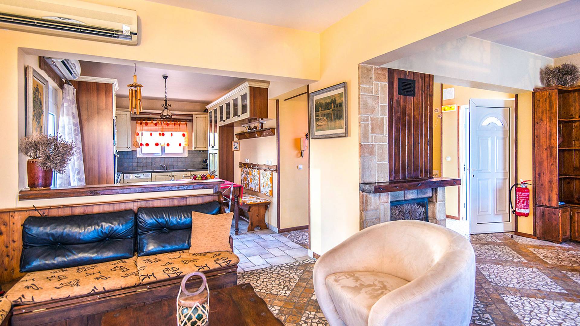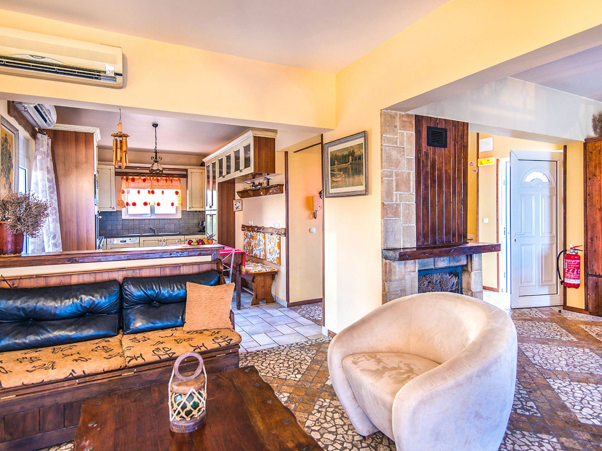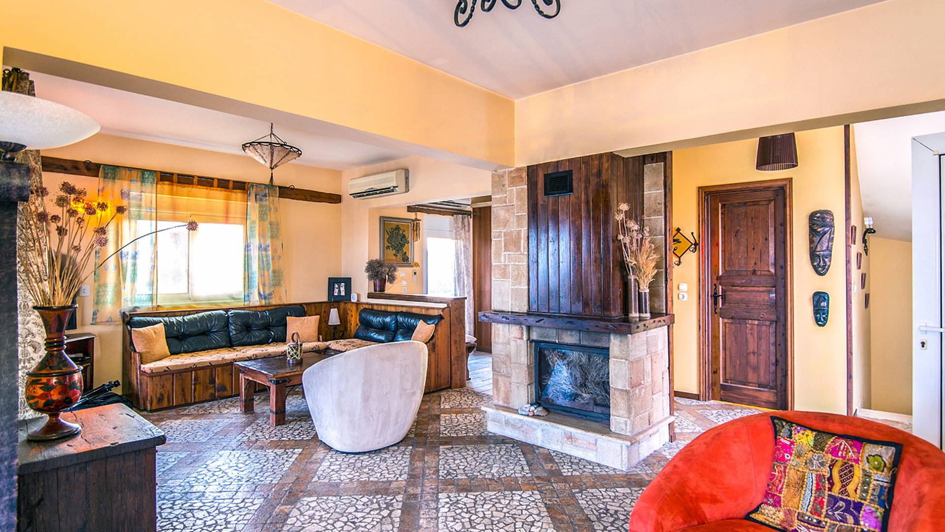 C'è un soggiorno spazioso e climatizzato (40 mq). La zona pranzo e il centro di intrattenimento costituiscono la cornice per momenti di relax di qualità intorno al camino, mentre all'esterno la veranda rialzata attrezzata con mobili da salotto e un'accattivante vista panoramica di 225 gradi sull'Egeo, vi lascerà senza fiato! I mobili eleganti e moderni forniranno il massimo senso di comfort. La cucina è completamente attrezzata con tutti i tipi di elettrodomestici, pronta a soddisfare gli ospiti più esigenti.