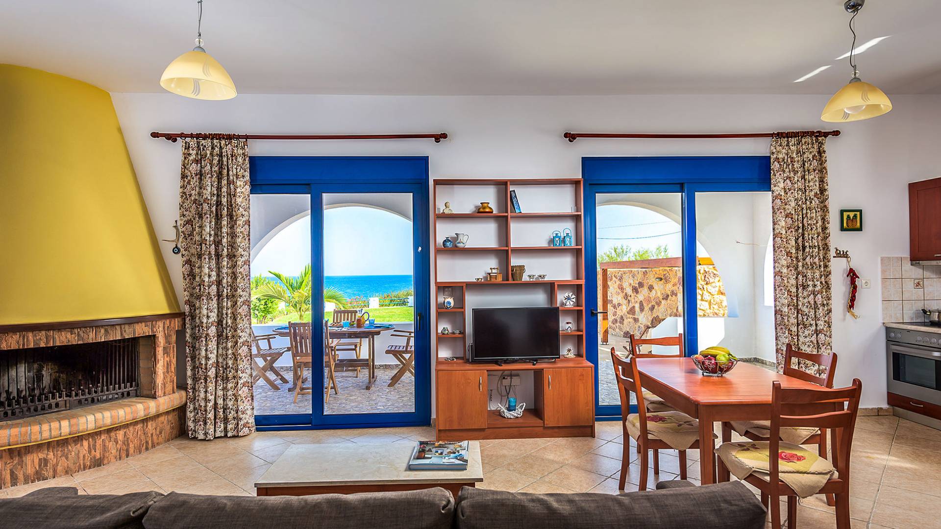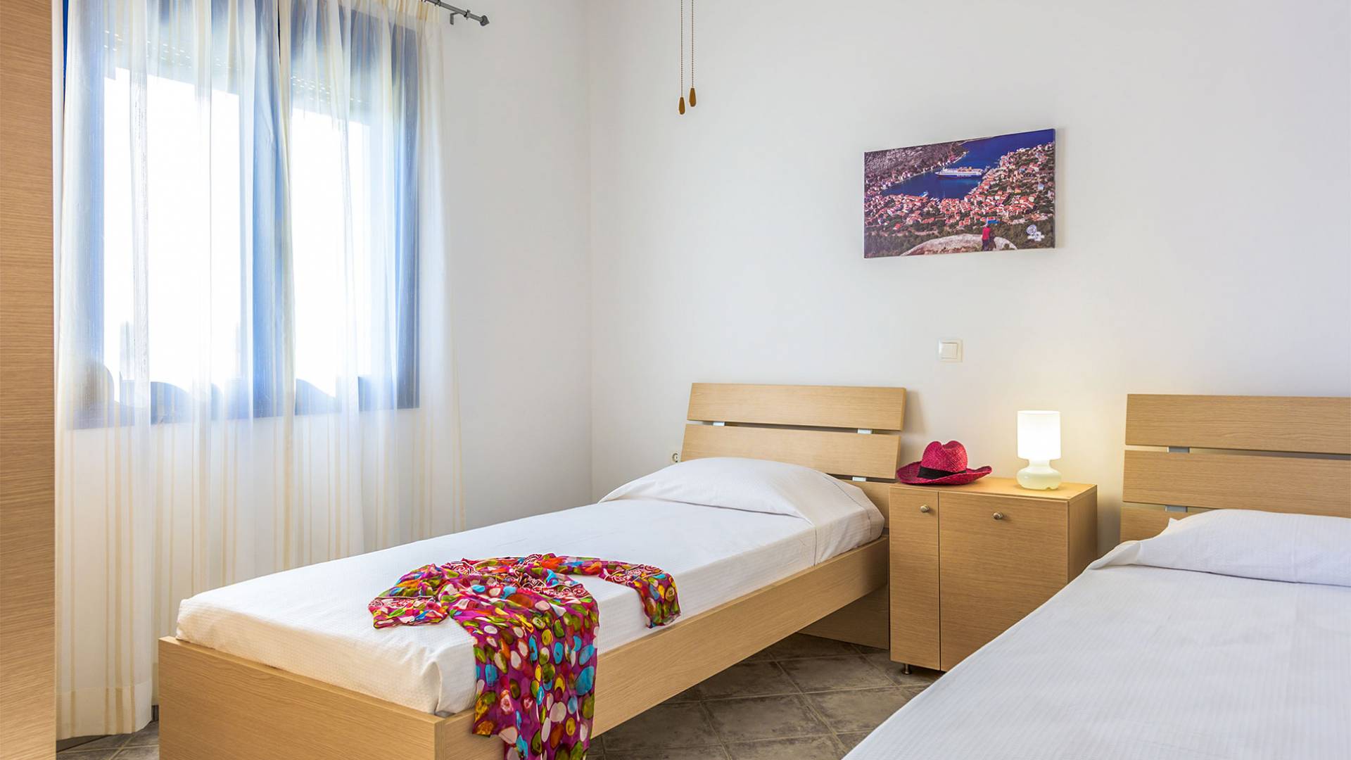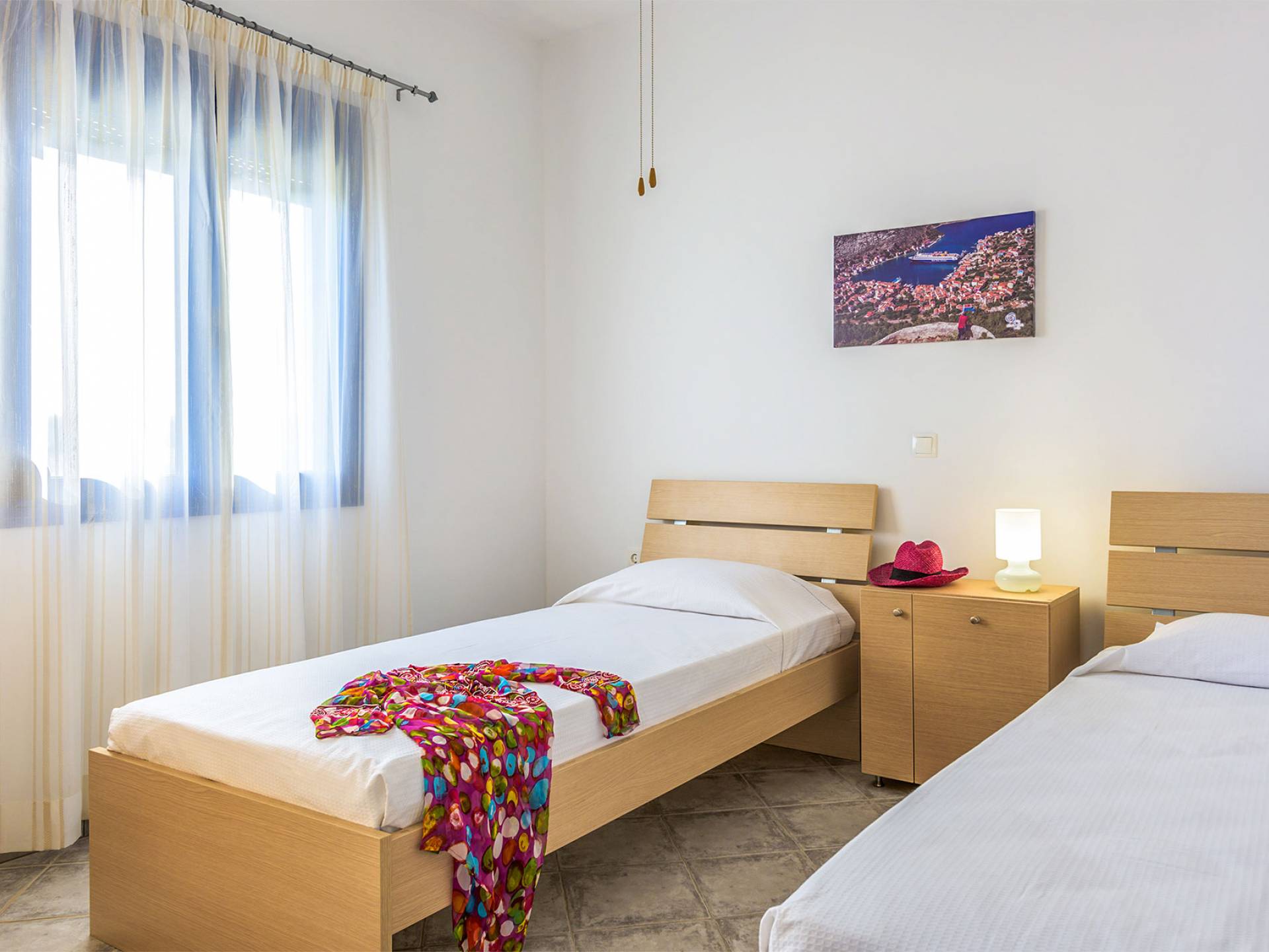 L'appartamento al piano terra è composto da 2 camere da letto climatizzate, un soggiorno con divano letto matrimoniale, comodo salottino, dotato di una grande TV a schermo piatto e canali satellitari, una cucina a pianta aperta completamente attrezzata con zona pranzo e un bagno . Il soggiorno si apre su un'ampia veranda arredata con barbecue dove è possibile rilassarsi e godere della magnifica vista del mare blu intenso e del giardino dove si trova una grande piscina privata con lettini e ombrelloni.