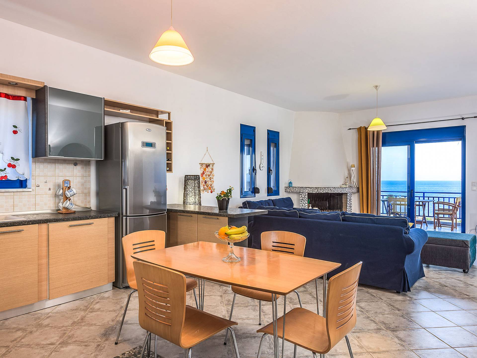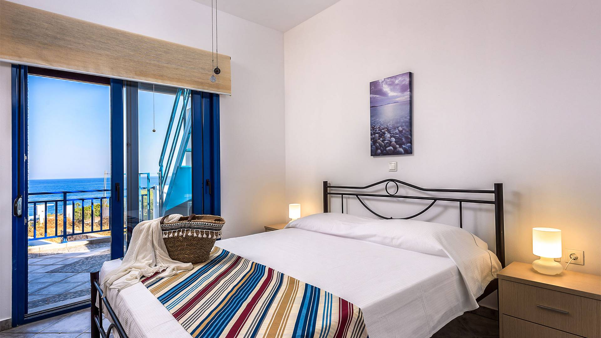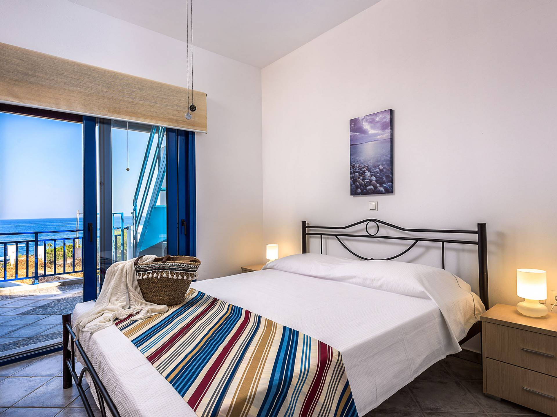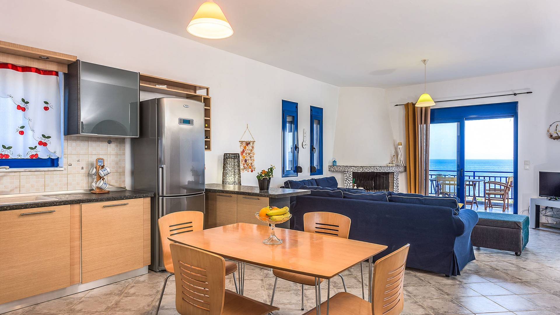 L'appartamento al piano superiore è composto da 2 camere da letto climatizzate, una cucina a pianta aperta completamente attrezzata con zona pranzo e un soggiorno che si apre su un ampio balcone con vista panoramica sul mare.