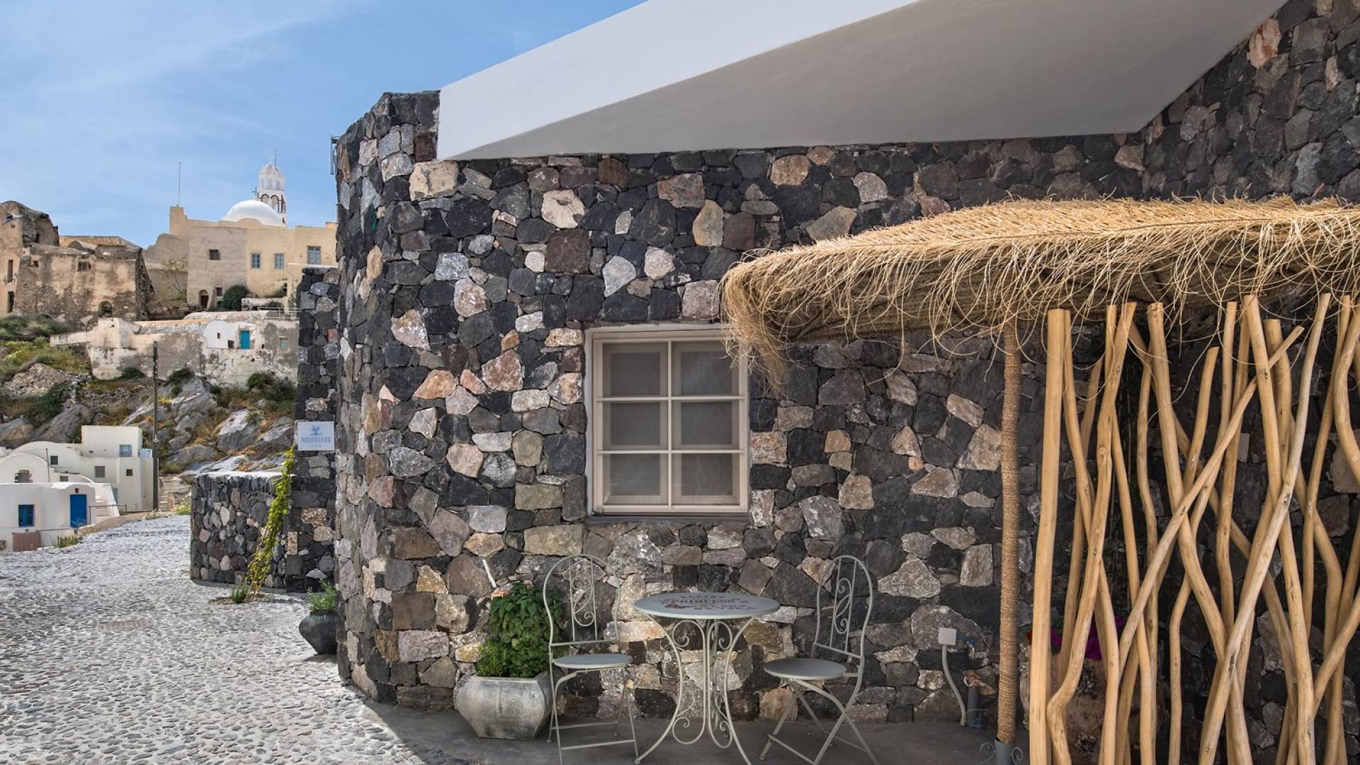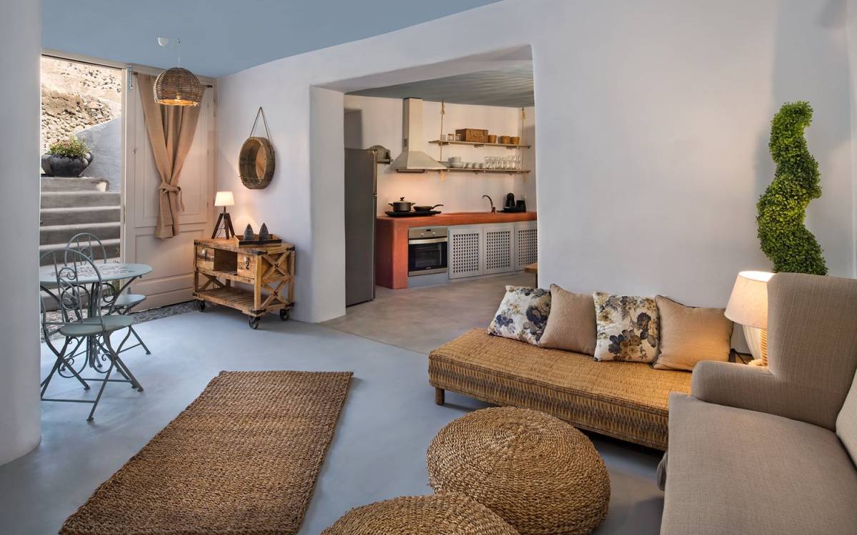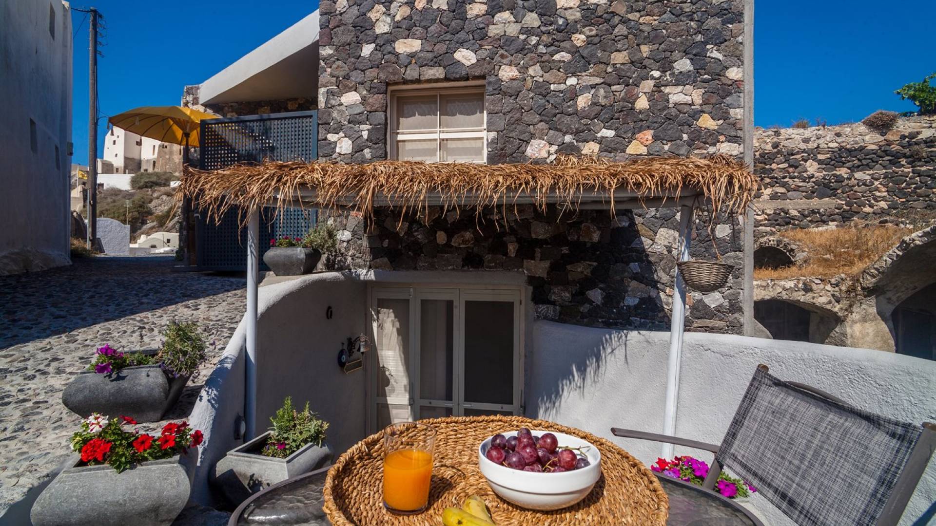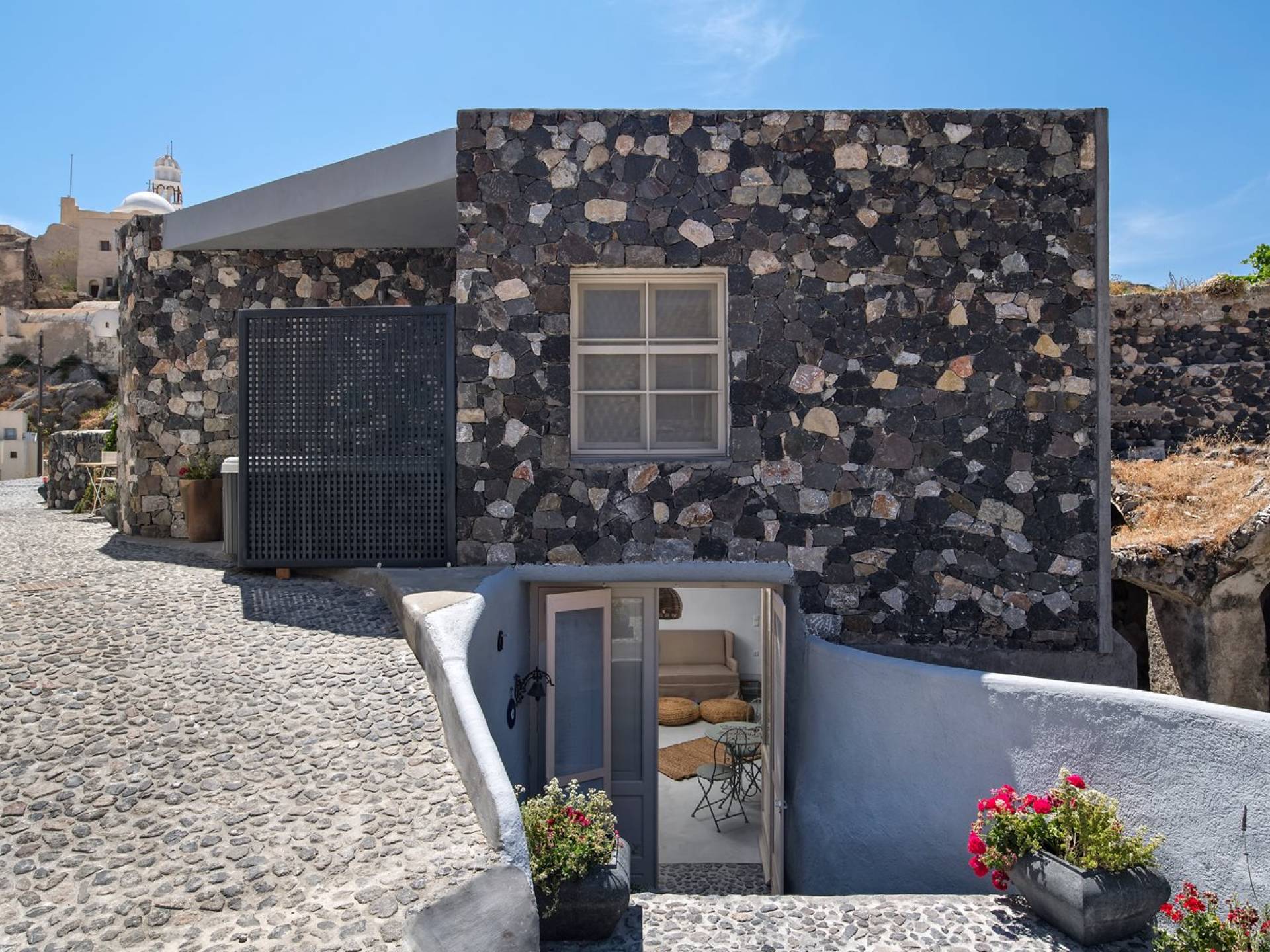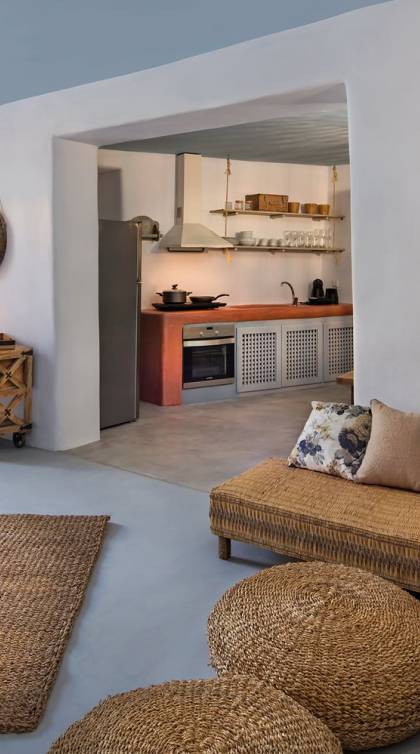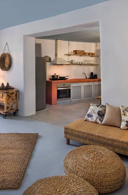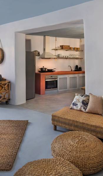 L'esclusiva villa a cupola, scavata nel terreno roccioso dell'antico villaggio di Emporio, è costruita in armonia con la morfologia unica dell'isola creata dal vulcano ed è fortemente influenzata dall'architettura tradizionale del Mar Egeo. Insieme alla decorazione sognante e selezionata con cura, il risultato è un ambiente di insolita libertà di espressione che ti fa sentire consapevole, gioioso ed equilibrato.