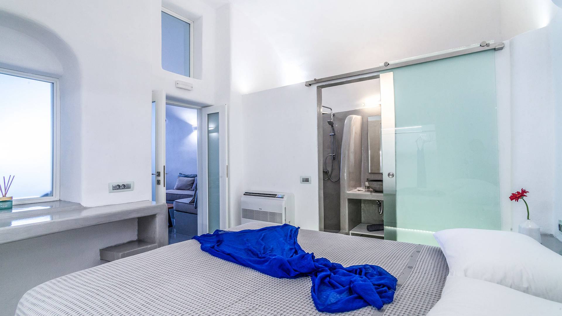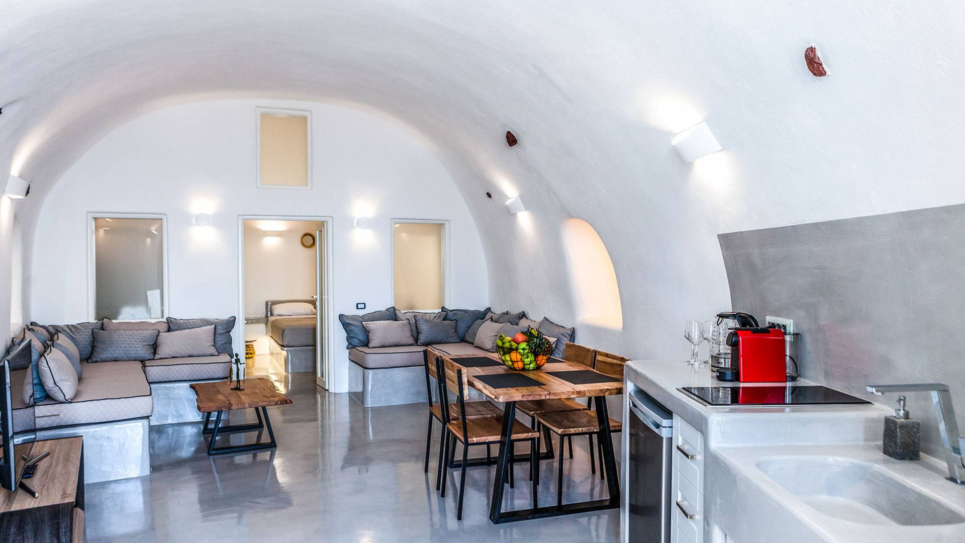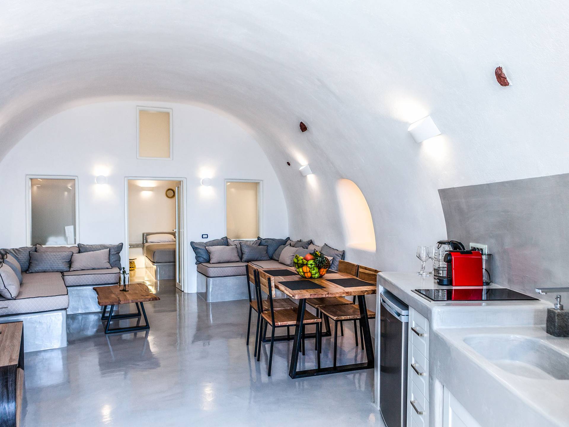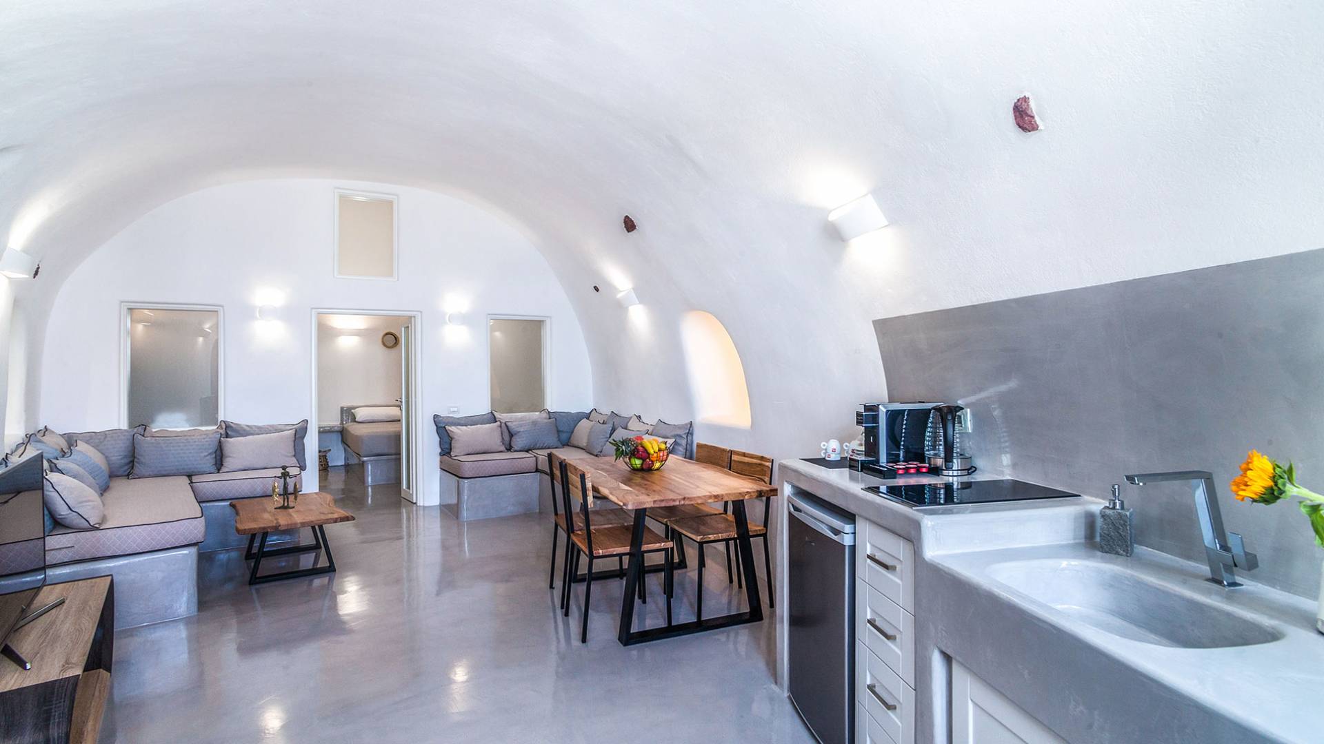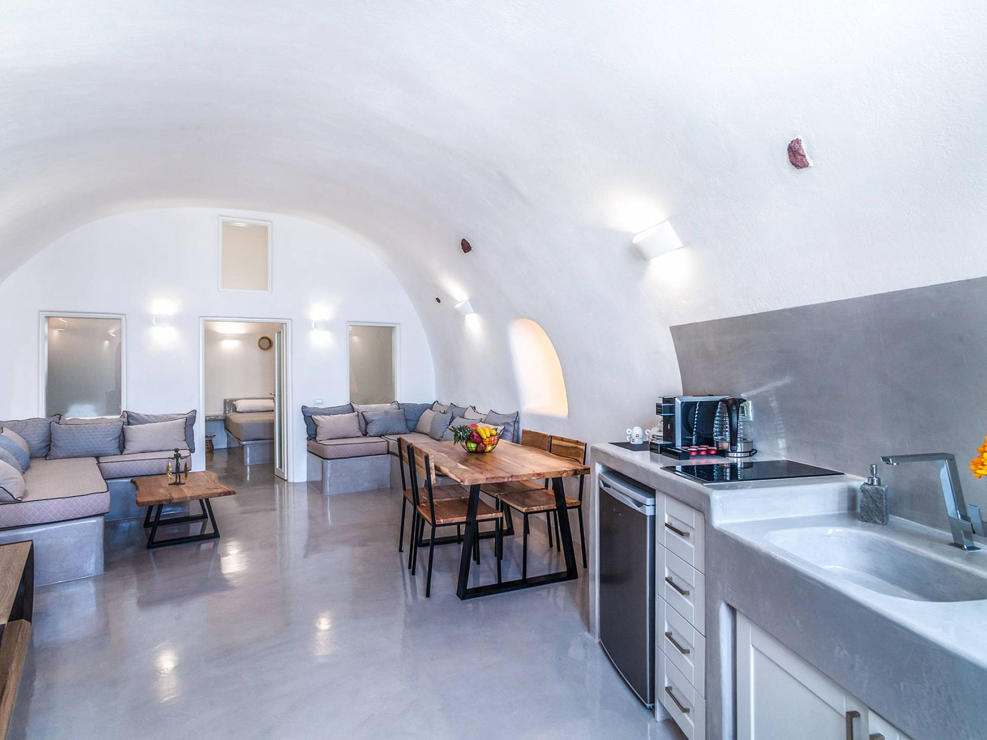 La villa Antrum comprende un'area di circa 84 metri quadrati dotata di due camere da letto spaziose e dal design brillante con un letto king-size e un lussuoso bagno ciascuna e due divani letto. La villa è dotata di un angolo cottura eccezionalmente progettato in uno spazio soggiorno a piano aperto. Rilassati sul divano mentre osservi il blu profondo del Mar Egeo e l'isolotto vulcanico. Esci sui balconi unici o sull'ampia terrazza panoramica e goditi la colazione o la cena mentre ti godi la vista unica della Caldera e del tramonto