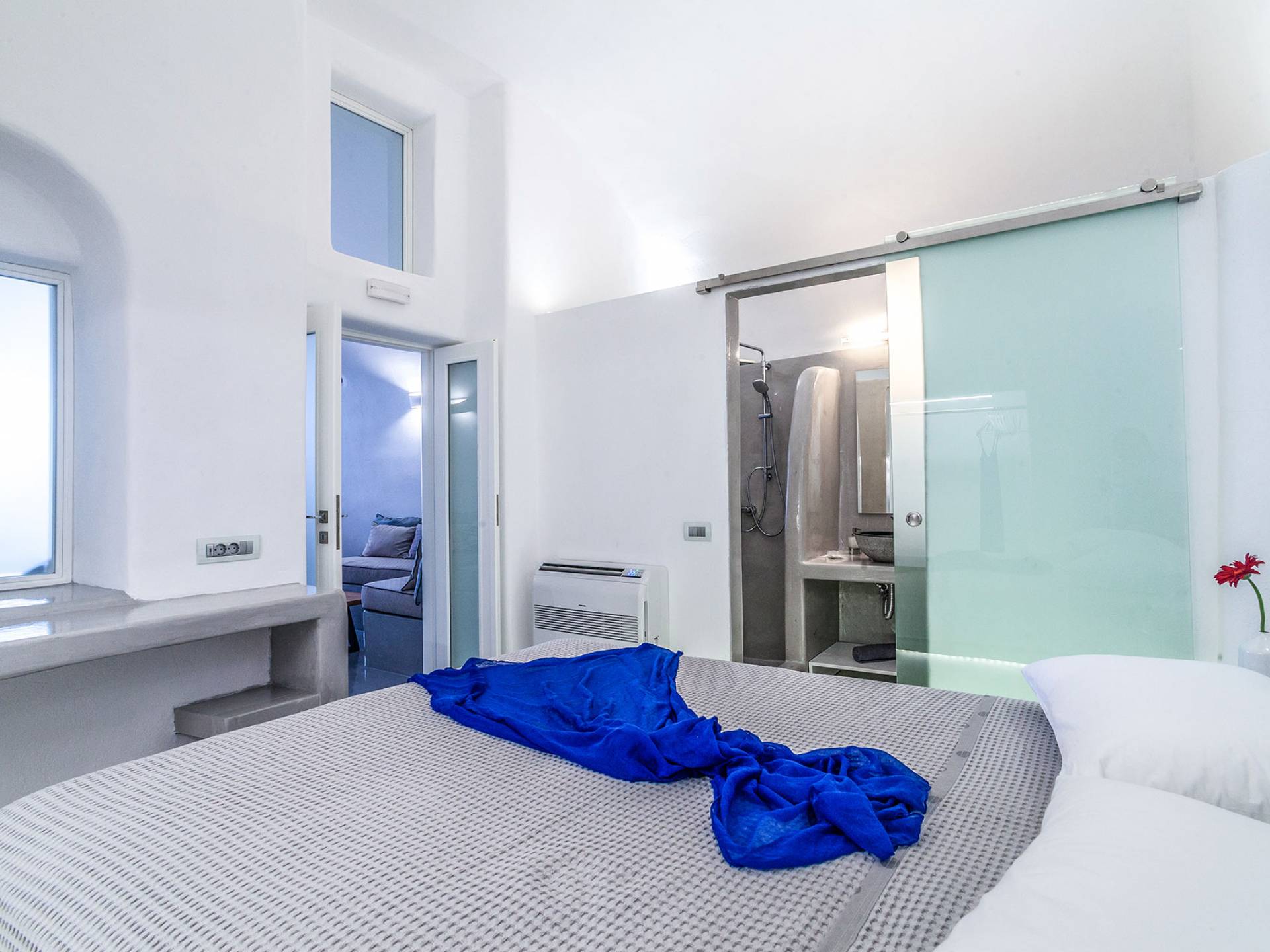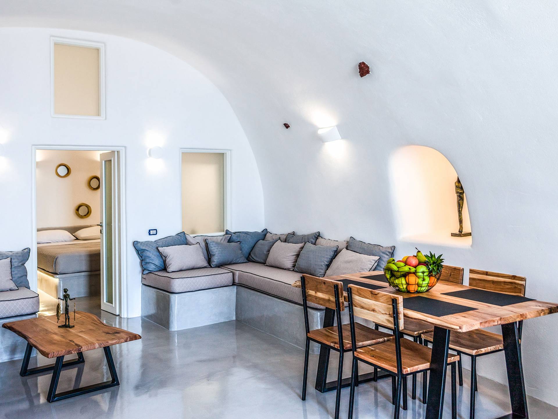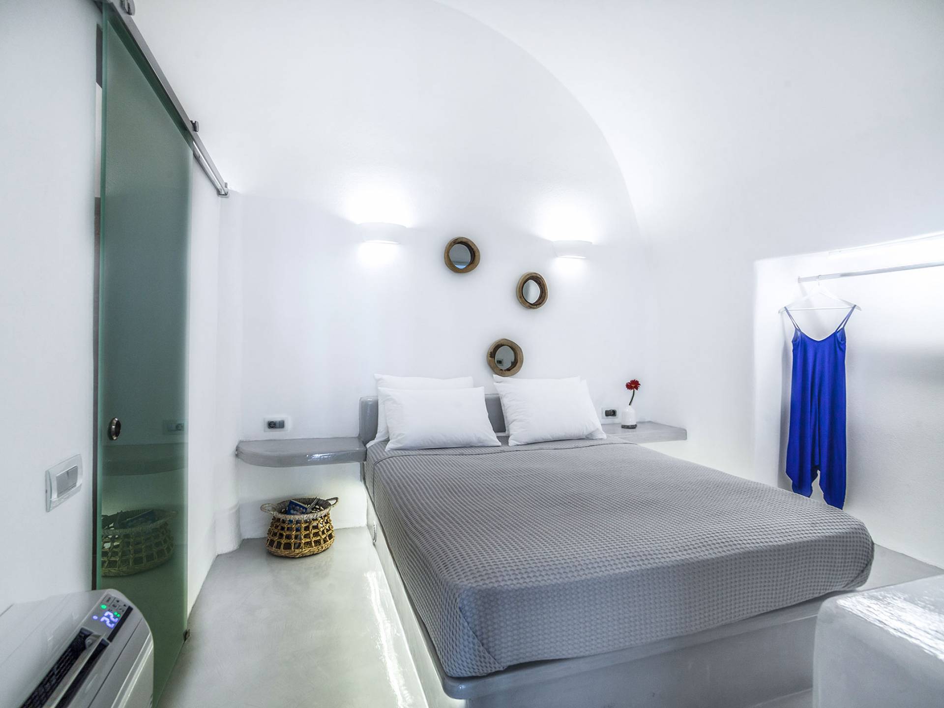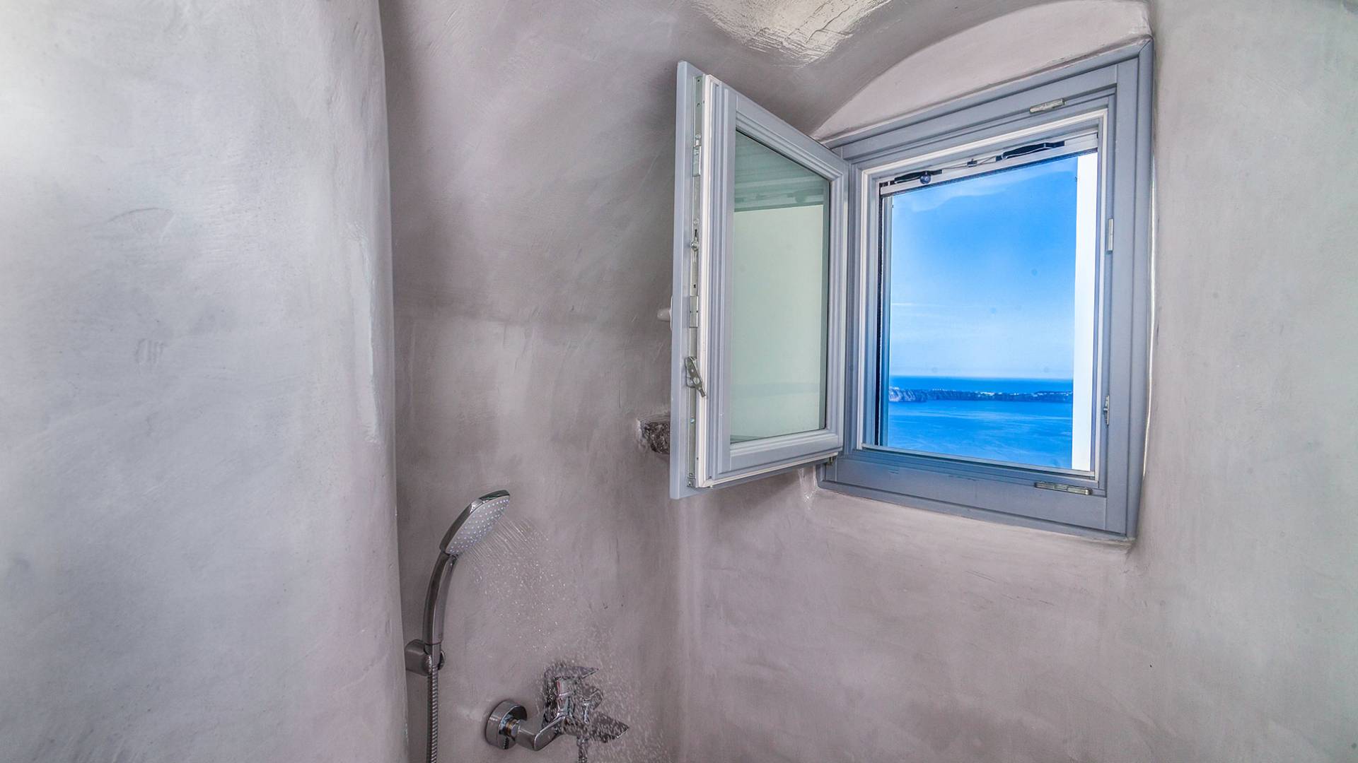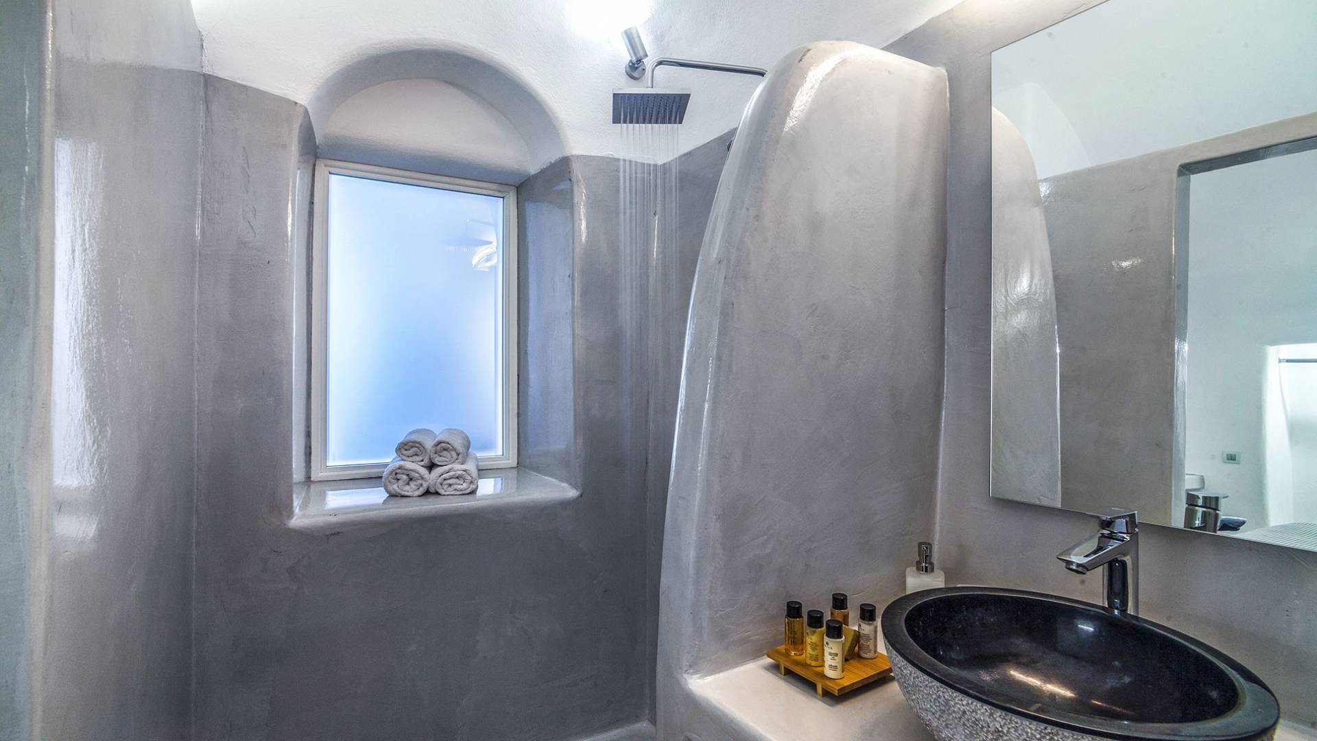 La villa Antrum comprende un'area di circa 84 metri quadrati dotata di due camere da letto spaziose e dal design brillante con un letto king-size e un lussuoso bagno ciascuna e due divani letto. La villa è dotata di un angolo cottura eccezionalmente progettato in uno spazio soggiorno a piano aperto. Rilassati sul divano mentre osservi il blu profondo del Mar Egeo e l'isolotto vulcanico. Esci sui balconi unici o sull'ampia terrazza panoramica e goditi la colazione o la cena mentre ti godi la vista unica della Caldera e del tramonto