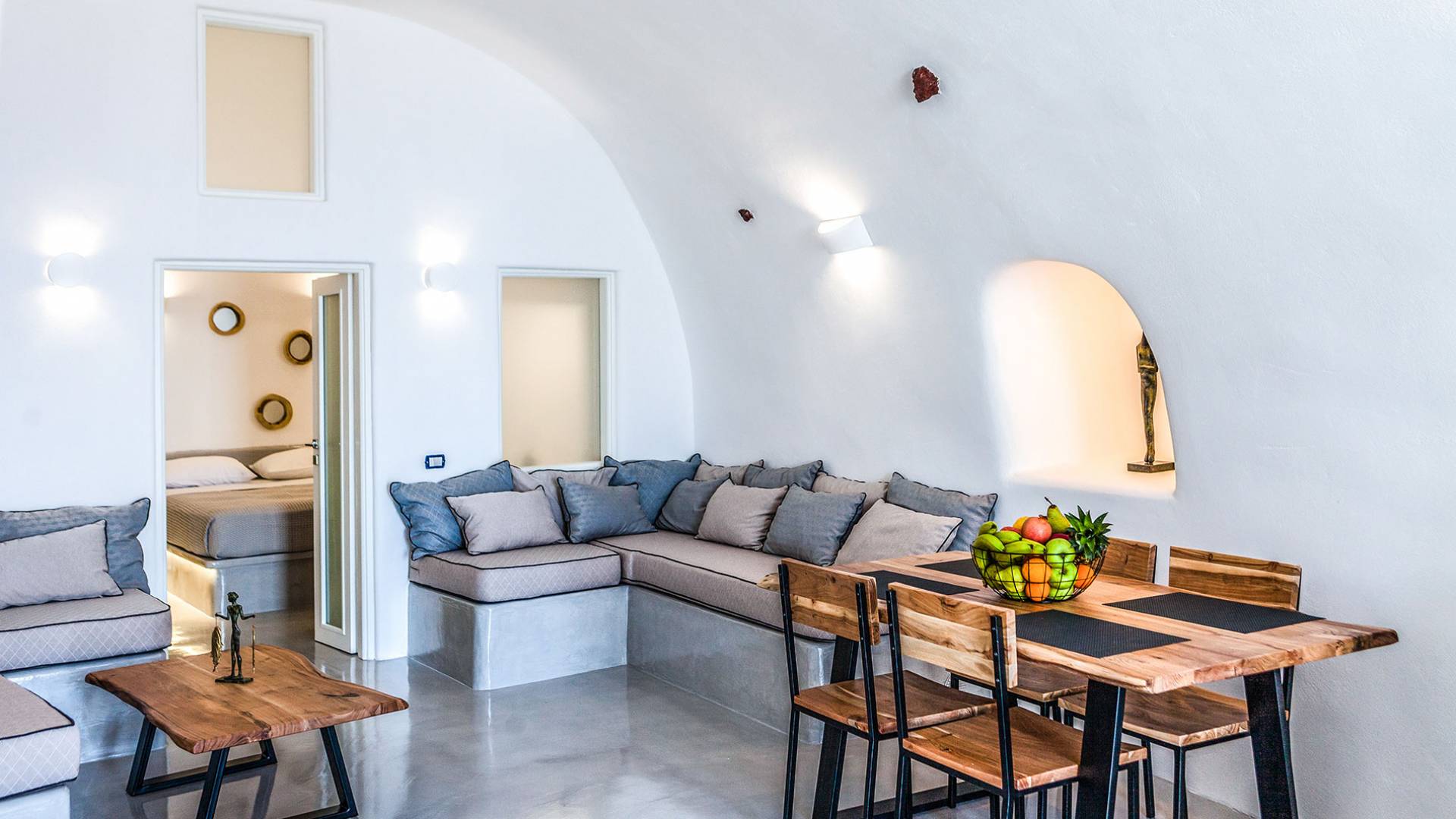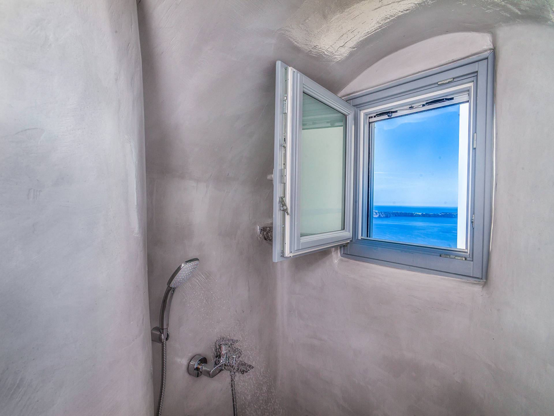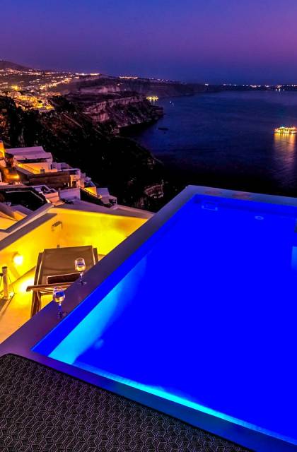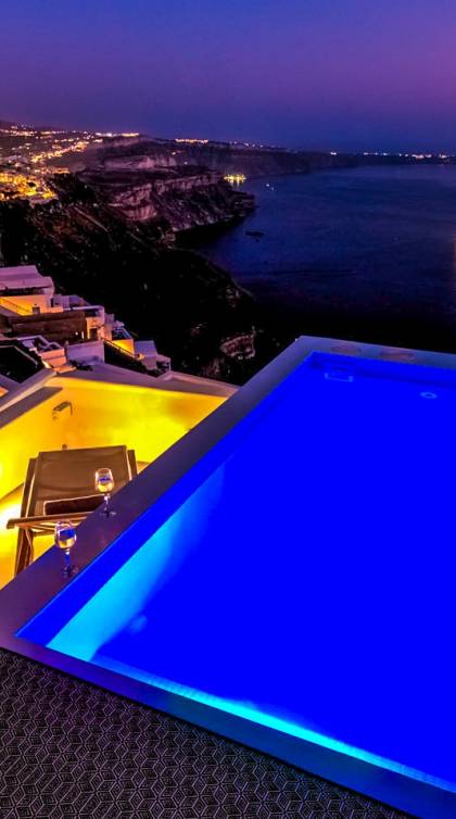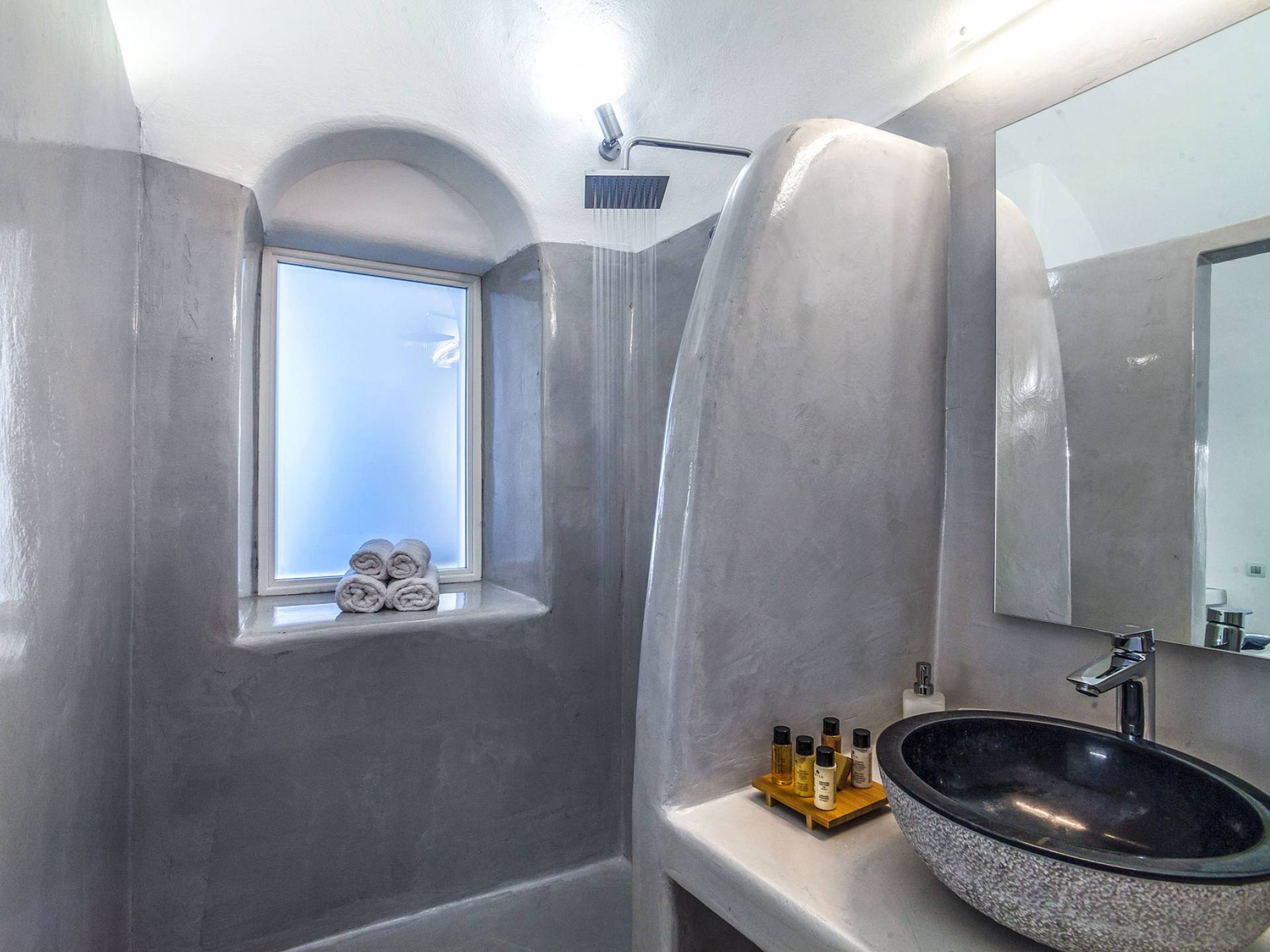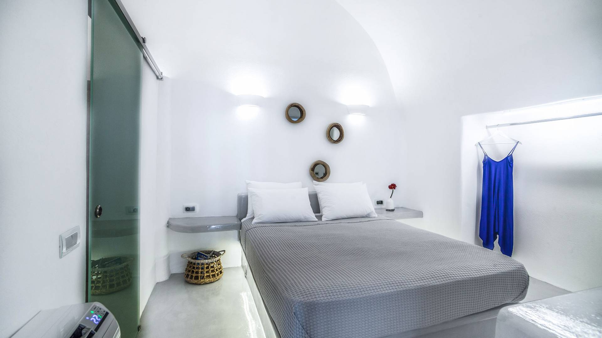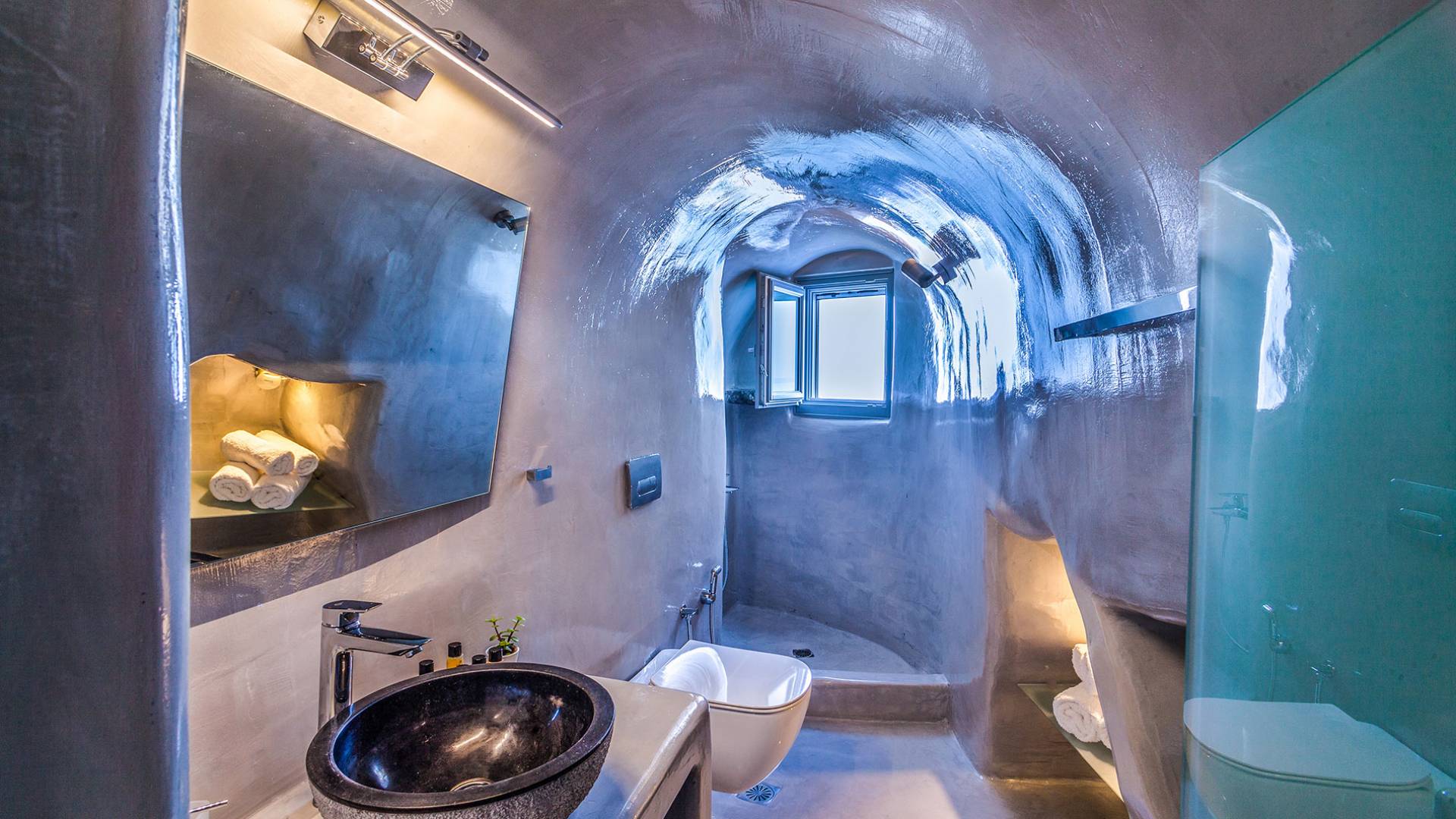 La villa Antrum comprende un'area di circa 84 metri quadrati dotata di due camere da letto spaziose e dal design brillante con un letto king-size e un lussuoso bagno ciascuna e due divani letto. La villa è dotata di un angolo cottura eccezionalmente progettato in uno spazio soggiorno a piano aperto. Rilassati sul divano mentre osservi il blu profondo del Mar Egeo e l'isolotto vulcanico. Esci sui balconi unici o sull'ampia terrazza panoramica e goditi la colazione o la cena mentre ti godi la vista unica della Caldera e del tramonto
